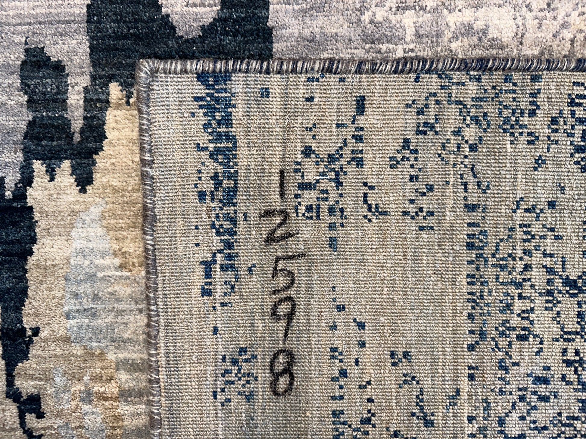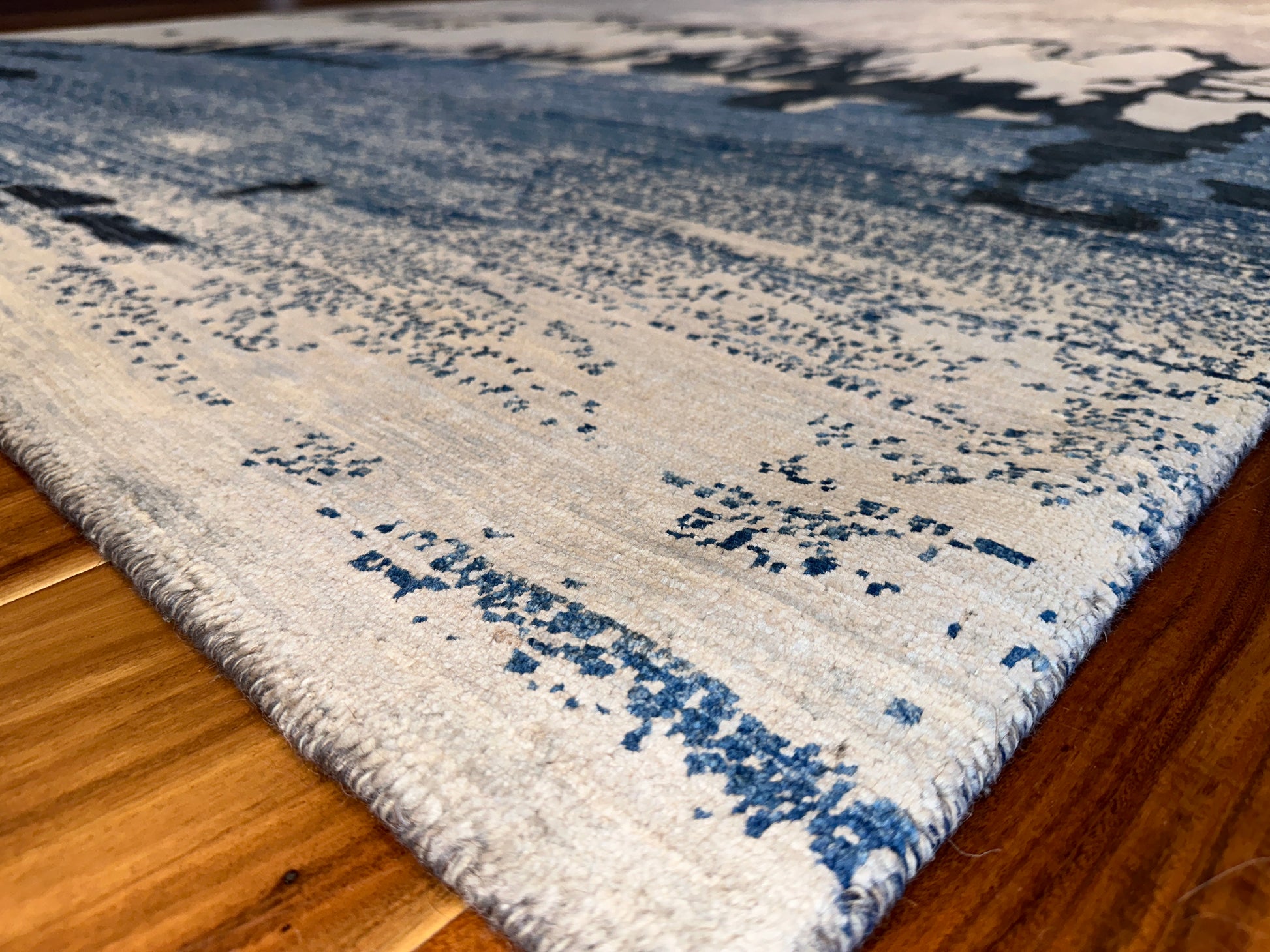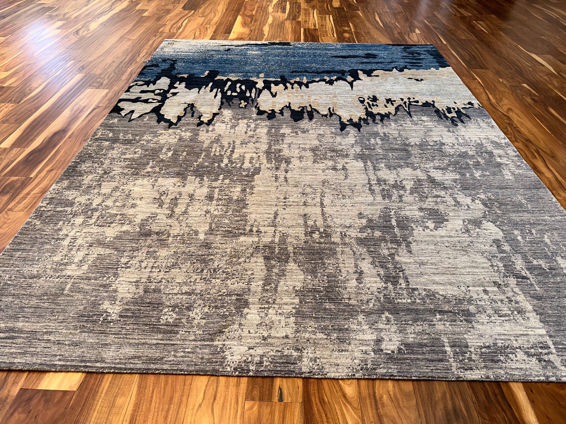 A sweeping composition of deep indigo, parchment, and ash unfolds across this modern abstract rug, evoking the feeling of a distant skyline or shifting terrain. The design flows from dark to light with painterly transitions that lend depth and movement, while the soft texture keeps the mood grounded and calm. This piece makes a subtle yet powerful statement, perfect for rooms that embrace modern elegance with a touch of drama.