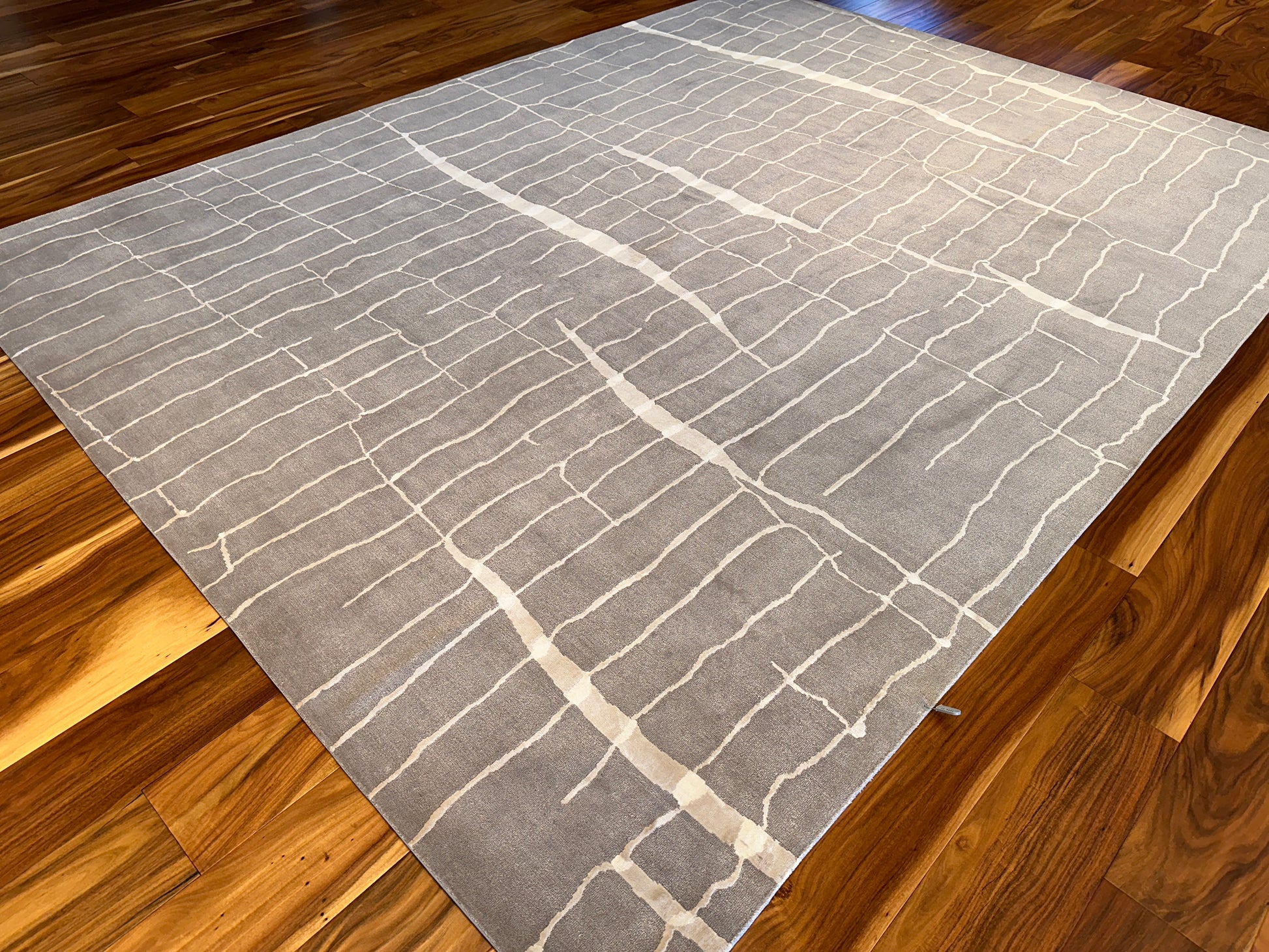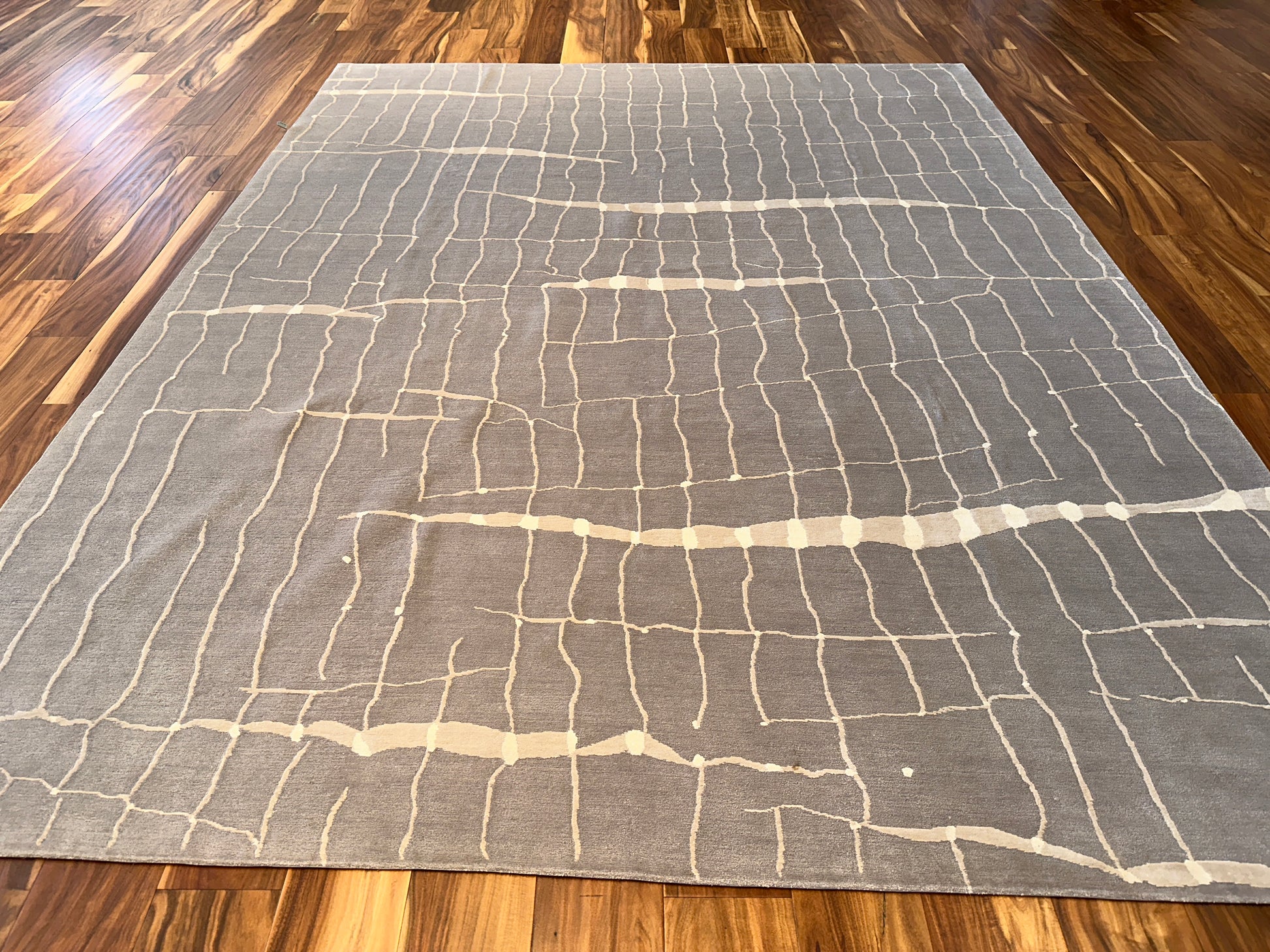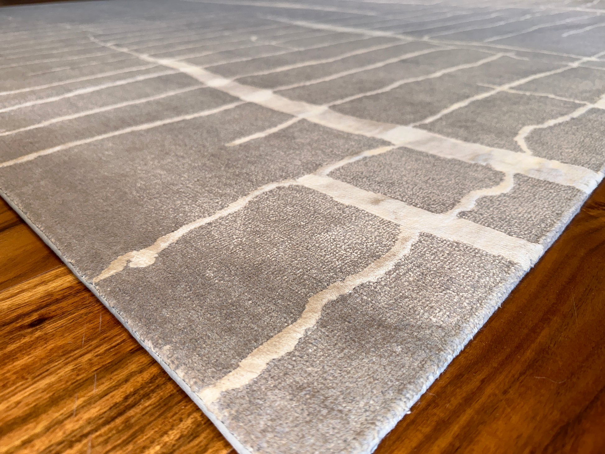 Soft and sophisticated, this rug brings a quiet rhythm to the room with its gently undulating grid of ivory lines set against a smooth, silvery grey field. The irregular geometry feels organic and calming, evoking the impression of ripples across water or wind through reeds. With its minimalist elegance, this piece invites a sense of ease and refinement into any interior.