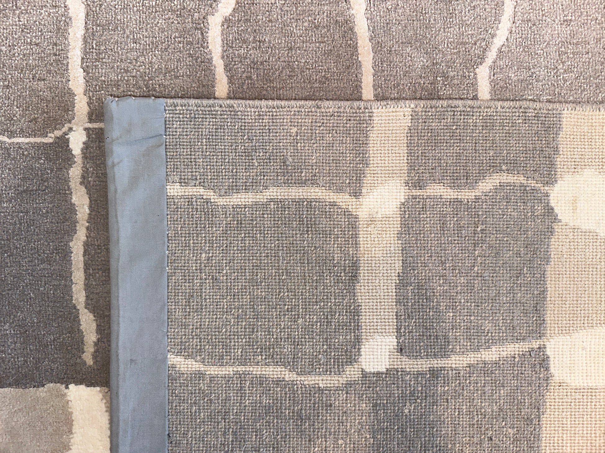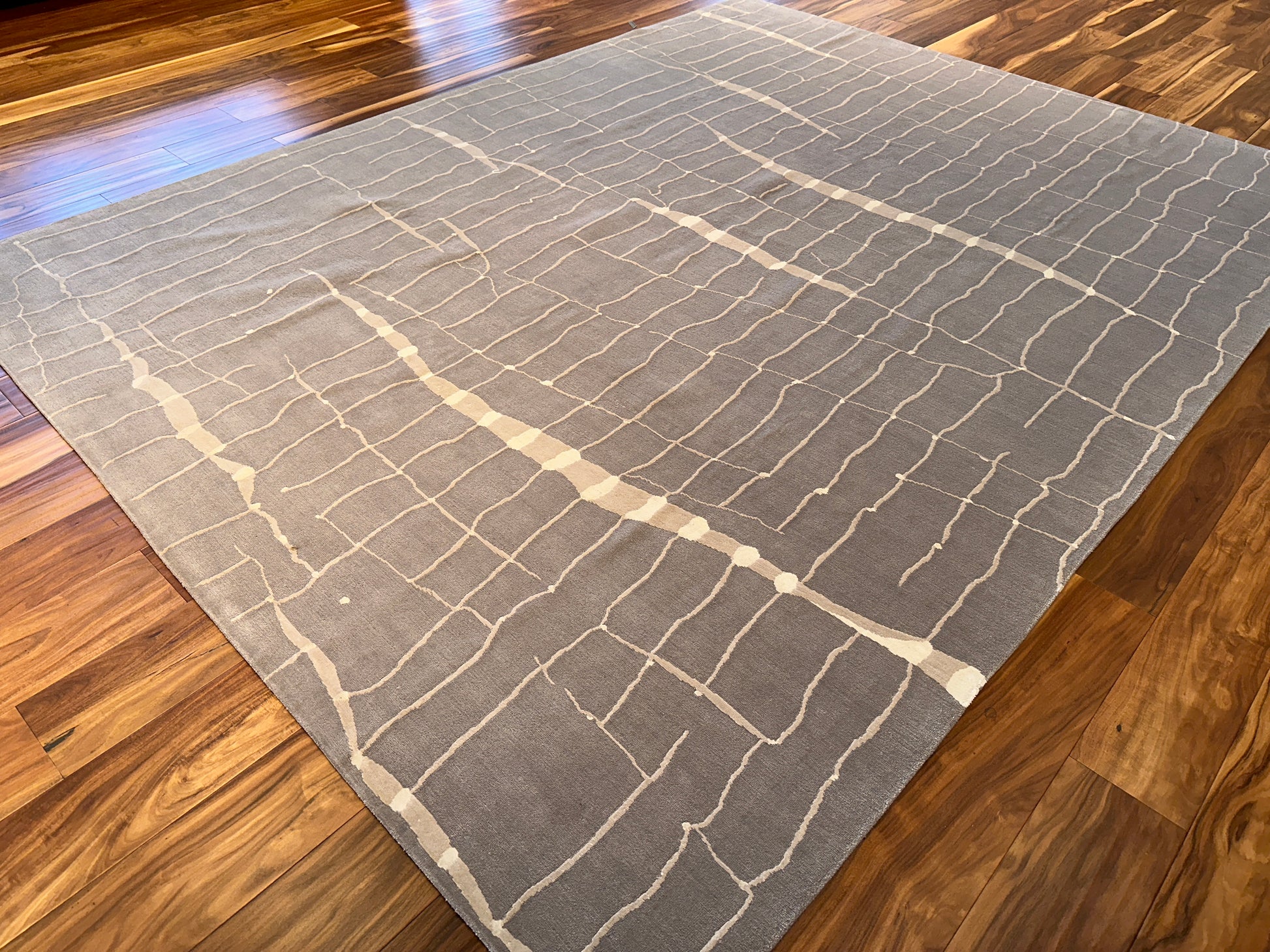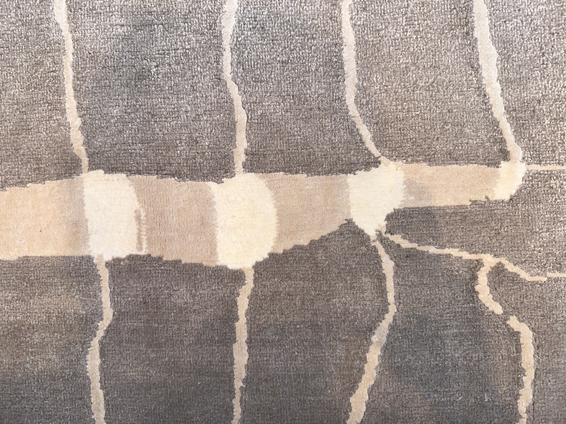 Soft and sophisticated, this rug brings a quiet rhythm to the room with its gently undulating grid of ivory lines set against a smooth, silvery grey field. The irregular geometry feels organic and calming, evoking the impression of ripples across water or wind through reeds. With its minimalist elegance, this piece invites a sense of ease and refinement into any interior.