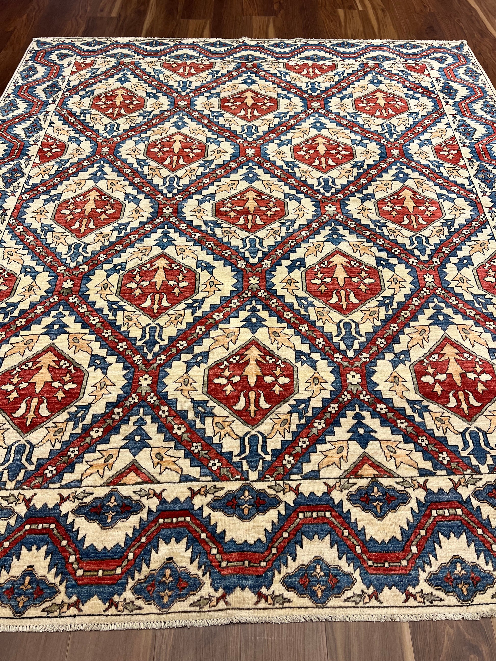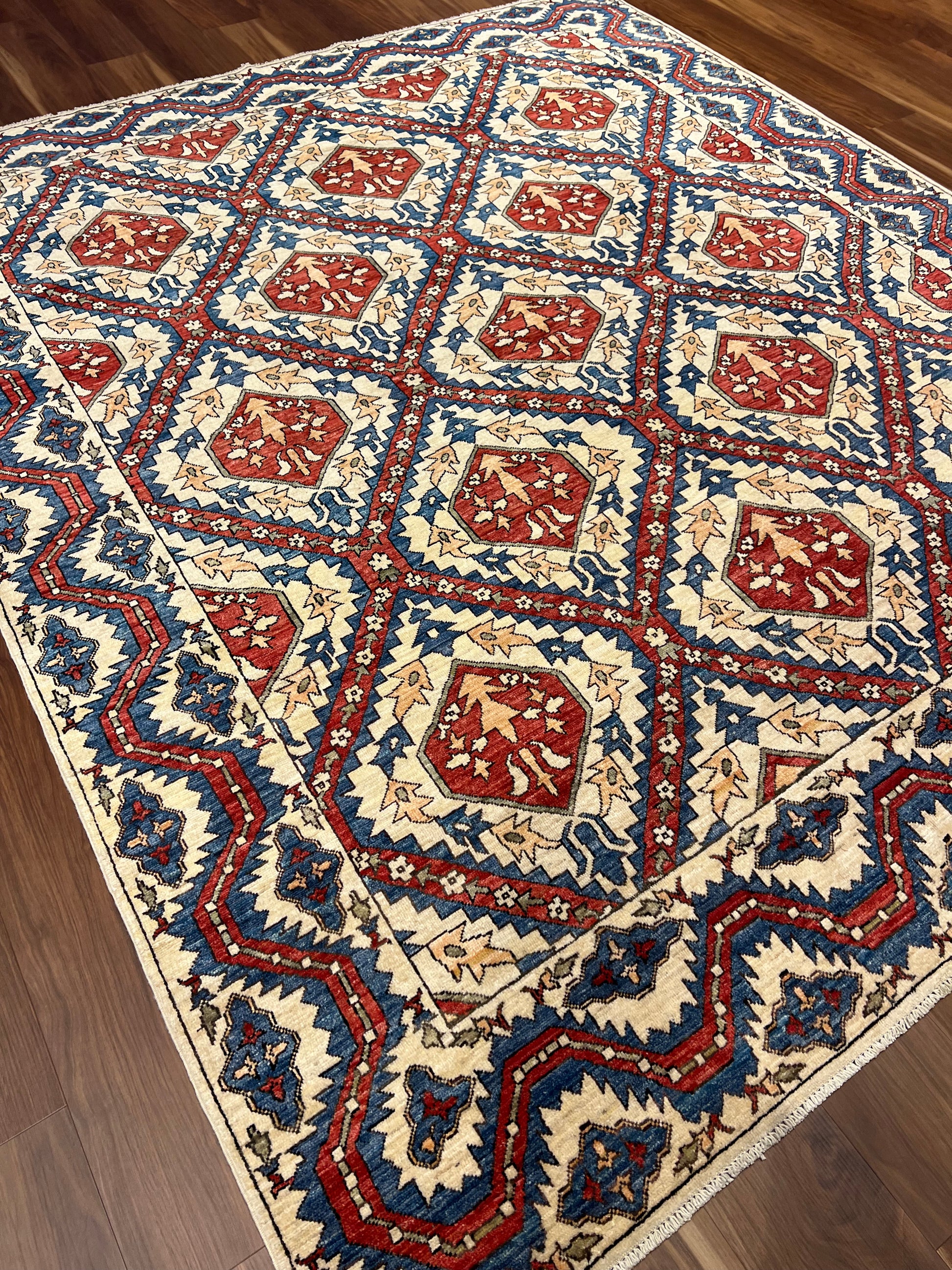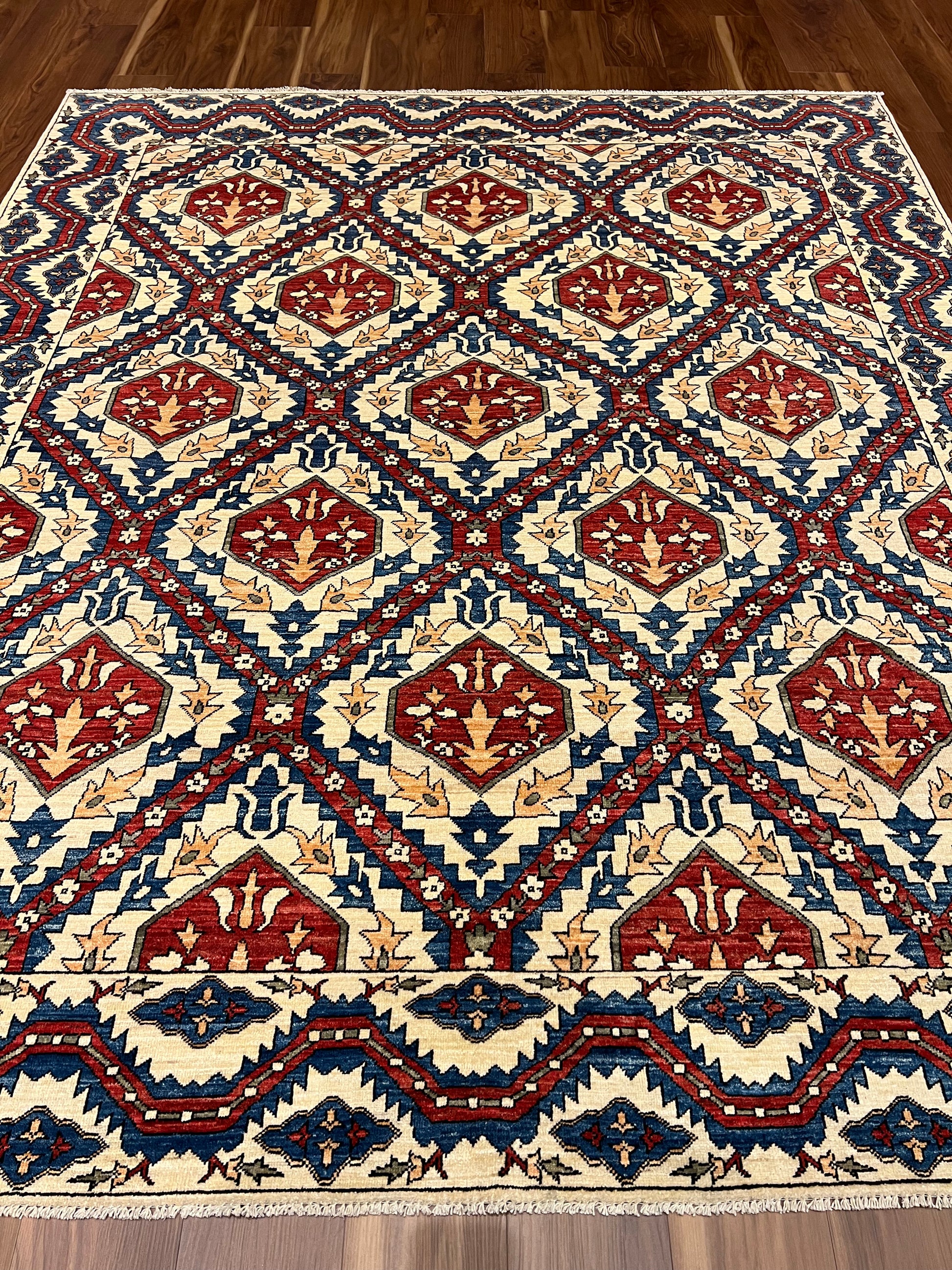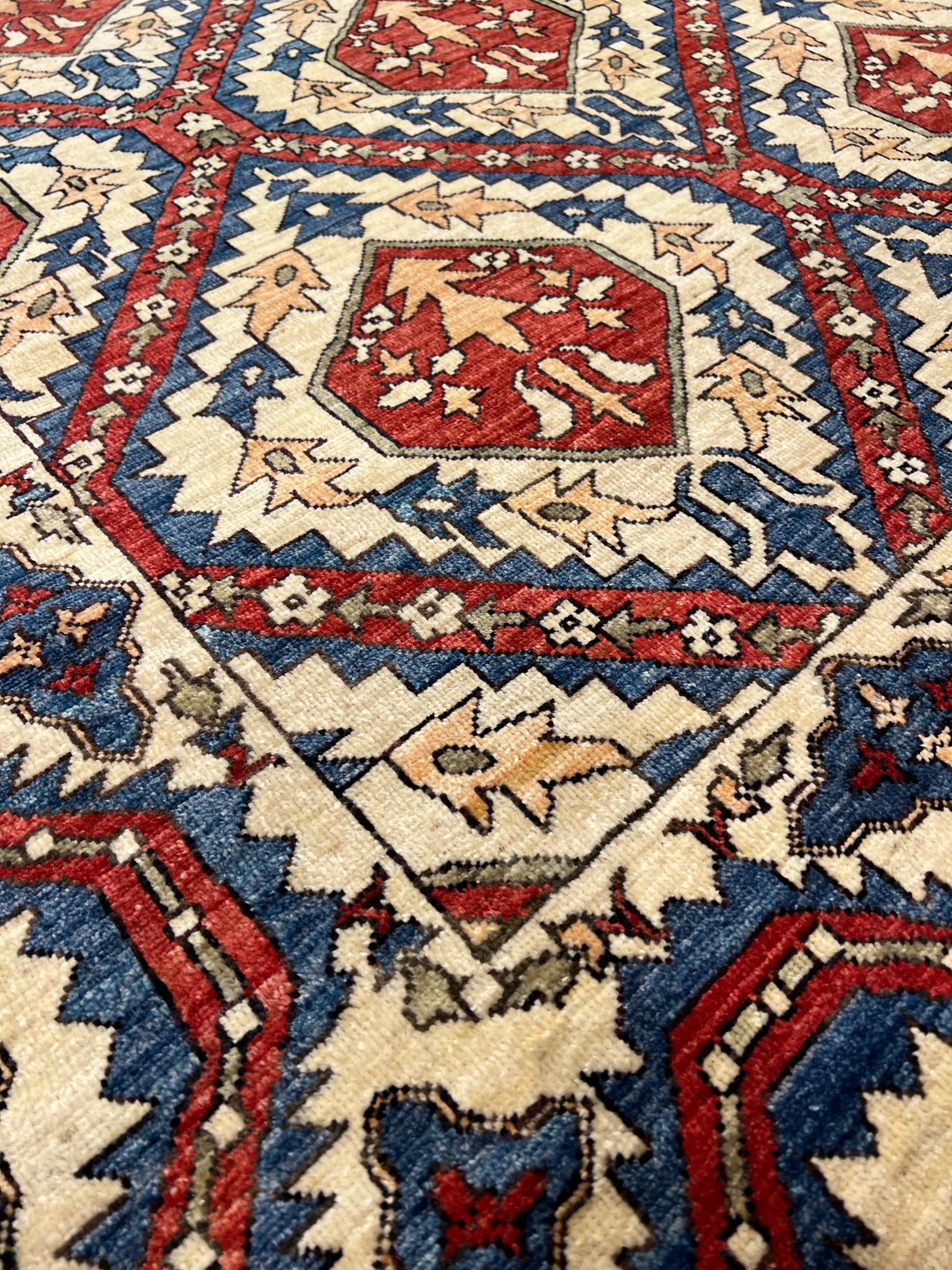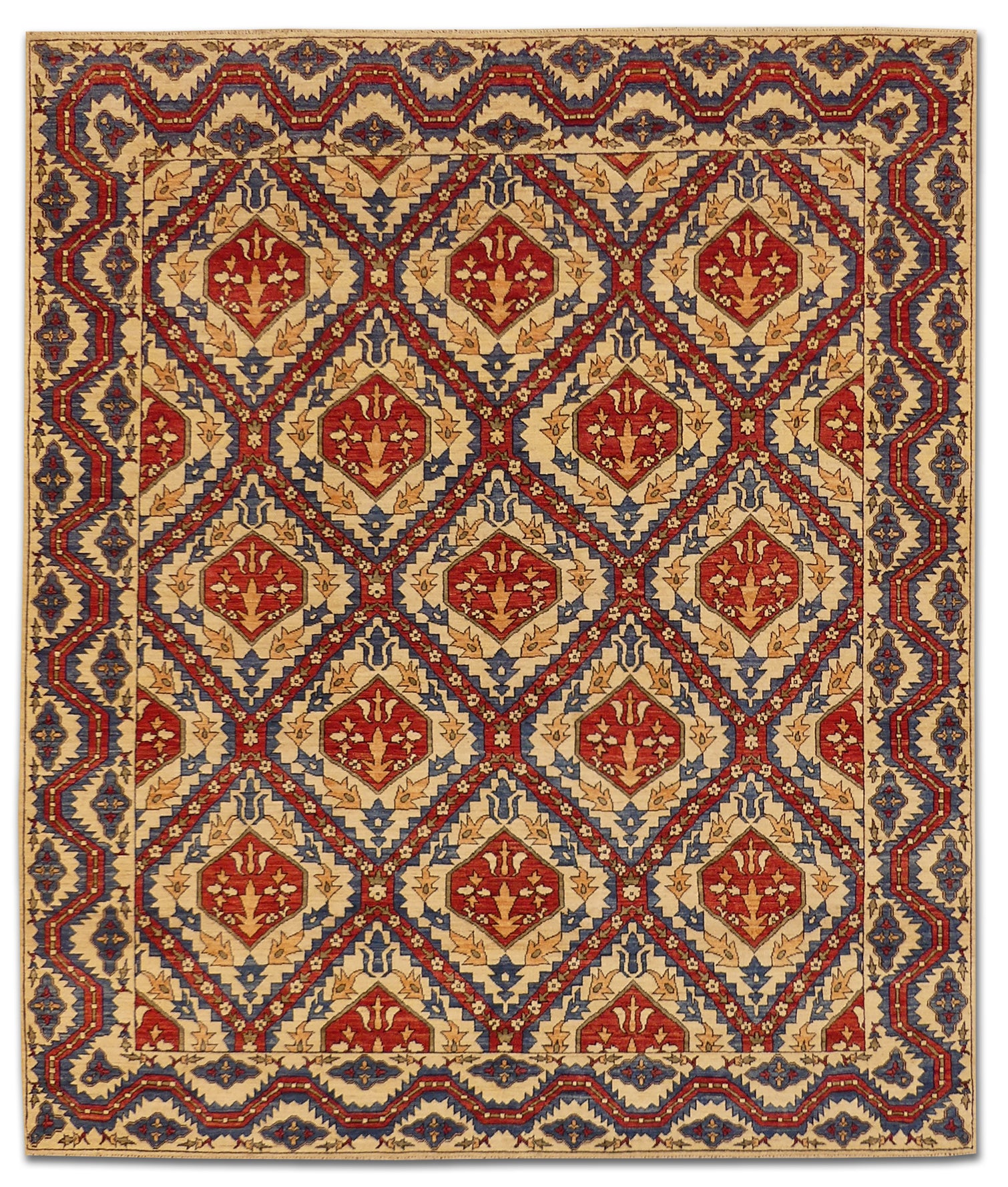 The Modern Aubusson wool rug exudes a timeless elegance, perfect for enhancing any living space. Crafted with high-quality wool, this luxurious piece features an intricate pattern with a harmonious palette of beige, red, navy blue, and ivory. The traditional geometric and botanical motifs are expertly interwoven to create a sense of balance and sophistication. Its enduring design and durable material make it an ideal choice for both contemporary and classic interiors seeking a touch of refinement.