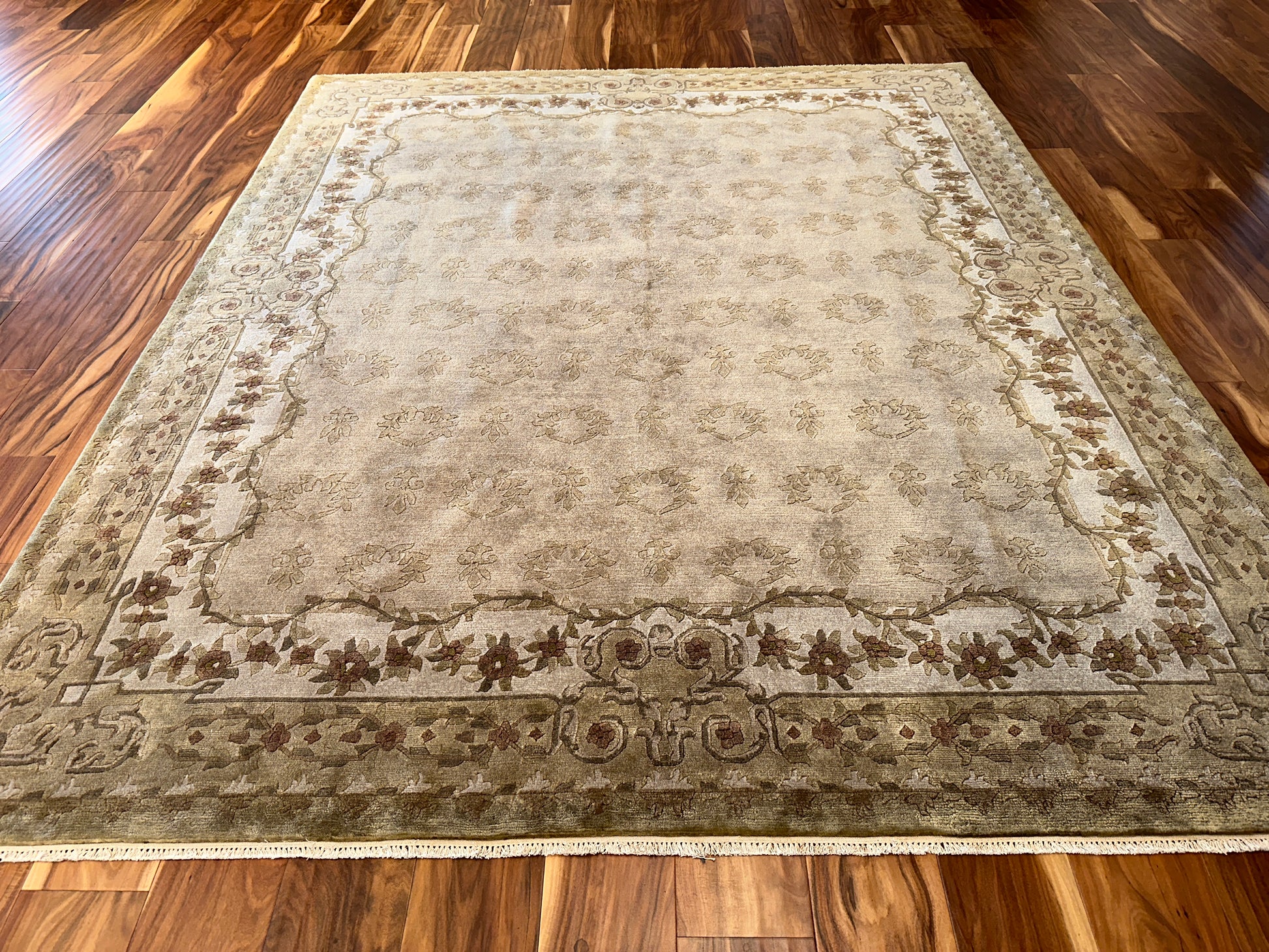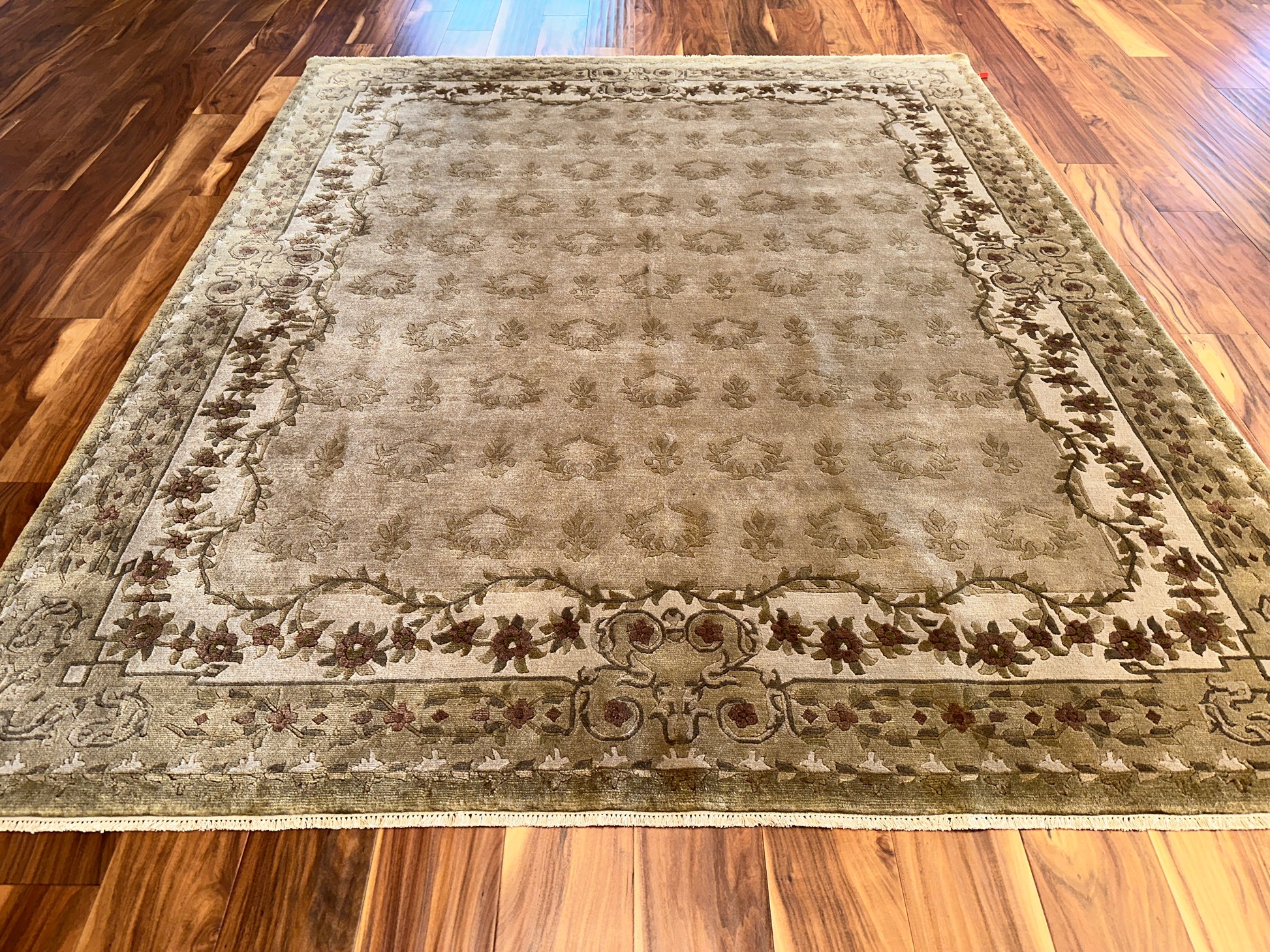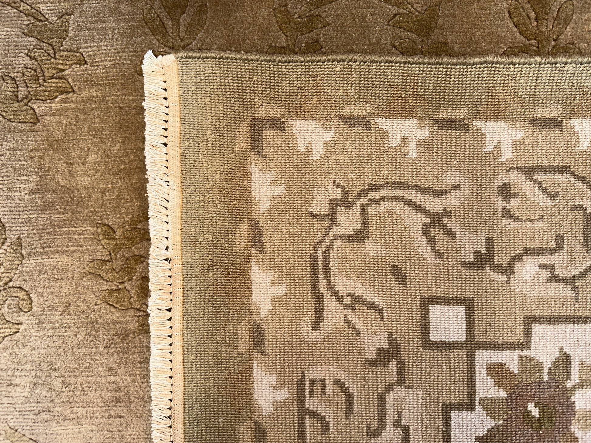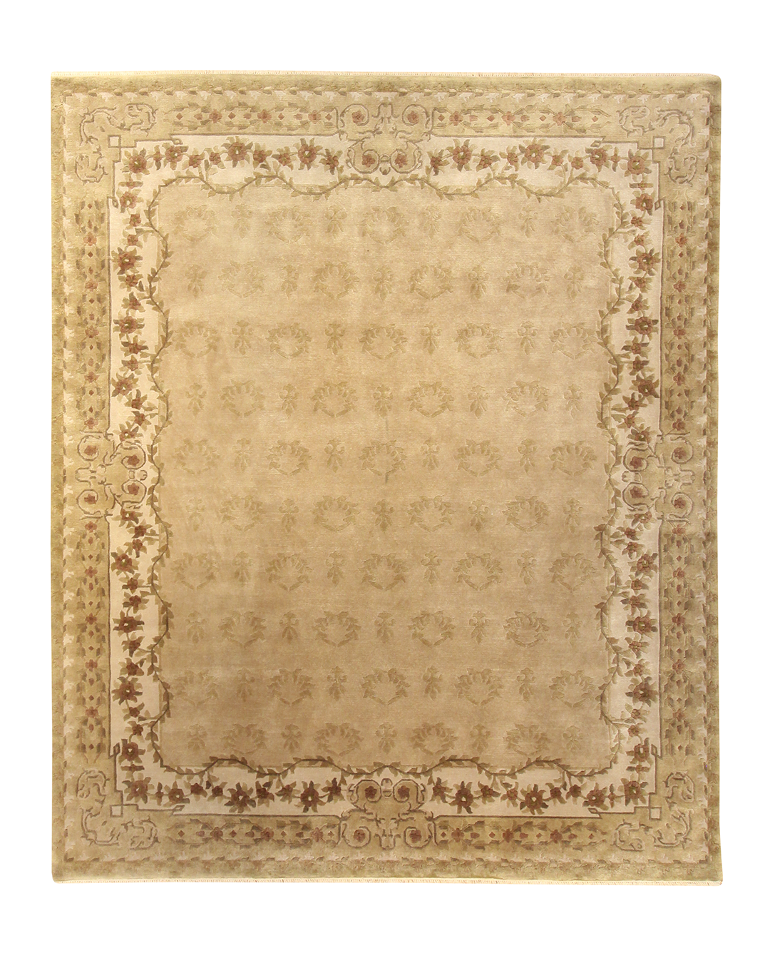 Graceful and quietly regal, this rug features a tone-on-tone field adorned with delicate floral motifs, framed by an ornate scrolling border. The soft beige palette is accented with hints of olive, lending a subtle warmth to its classic design. This piece brings a sense of poised refinement to traditional and transitional interiors.