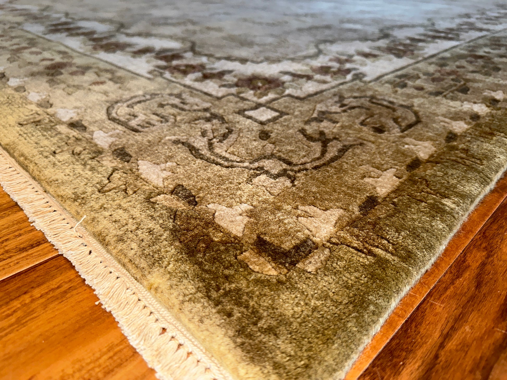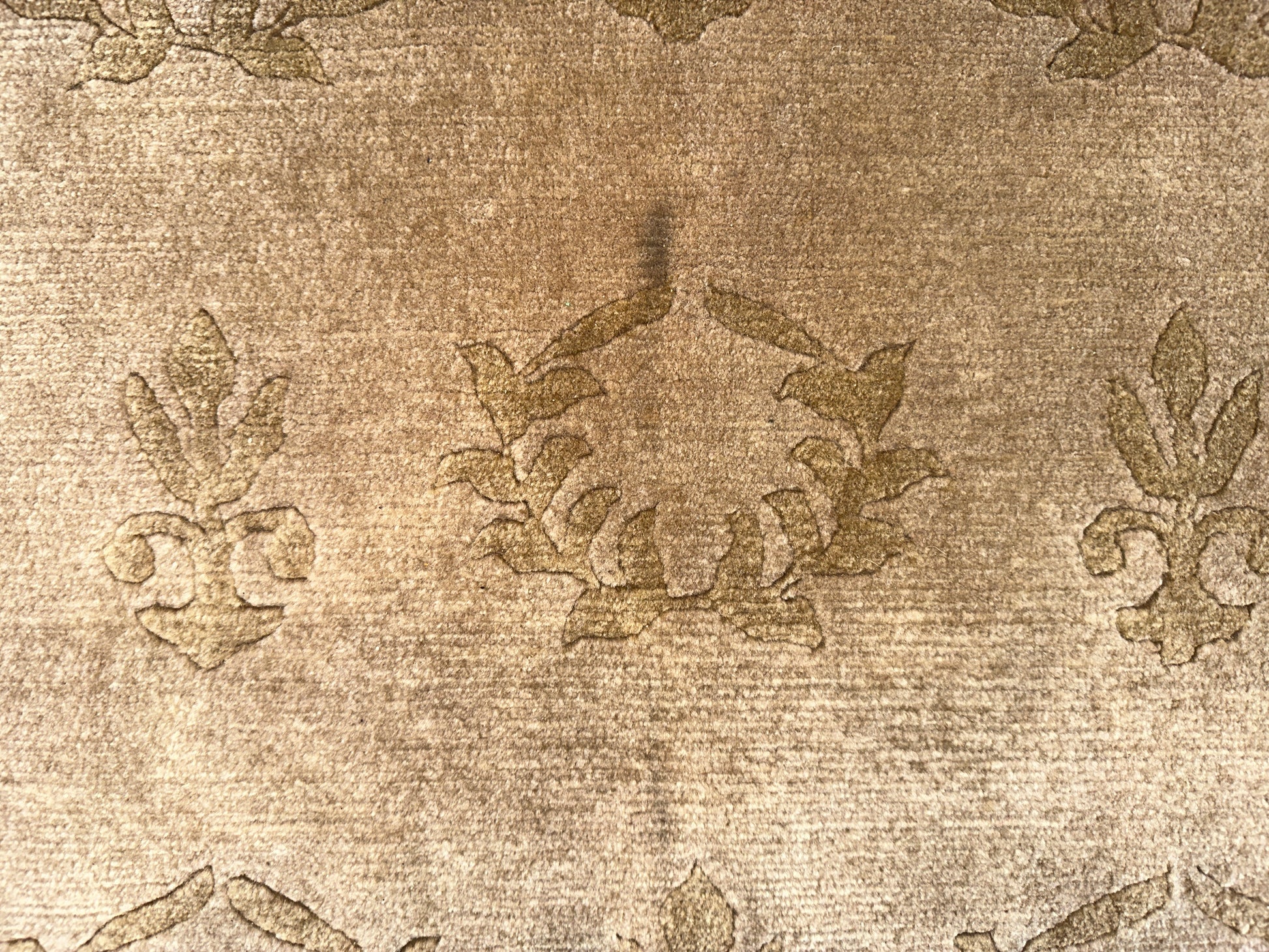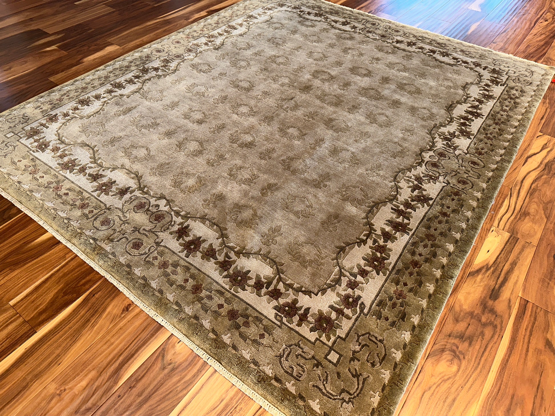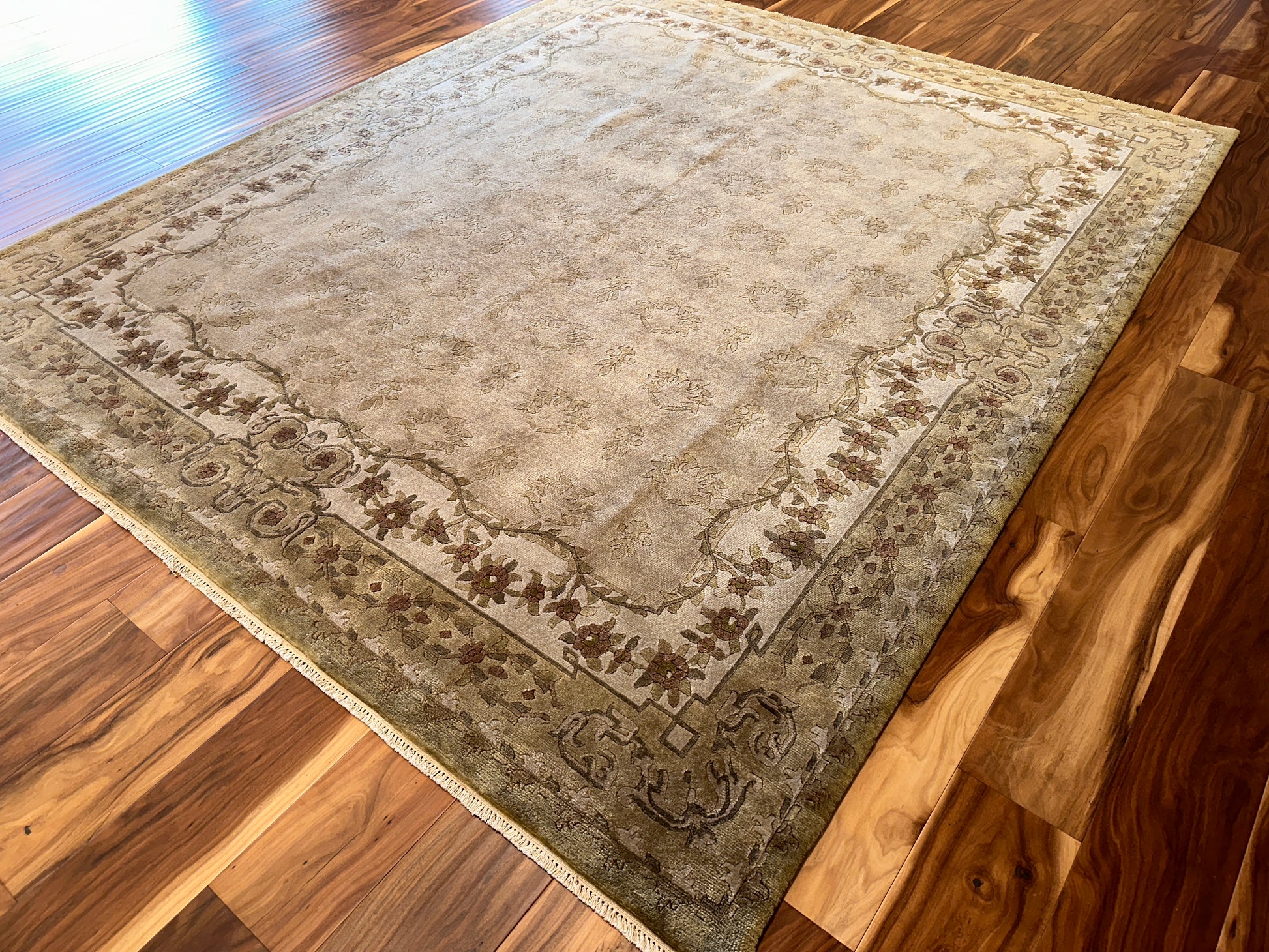 Graceful and quietly regal, this rug features a tone-on-tone field adorned with delicate floral motifs, framed by an ornate scrolling border. The soft beige palette is accented with hints of olive, lending a subtle warmth to its classic design. This piece brings a sense of poised refinement to traditional and transitional interiors.
