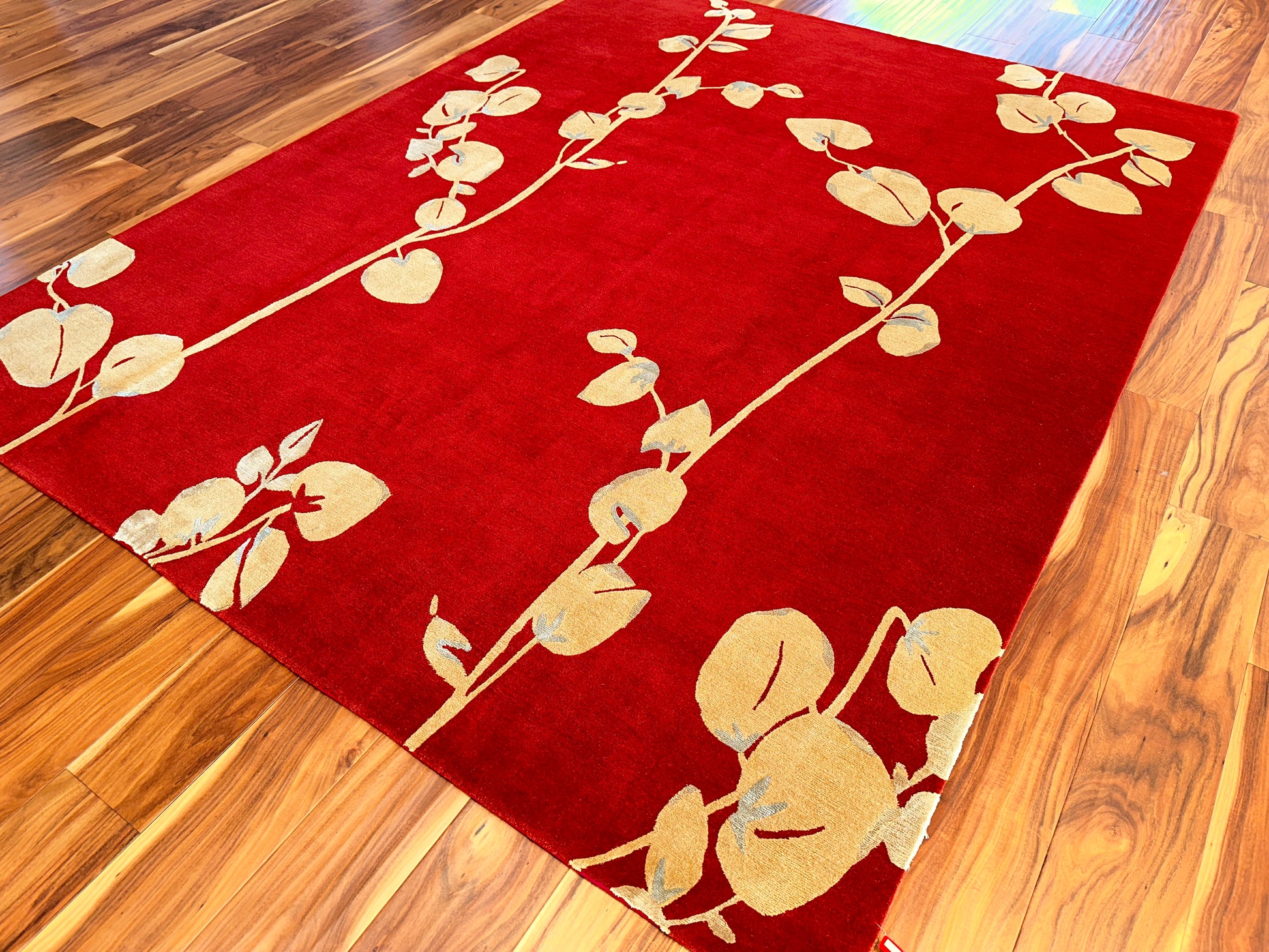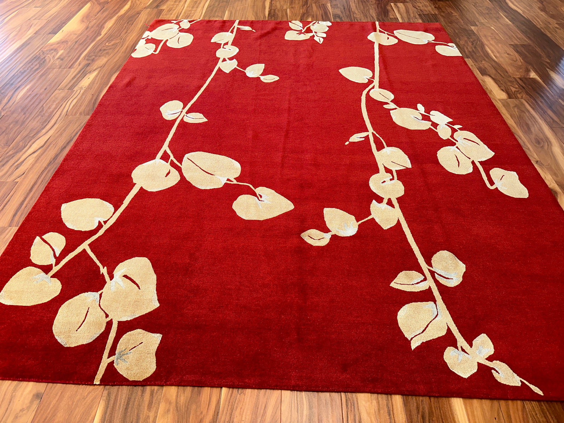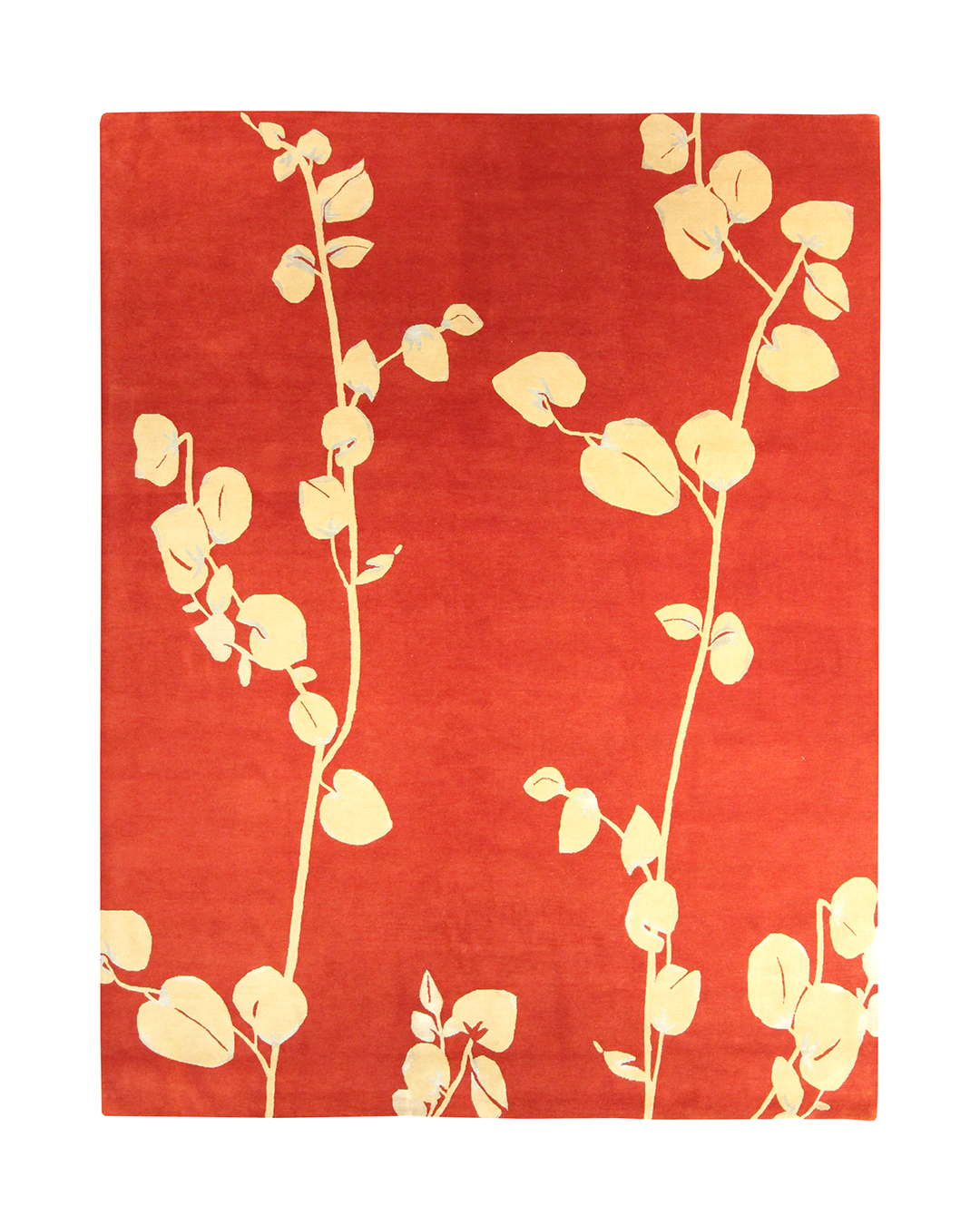 Radiating warmth and charm, this rug features graceful vine-like stems climbing across a rich, terracotta-red backdrop. The soft golden leaves feel delicately hand-drawn, lending a natural elegance that is both simple and uplifting. It's a perfect piece to brighten a room with botanical beauty and a touch of modern whimsy.