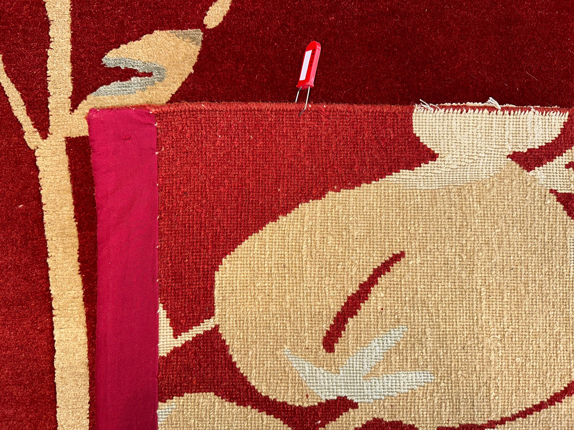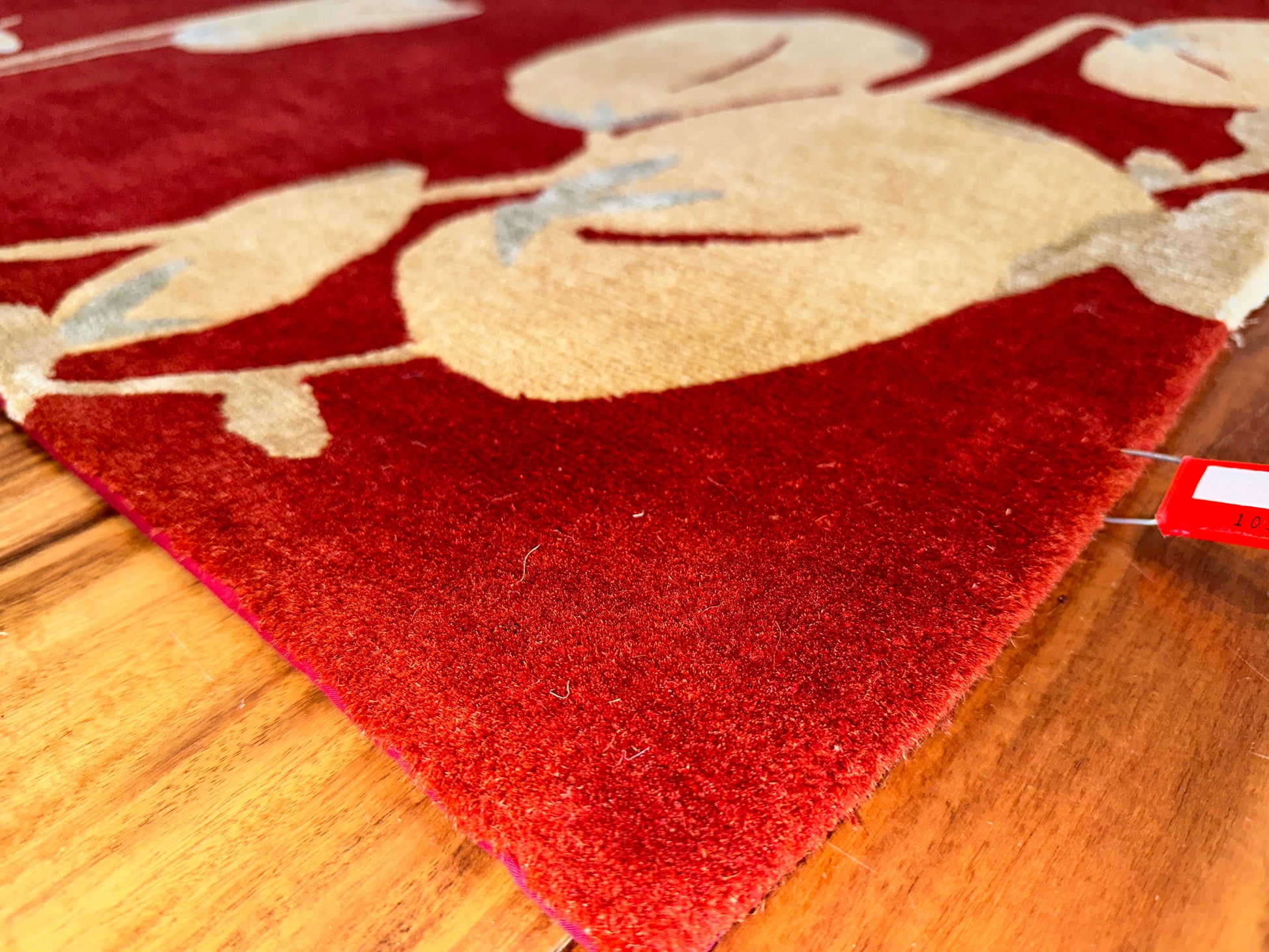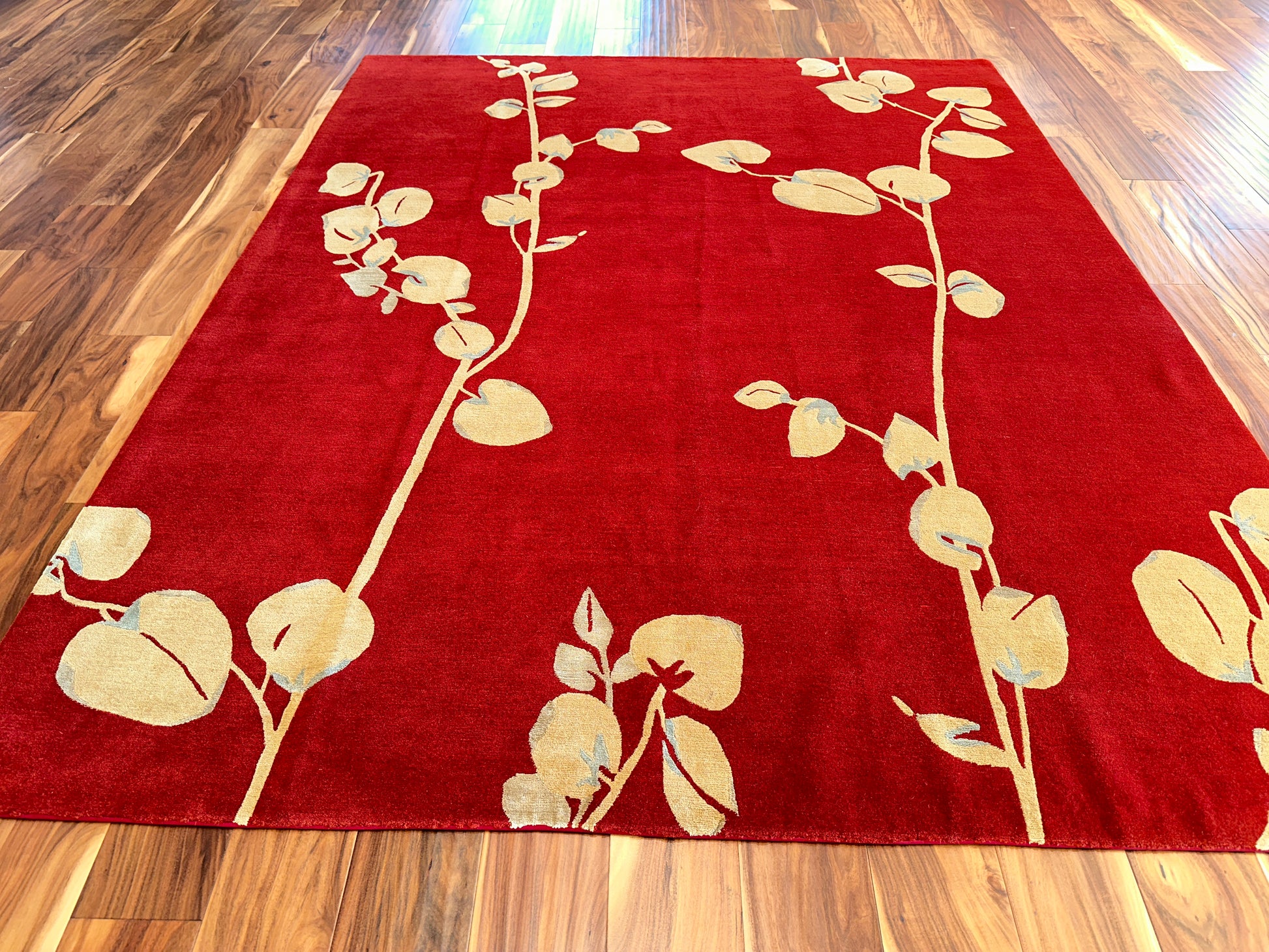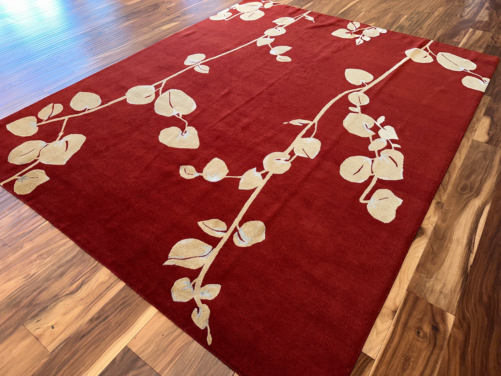 Radiating warmth and charm, this rug features graceful vine-like stems climbing across a rich, terracotta-red backdrop. The soft golden leaves feel delicately hand-drawn, lending a natural elegance that is both simple and uplifting. It's a perfect piece to brighten a room with botanical beauty and a touch of modern whimsy.
