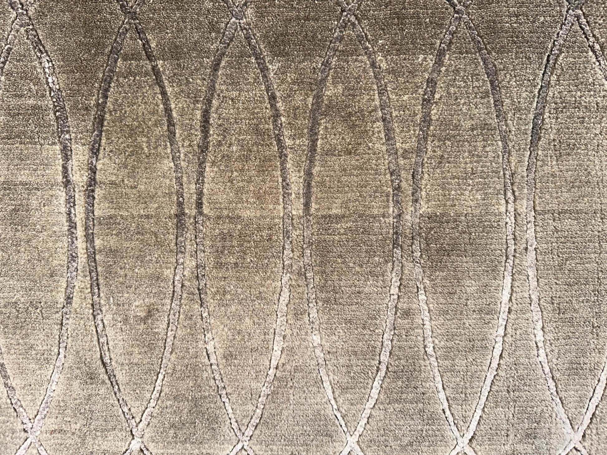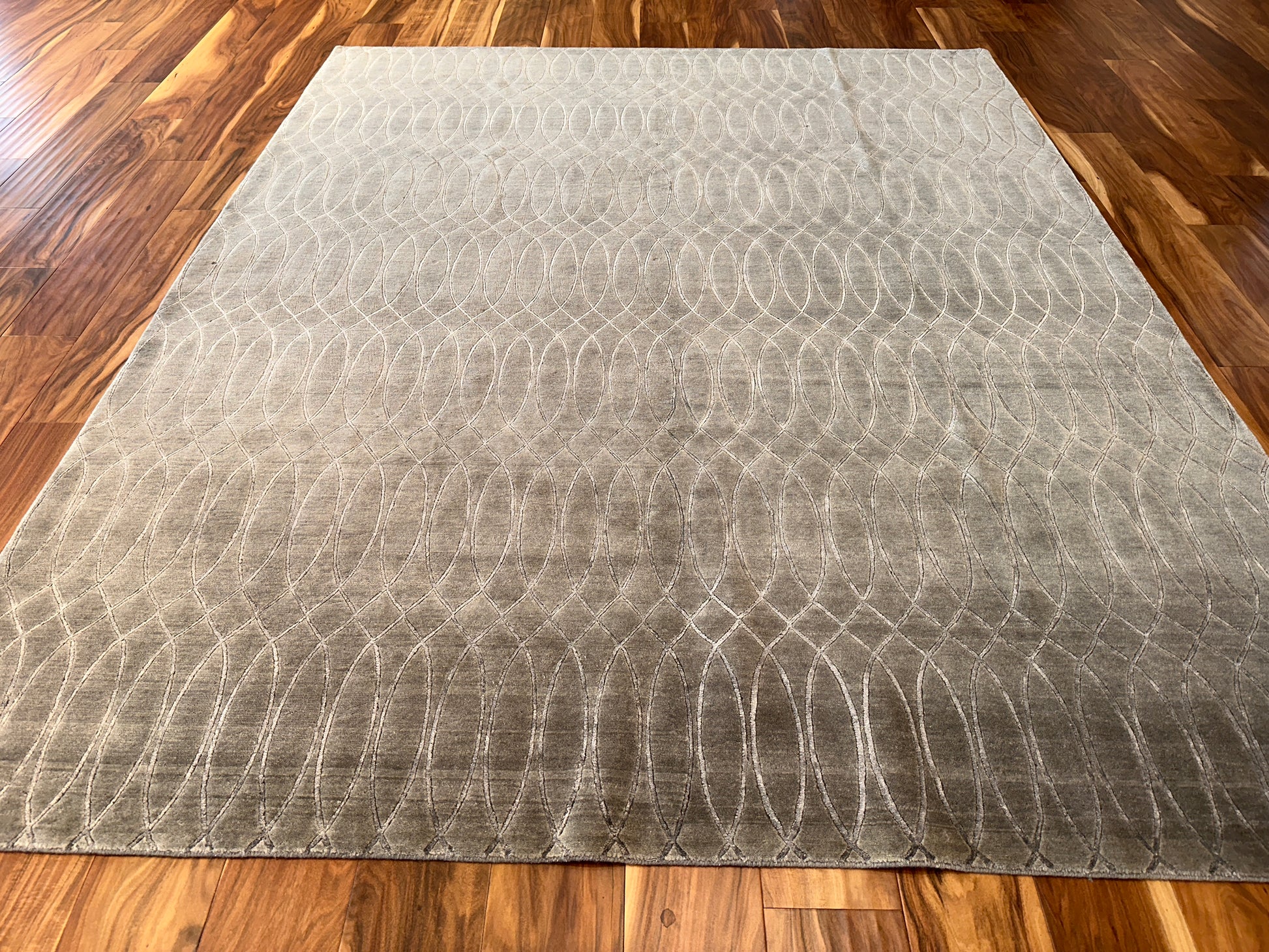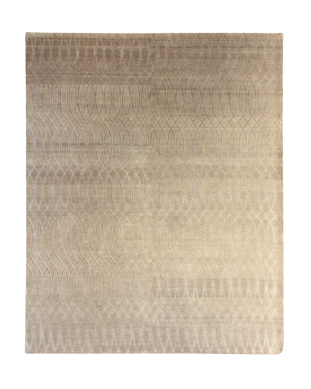 A serene play of texture and tone defines this sophisticated rug, where a rhythmic pattern of interlocking ovals emerges subtly from a smoky gray base. Hand-knotted with care, it offers a refined, tonal elegance that gently reflects the light and enriches the room without overwhelming it. The simplicity of the design makes it a seamless addition to both classic and contemporary interiors.