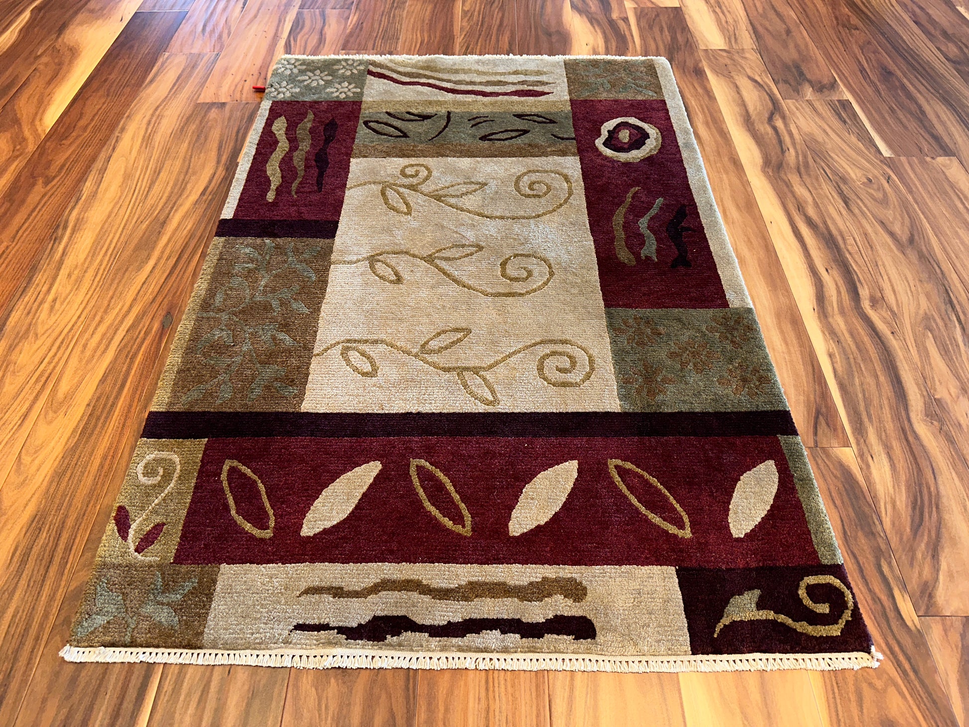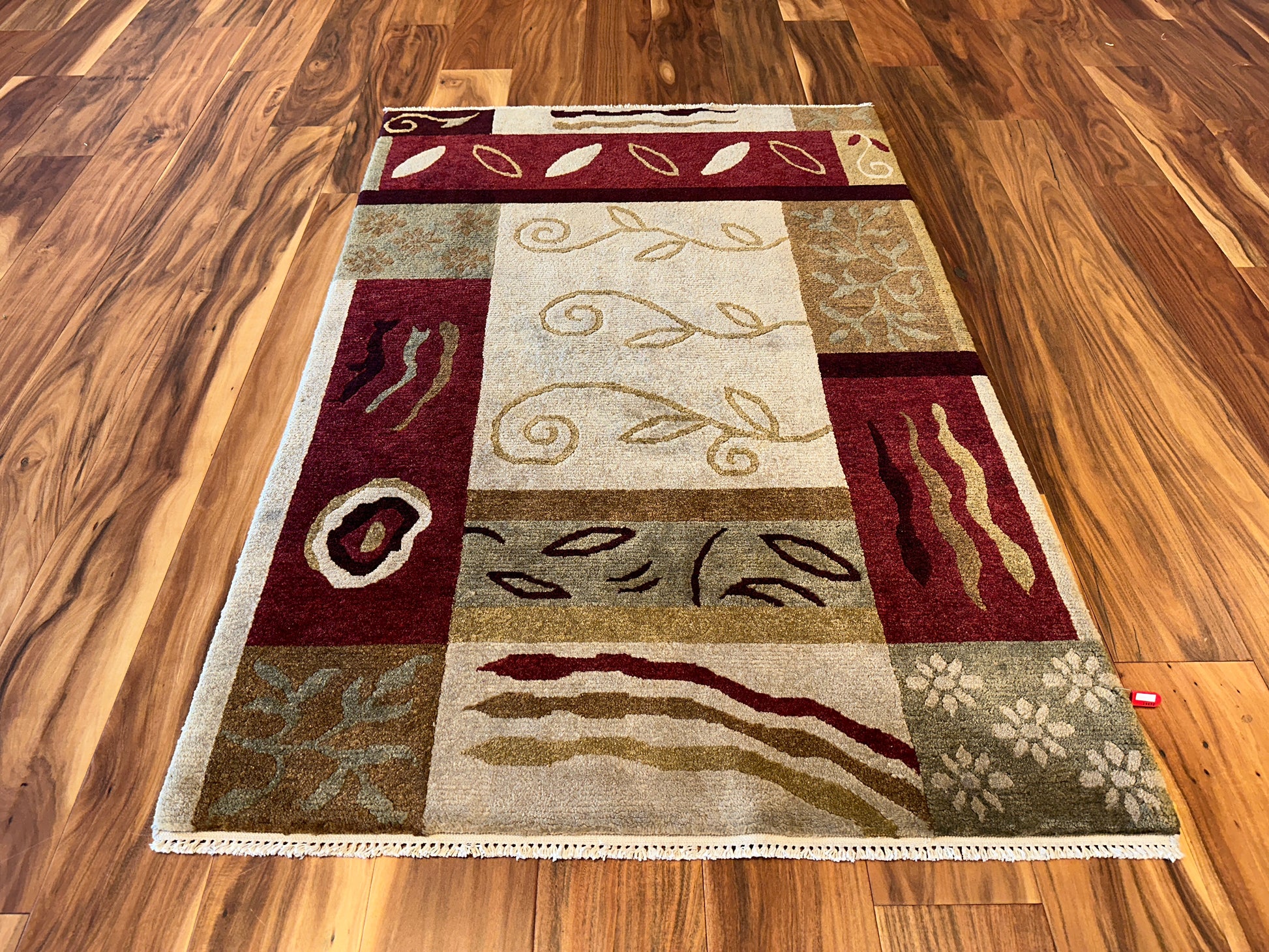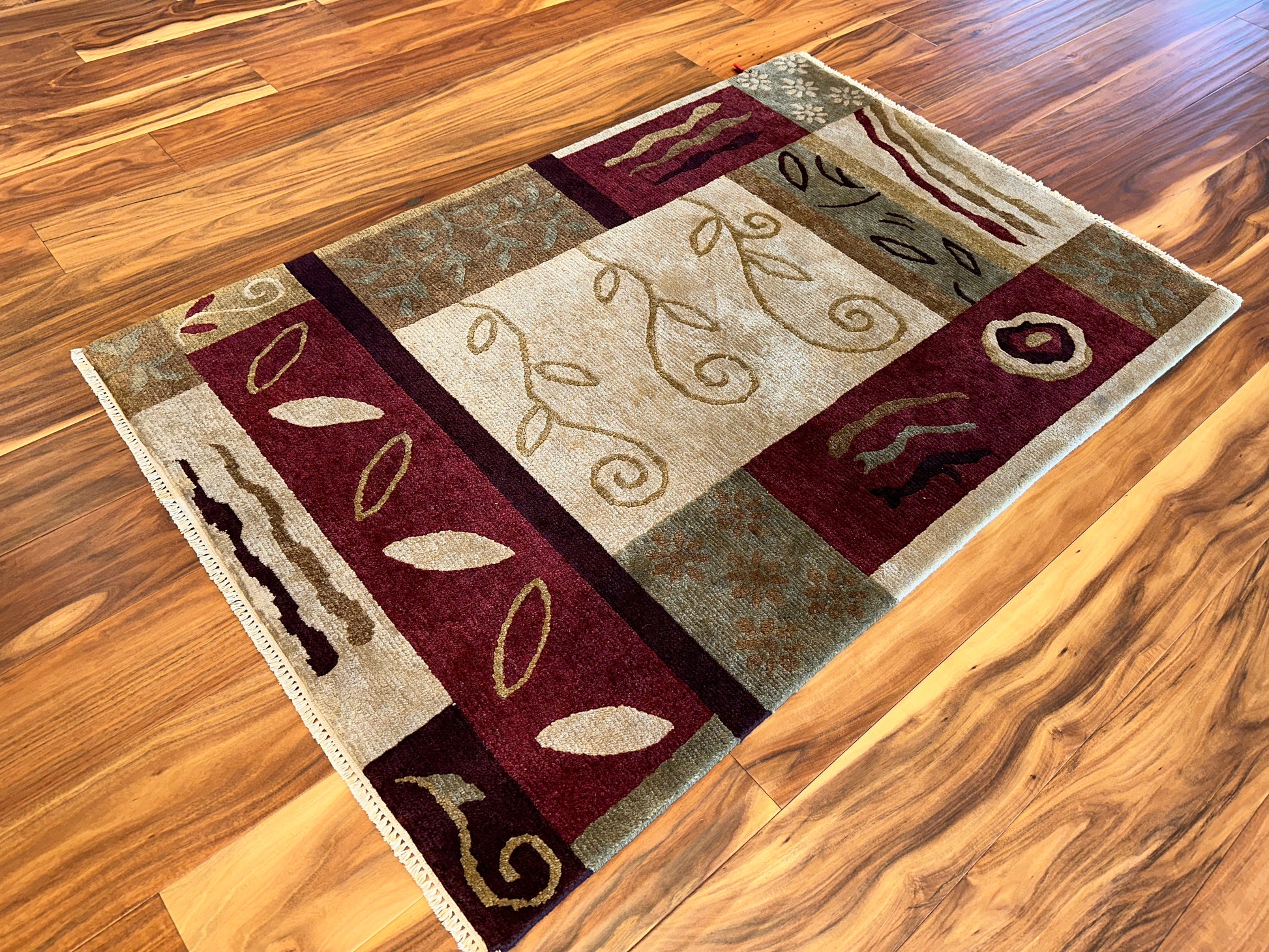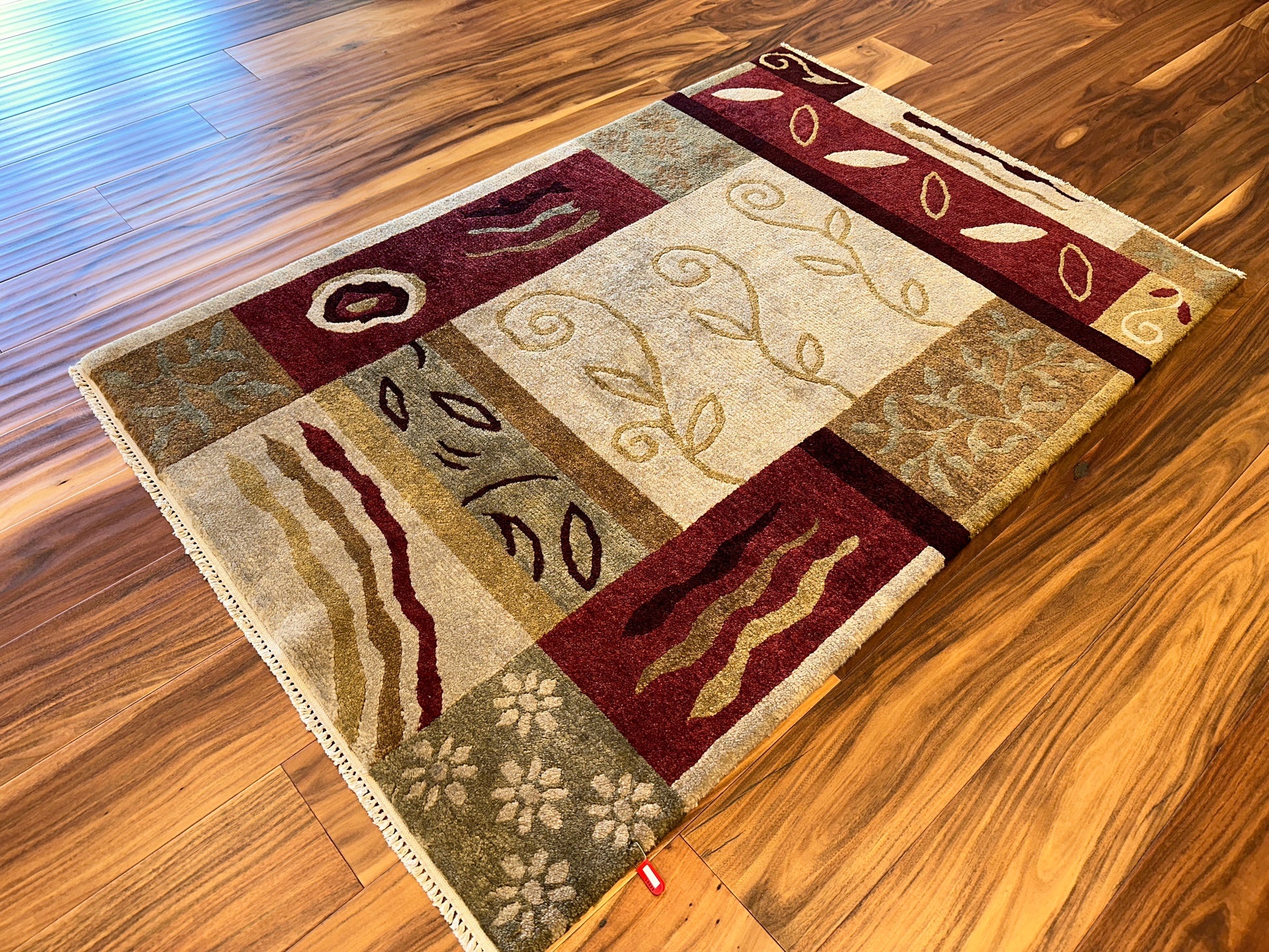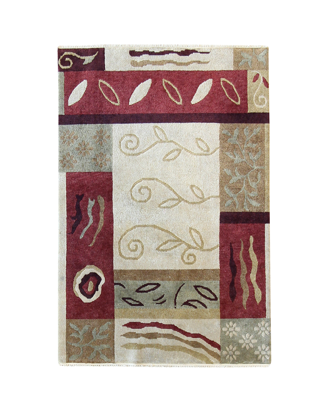 A playful mix of abstract vines, leaves, and natural forms dance across this rug in a lively patchwork layout. The combination of soft beige, olive, and deep red tones creates visual interest with a grounded, organic warmth. Each panel tells its own story, bringing a sense of movement and balance to the composition.