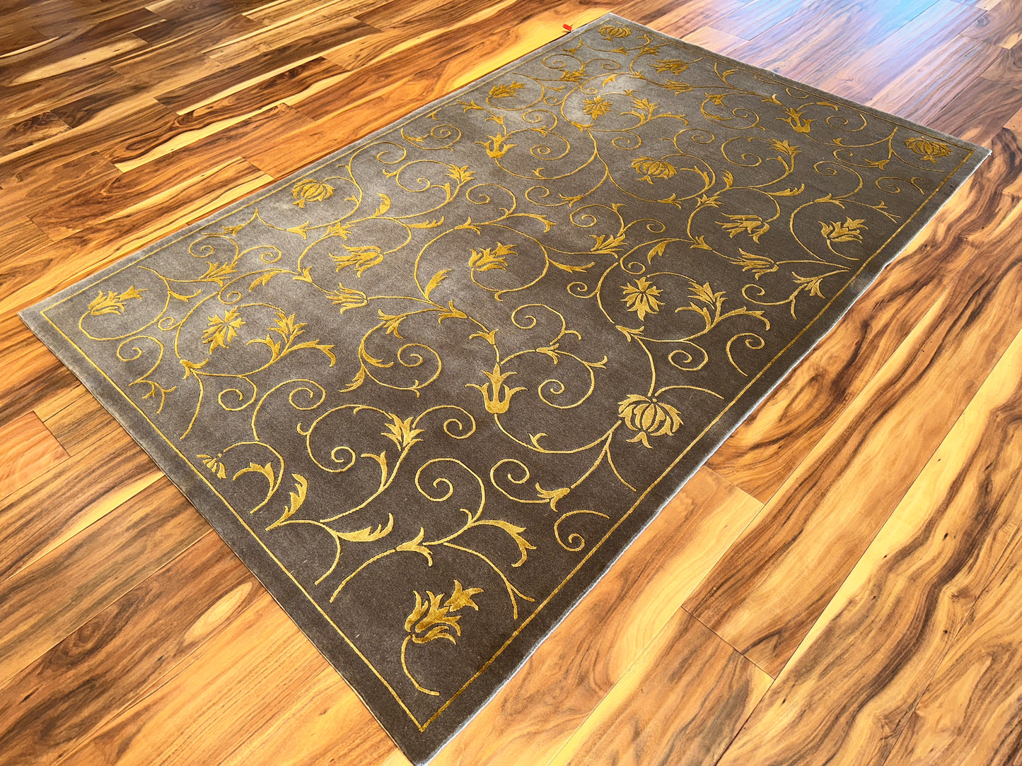 Elegant and contemporary, this handmade rug features a graceful scrolling vine and floral motif in golden yellow, delicately etched into a velvety gray field. The monochromatic color scheme adds a modern edge, while the softly embossed design brings texture and depth to its refined simplicity.