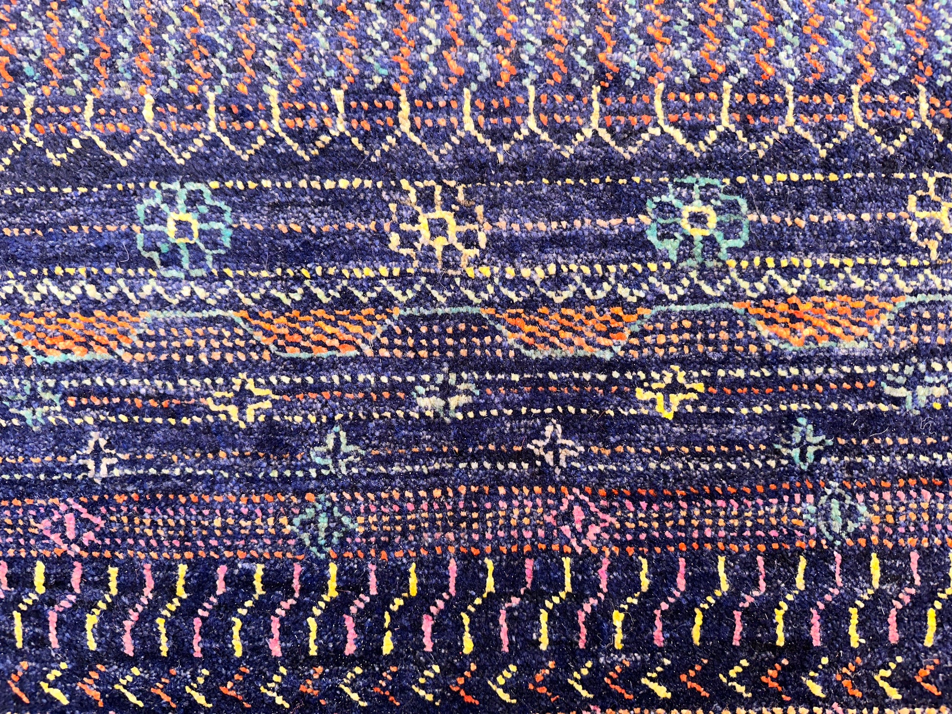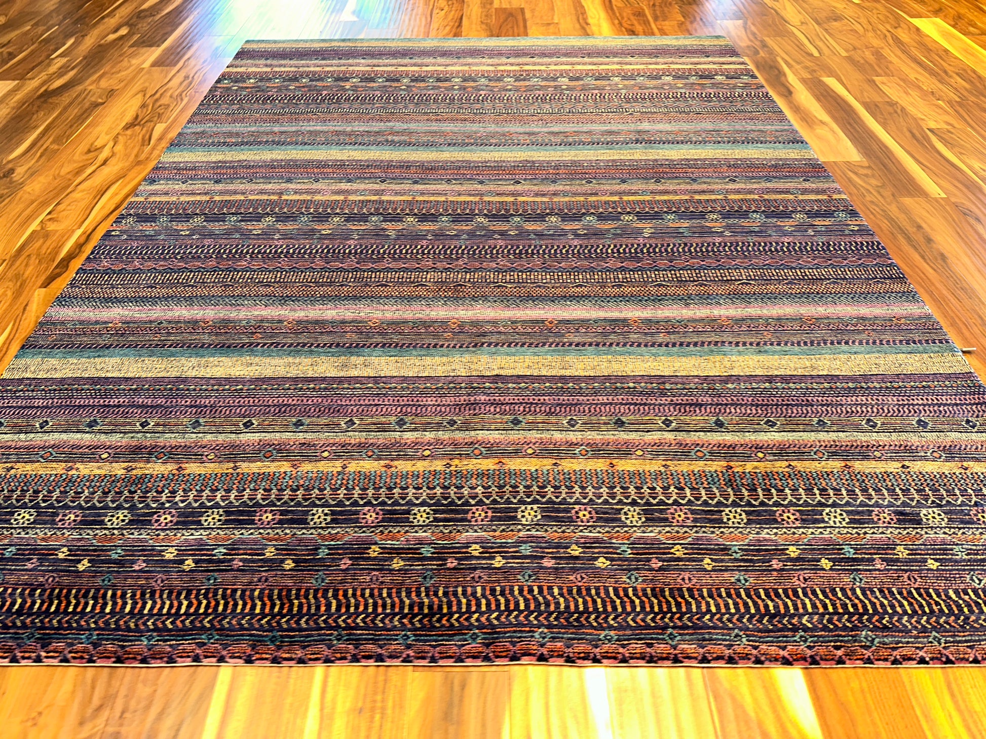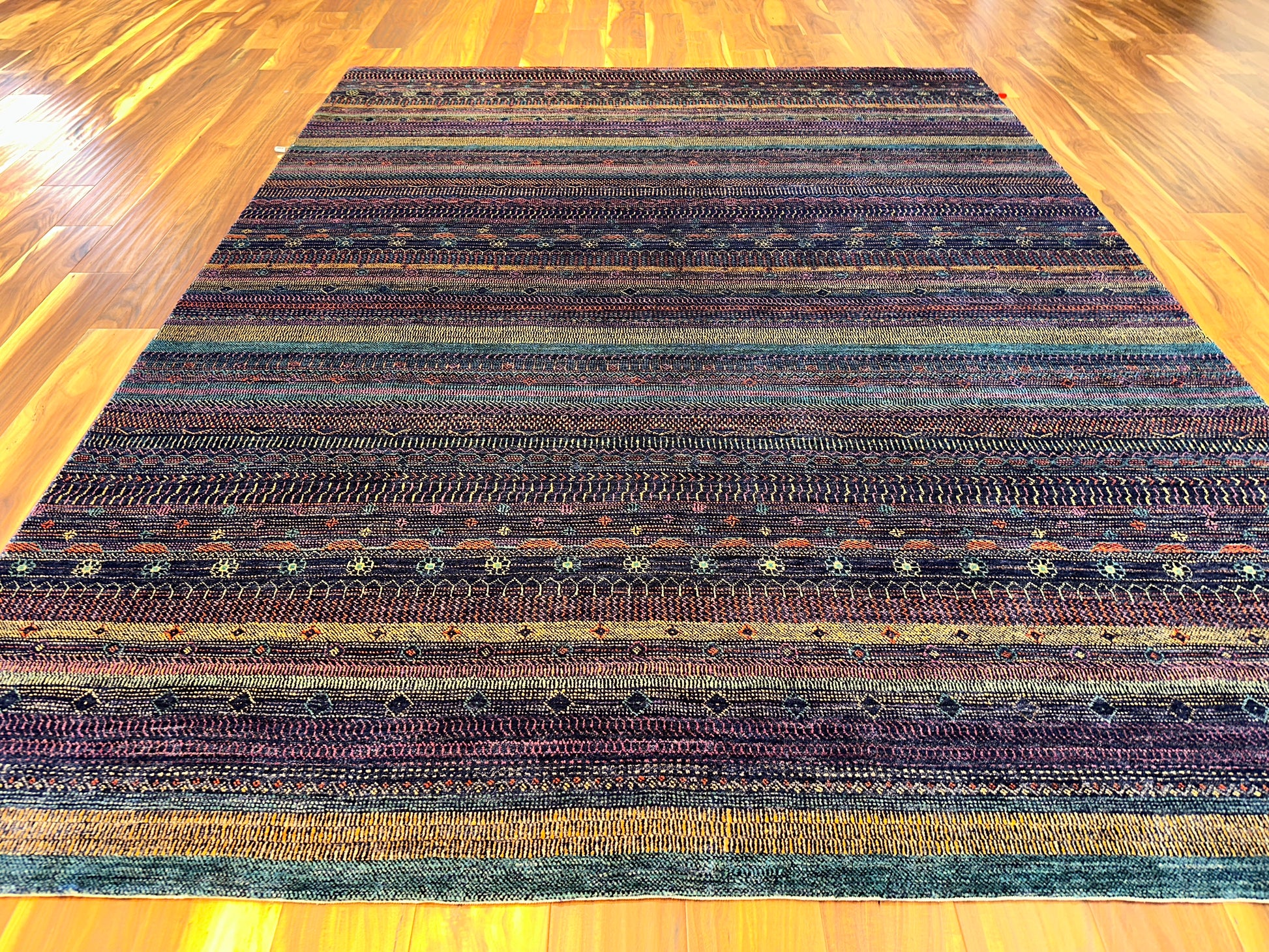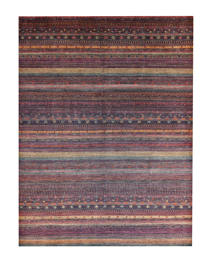 Richly layered and full of character, this hand-knotted rug is inspired by tribal textiles and traditional weaving motifs. Alternating rows of fine detailing—dots, chevrons, lozenges, and miniature lattice forms—create a rhythmic horizontal flow across the surface. The palette blends deep purples, rust reds, golden saffron, indigo, and touches of turquoise, delivering a balanced, earthy sophistication that feels both ancient and grounded.