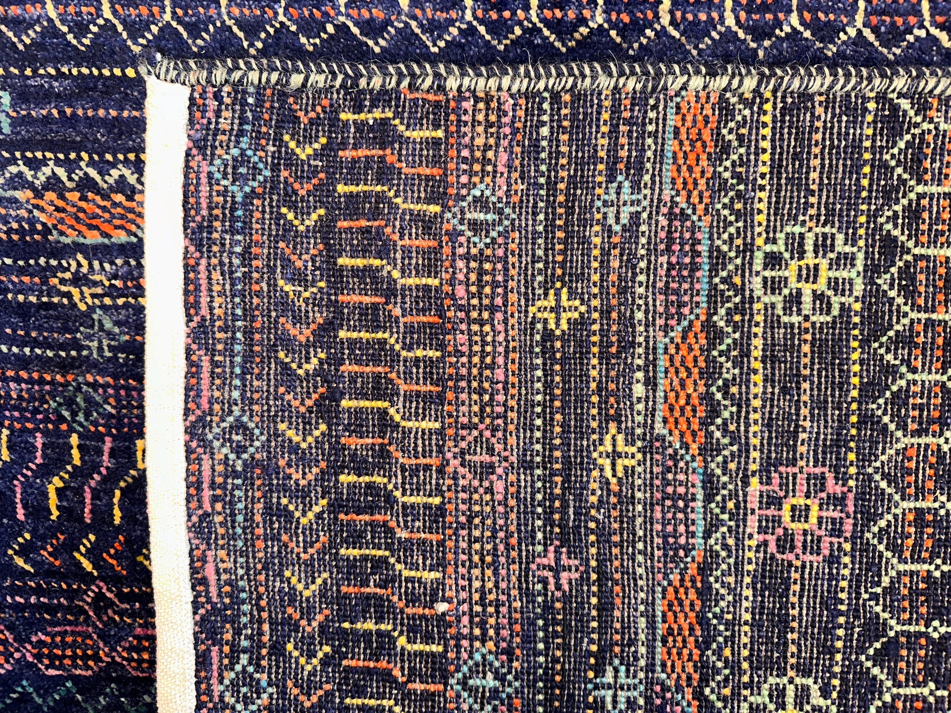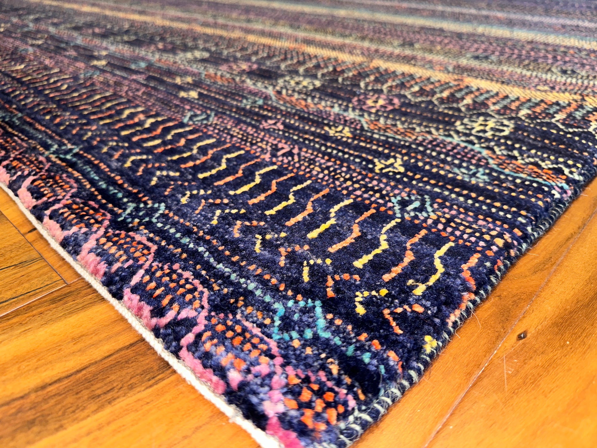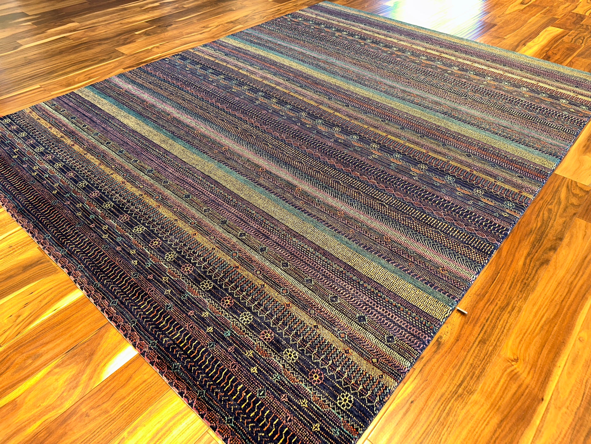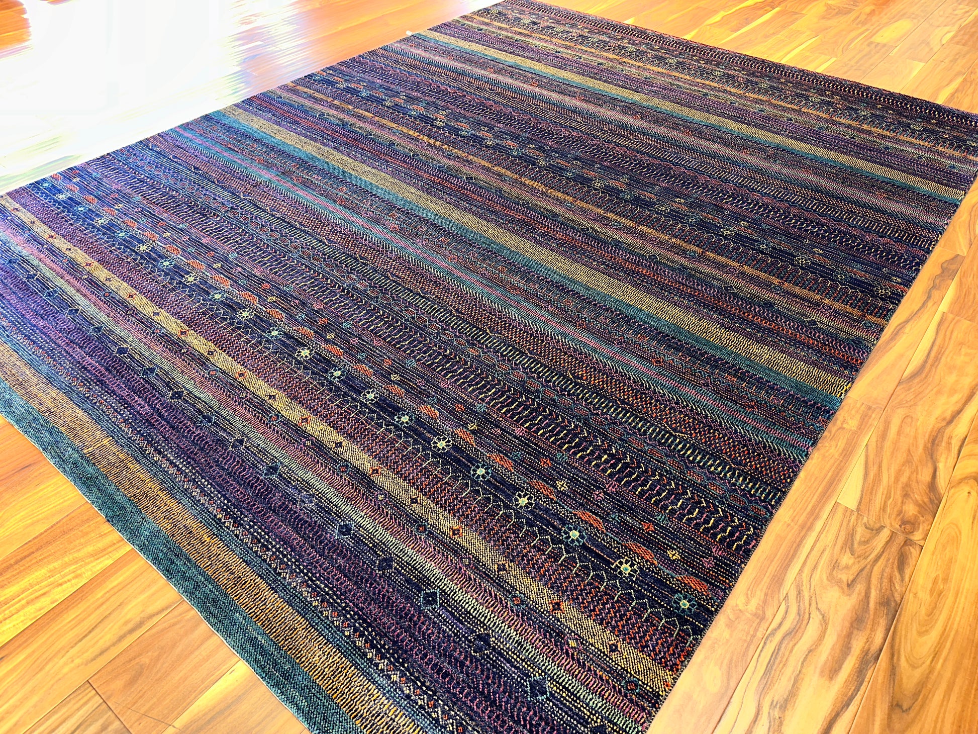 Richly layered and full of character, this hand-knotted rug is inspired by tribal textiles and traditional weaving motifs. Alternating rows of fine detailing—dots, chevrons, lozenges, and miniature lattice forms—create a rhythmic horizontal flow across the surface. The palette blends deep purples, rust reds, golden saffron, indigo, and touches of turquoise, delivering a balanced, earthy sophistication that feels both ancient and grounded.