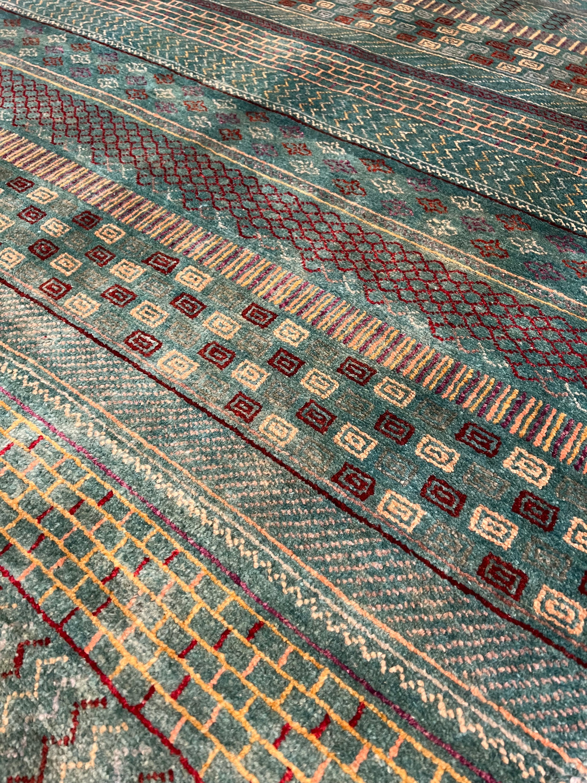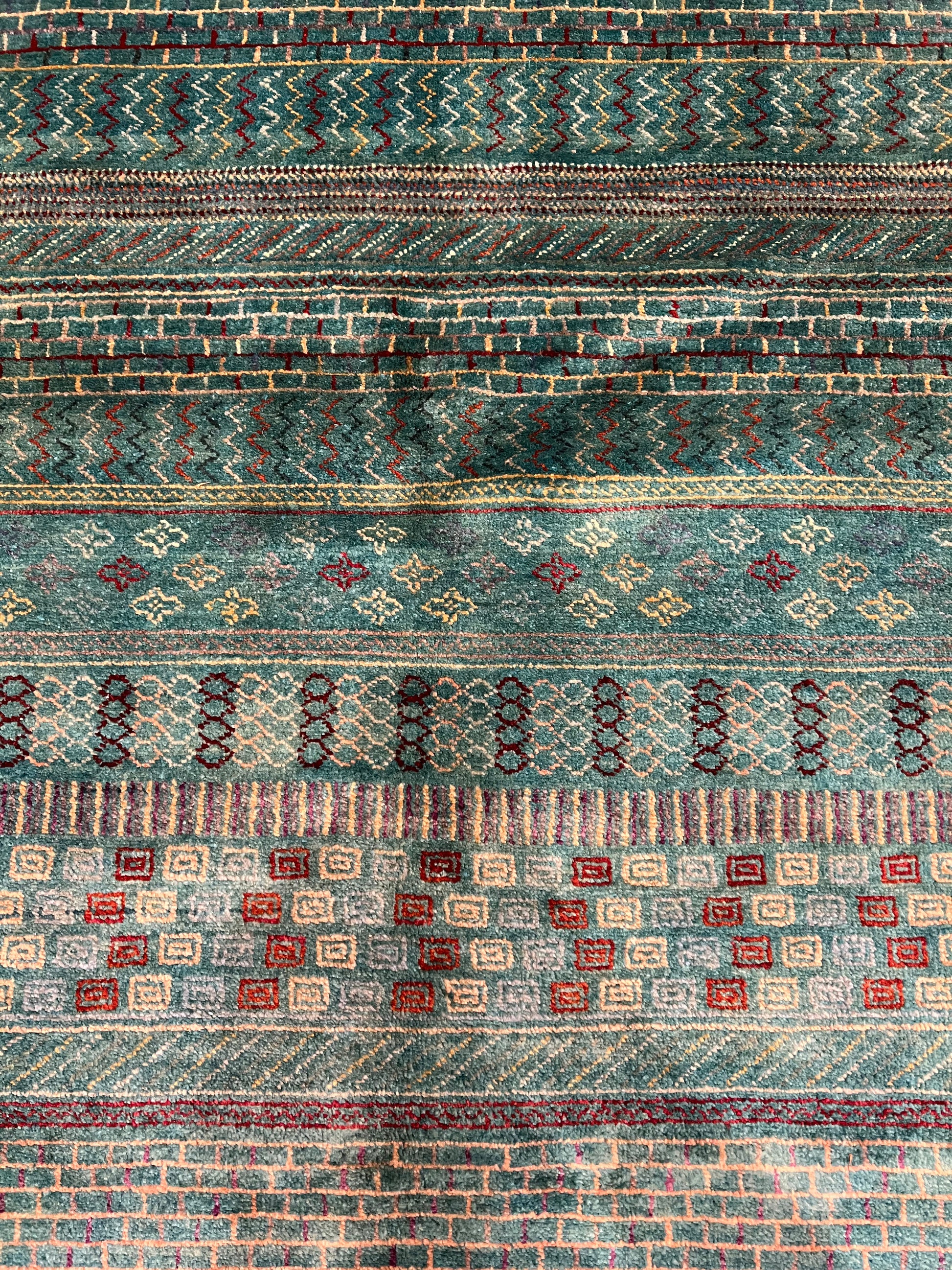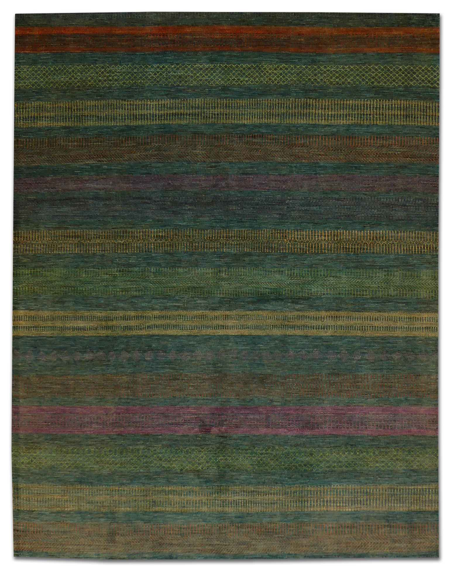 This Modern Gabbeh rug showcases a sophisticated, minimalist style with a rich texture that enhances any contemporary home. Skilfully crafted from high-quality wool, it features an array of muted green, brown, and subtle red hues, woven in a way that creates depth and a sense of movement. Its understated, abstract pattern offers versatility, blending in seamlessly with modern and transitional decors.