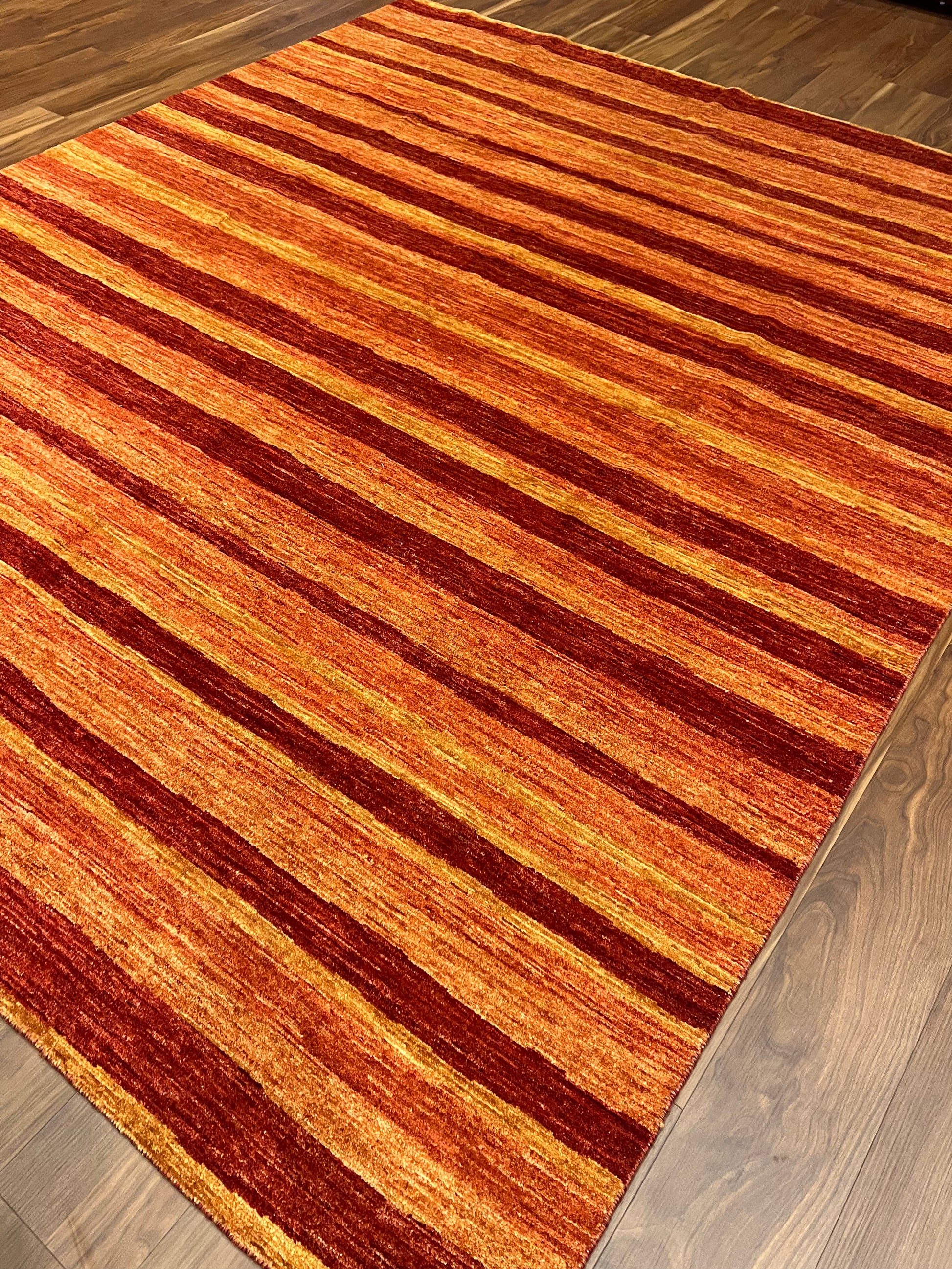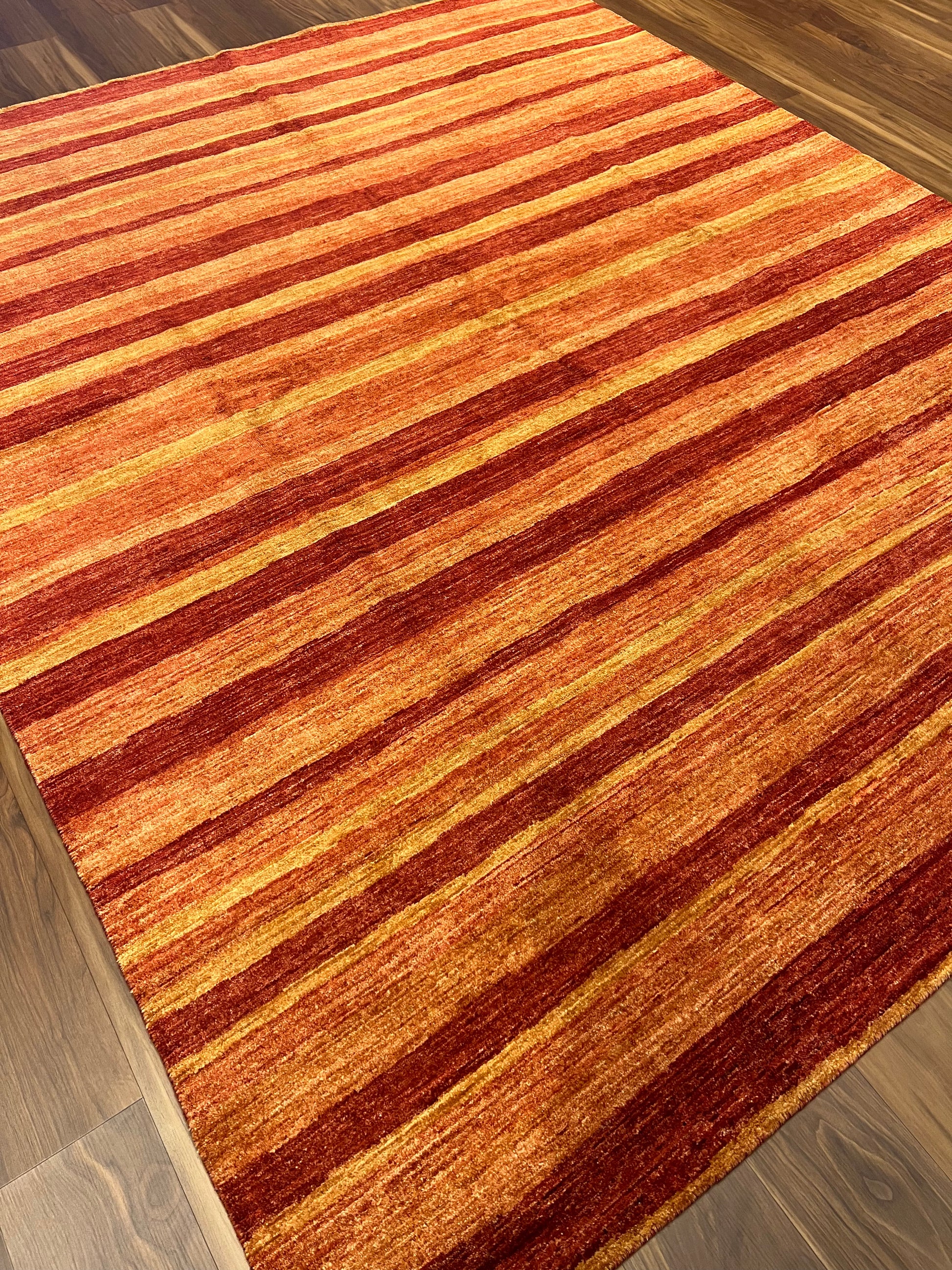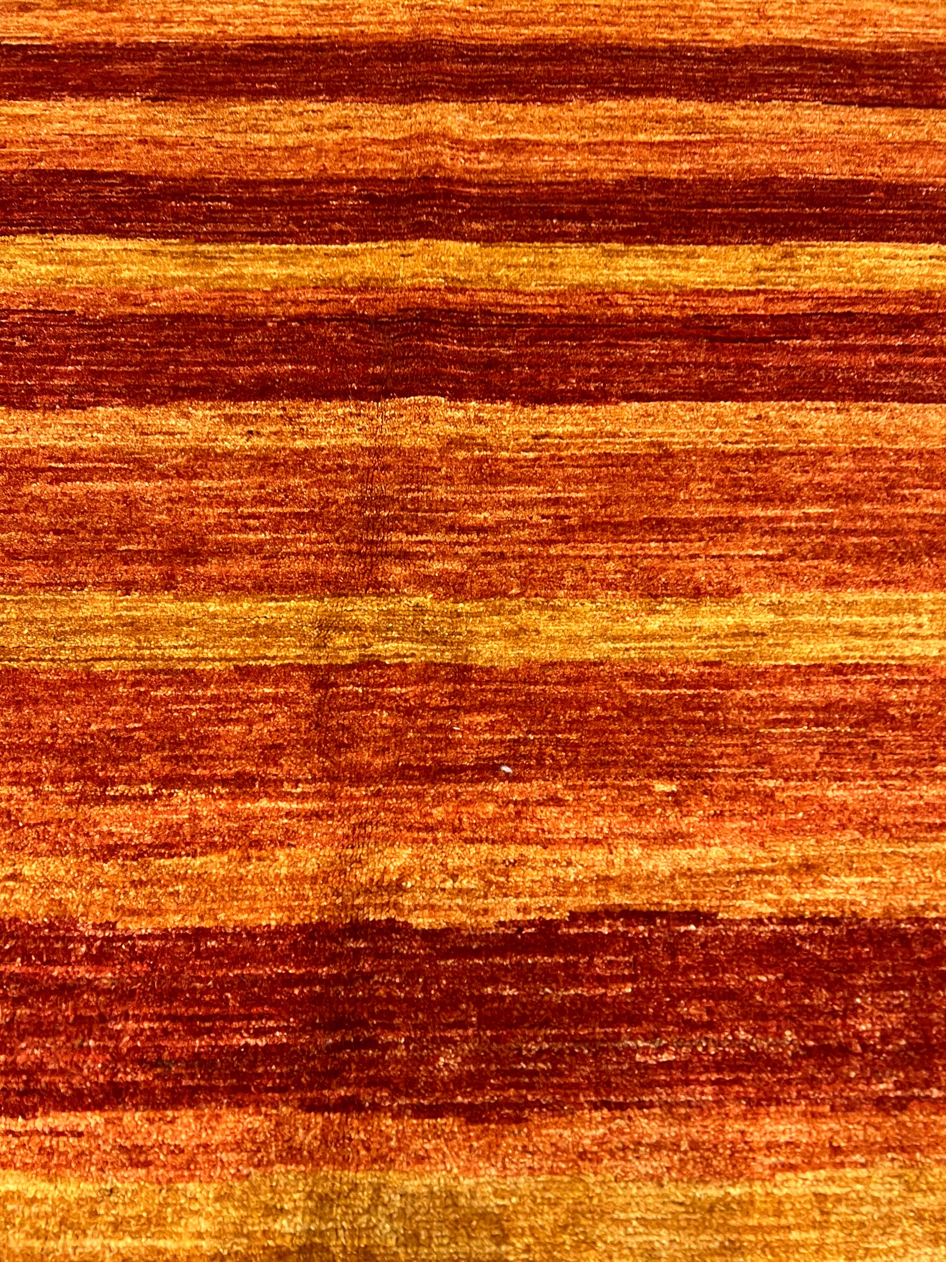 This exquisite Modern Gabbeh rug features a mesmerizing gradient of warm colors that evoke the essence of a serene sunset. Handcrafted from high-quality wool, the texture and plushness provide luxurious comfort underfoot. The simple yet bold stripes create a statement piece that blends harmoniously with contemporary interiors while adding a touch of elegance and warmth. It's perfect for bringing an inviting atmosphere to any room.