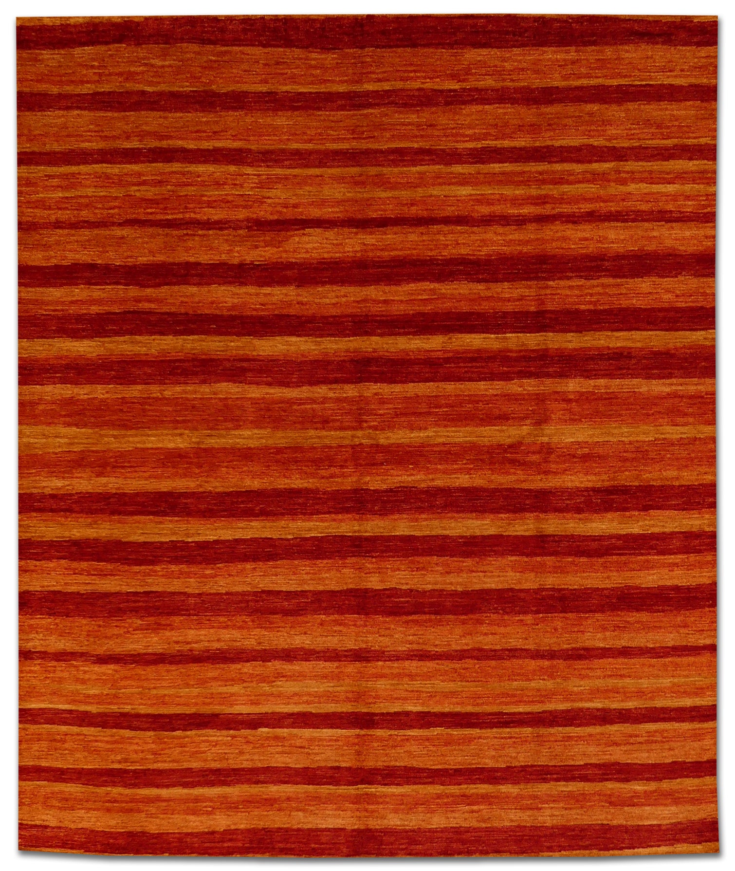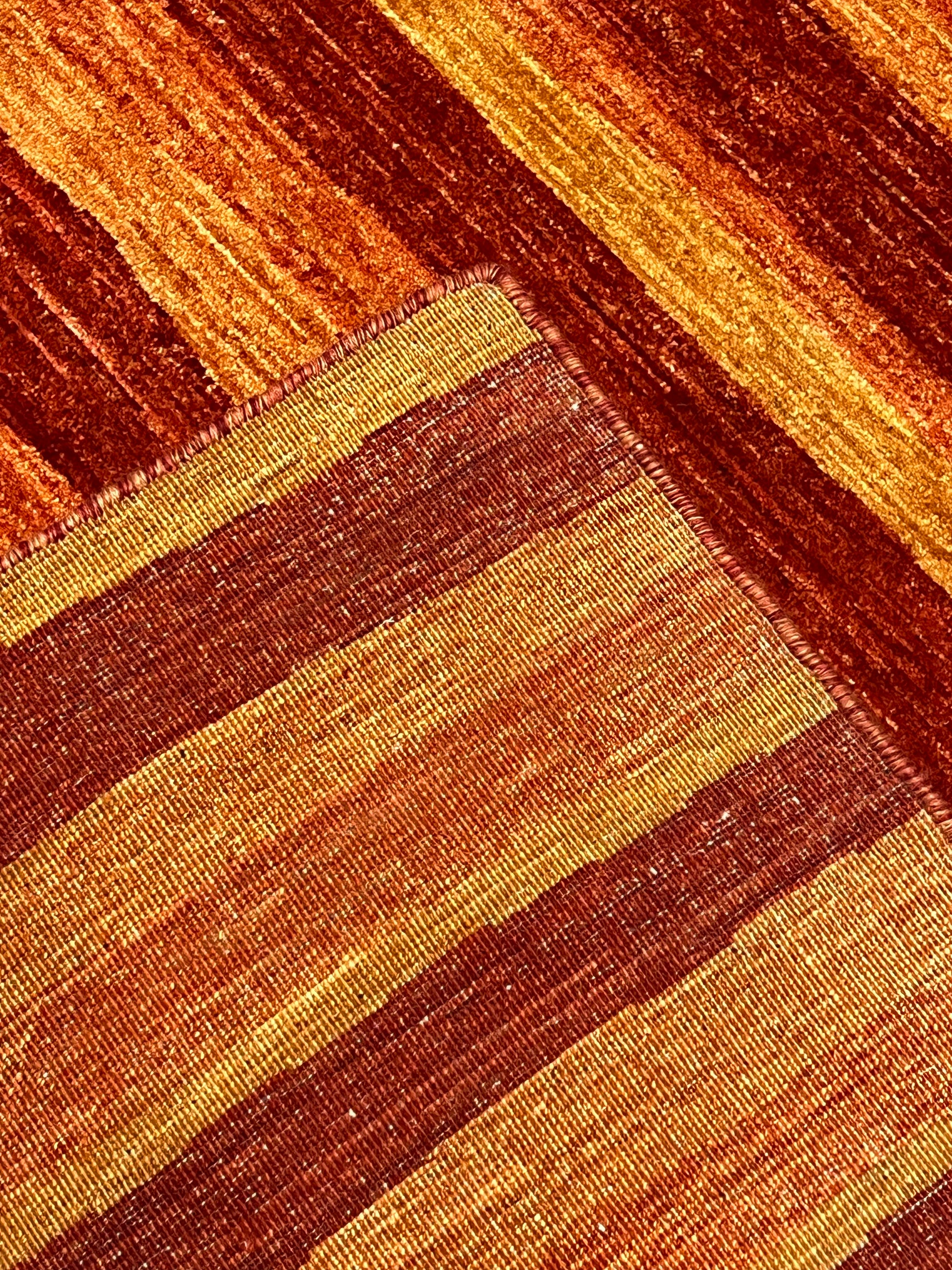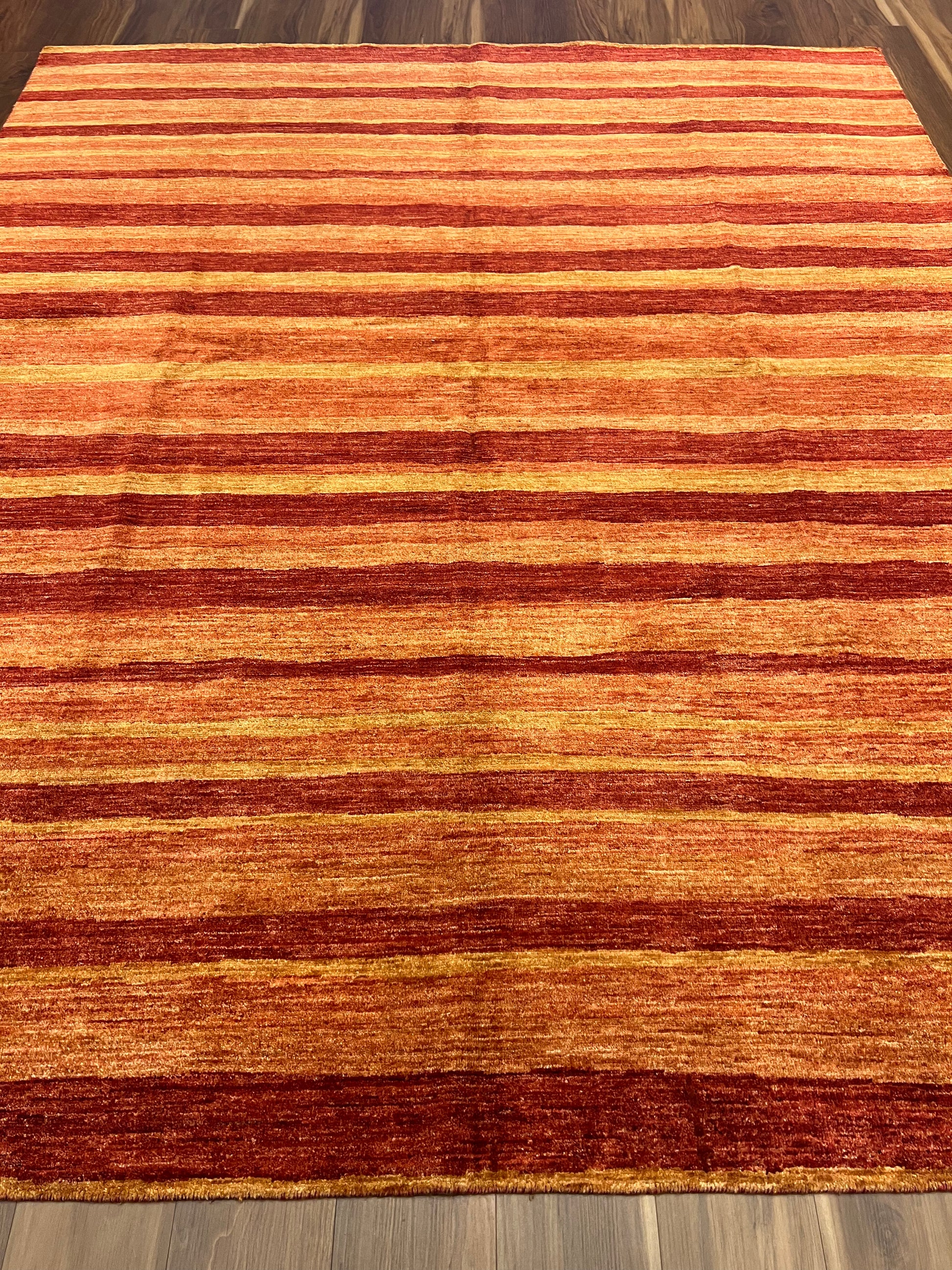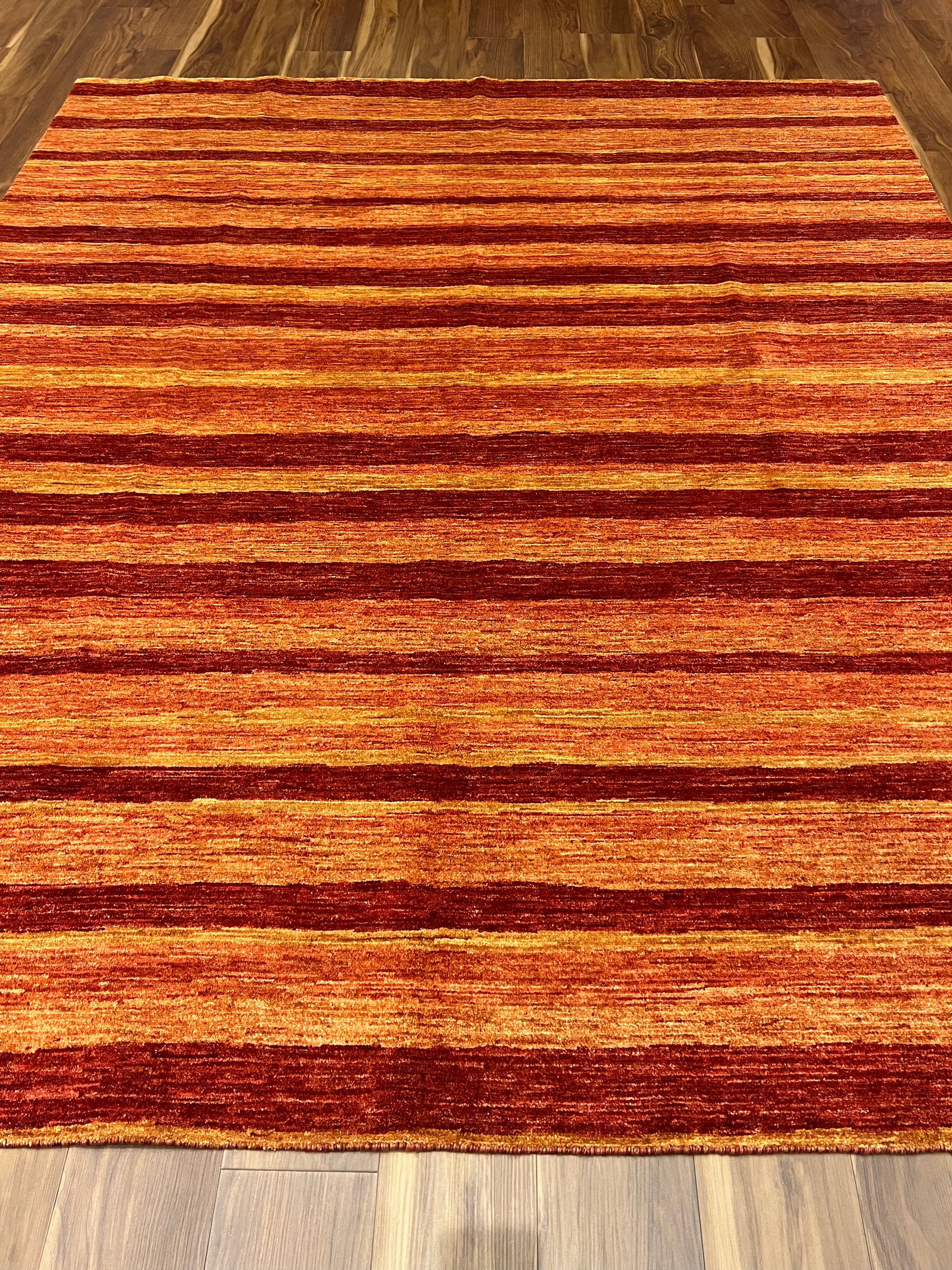 This exquisite Modern Gabbeh rug features a mesmerizing gradient of warm colors that evoke the essence of a serene sunset. Handcrafted from high-quality wool, the texture and plushness provide luxurious comfort underfoot. The simple yet bold stripes create a statement piece that blends harmoniously with contemporary interiors while adding a touch of elegance and warmth. It's perfect for bringing an inviting atmosphere to any room.