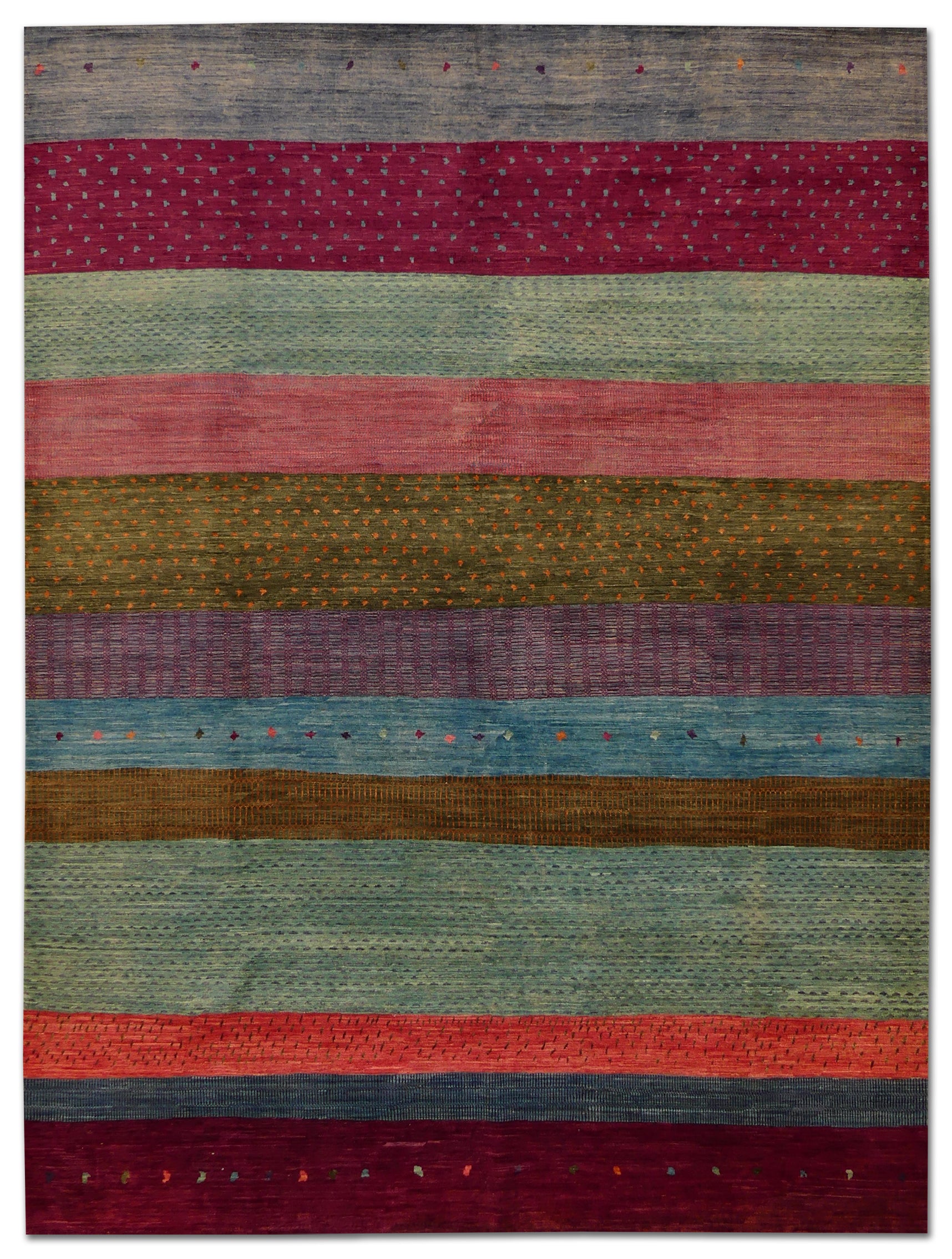 This hand-knotted Modern Gabbeh rug brings a colorful and contemporary flair to traditional design. Made from wool, the rug features a series of broad horizontal stripes in a vivid palette of red, gray, green, blue, orange, and brown. Accents of complementary hues and subtle motifs lend a unique charm to each colored band, creating a tapestry of modern artistic expression. It is ideal for adding warmth and character to any modern living space.
