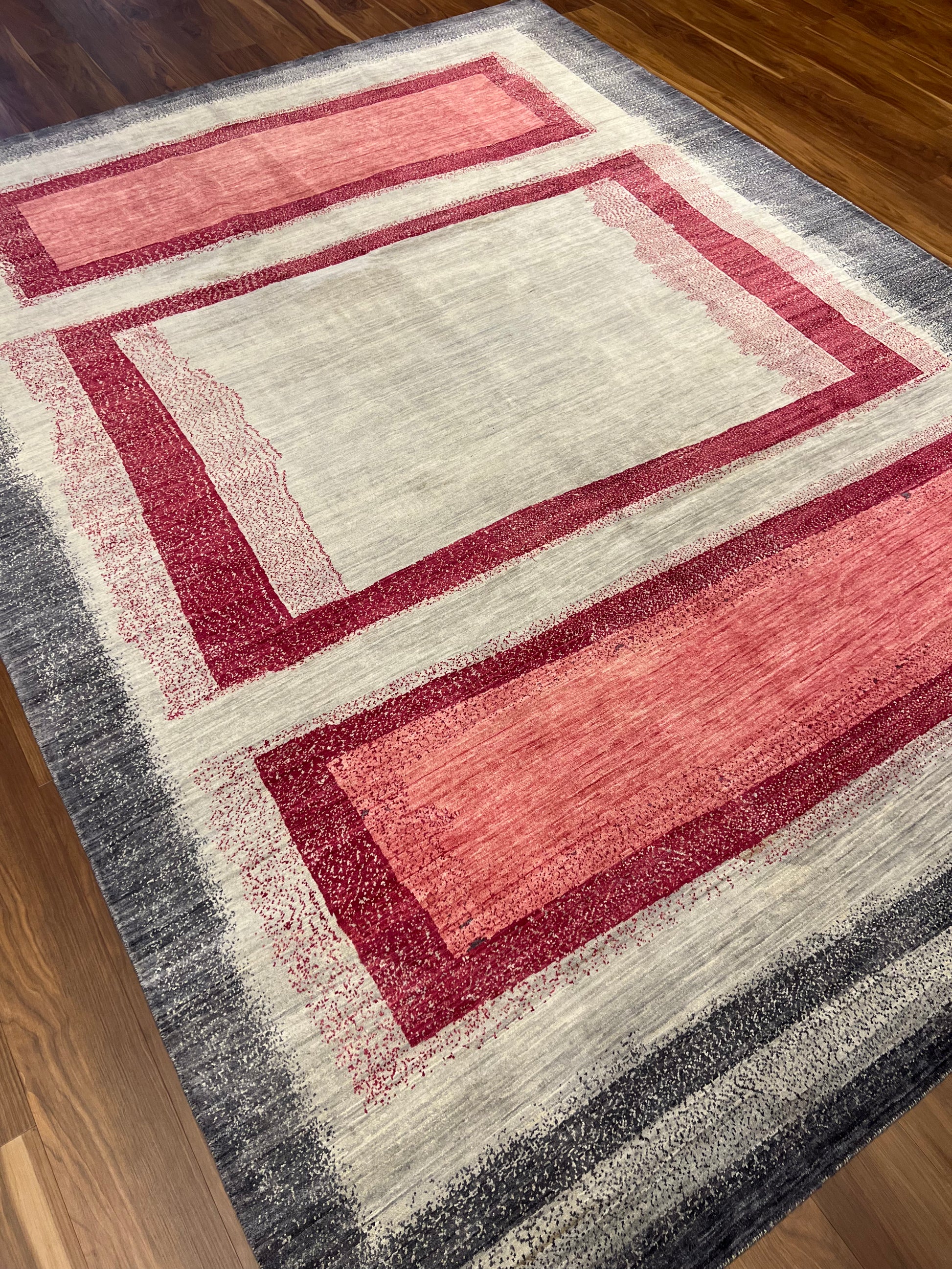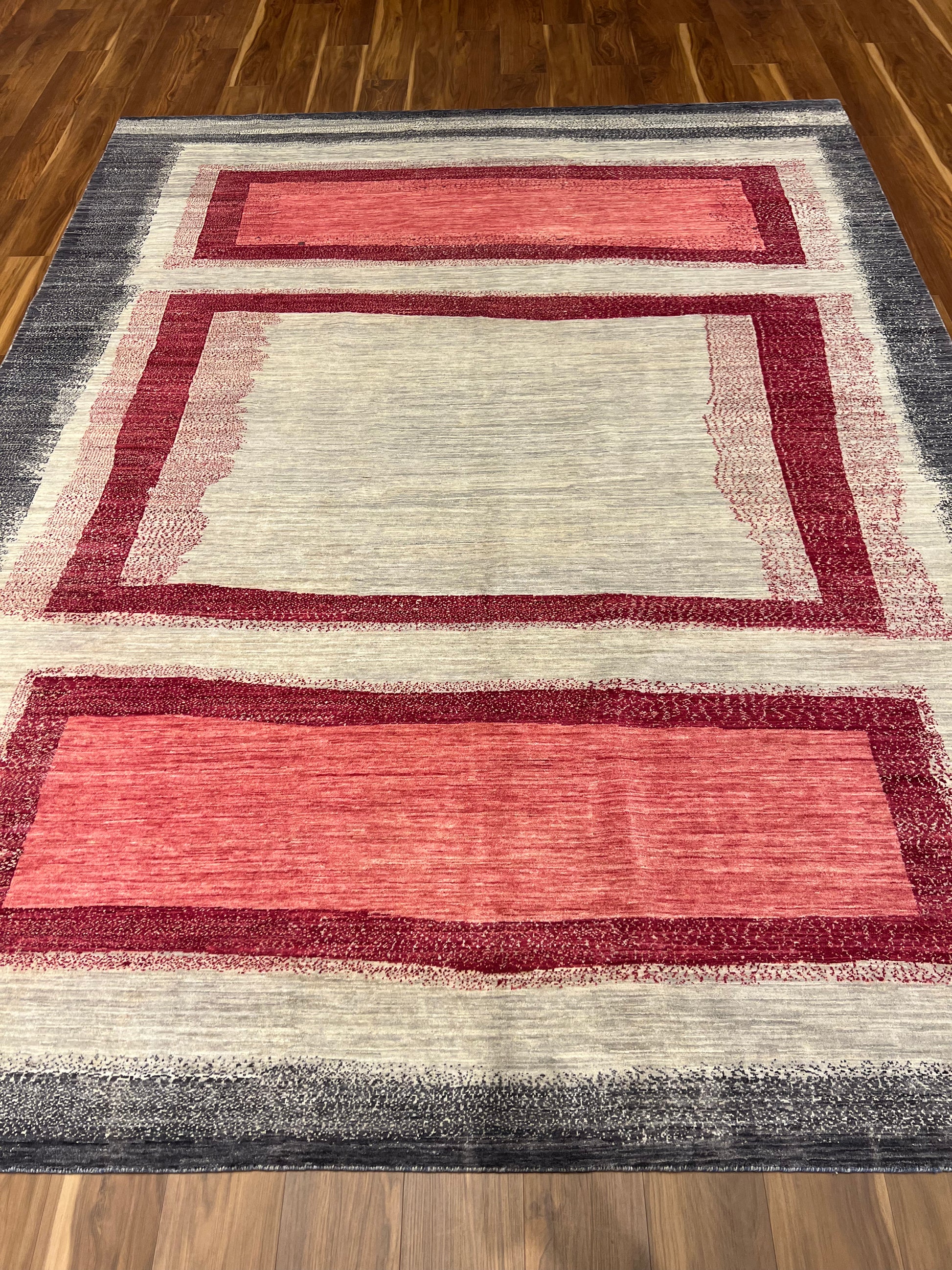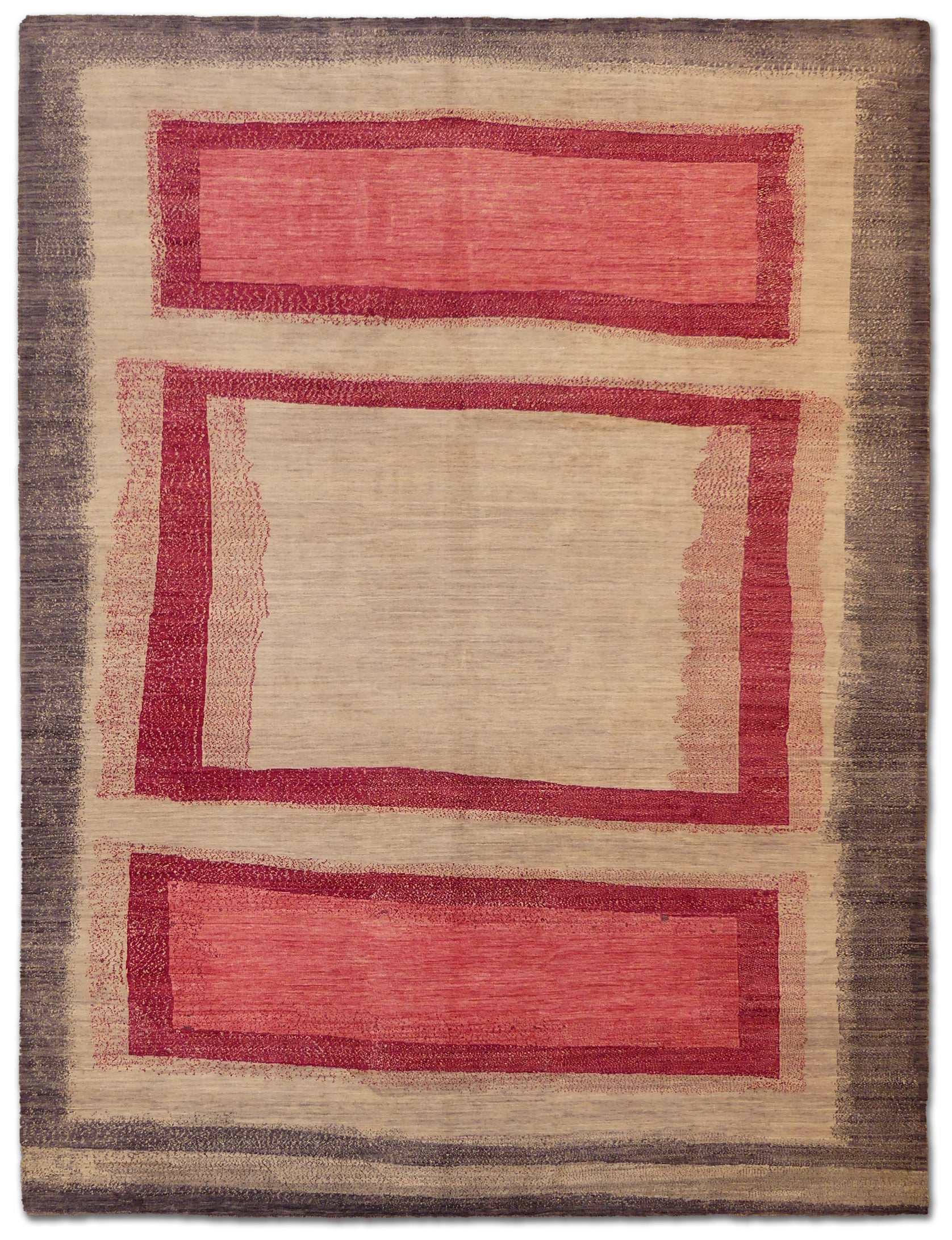 The Modern Gabbeh rug presents a minimalist design with bold rectangular patterns in rich red and soothing beige-toned color blocks. Its hand-knotted wool construction ensures durability and a soft underfoot feel, making it an ideal statement piece for contemporary interiors. Embracing clean lines and a simple aesthetic, this woolen rug effortlessly enhances modern living spaces while providing the warmth and comfort only natural fibers can offer.