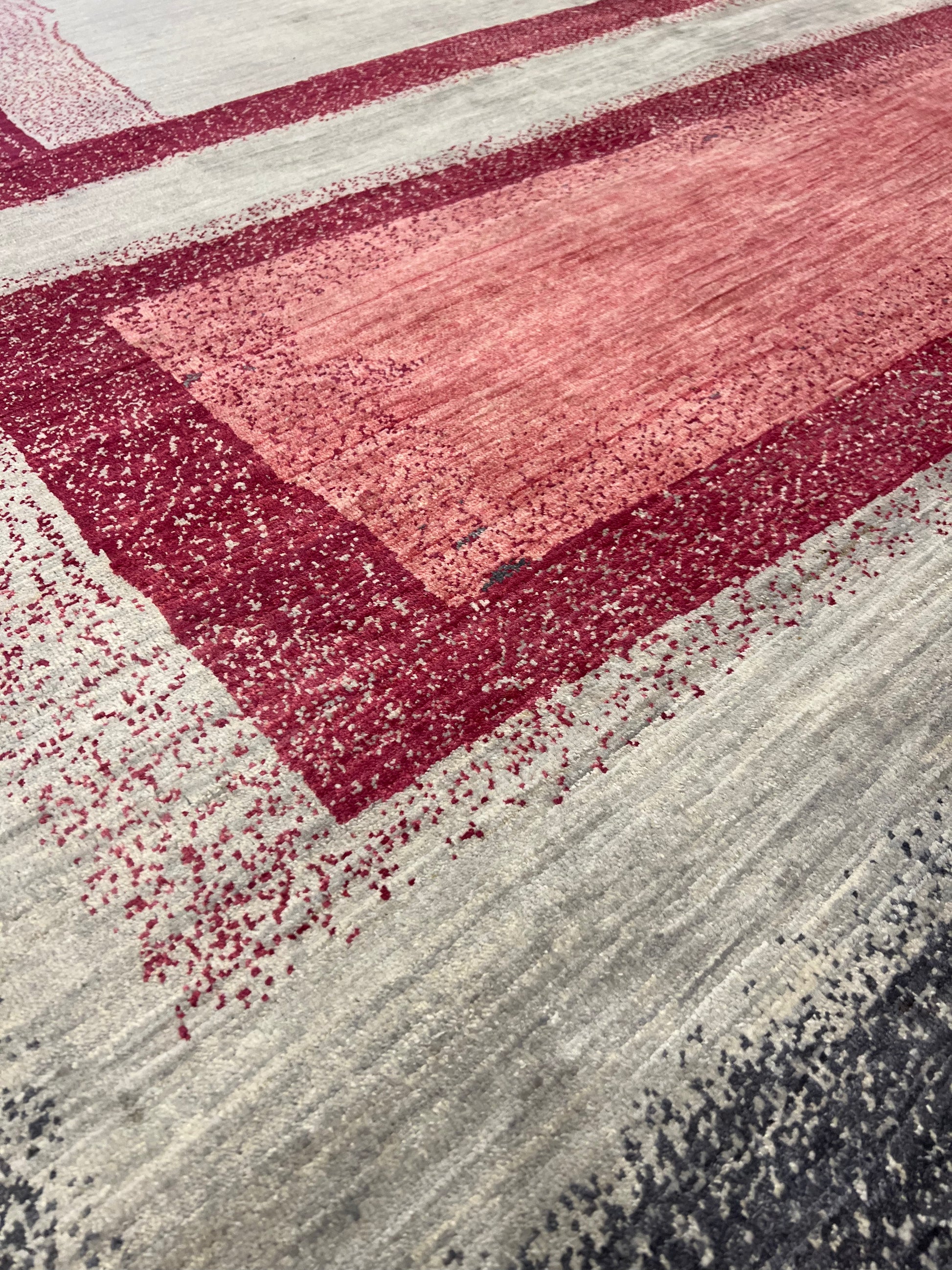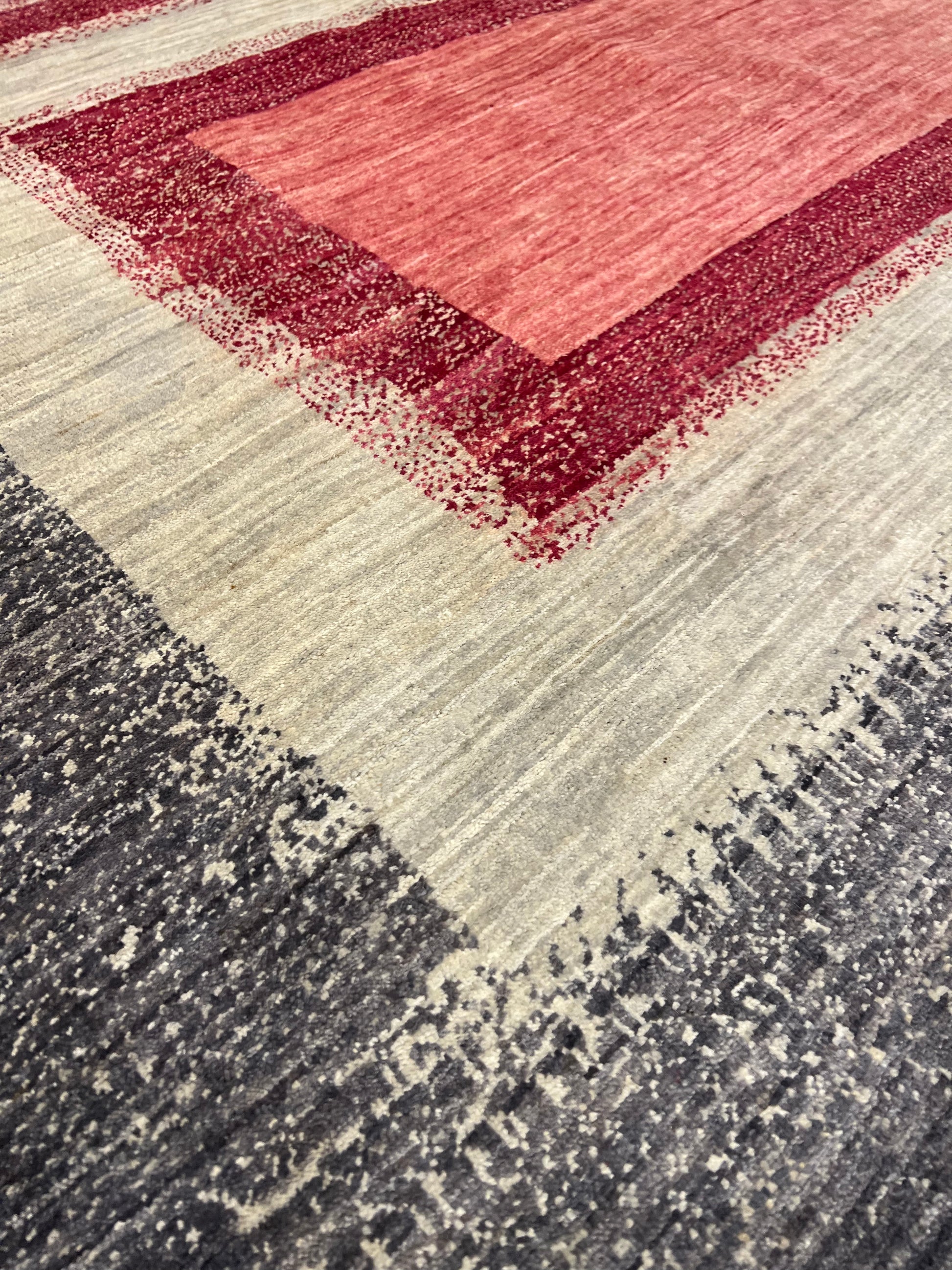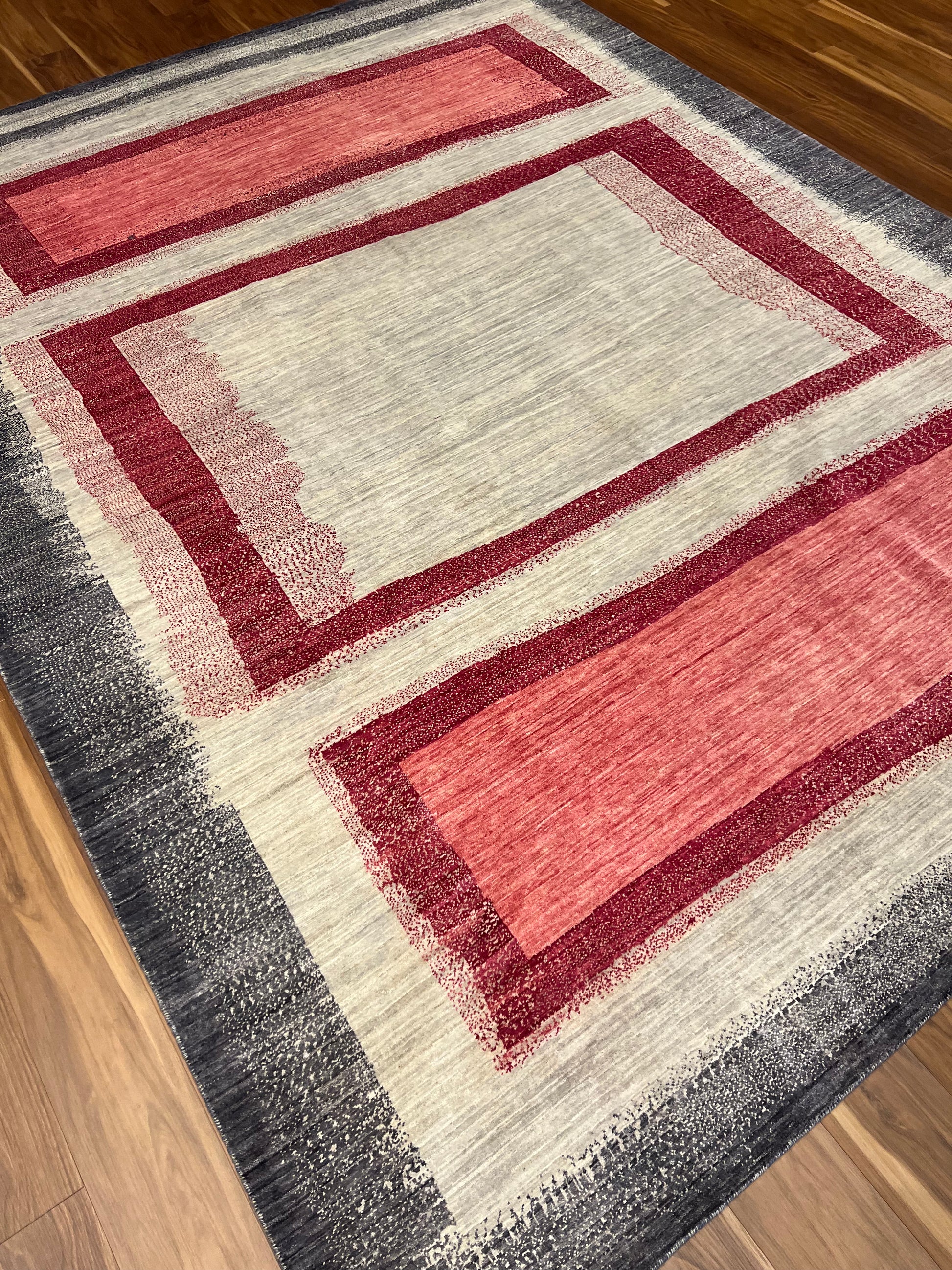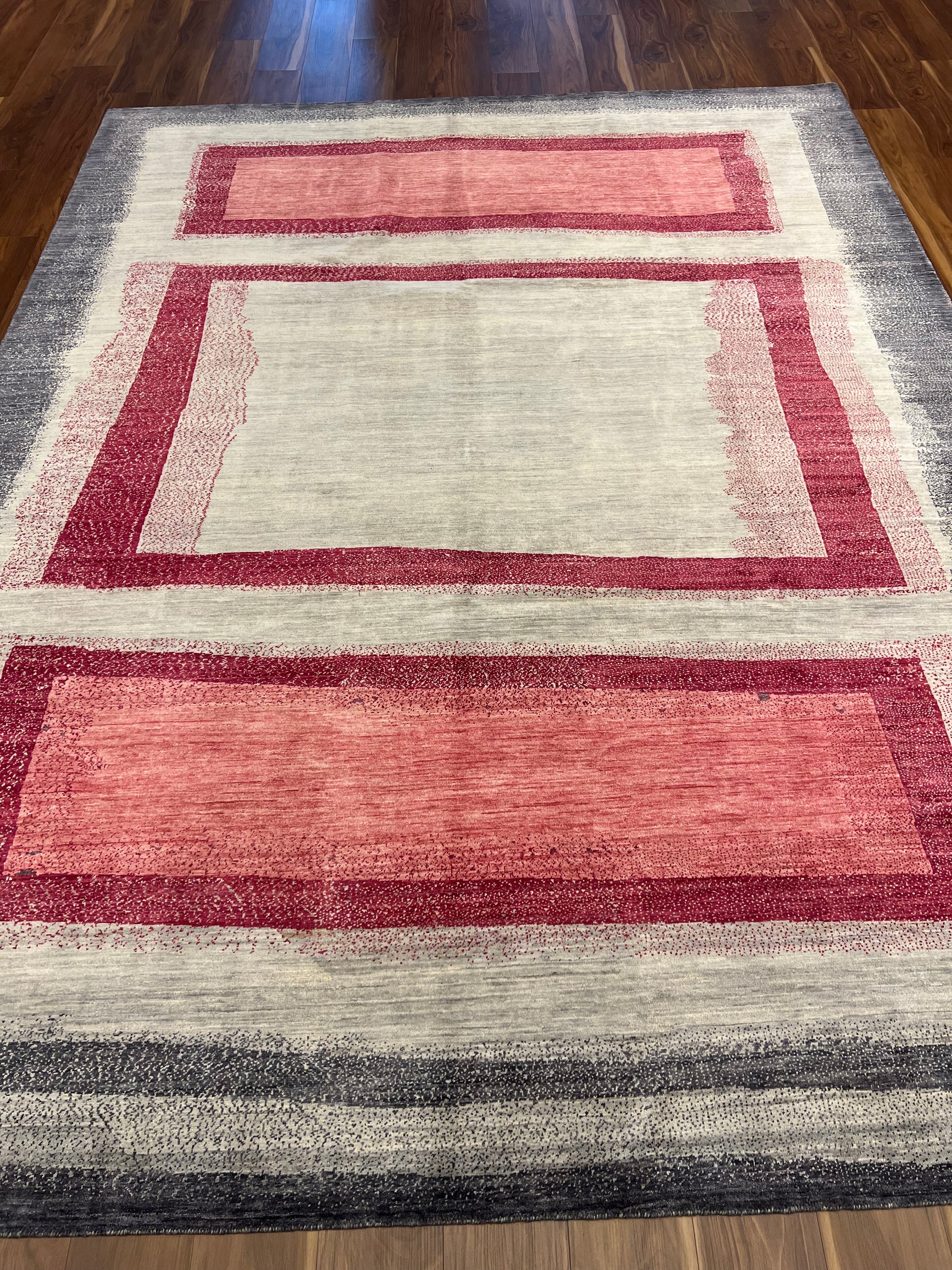 The Modern Gabbeh rug presents a minimalist design with bold rectangular patterns in rich red and soothing beige-toned color blocks. Its hand-knotted wool construction ensures durability and a soft underfoot feel, making it an ideal statement piece for contemporary interiors. Embracing clean lines and a simple aesthetic, this woolen rug effortlessly enhances modern living spaces while providing the warmth and comfort only natural fibers can offer.