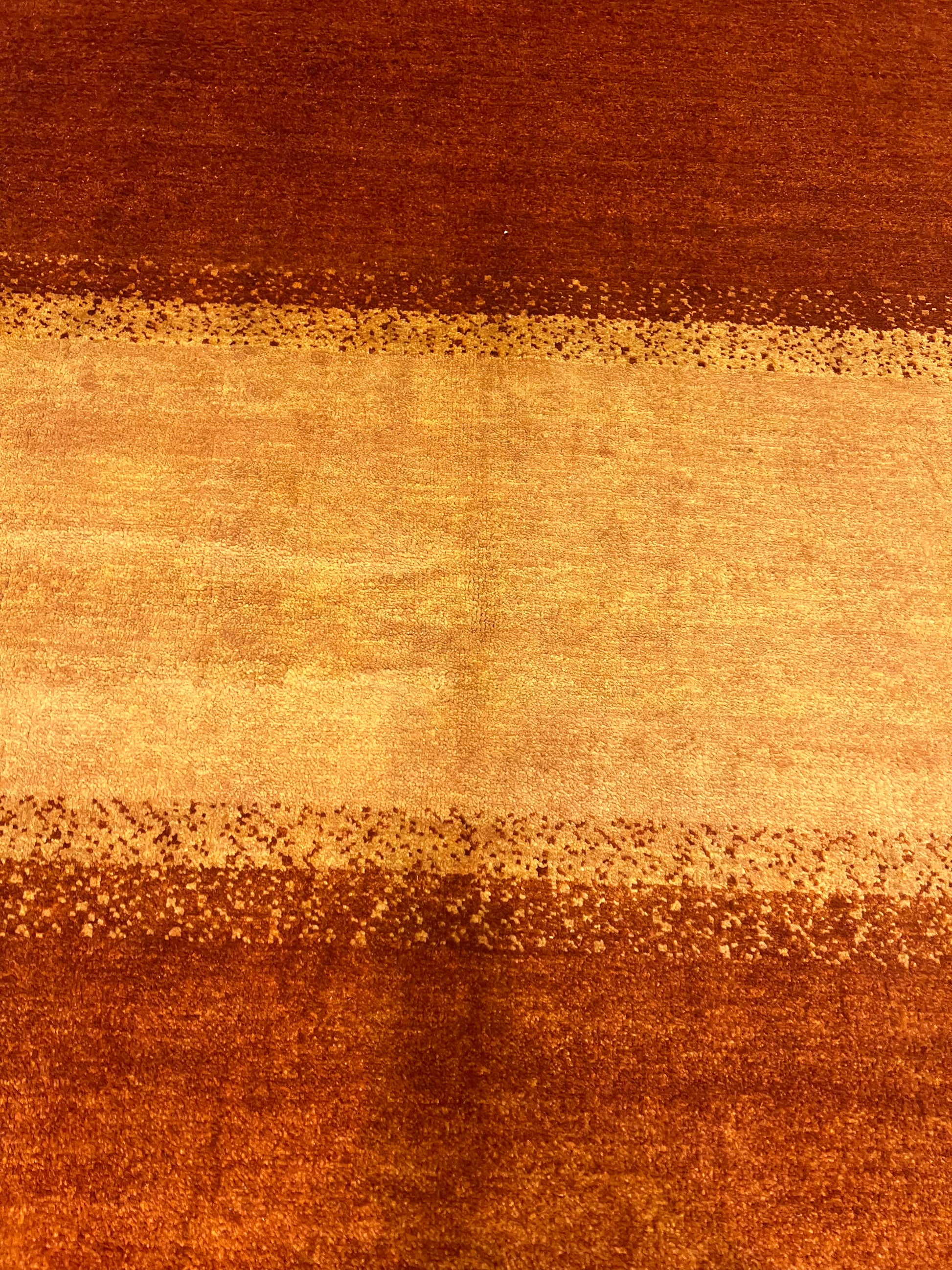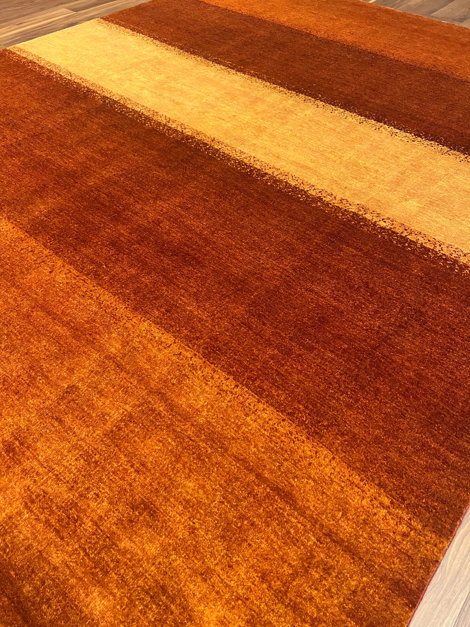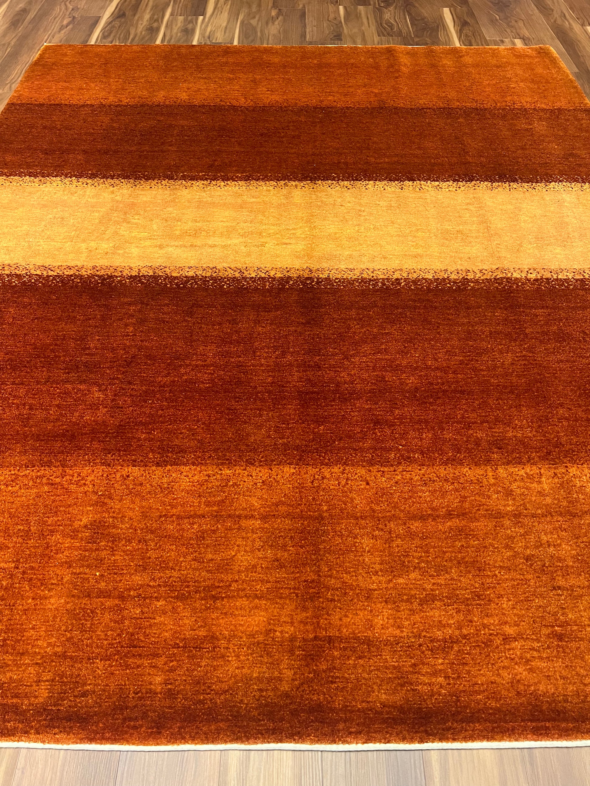 This exquisite Modern Gabbeh rug is a masterpiece of contemporary design. Made from high-quality wool, it features a rich, warm palette with shades of rust, burnt orange, and gold, creating a vibrant yet earthy ambiance. The horizontal stripes are subtle yet sophisticated, offering a sense of calm and comfort. Perfect for adding a modern touch to any space, it also provides luxurious softness underfoot. Durable and easy to care for, this rug promises long-lasting beauty in your home.