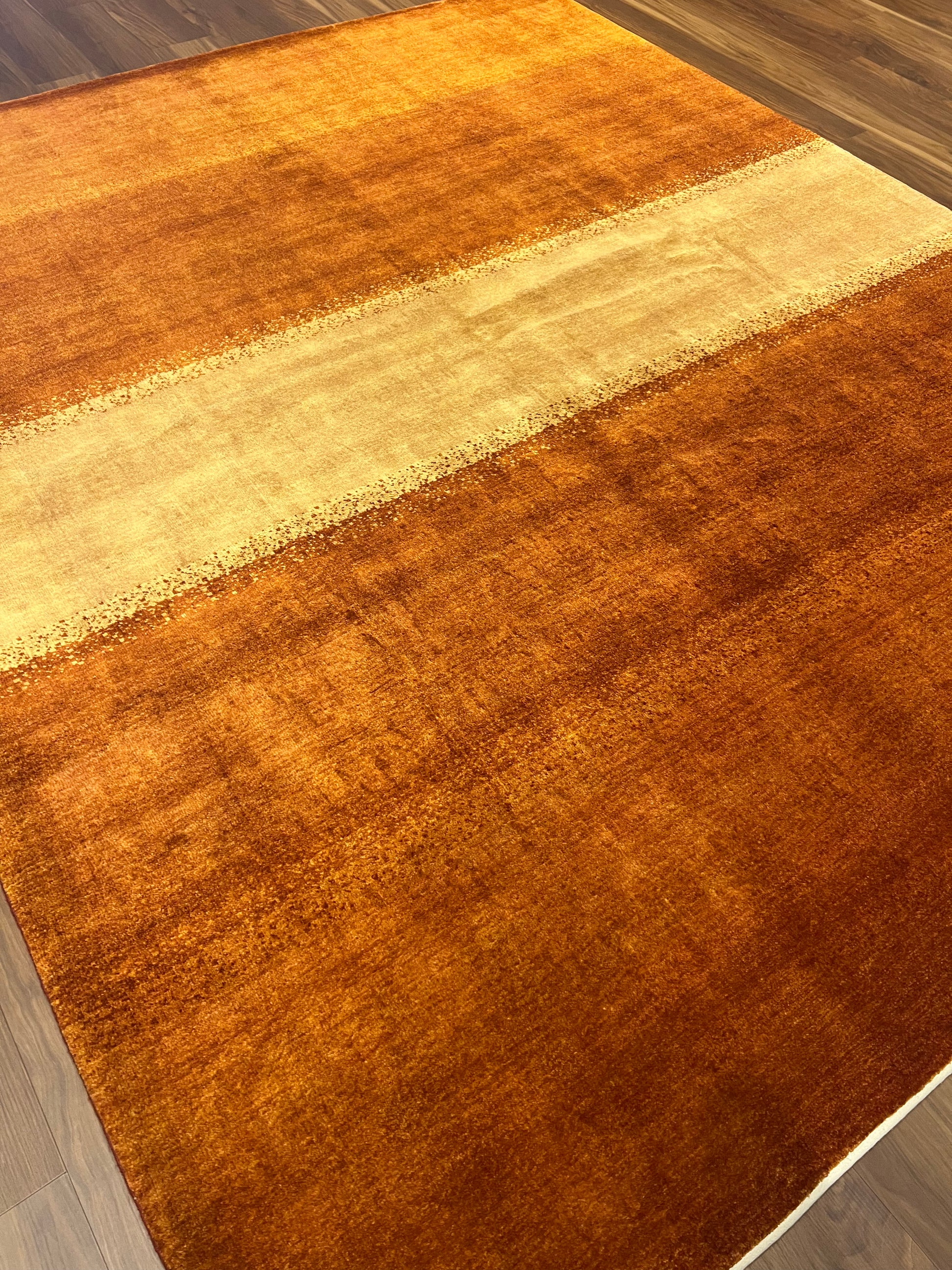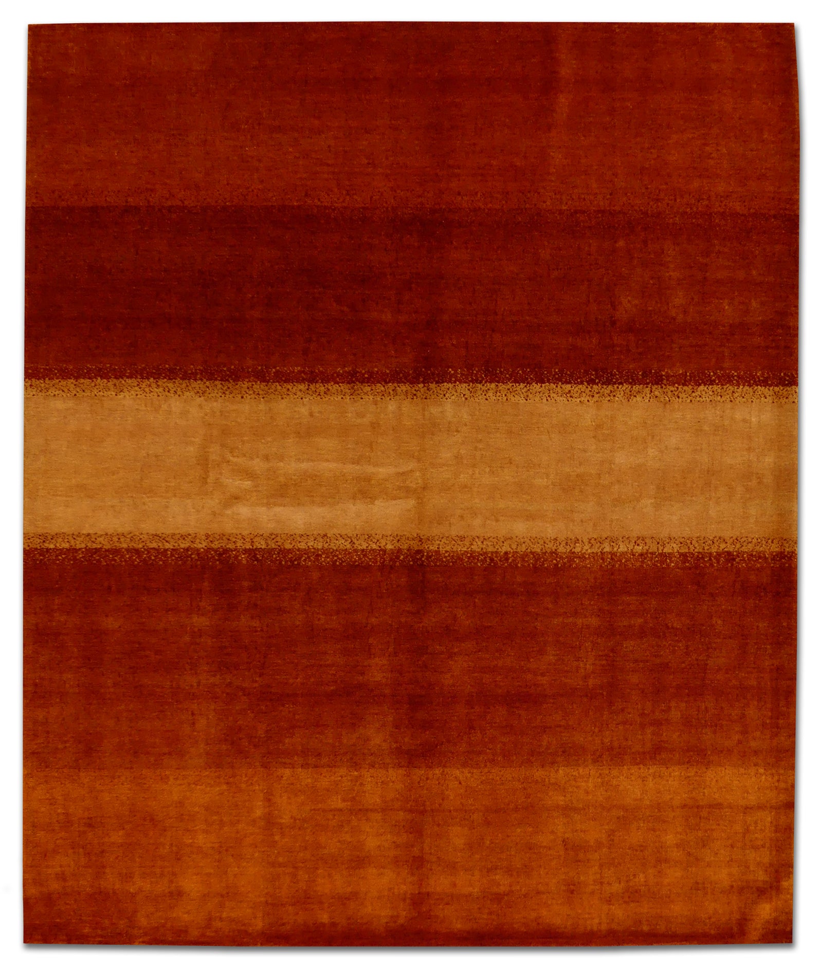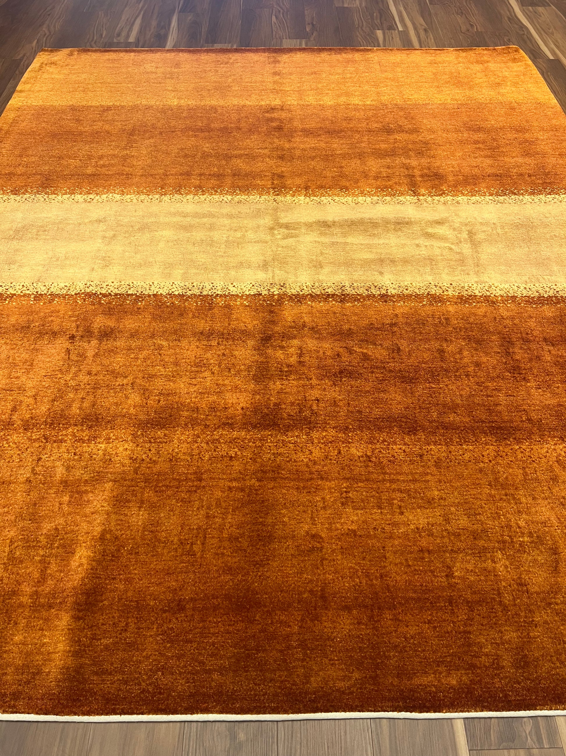 This exquisite Modern Gabbeh rug is a masterpiece of contemporary design. Made from high-quality wool, it features a rich, warm palette with shades of rust, burnt orange, and gold, creating a vibrant yet earthy ambiance. The horizontal stripes are subtle yet sophisticated, offering a sense of calm and comfort. Perfect for adding a modern touch to any space, it also provides luxurious softness underfoot. Durable and easy to care for, this rug promises long-lasting beauty in your home.
