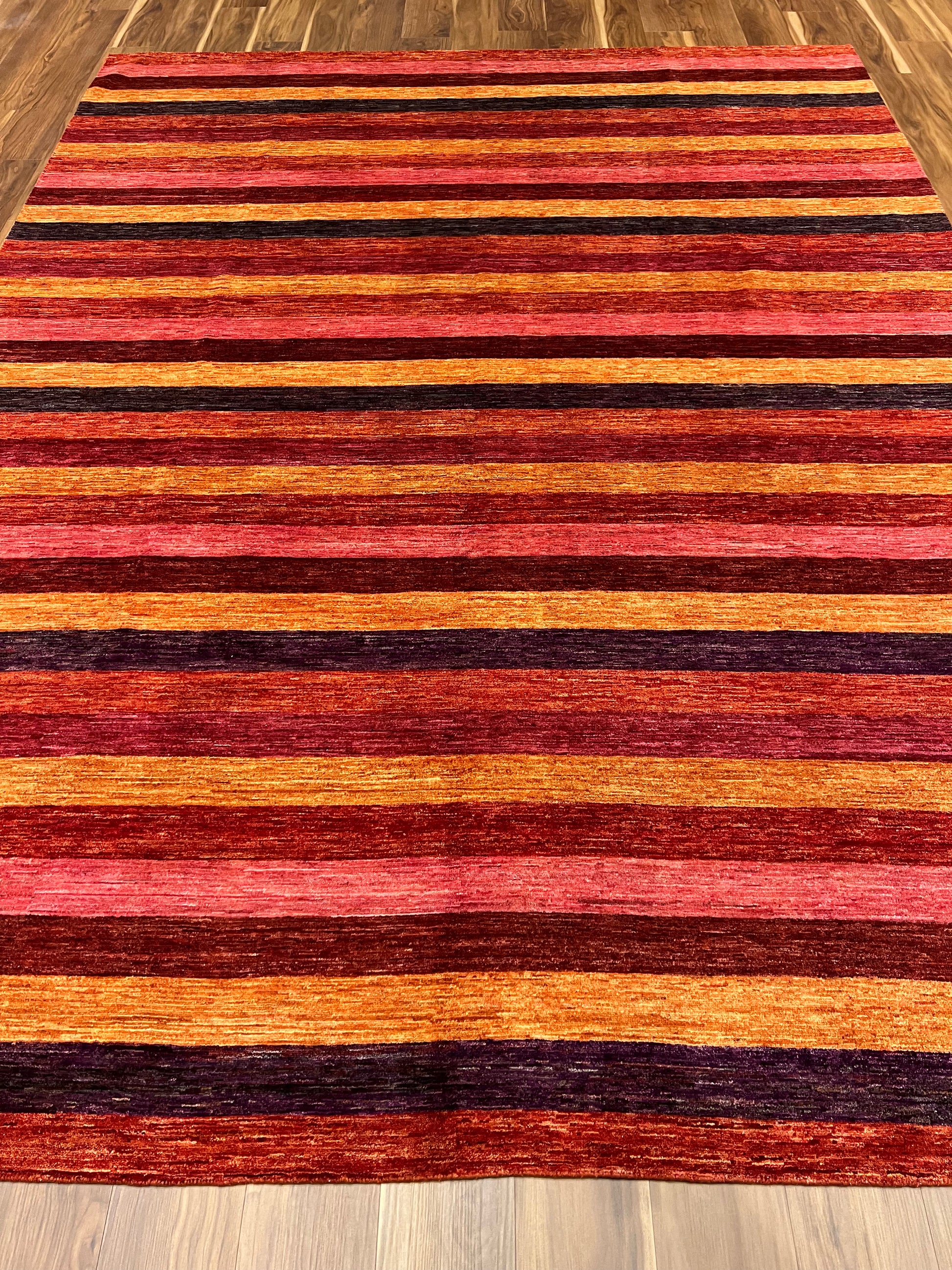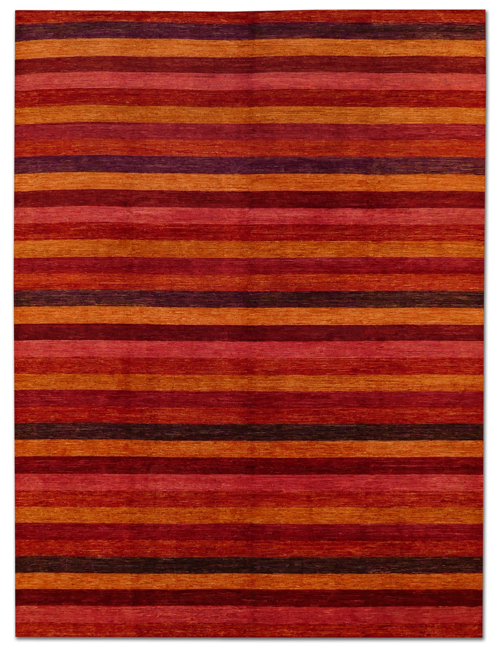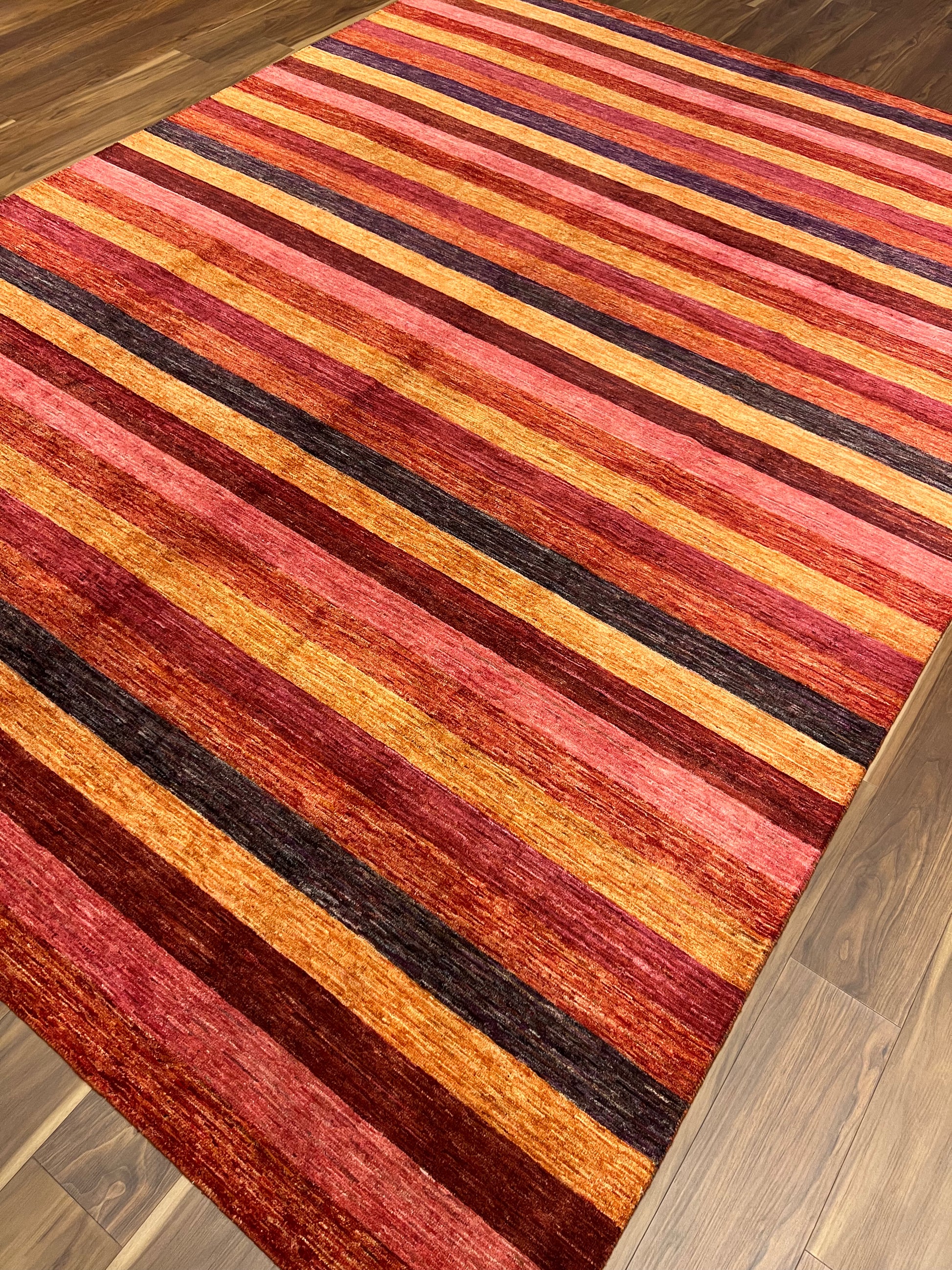This exquisite Modern Gabbeh rug showcases a harmonious blend of warm colors with a simple yet captivating stripe design. The subtle transitions between hues create a visual rhythm that evokes a sense of motion, enriching the textural quality of the thick wool pile. Ideal for contemporary interiors, this piece brings both comfort and vibrant style to any room.