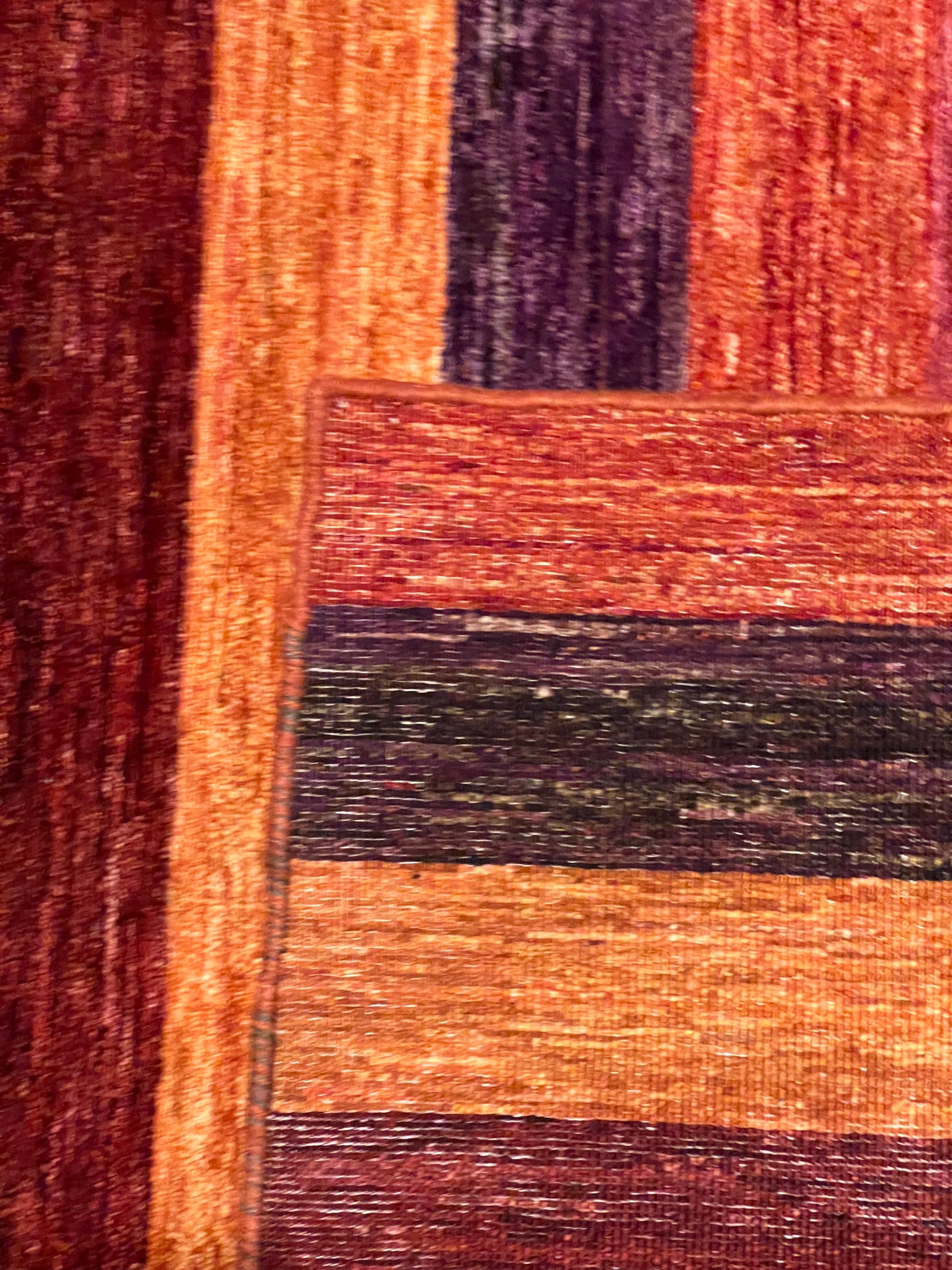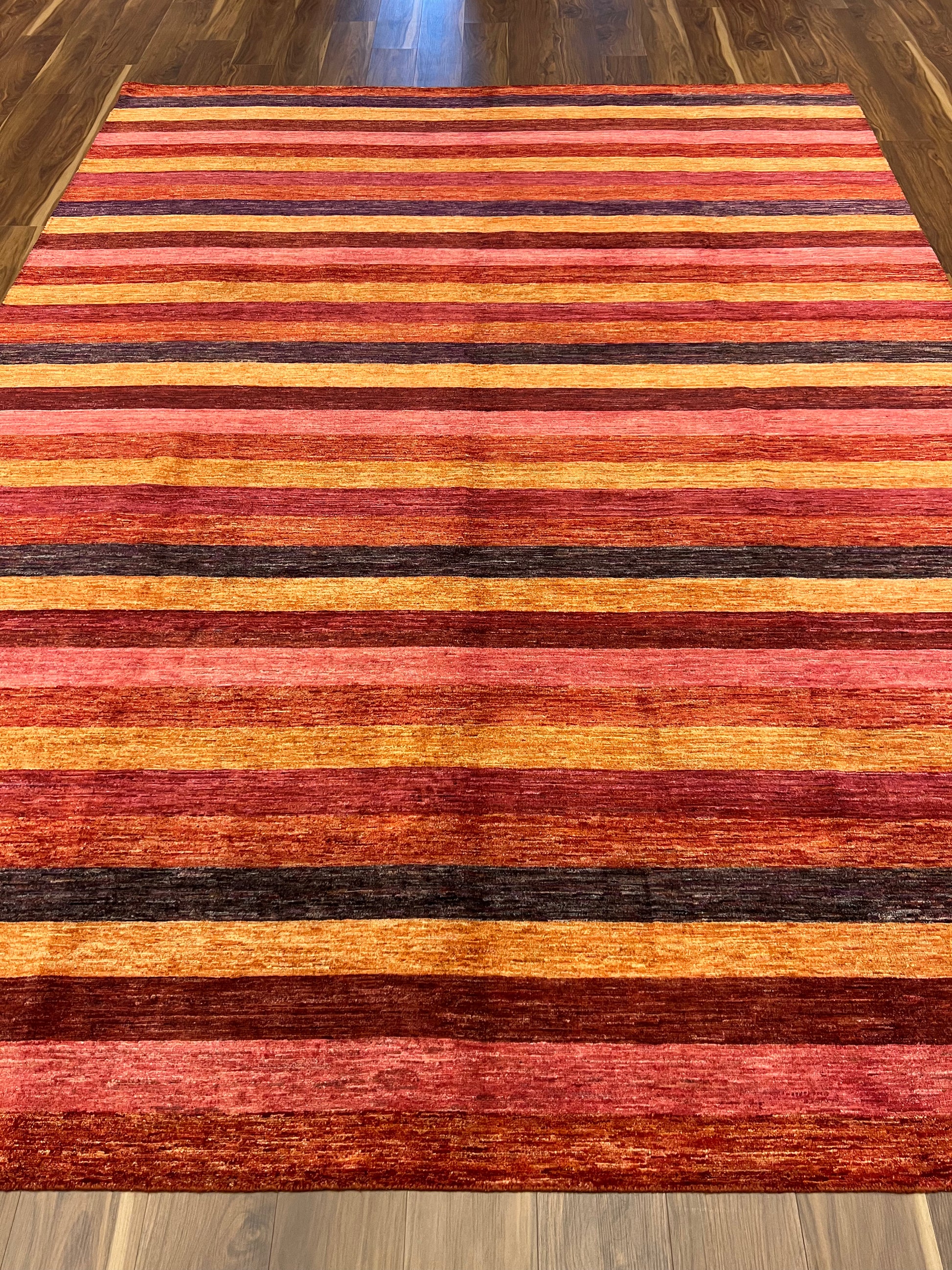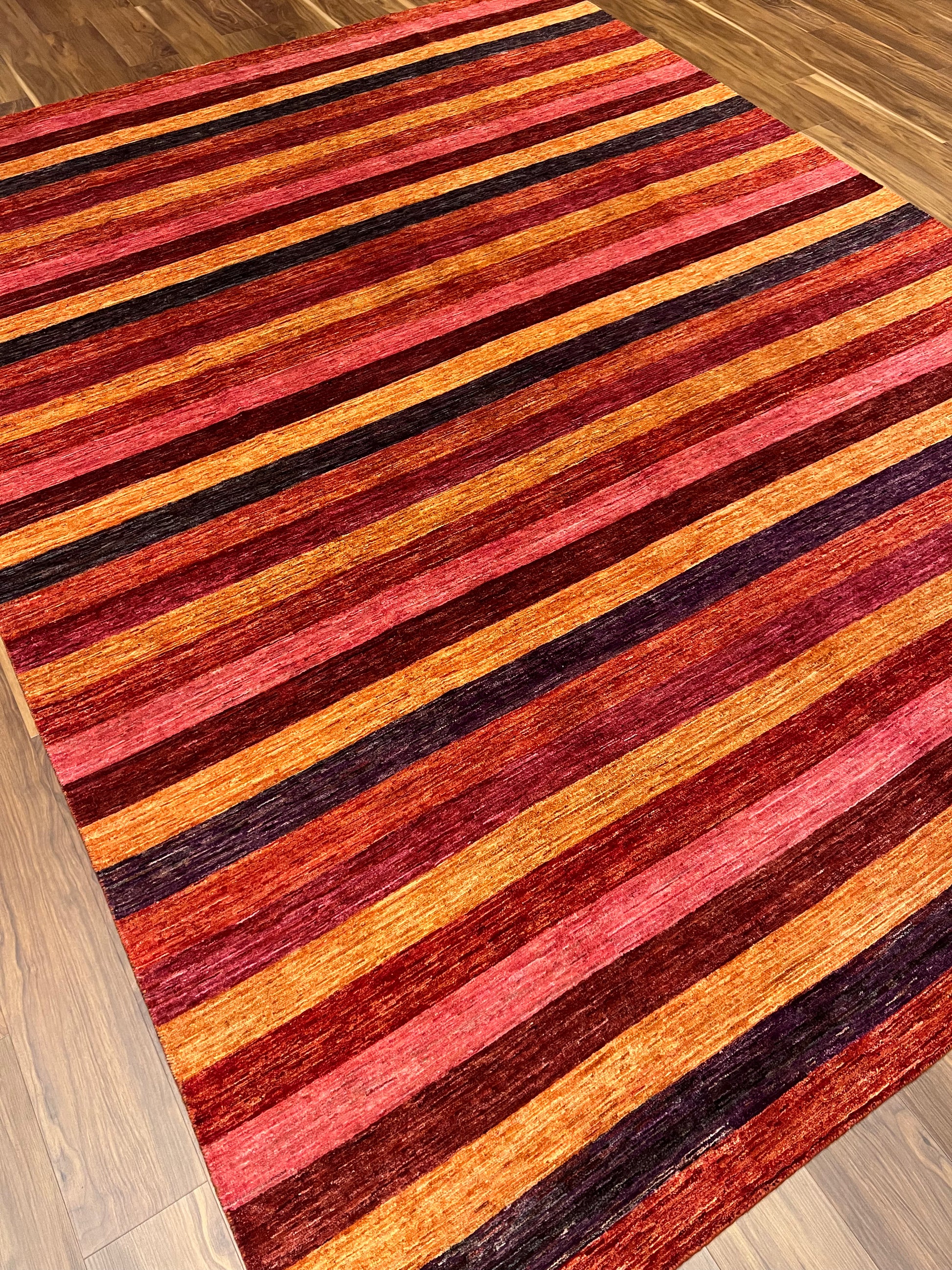 This exquisite Modern Gabbeh rug showcases a harmonious blend of warm colors with a simple yet captivating stripe design. The subtle transitions between hues create a visual rhythm that evokes a sense of motion, enriching the textural quality of the thick wool pile. Ideal for contemporary interiors, this piece brings both comfort and vibrant style to any room.