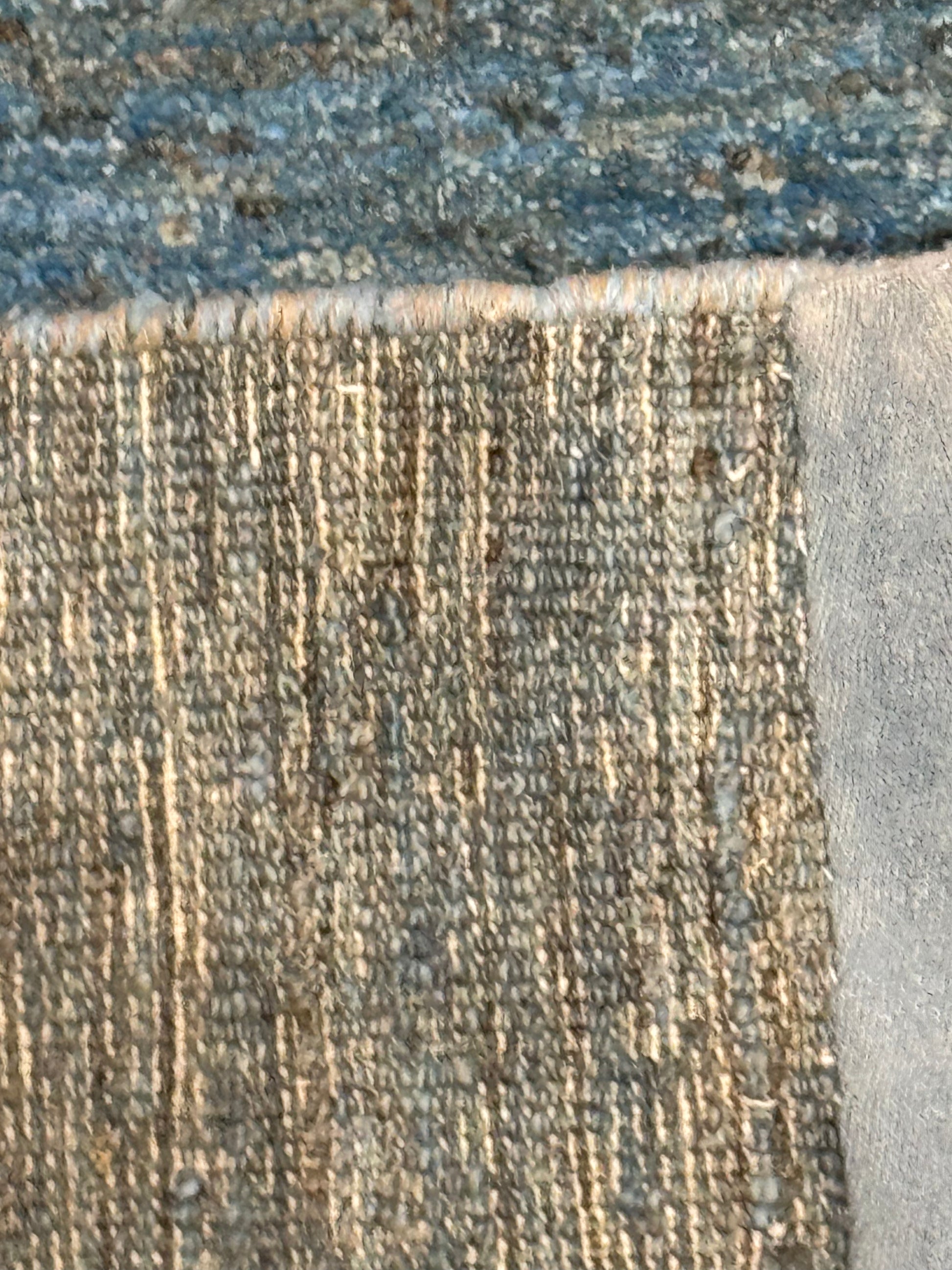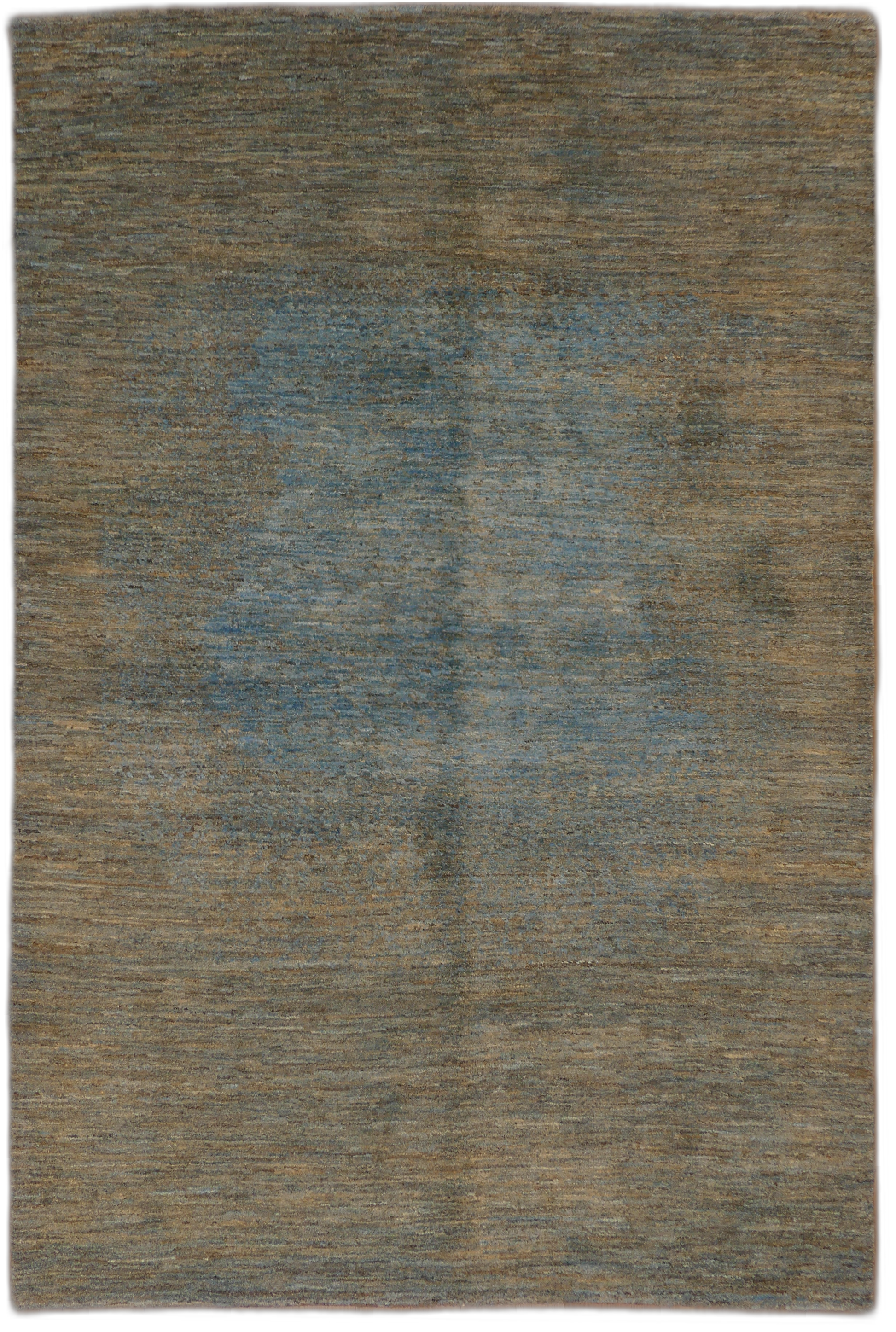 This Modern Gabbeh rug crafted from high-quality wool portrays a minimalist aesthetic with its subtle blend of blue, brown, and beige hues that evoke a sense of calm and sophistication. The absence of intricate patterns allows it to seamlessly blend into a contemporary decor, making it a versatile addition to any living space or office area. It suggests an effortlessly chic component to design, capable of enhancing a room while maintaining a serene backdrop.