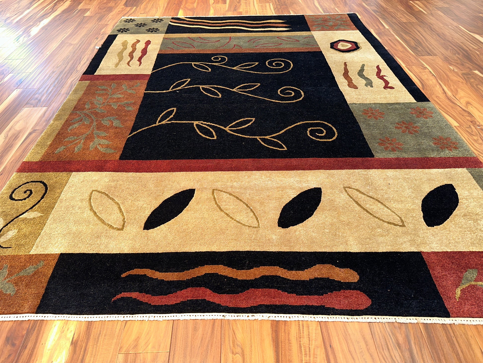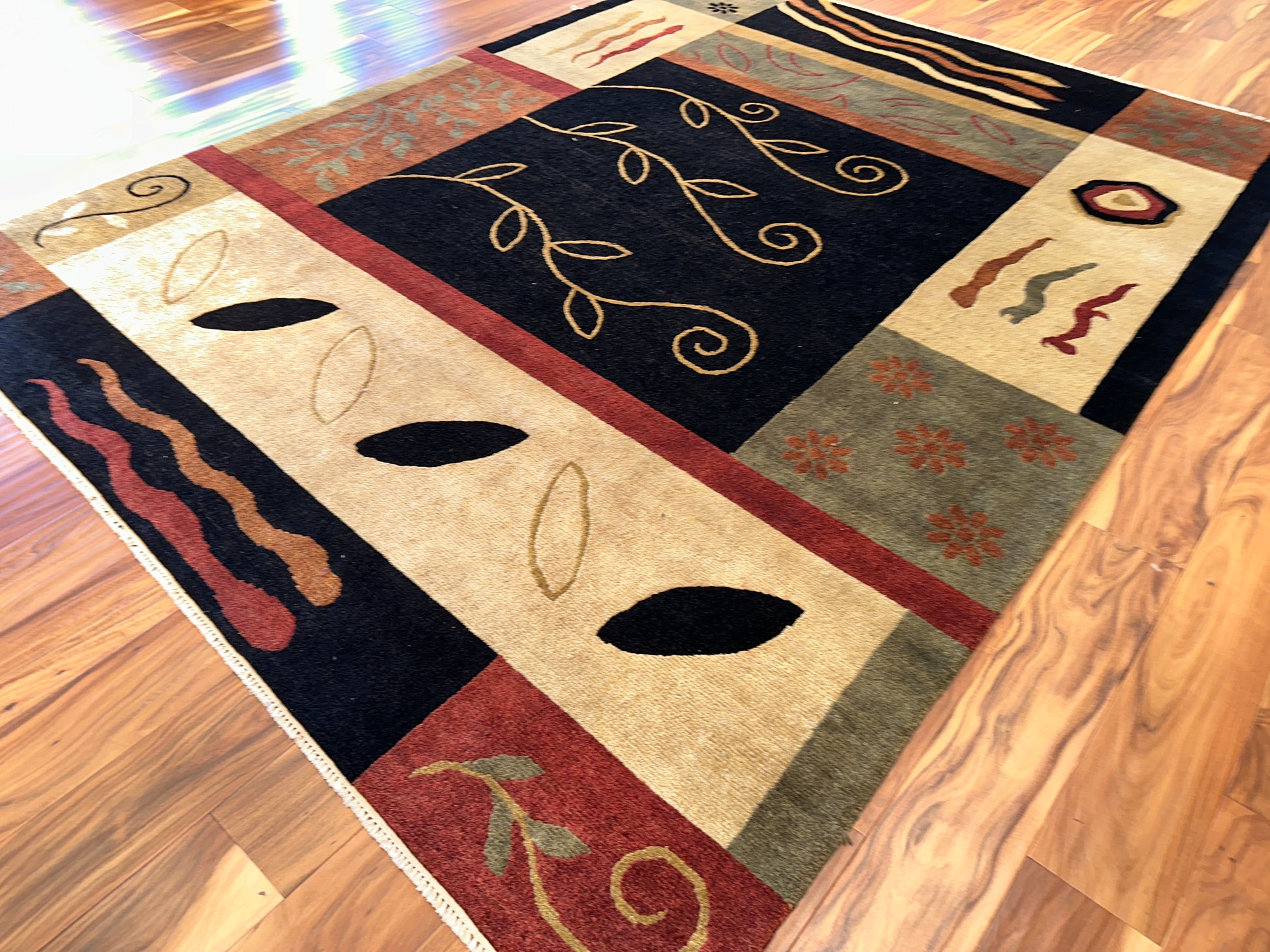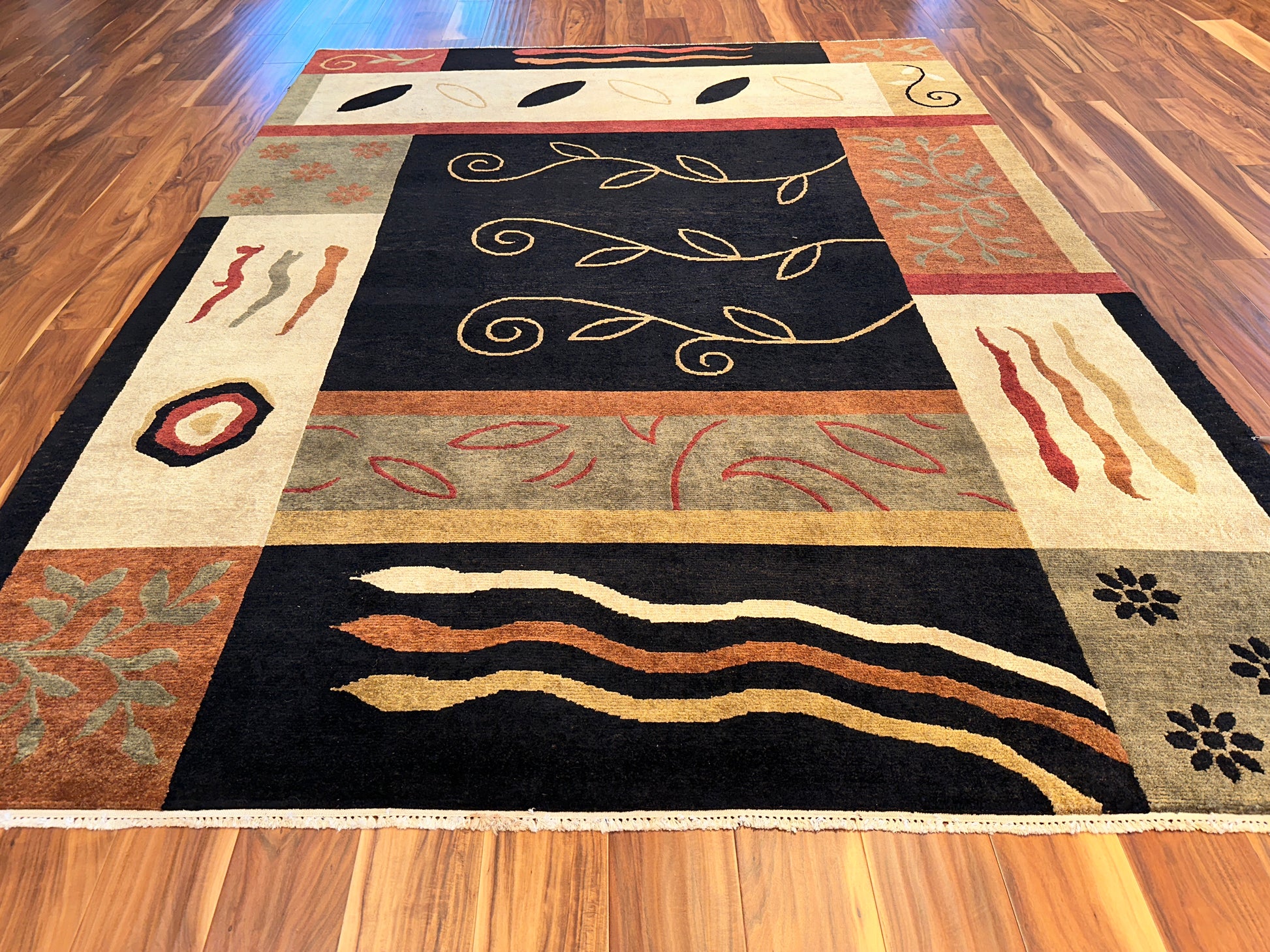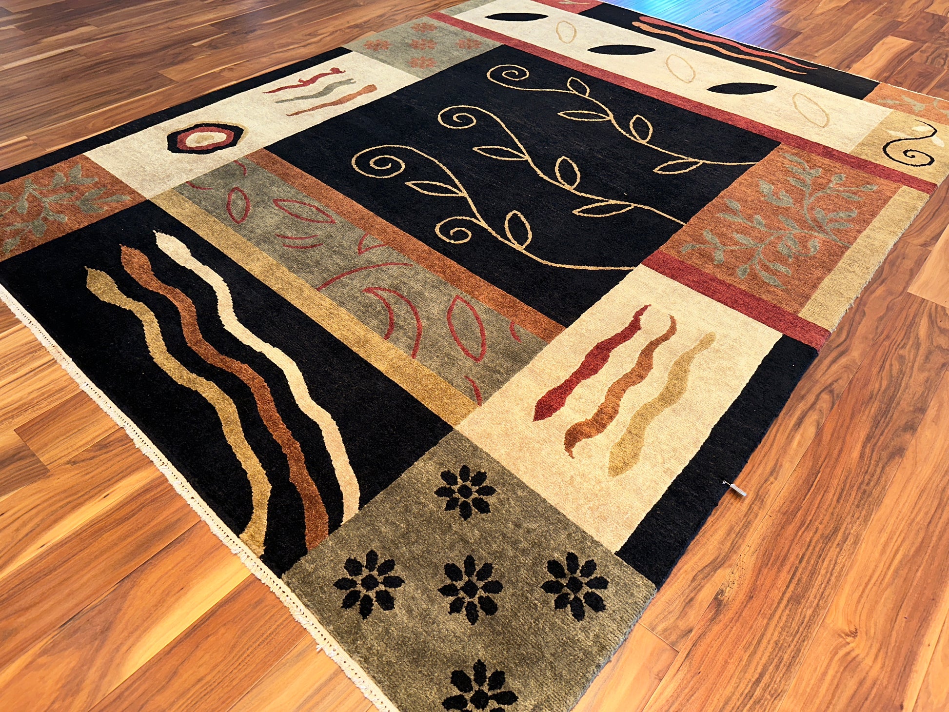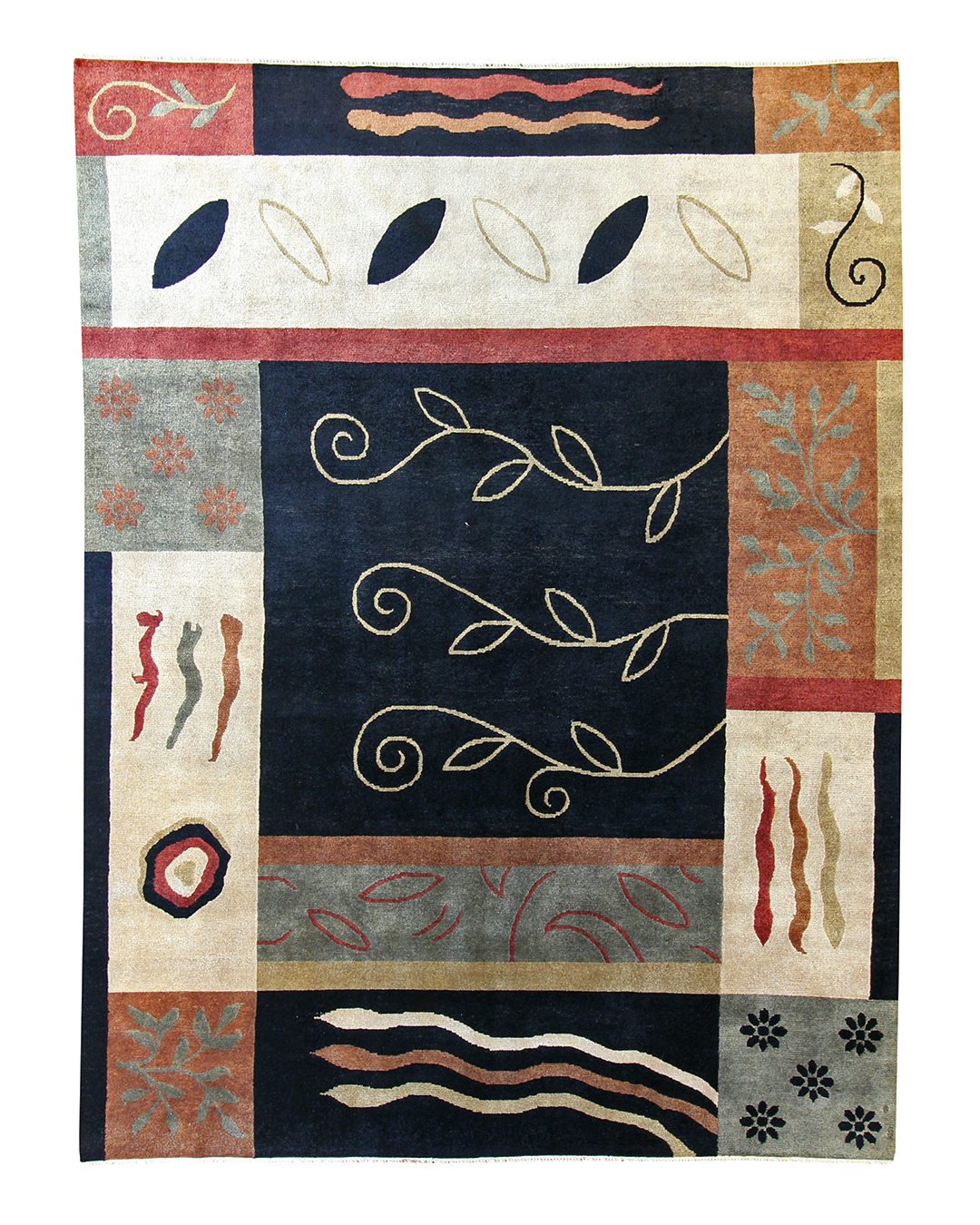 A richly composed patchwork of natural motifs and abstract forms, this hand-knotted rug balances whimsy and earthiness with ease. Its palette of midnight blue, terracotta, ivory, and muted sage supports a delightful composition of swirls, leaves, floral patterns, and geometric flourishes. The design invites a creative yet grounded atmosphere, ideal for eclectic interiors that celebrate individuality and warmth.