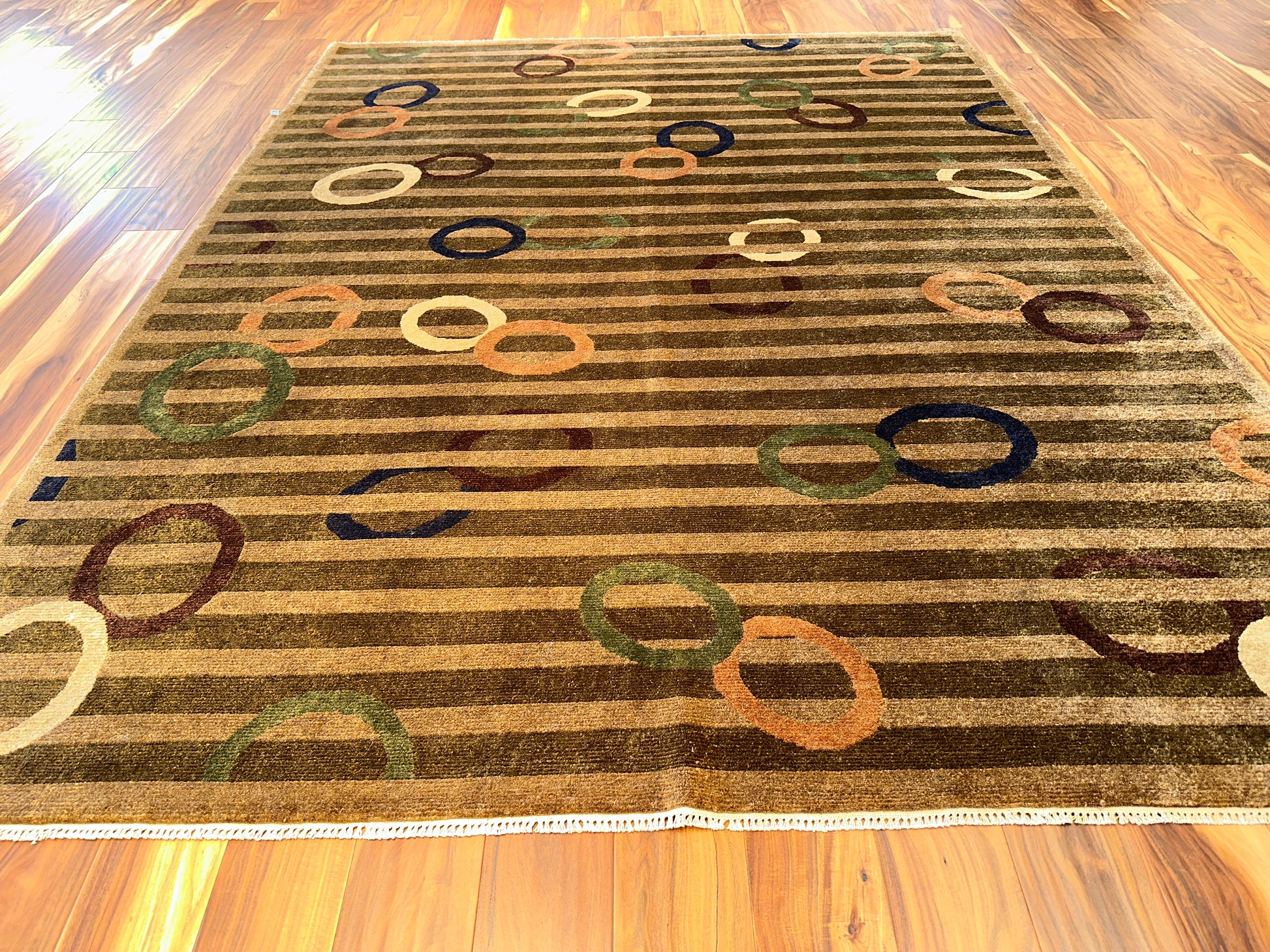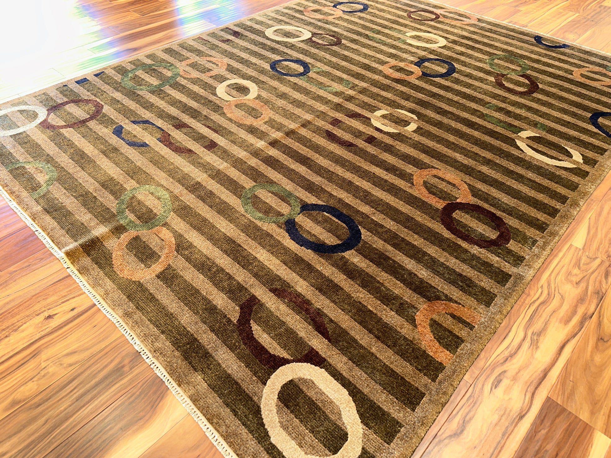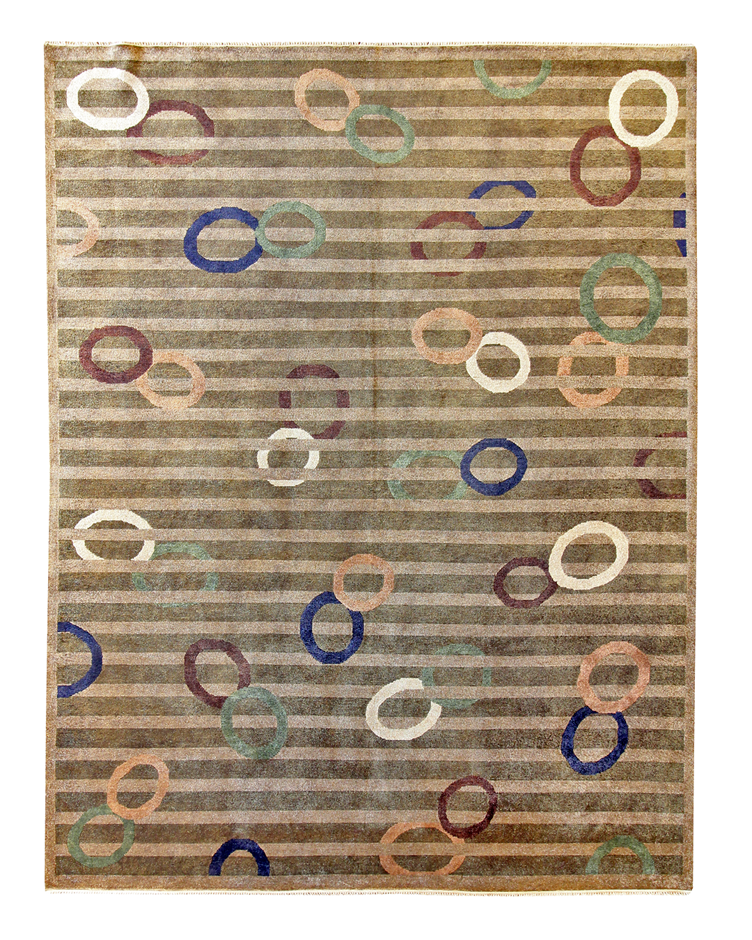 This playful hand-knotted rug introduces a lively mix of modern whimsy and understated elegance. Muted horizontal stripes set a calm foundation while colorful overlapping rings in soft shades of blue, coral, green, and ivory float across the surface, adding rhythm and movement with effortless charm.
