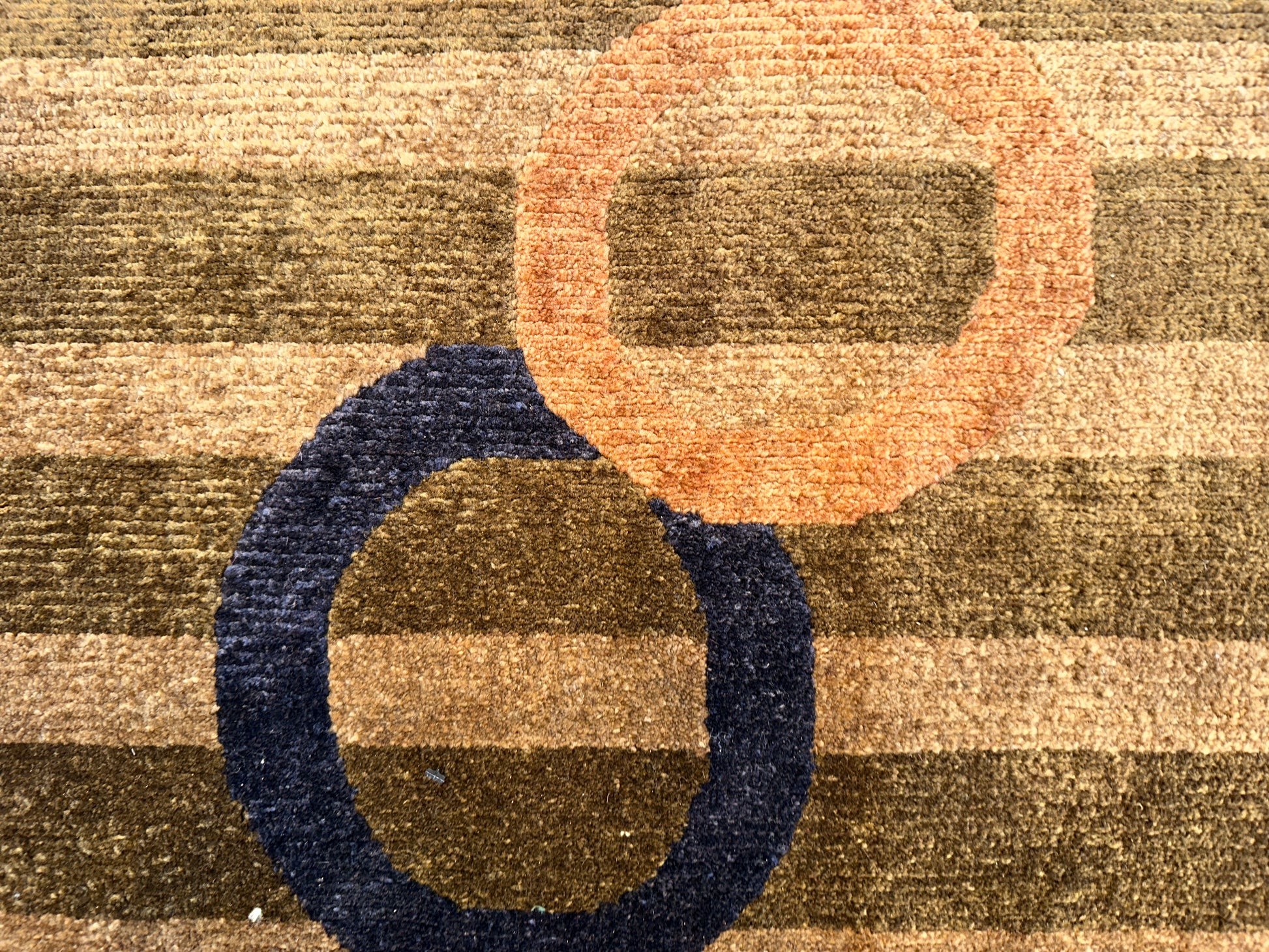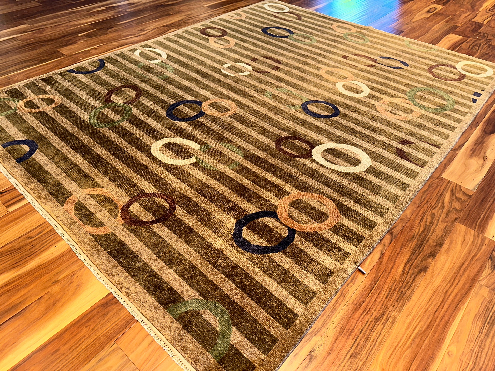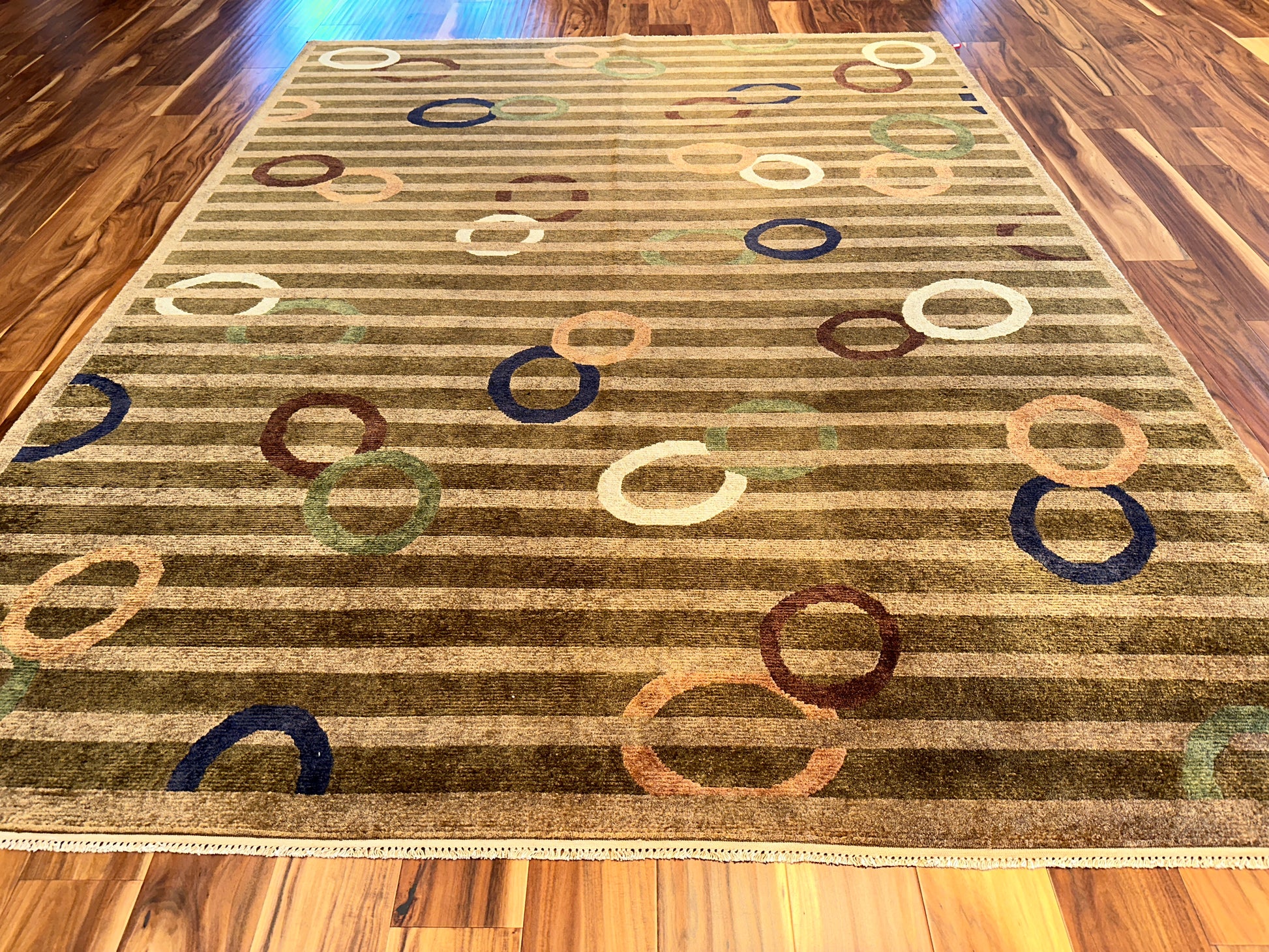 This playful hand-knotted rug introduces a lively mix of modern whimsy and understated elegance. Muted horizontal stripes set a calm foundation while colorful overlapping rings in soft shades of blue, coral, green, and ivory float across the surface, adding rhythm and movement with effortless charm.