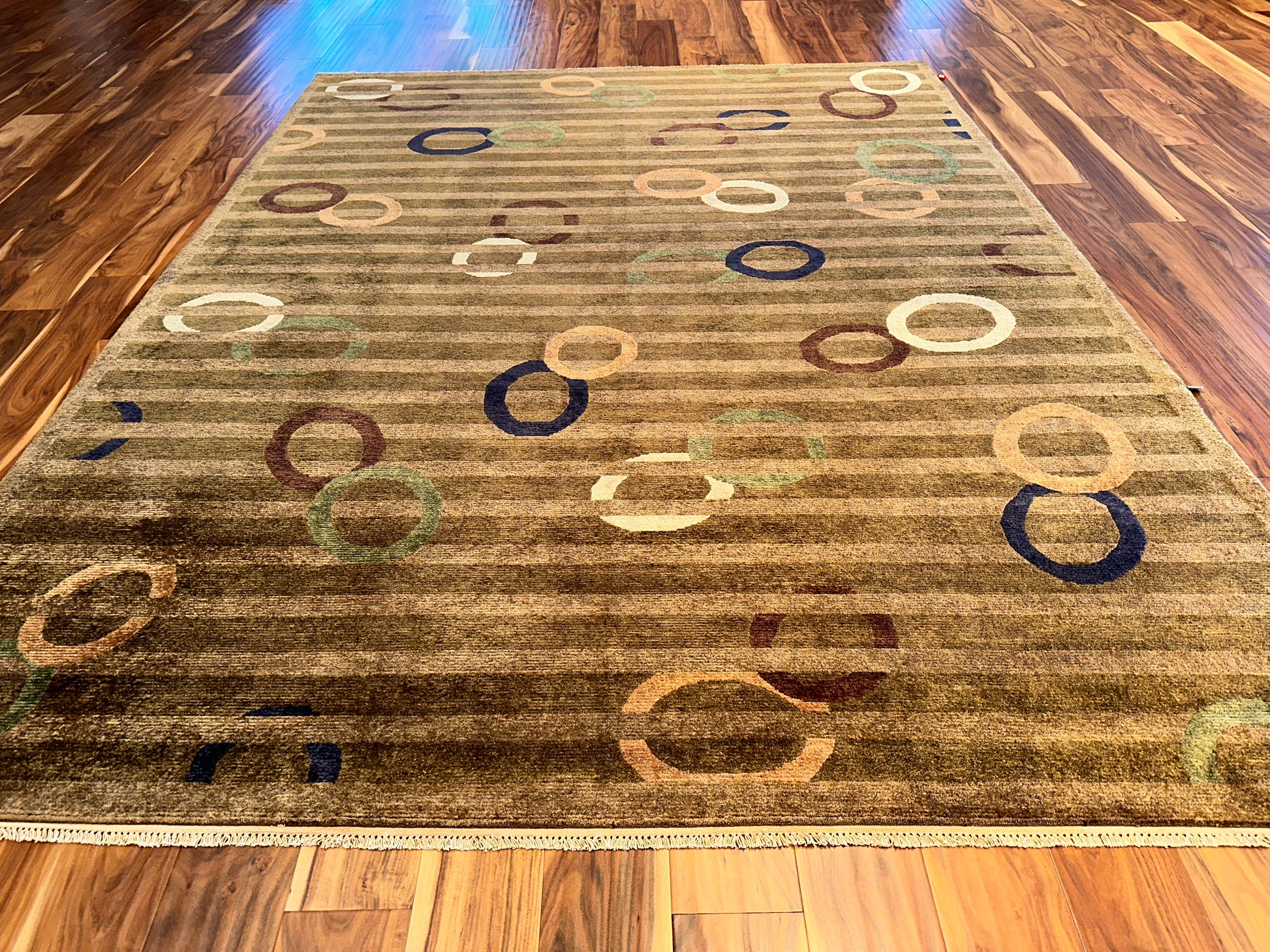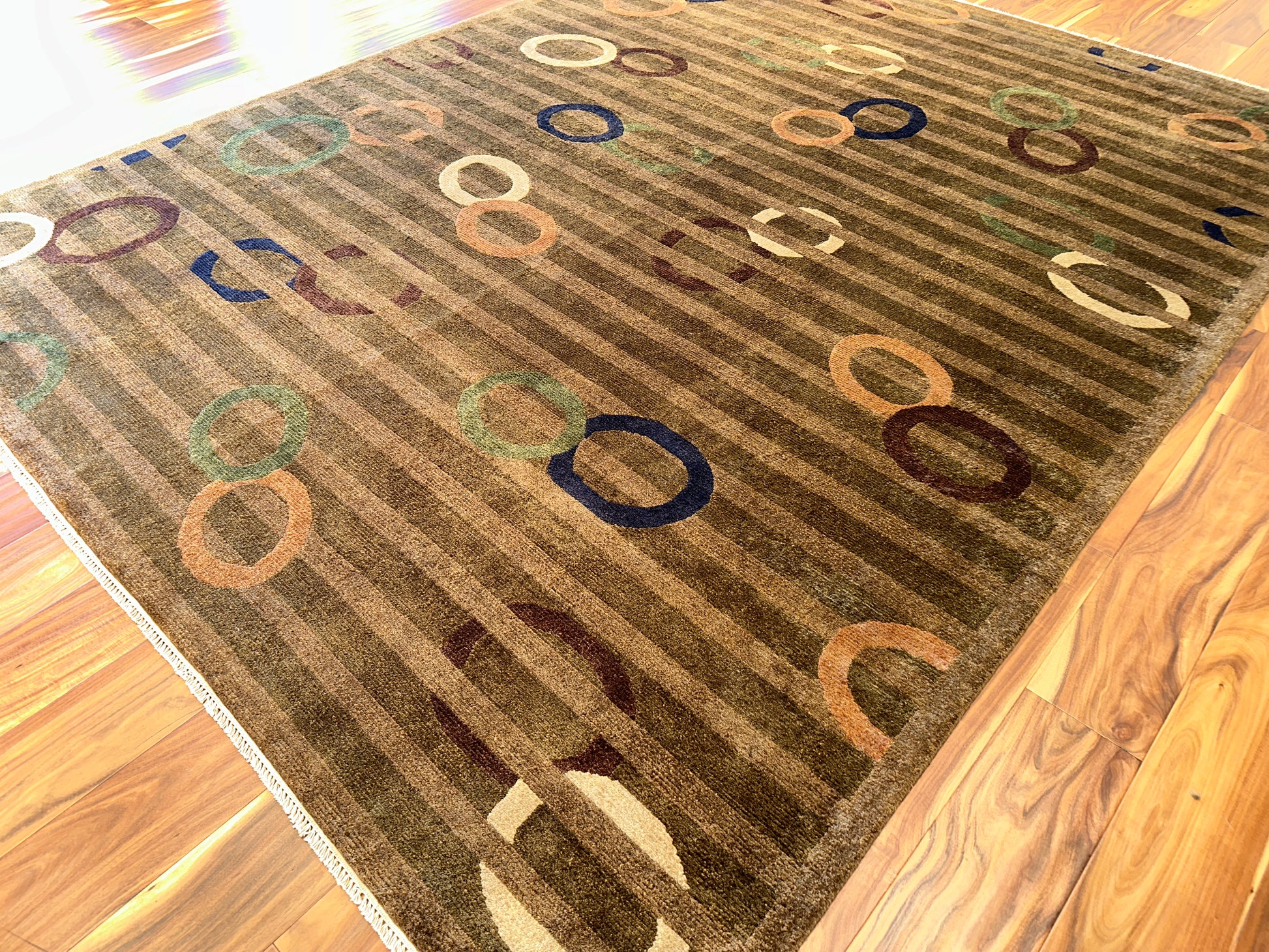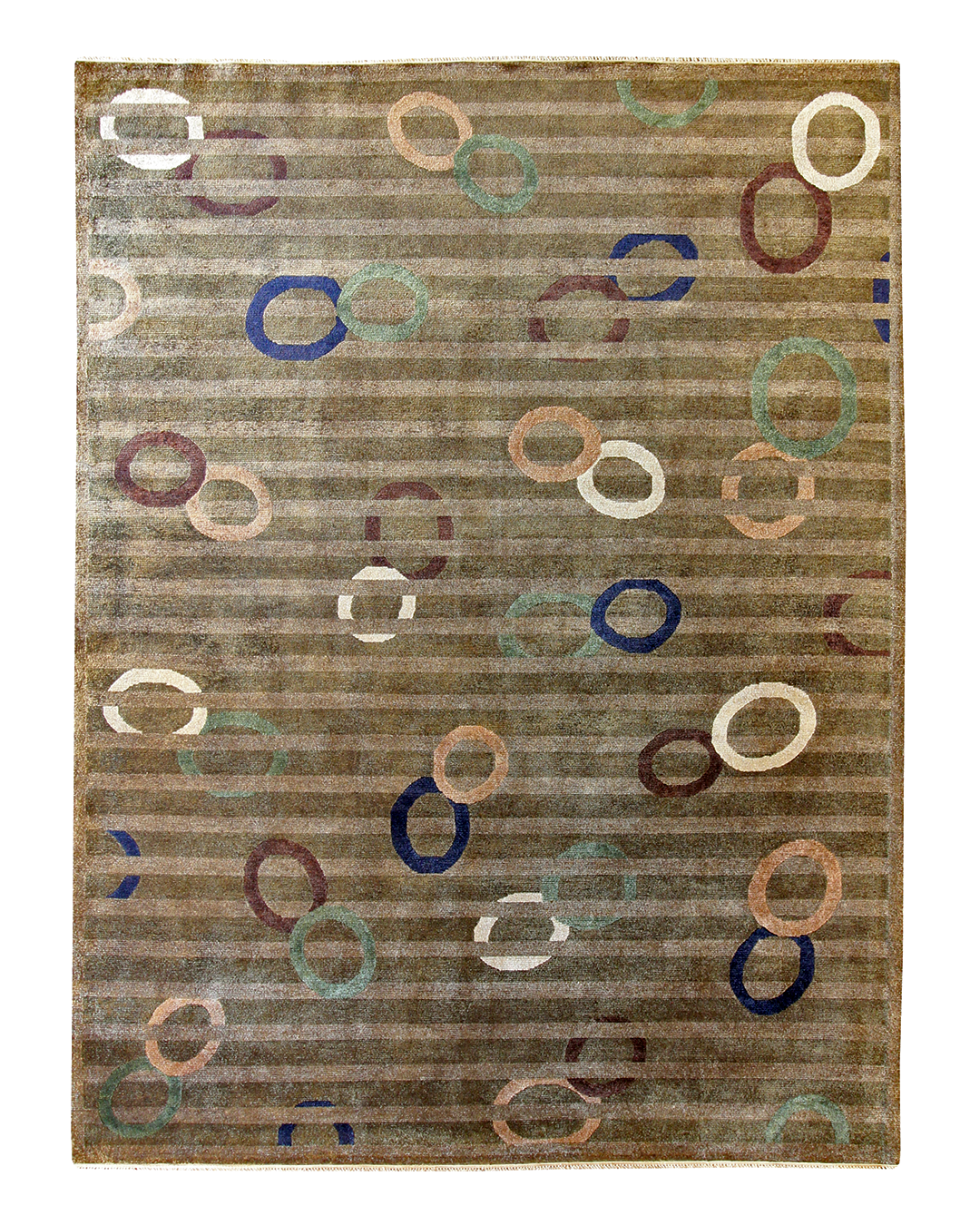 A playful yet refined rug, this piece adds charm through its gently whimsical ring motifs drifting across a field of horizontal stripes. Softly toned in layered shades of cocoa and beige, the design is punctuated with overlapping circles in pale rose, sage, deep blue, and ivory—offering a touch of quiet movement and color. Its design makes it versatile and subtly artistic, perfect for rooms where warmth and a hint of fun are welcome.
