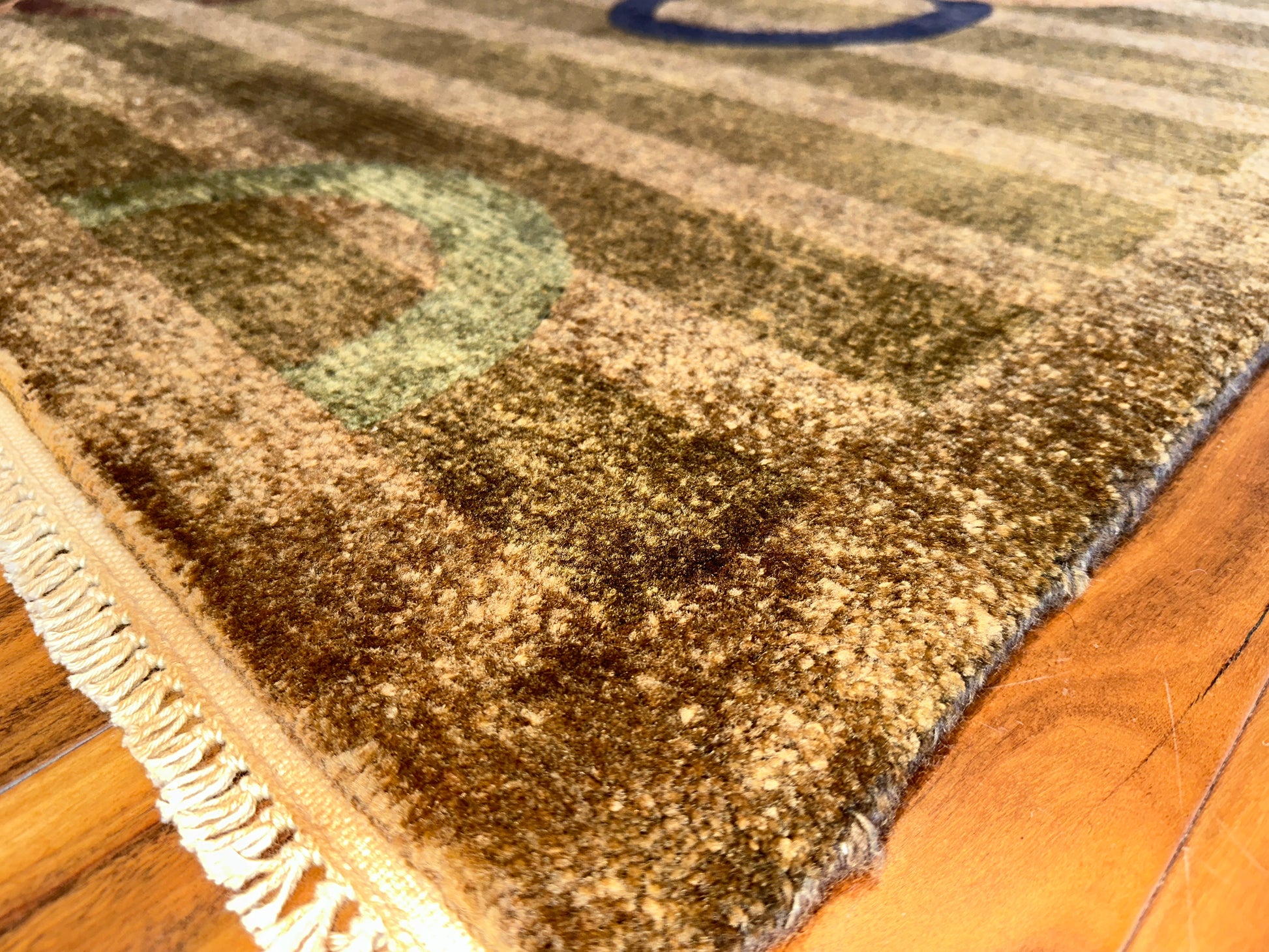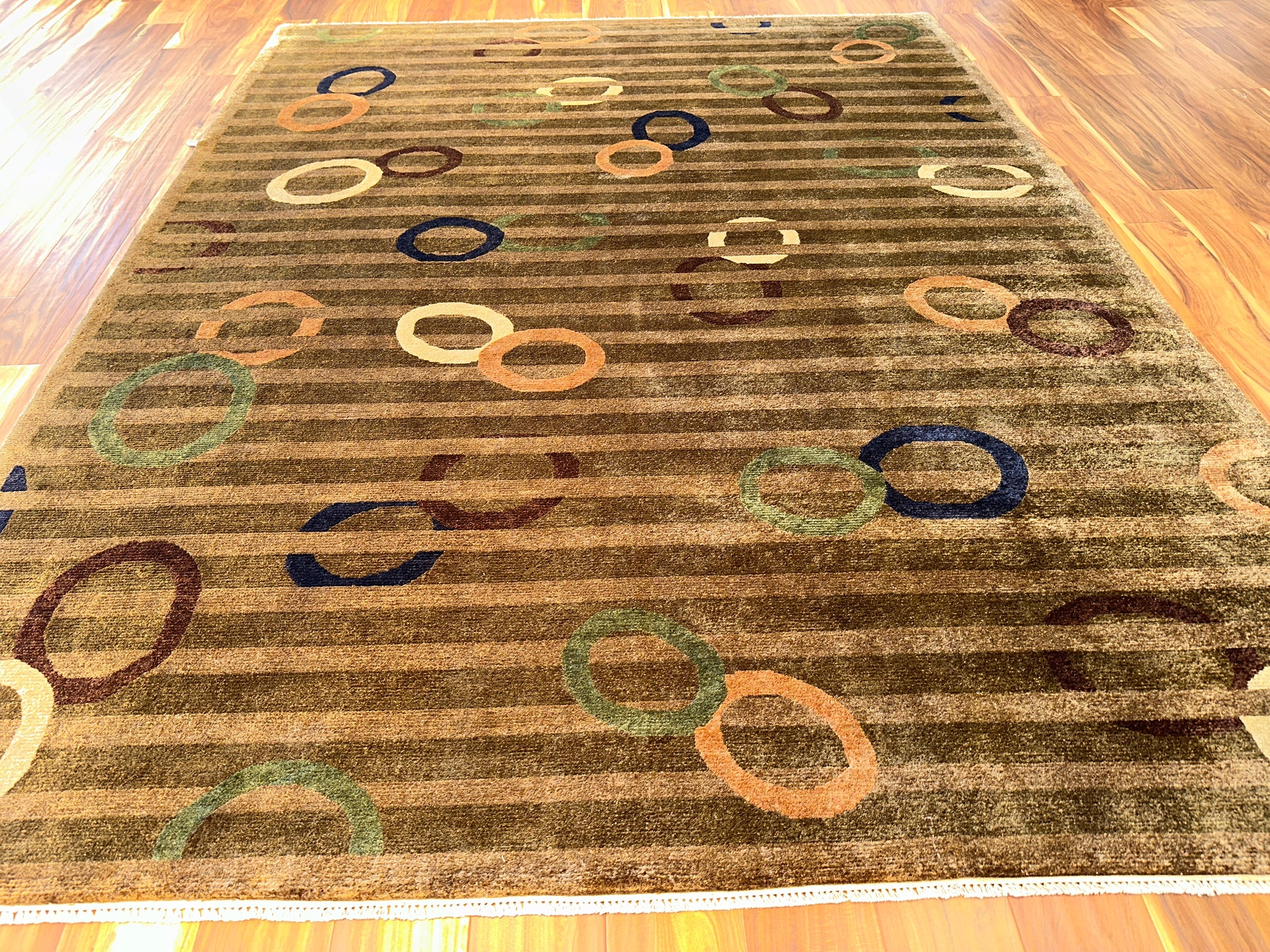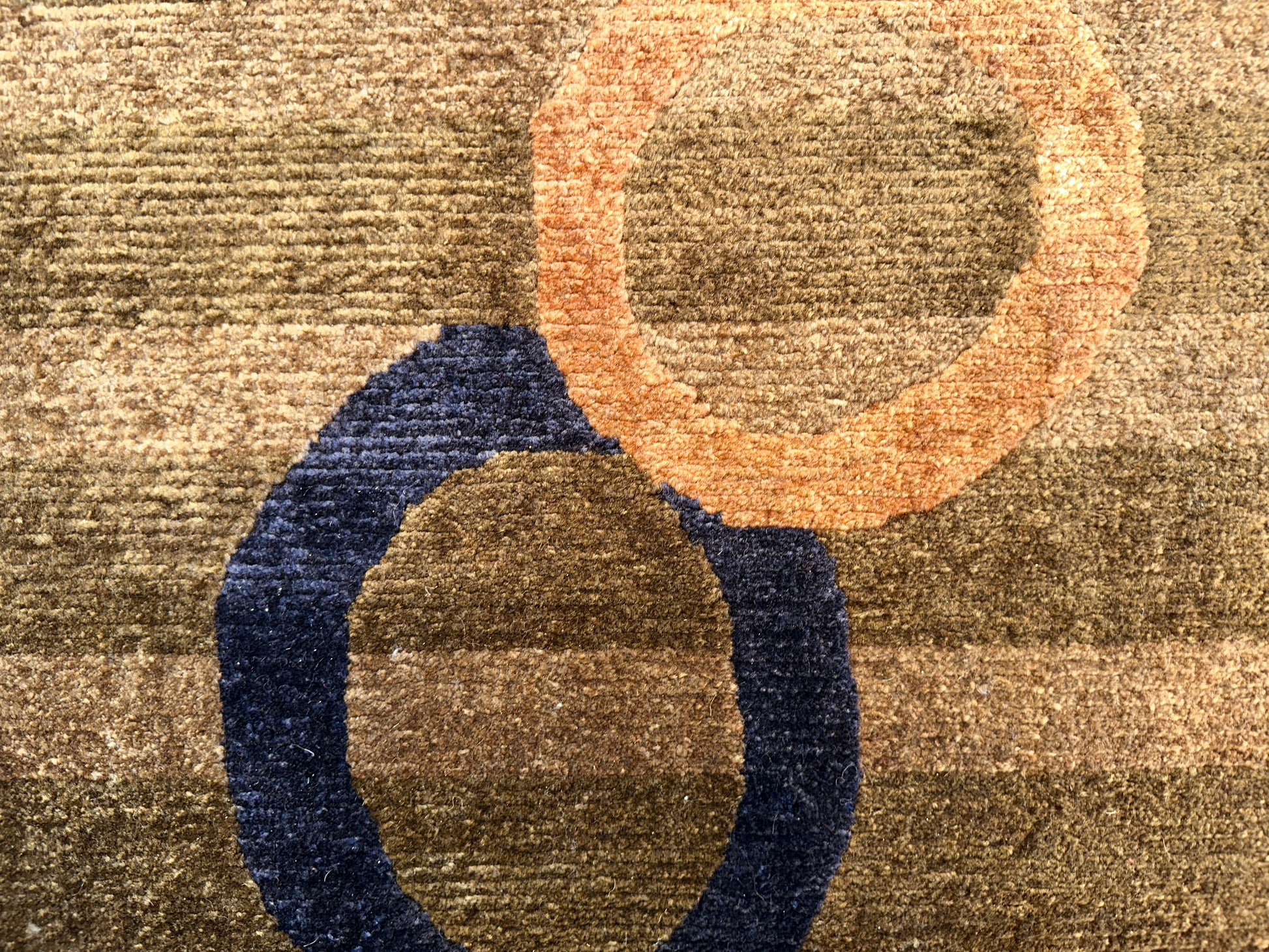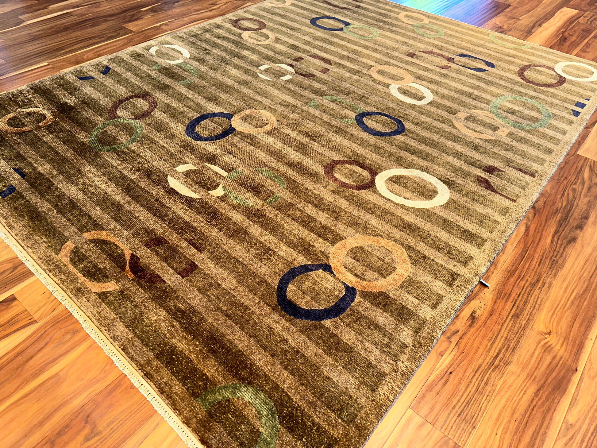 A playful yet refined rug, this piece adds charm through its gently whimsical ring motifs drifting across a field of horizontal stripes. Softly toned in layered shades of cocoa and beige, the design is punctuated with overlapping circles in pale rose, sage, deep blue, and ivory—offering a touch of quiet movement and color. Its design makes it versatile and subtly artistic, perfect for rooms where warmth and a hint of fun are welcome.