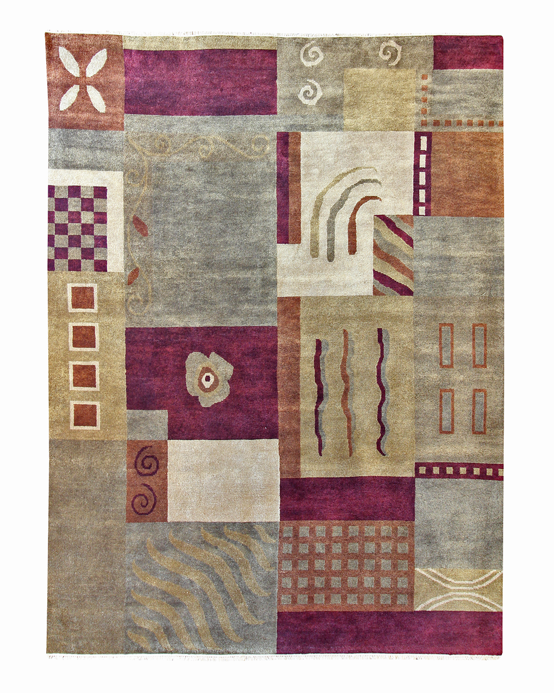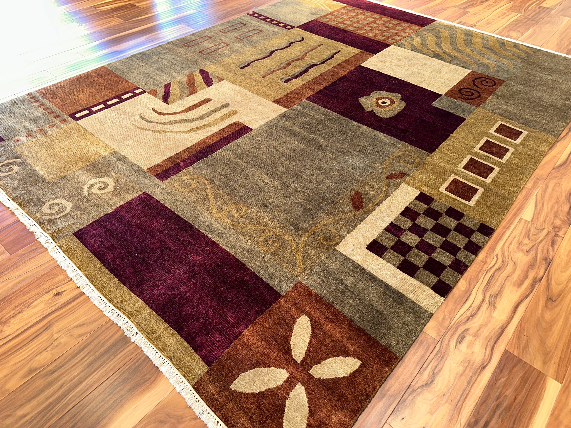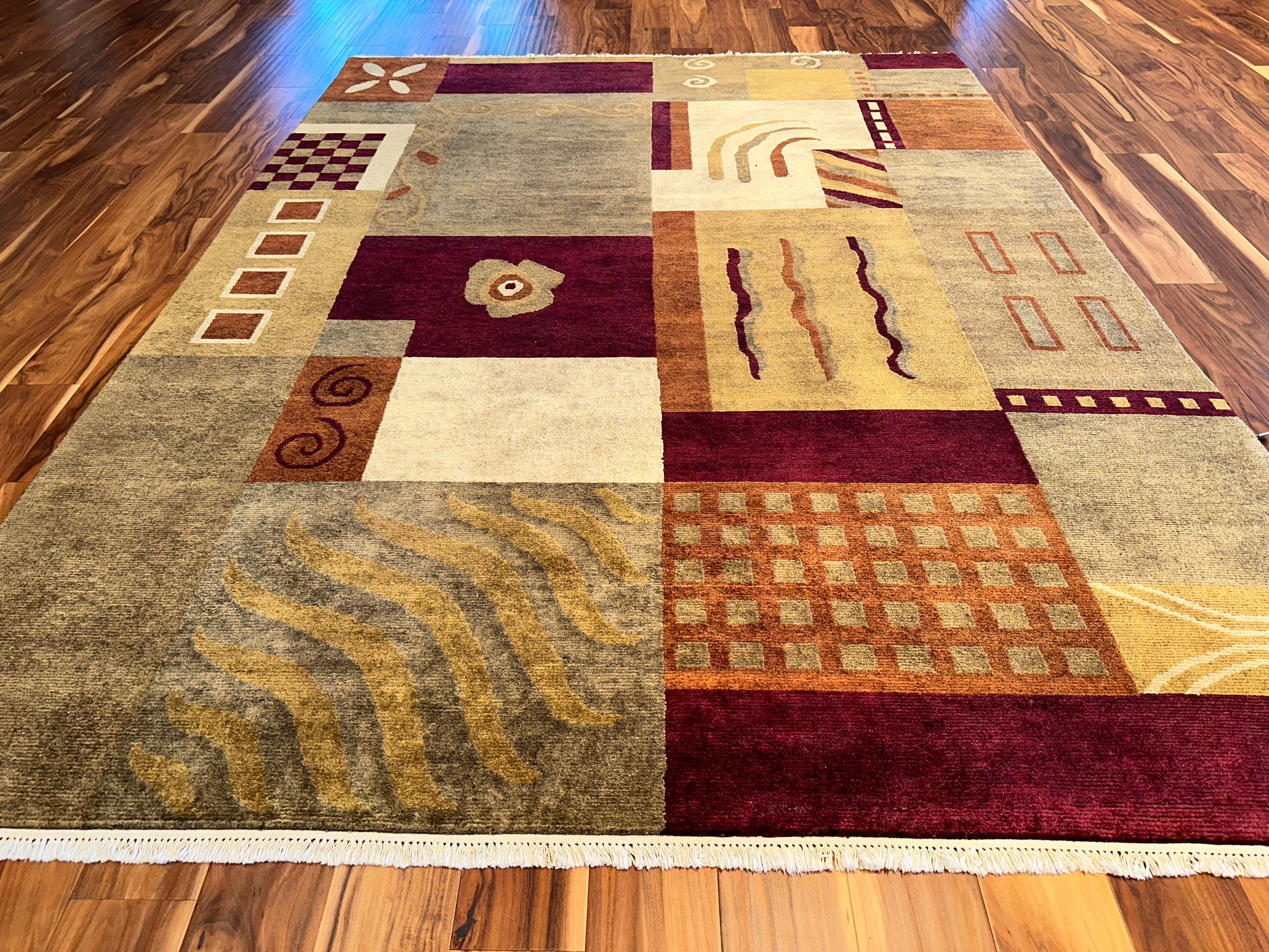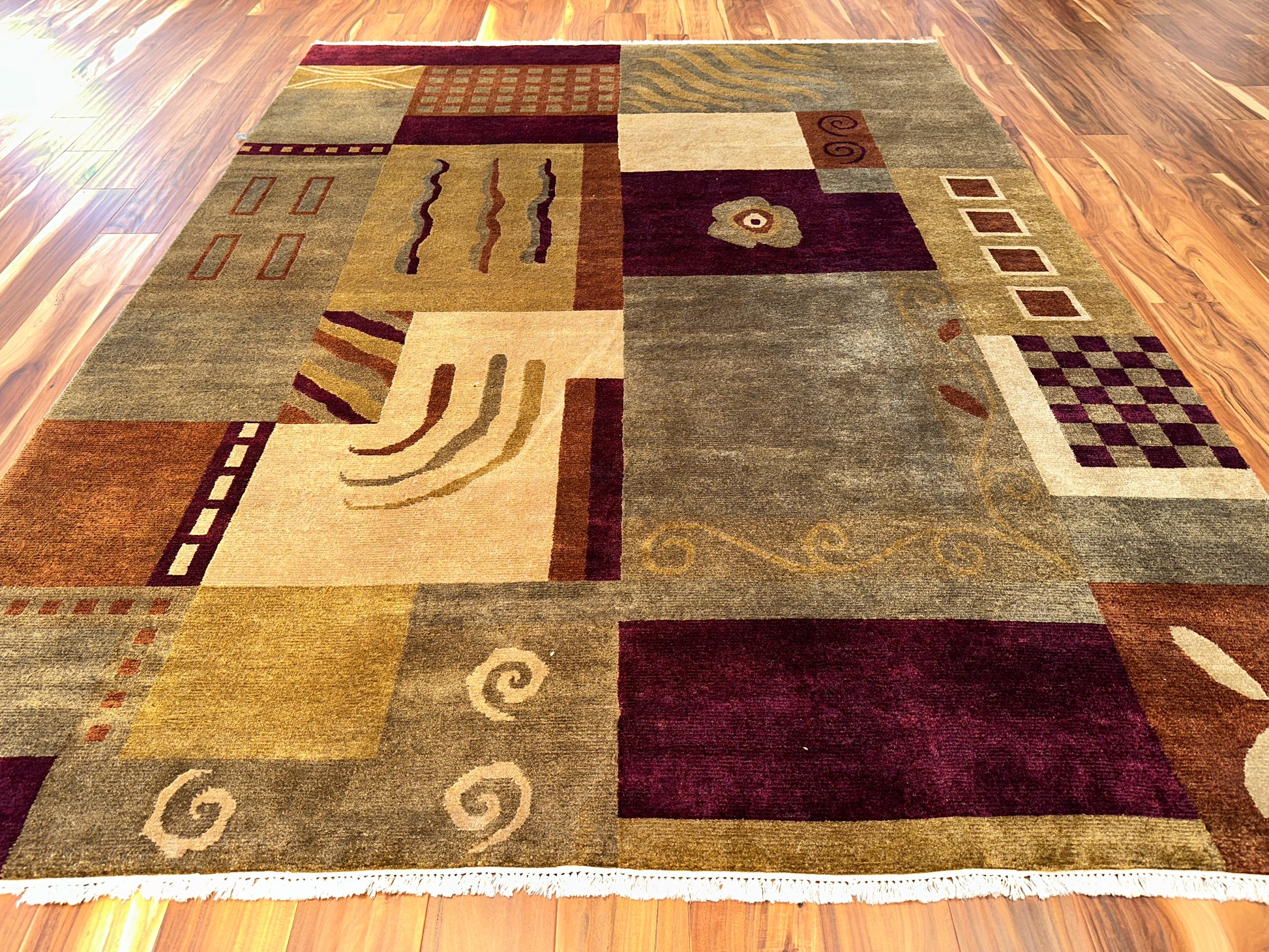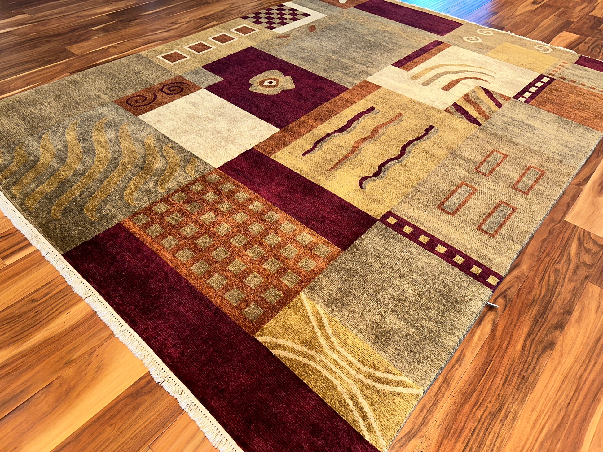 This hand-knotted rug is a celebration of abstract expression and vibrant geometry. A tapestry of asymmetrical blocks filled with whimsical motifs—waves, spirals, checks, arches, and florals—creates a dynamic composition that feels both modern and artistic. The rich palette of crimson, ochre, cream, slate, and rust comes together in perfect balance, making this piece a statement in any room.