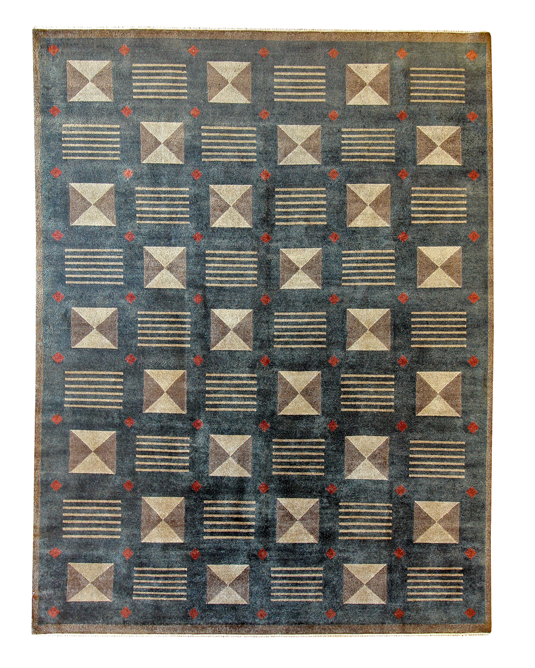 With a perfectly balanced grid of alternating geometric blocks, this hand-knotted rug offers a composed and contemporary presence. Muted neutrals and deep denim blue are brought to life by subtle red accents, creating a refined and rhythmic visual that suits both modern and transitional interiors.