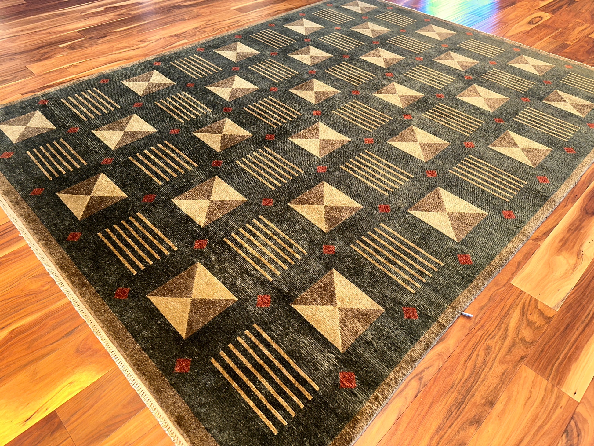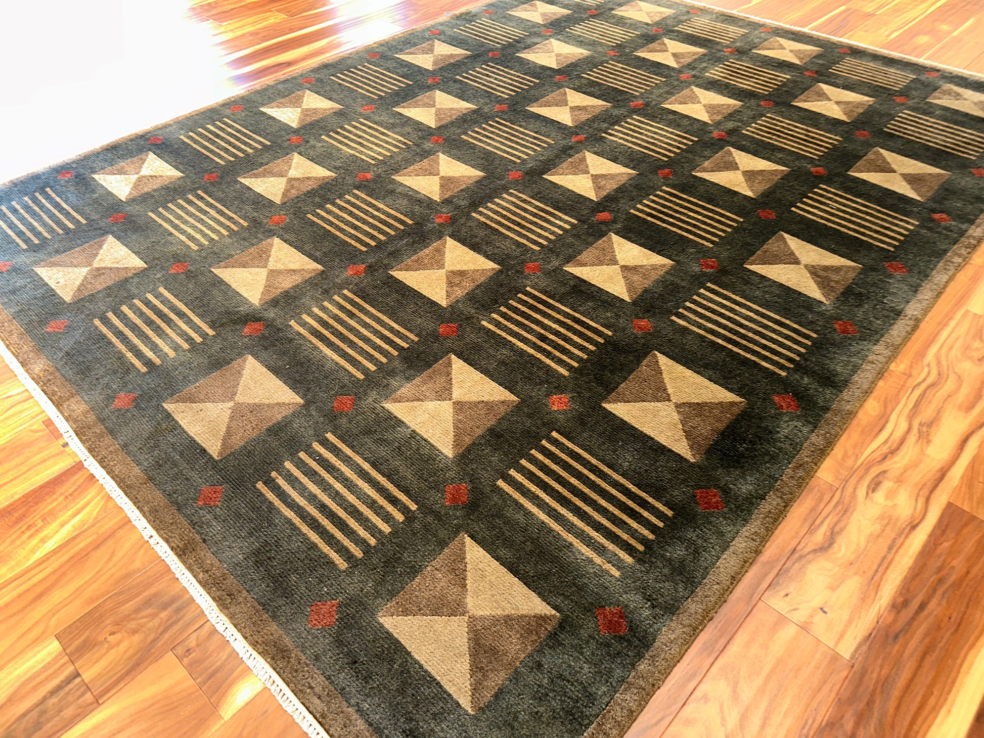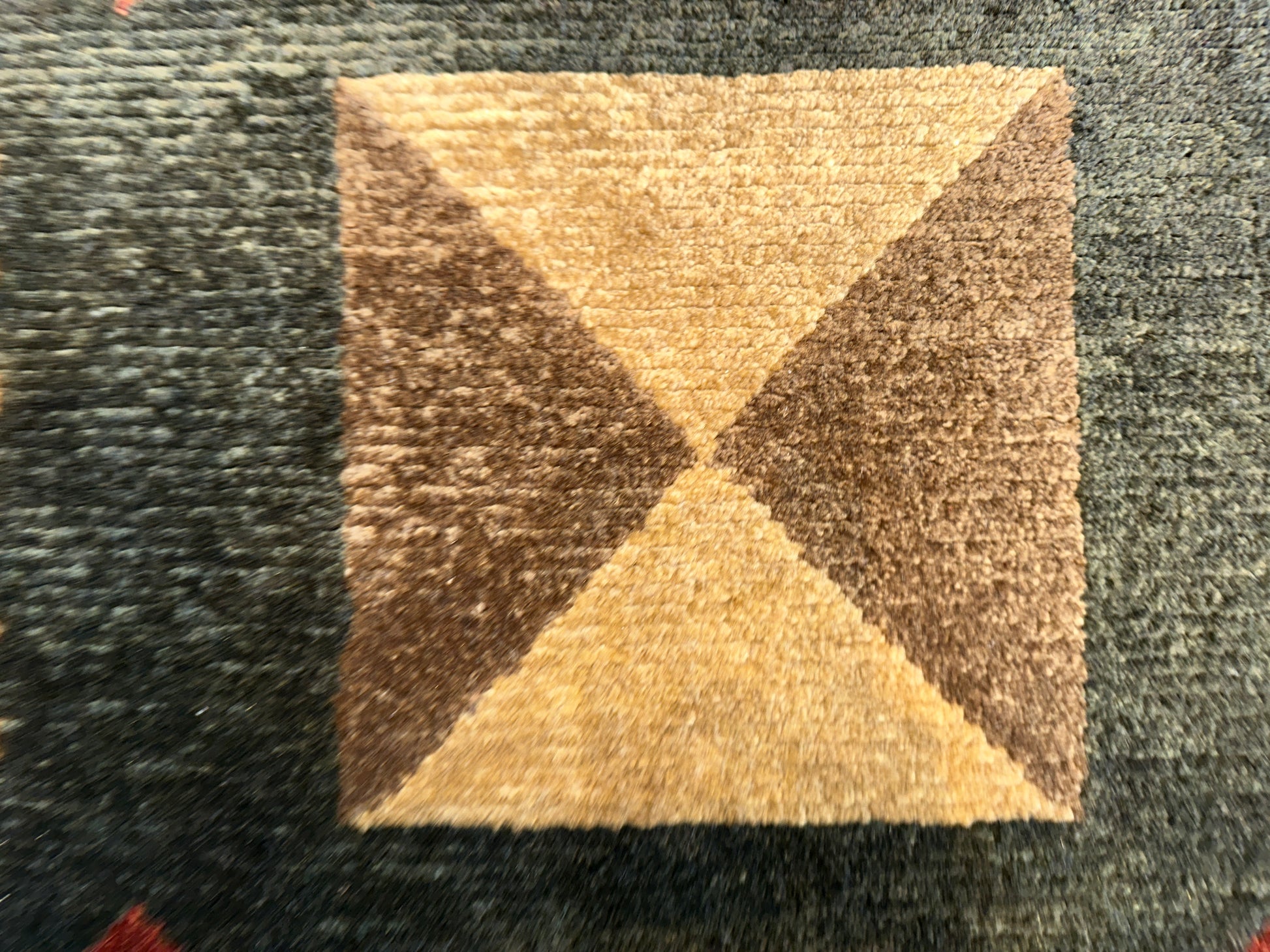- Design: Repeating geometric block pattern with striped and pyramid motifs