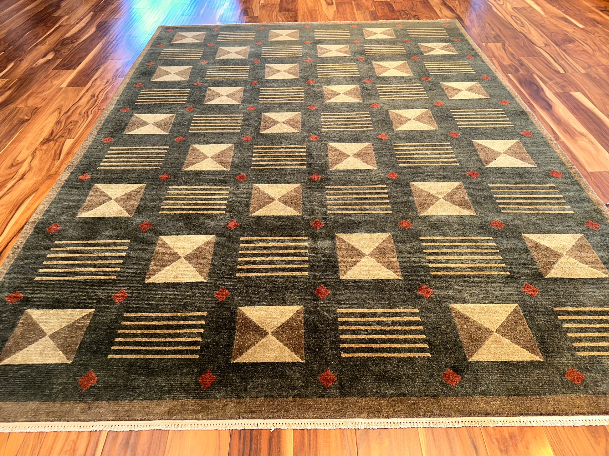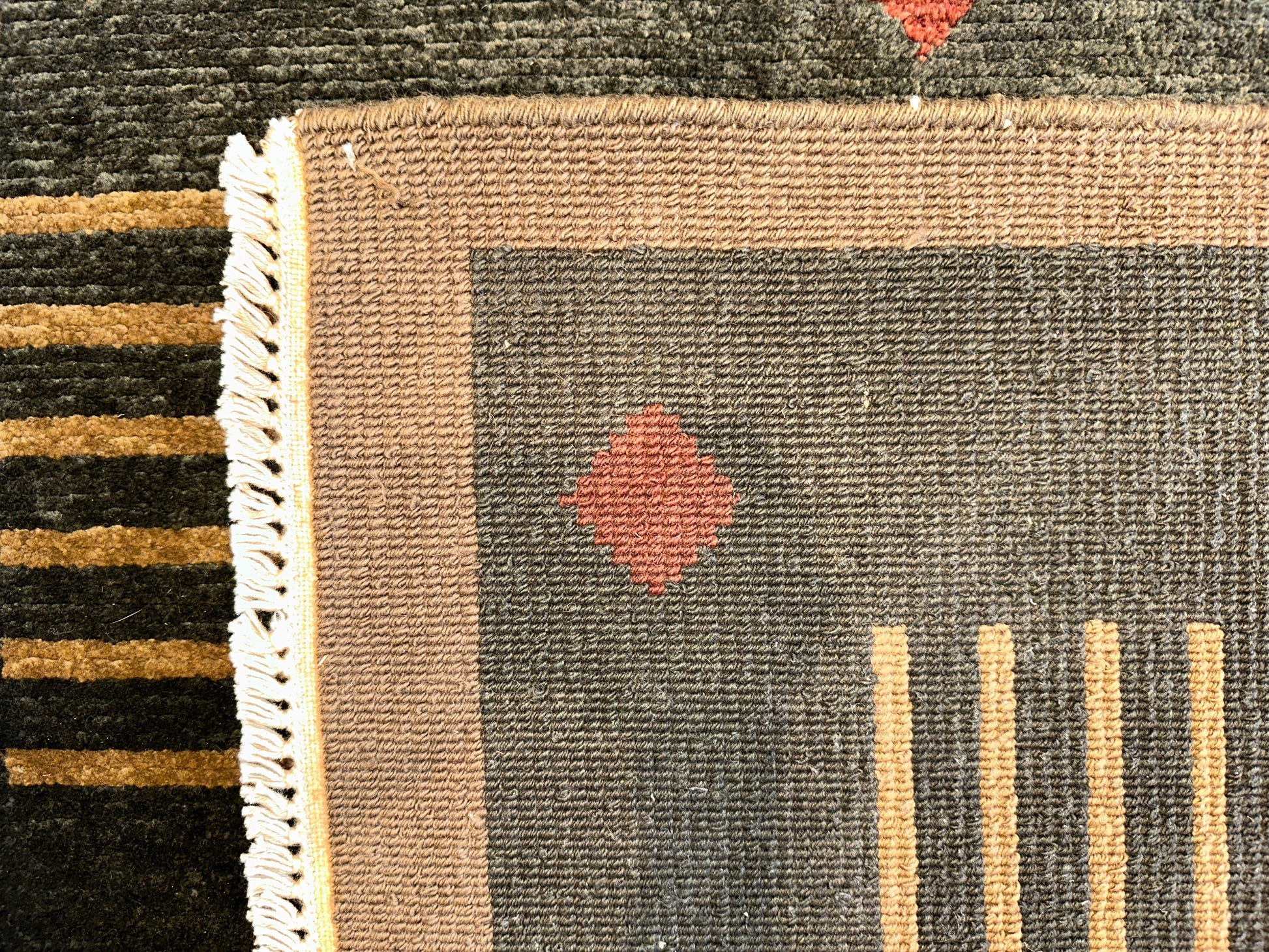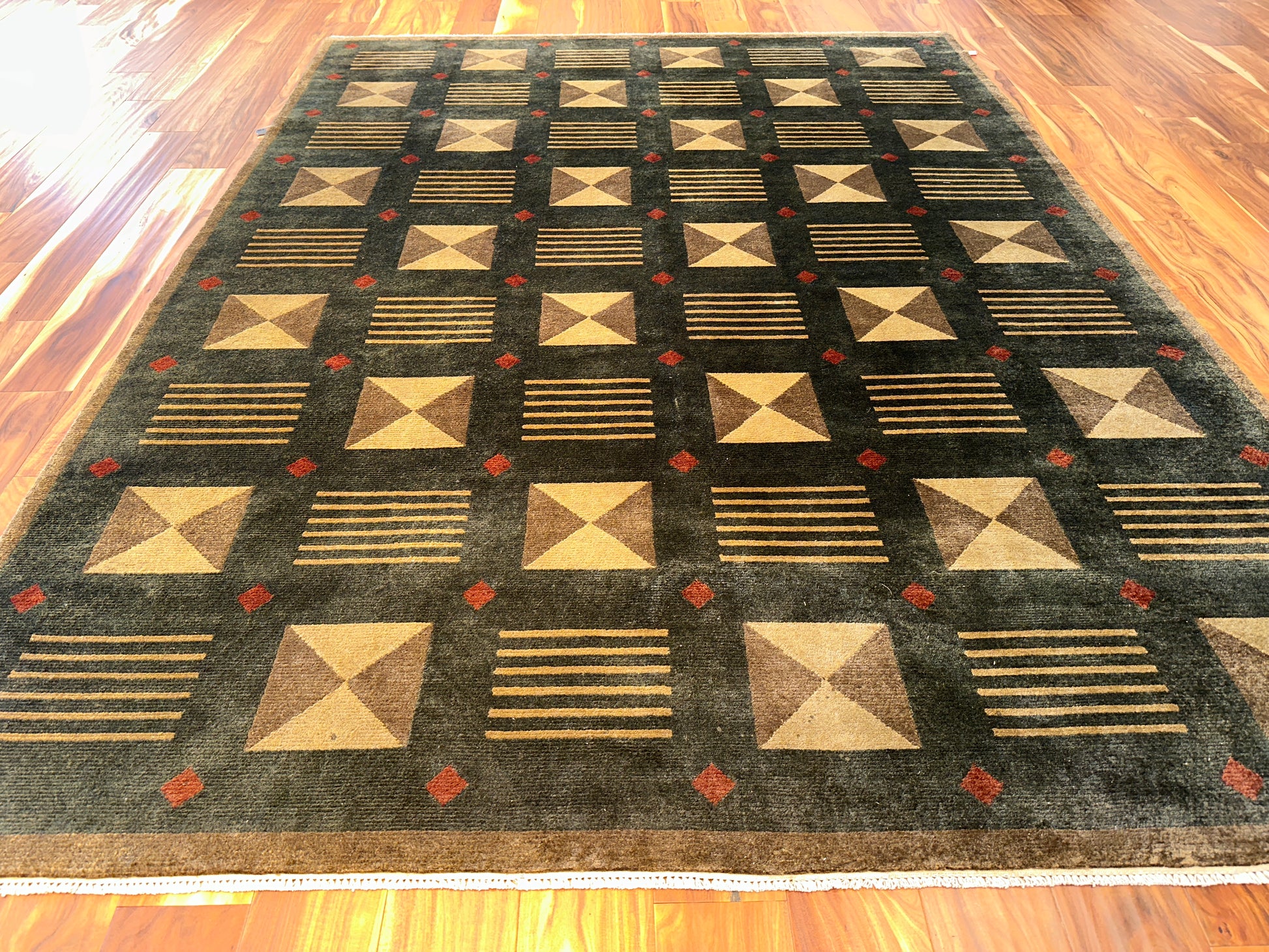 - Design: Repeating geometric block pattern with striped and pyramid motifs