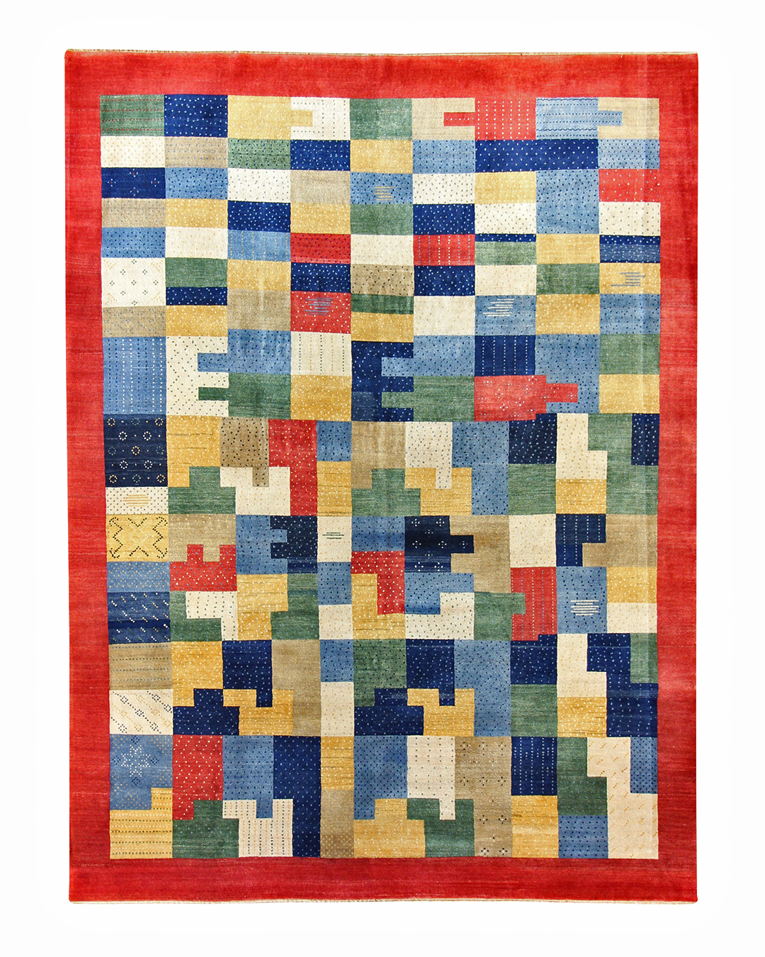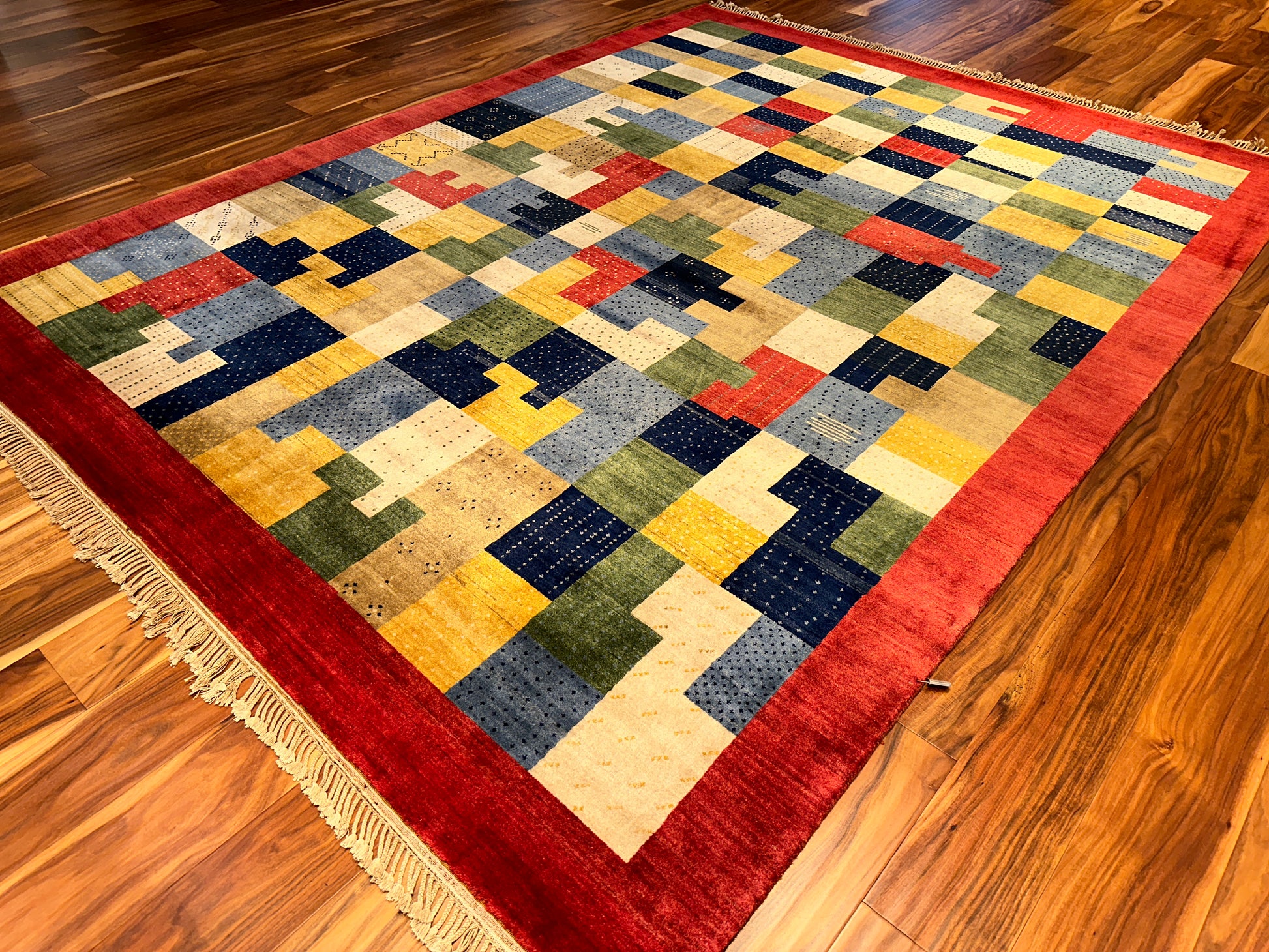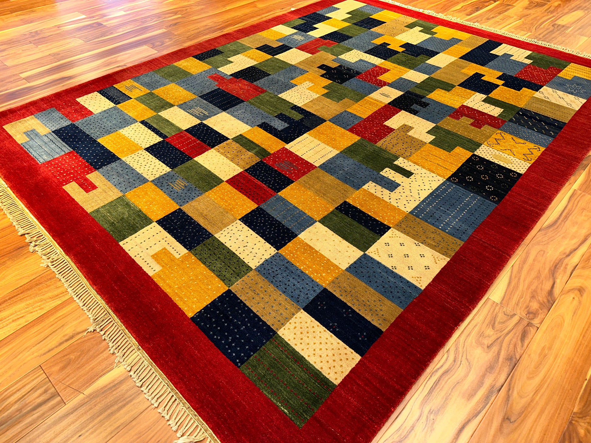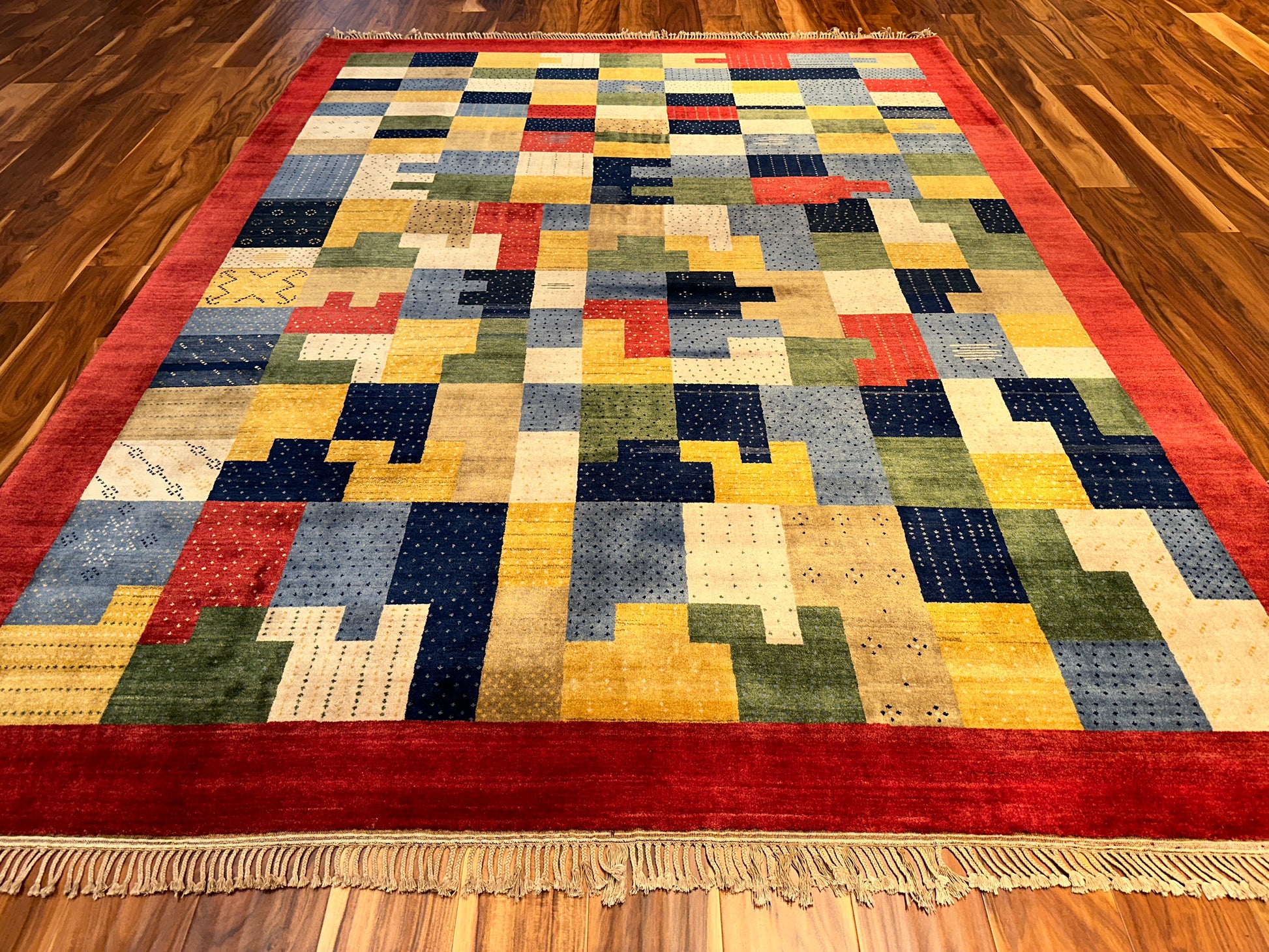 Vivid and playful, this hand-knotted rug blends traditional Gabbeh elements with a bold, modern twist. The field is composed of rectangular and stepped blocks in a range of bright and earthy tones—mustard, navy, jade, cream, and carmine—each with subtle stitched or dotted patterns. Framed by a rich red border, it radiates warmth and charm, evoking the feeling of a handwoven quilt or a geometric folk tapestry.