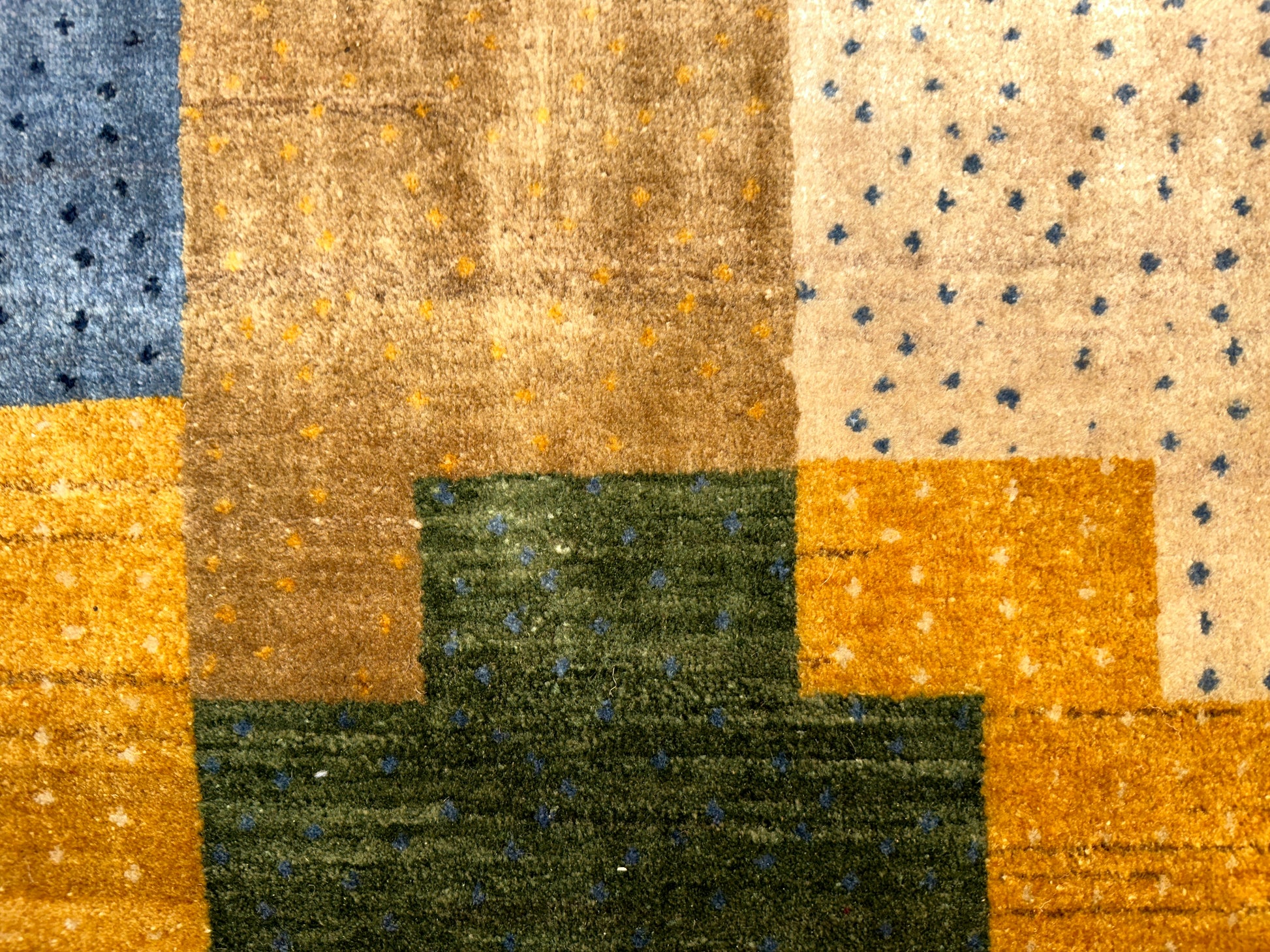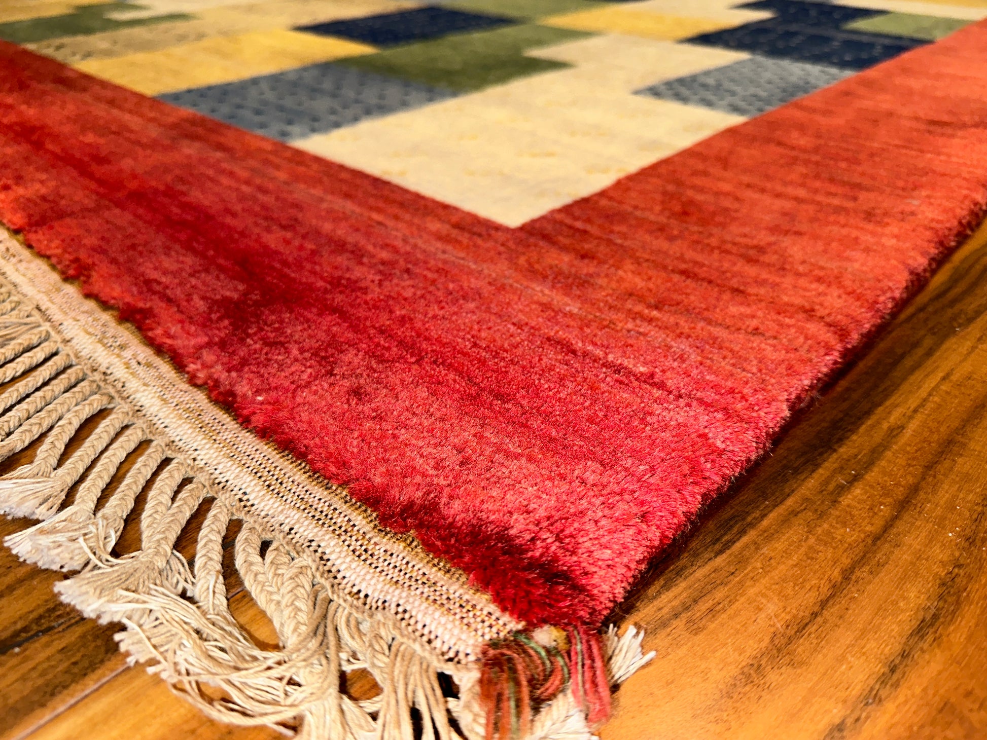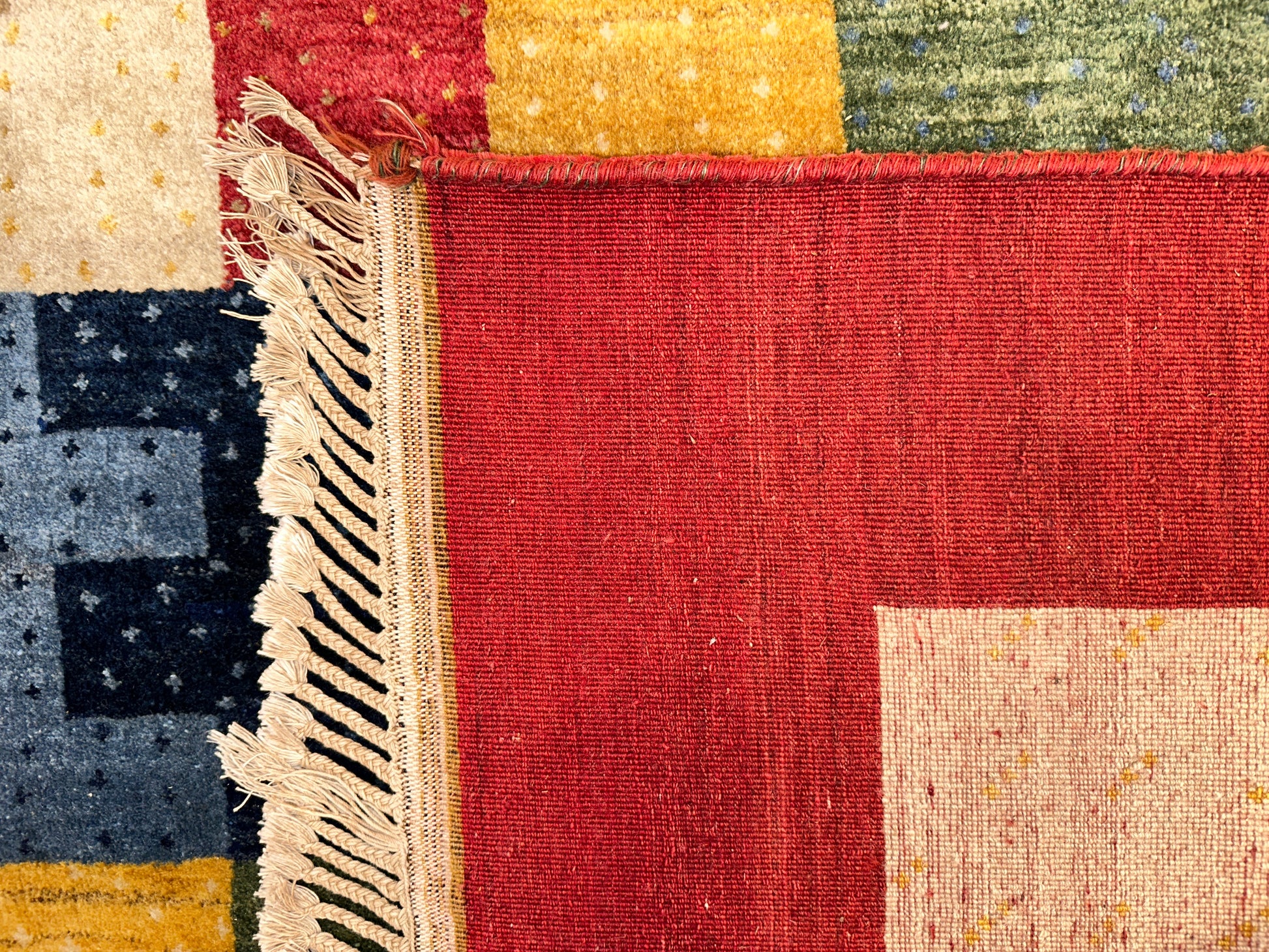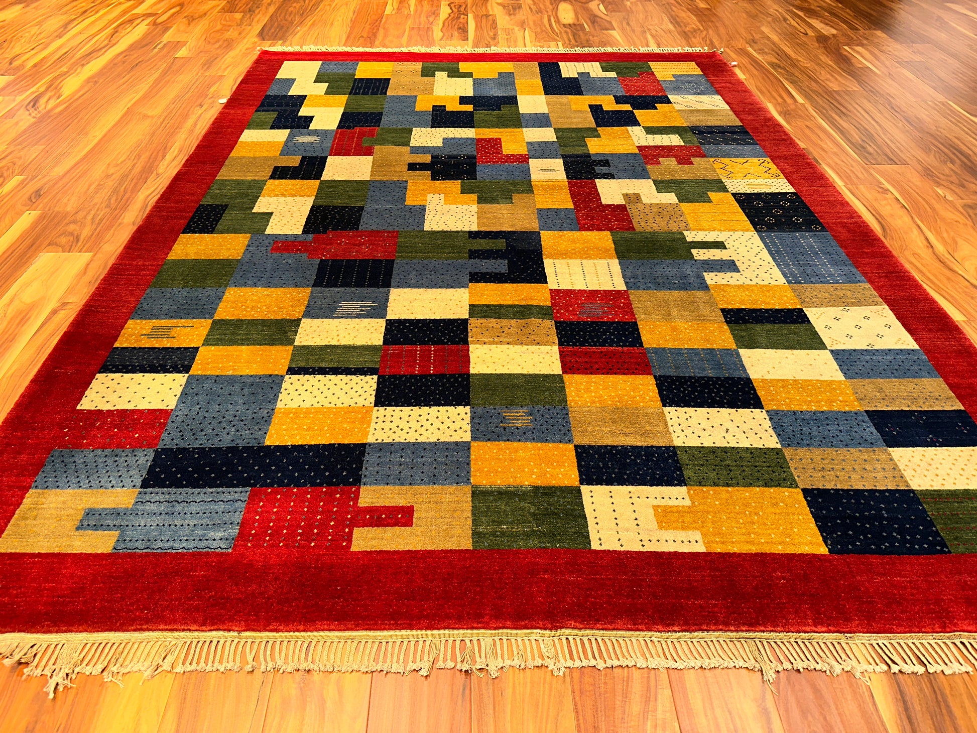 Vivid and playful, this hand-knotted rug blends traditional Gabbeh elements with a bold, modern twist. The field is composed of rectangular and stepped blocks in a range of bright and earthy tones—mustard, navy, jade, cream, and carmine—each with subtle stitched or dotted patterns. Framed by a rich red border, it radiates warmth and charm, evoking the feeling of a handwoven quilt or a geometric folk tapestry.