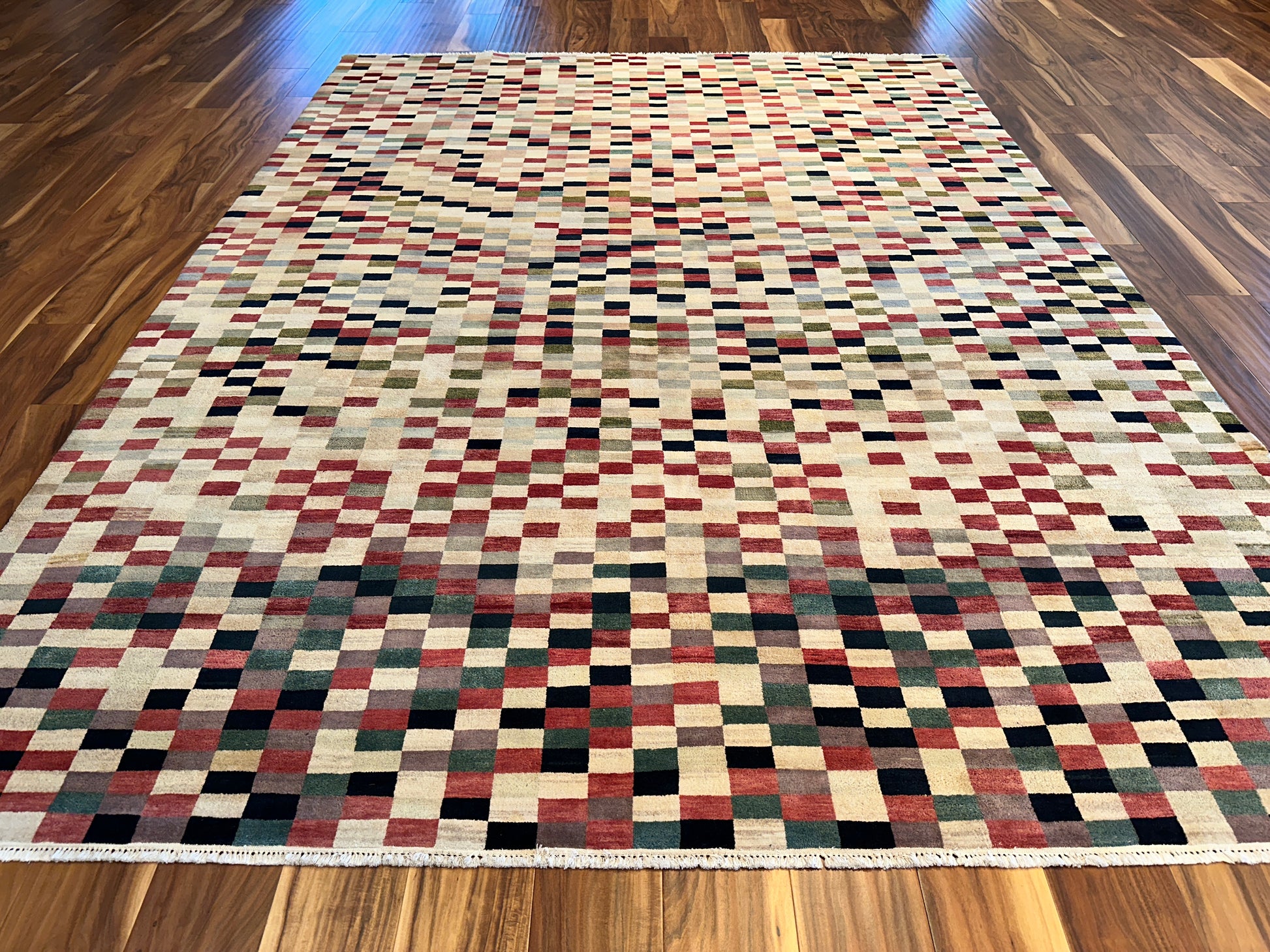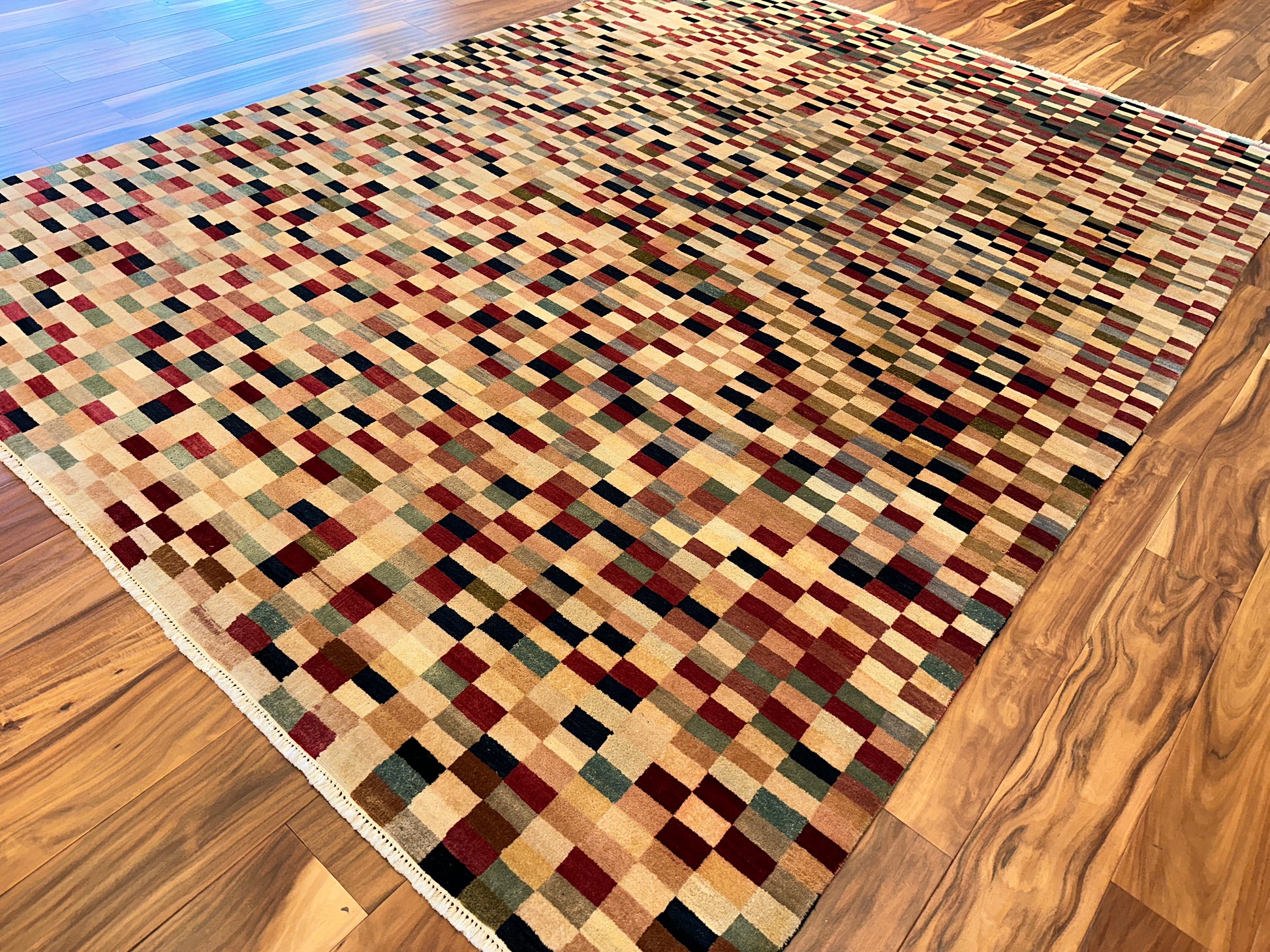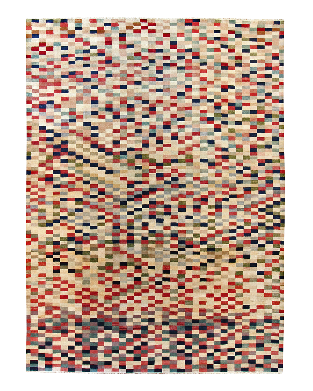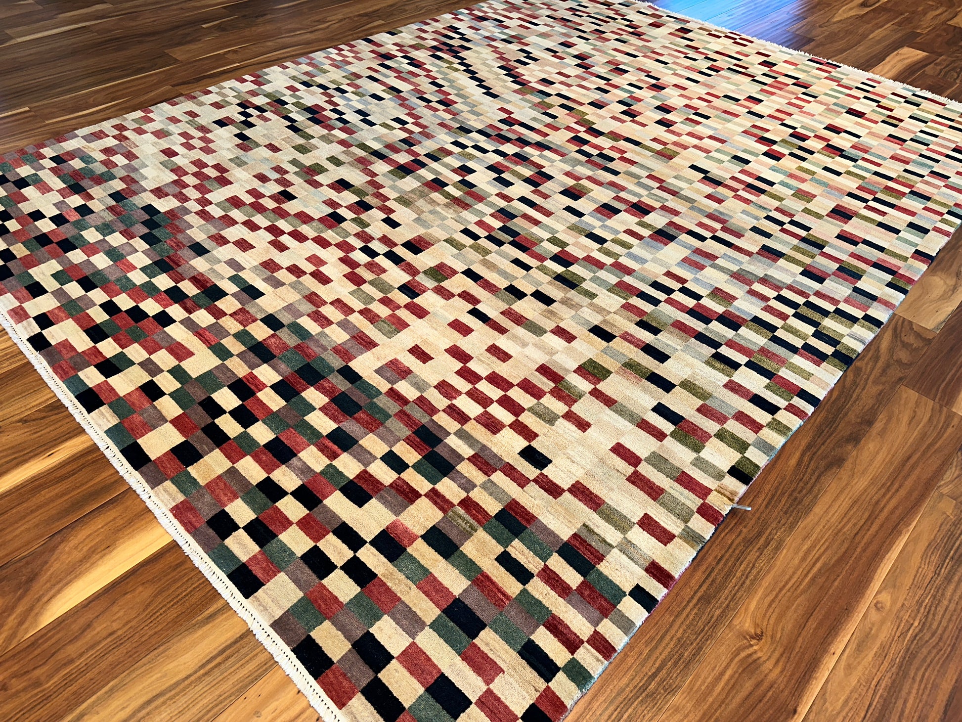 A vivid celebration of color and movement, this hand-knotted rug features a mosaic of tiny rectangles that ripple across the surface like a digital landscape. Shades of crimson, navy, sage, and ivory interlace to create an energetic, pixelated rhythm—lively yet surprisingly balanced. Its dynamic composition makes it a captivating focal point for eclectic or modern interiors.