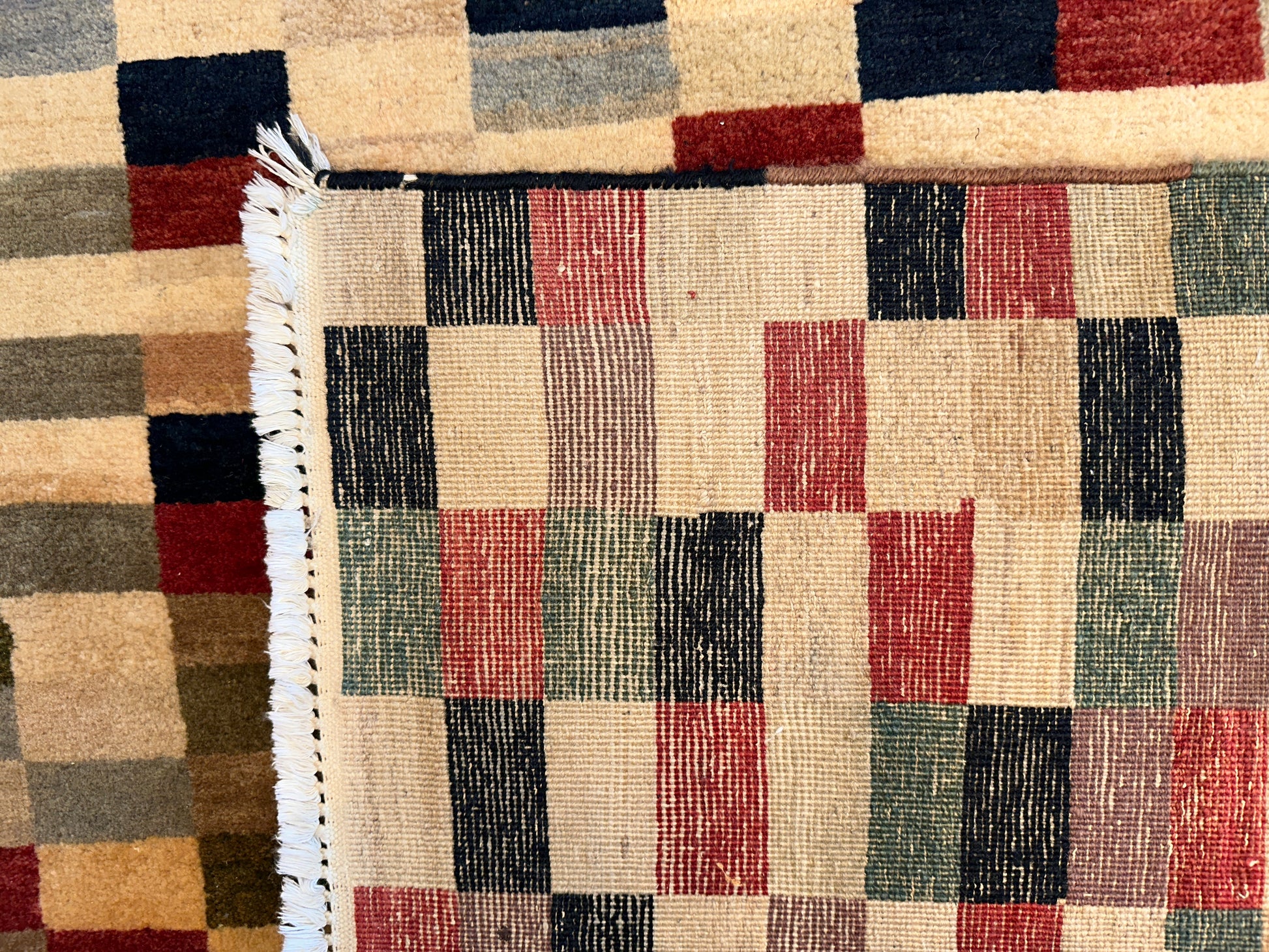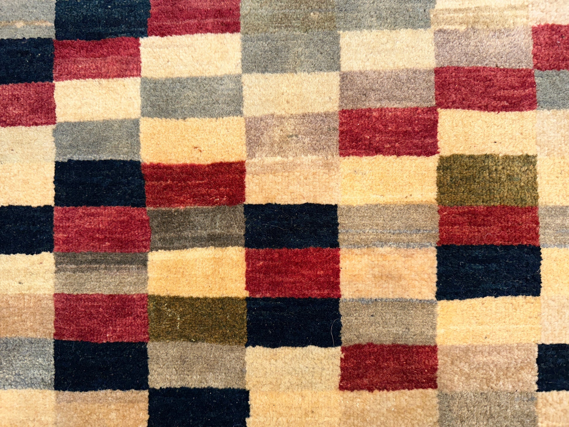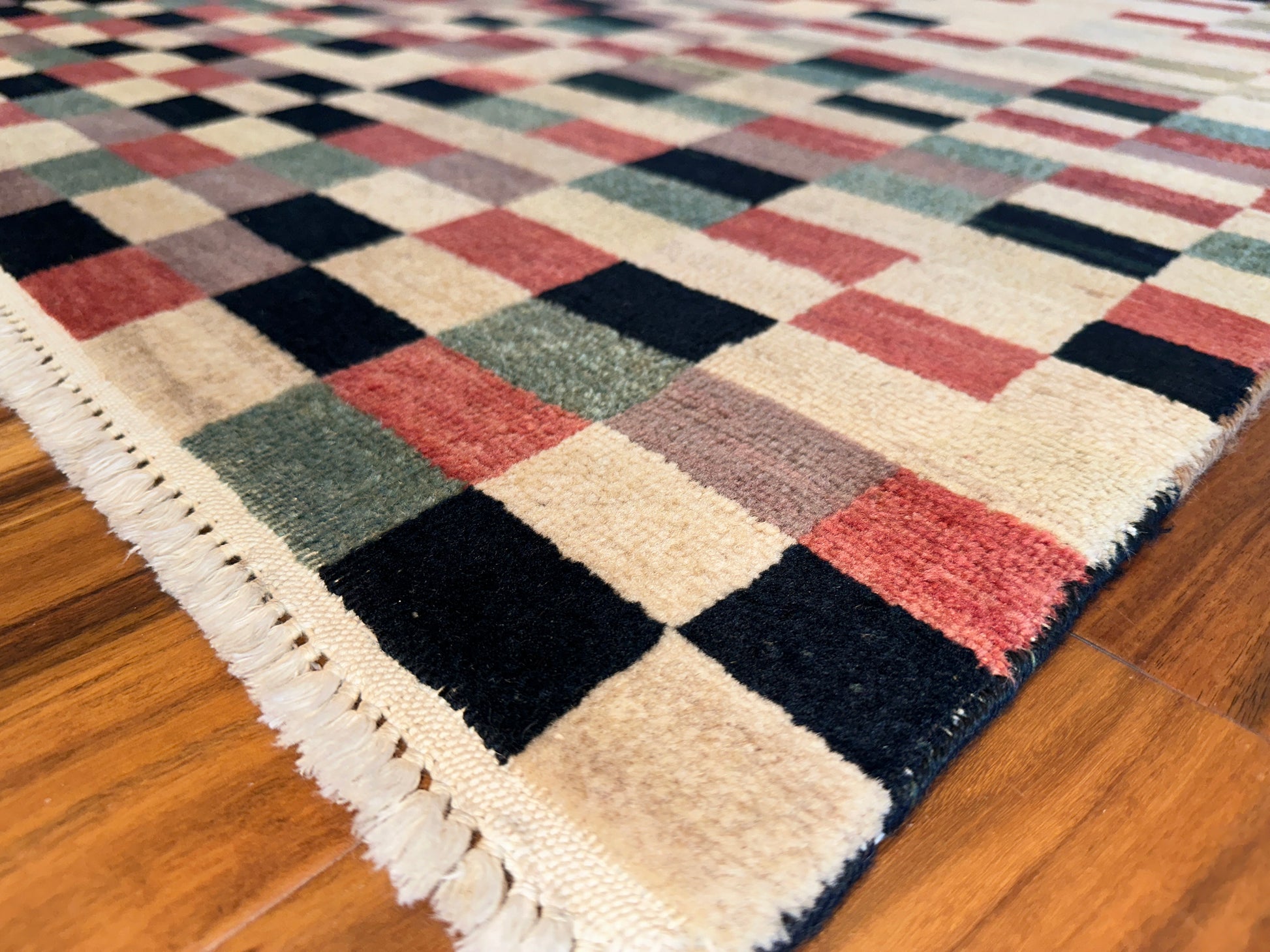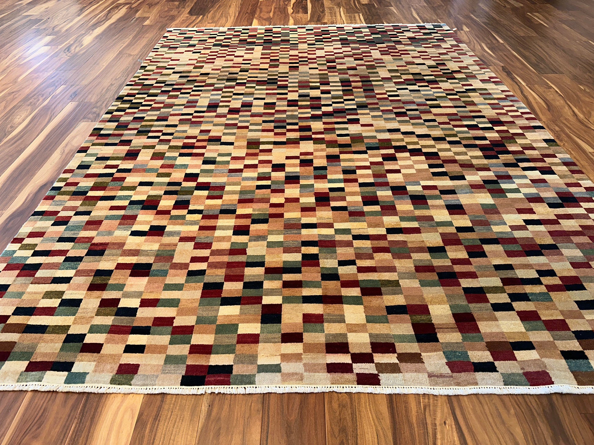 A vivid celebration of color and movement, this hand-knotted rug features a mosaic of tiny rectangles that ripple across the surface like a digital landscape. Shades of crimson, navy, sage, and ivory interlace to create an energetic, pixelated rhythm—lively yet surprisingly balanced. Its dynamic composition makes it a captivating focal point for eclectic or modern interiors.