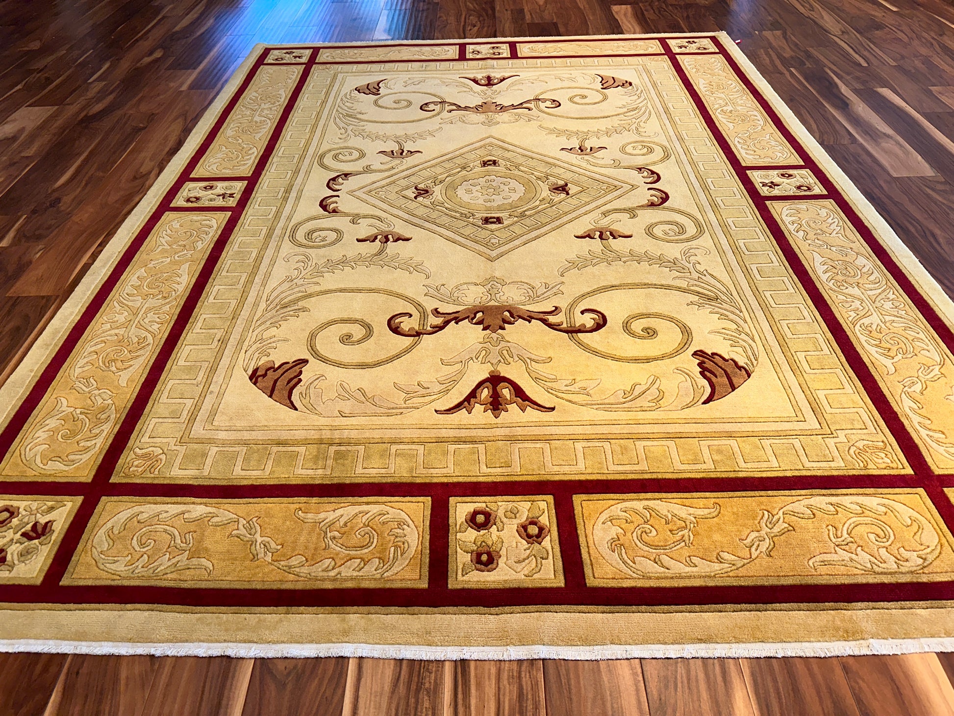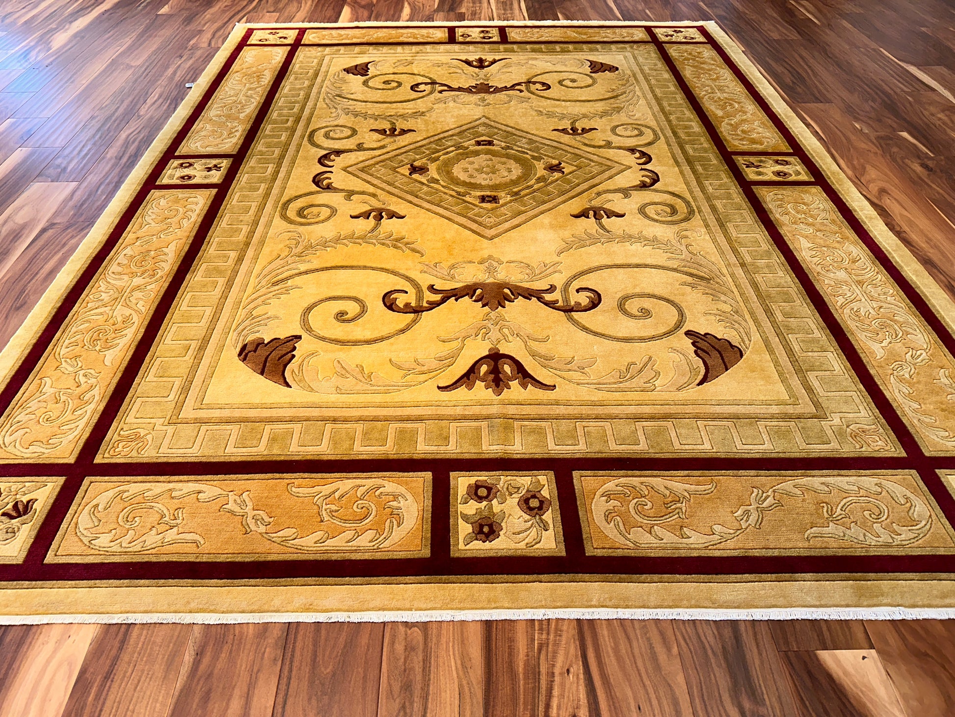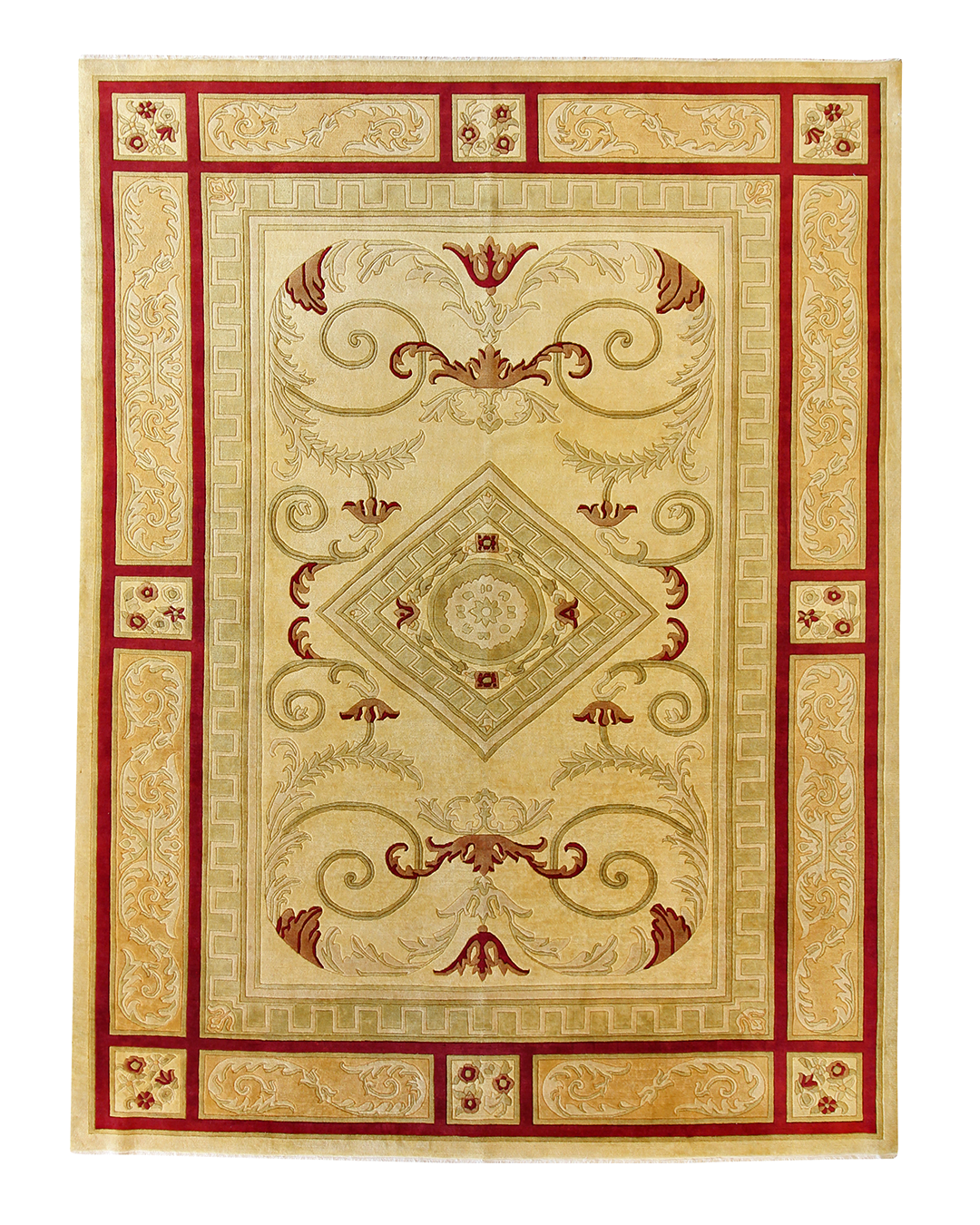 A regal presence flows through this classic Aubusson-inspired rug, where graceful scrollwork, floral medallions, and an ornate central diamond motif are framed in layers of parchment gold and deep crimson. The symmetry and richness of the design evoke old-world sophistication, making this rug a timeless anchor for formal spaces steeped in elegance.