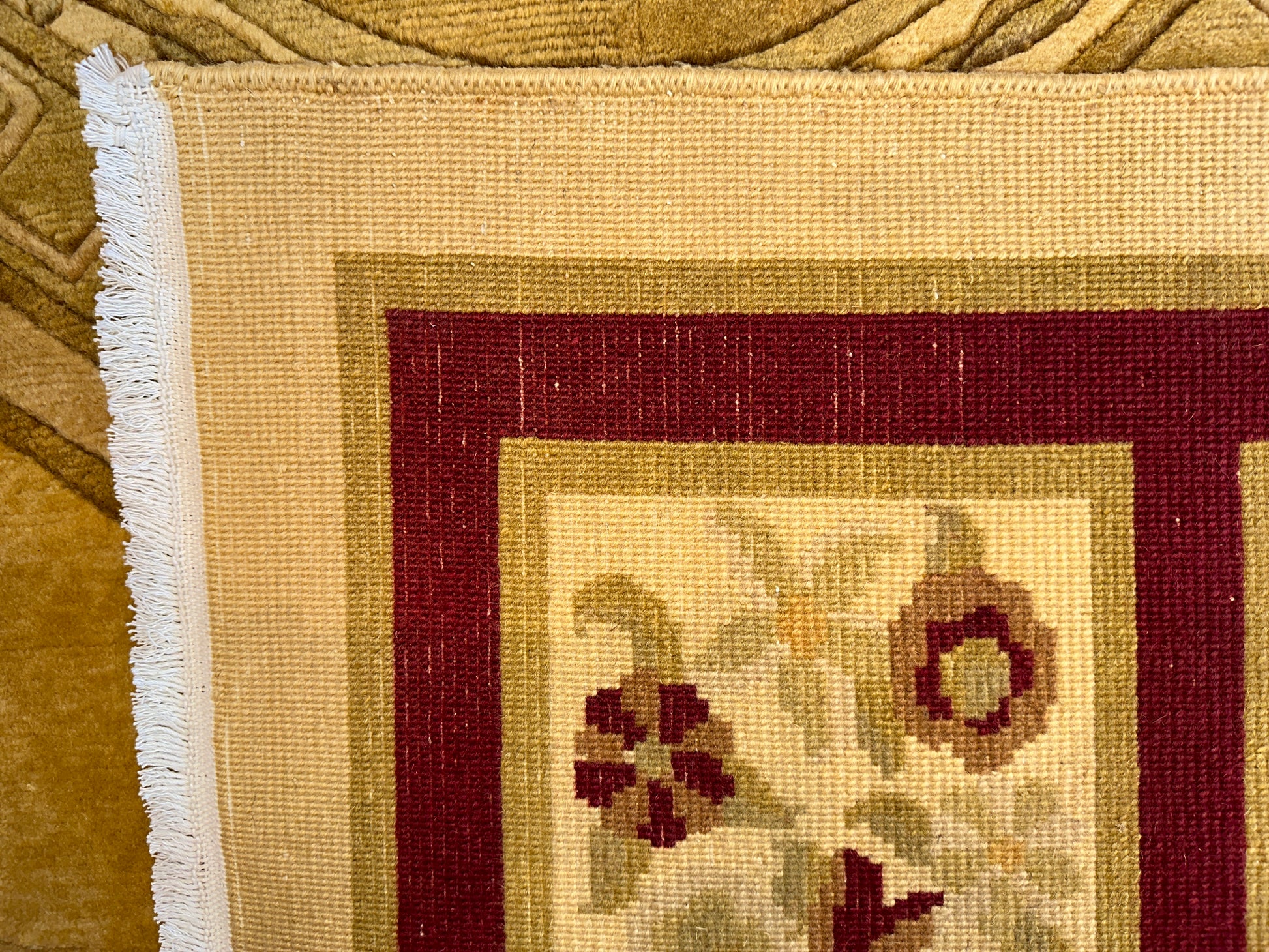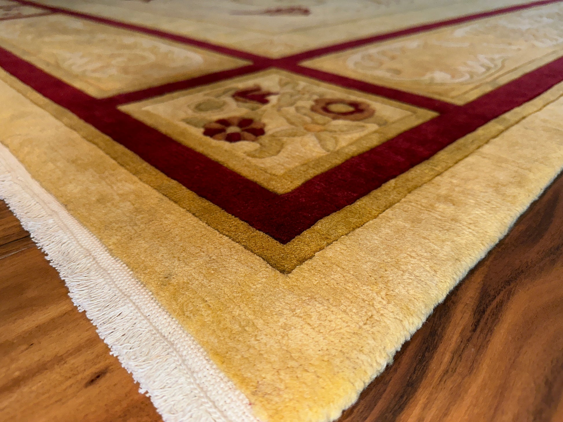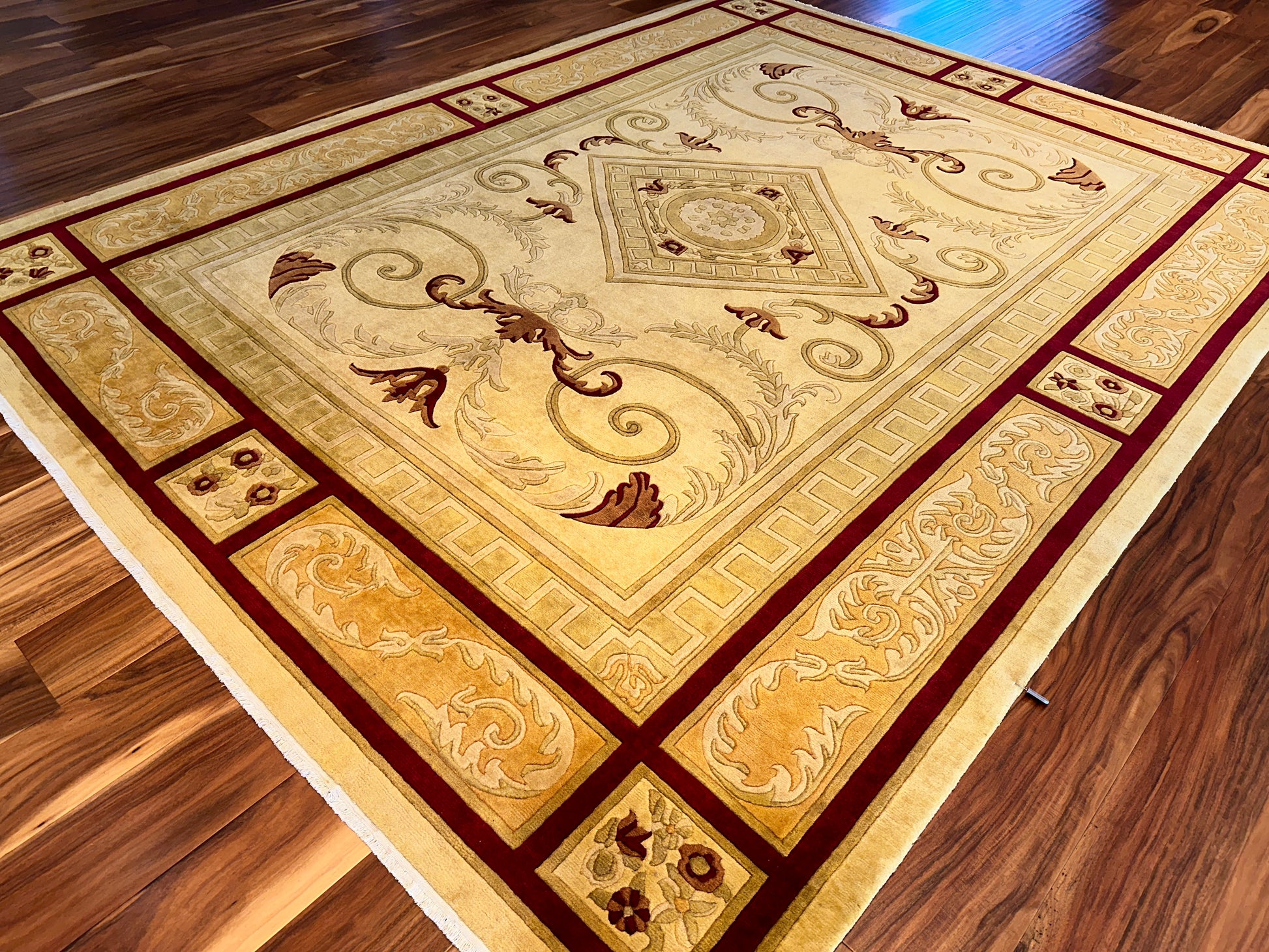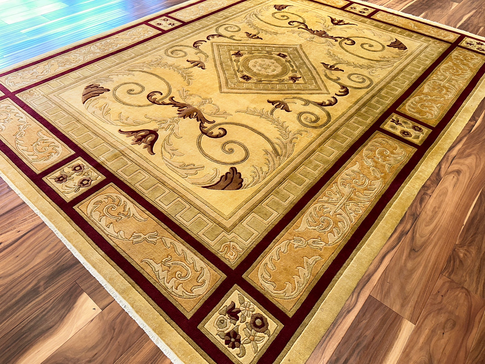 A regal presence flows through this classic Aubusson-inspired rug, where graceful scrollwork, floral medallions, and an ornate central diamond motif are framed in layers of parchment gold and deep crimson. The symmetry and richness of the design evoke old-world sophistication, making this rug a timeless anchor for formal spaces steeped in elegance.
