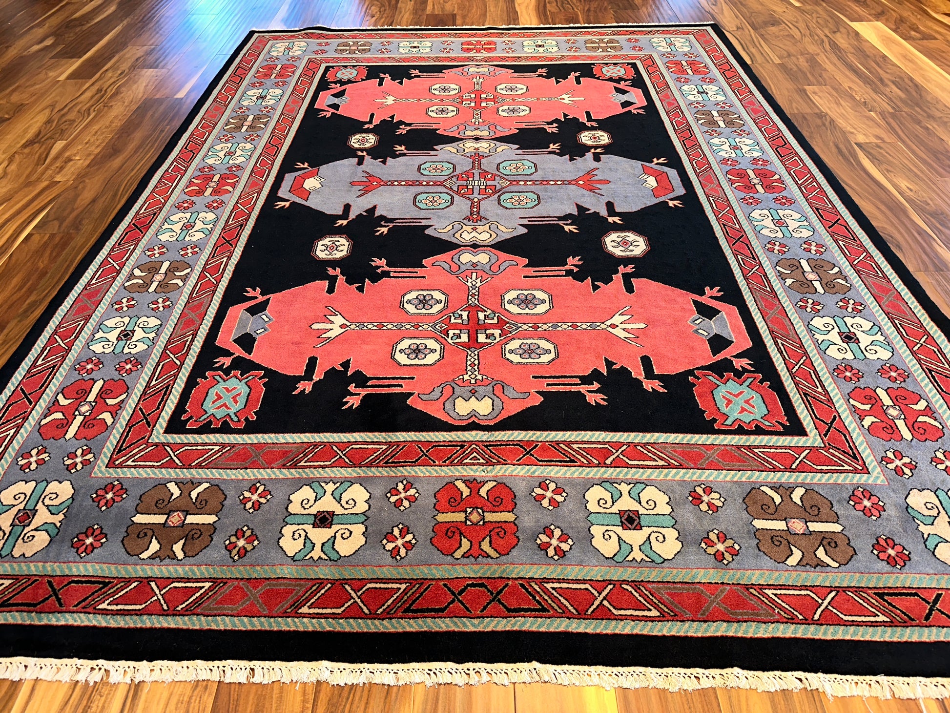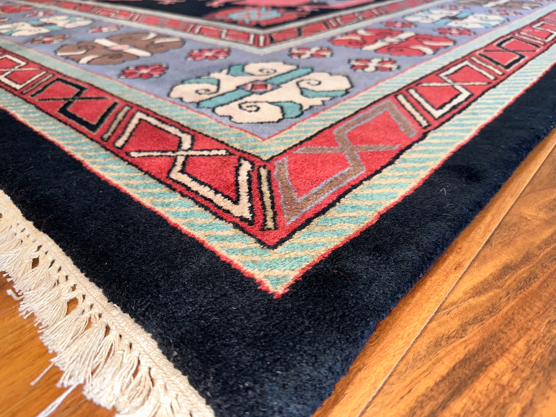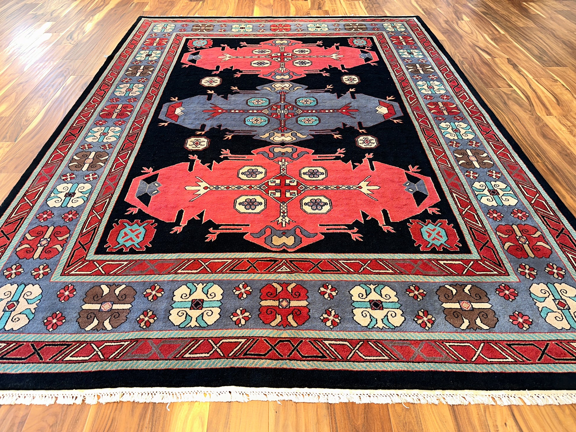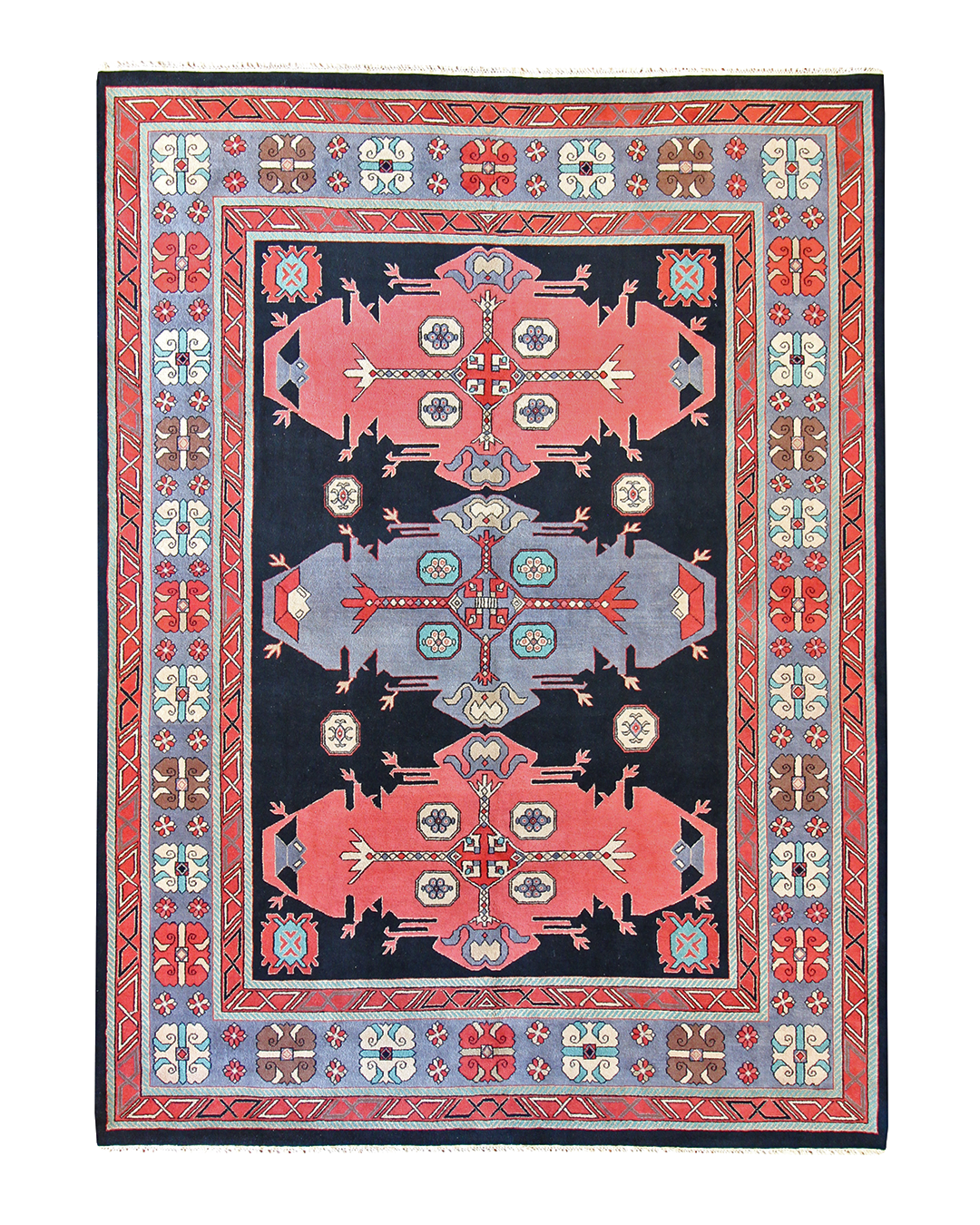 This striking rug draws inspiration from tribal motifs, featuring bold medallions in rose and periwinkle tones set against a deep indigo field. Intricate floral emblems and symbolic forms are echoed in the borders, which are wrapped in layers of brick red, blue, and ivory. A dynamic composition that celebrates tradition while offering a vivid statement for eclectic or globally influenced interiors.
