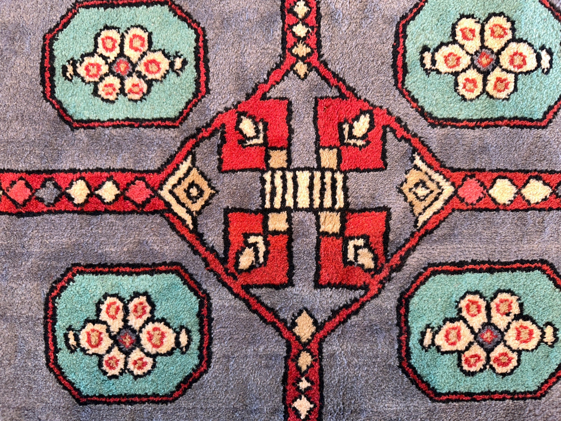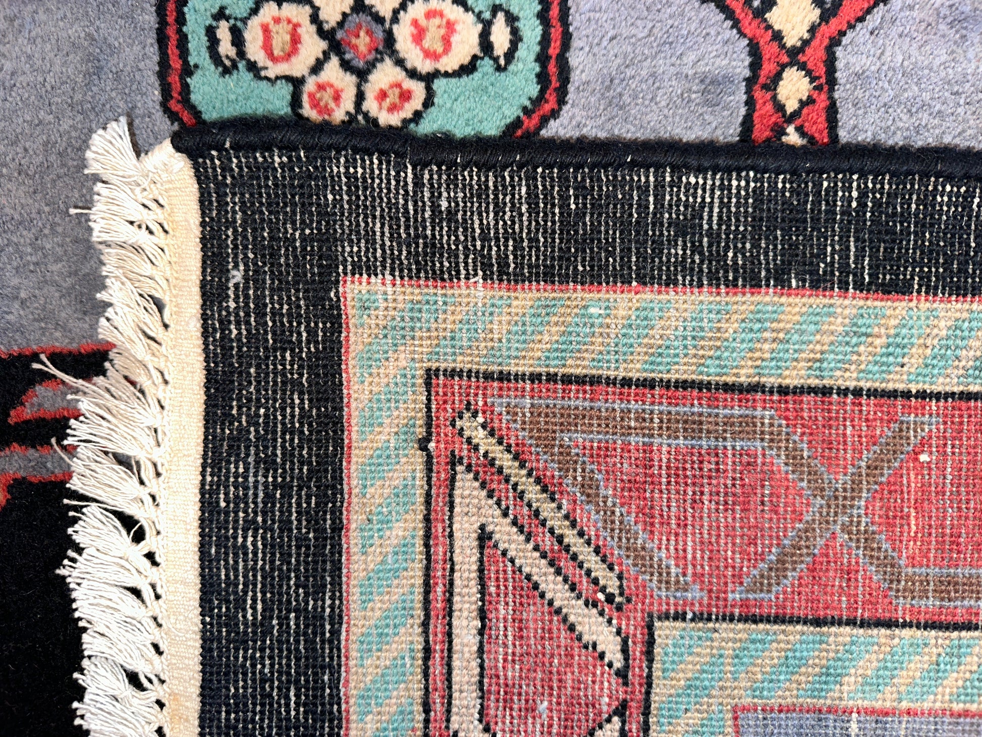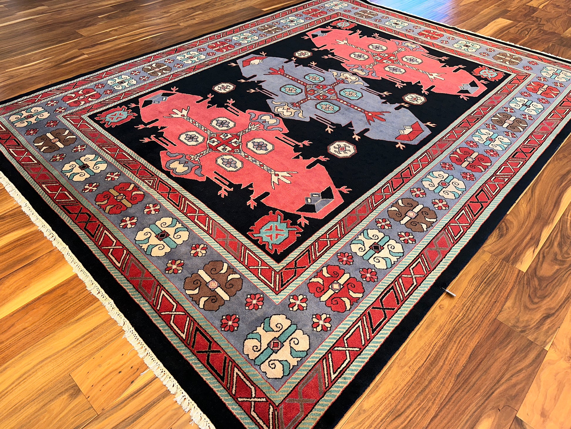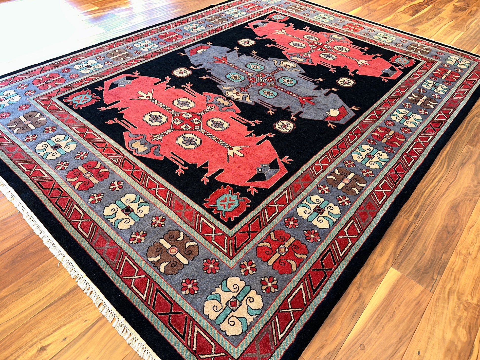 This striking rug draws inspiration from tribal motifs, featuring bold medallions in rose and periwinkle tones set against a deep indigo field. Intricate floral emblems and symbolic forms are echoed in the borders, which are wrapped in layers of brick red, blue, and ivory. A dynamic composition that celebrates tradition while offering a vivid statement for eclectic or globally influenced interiors.