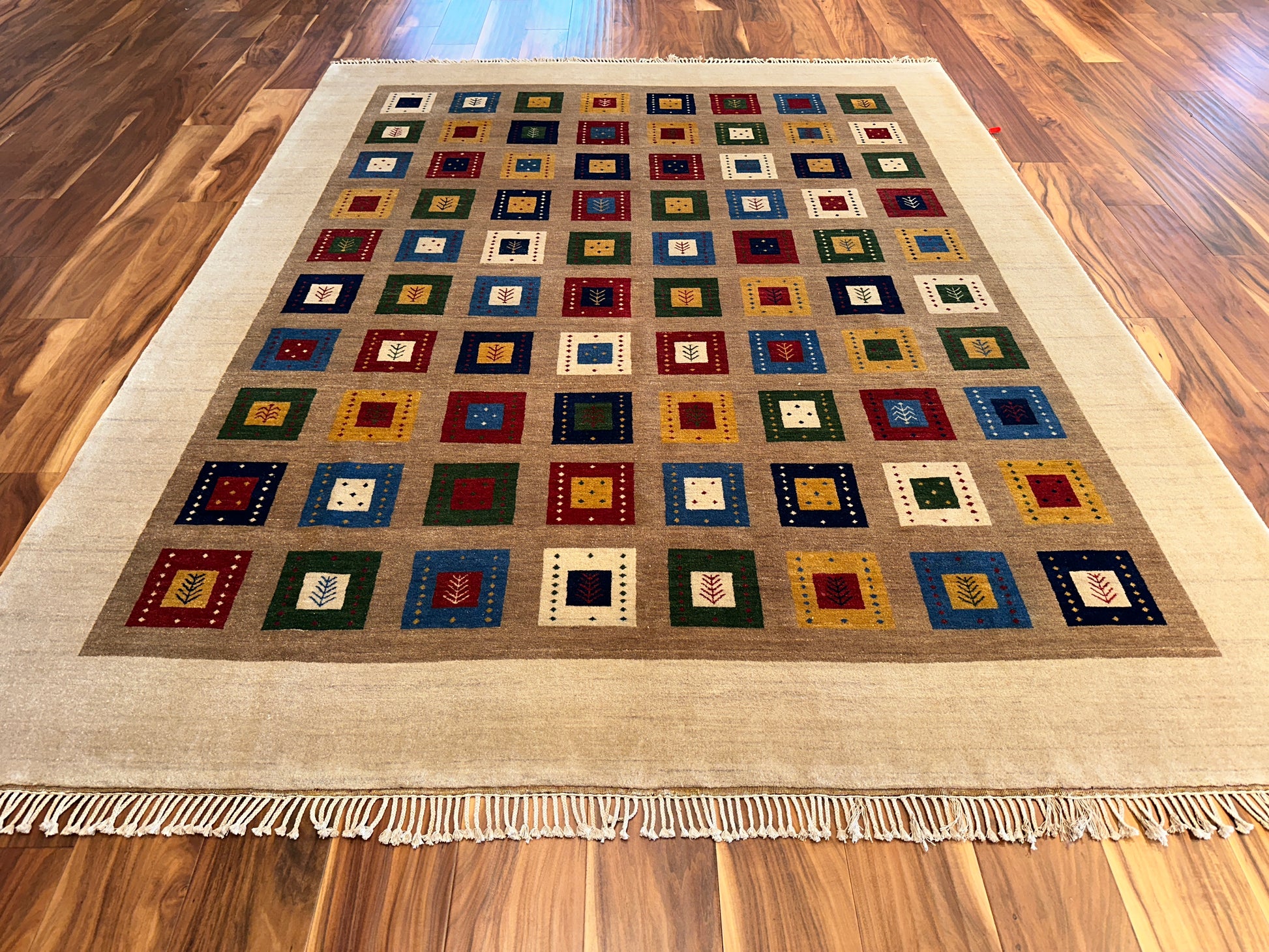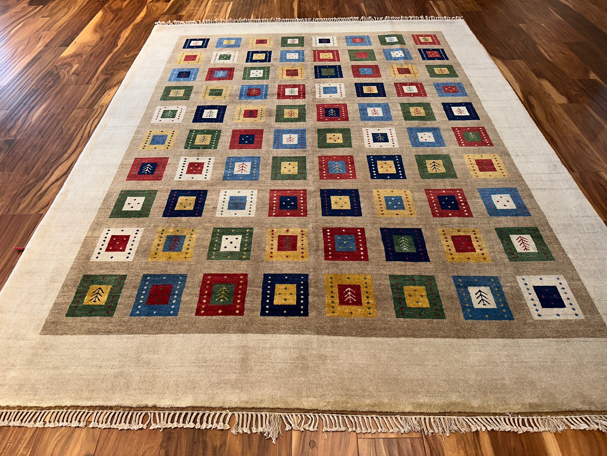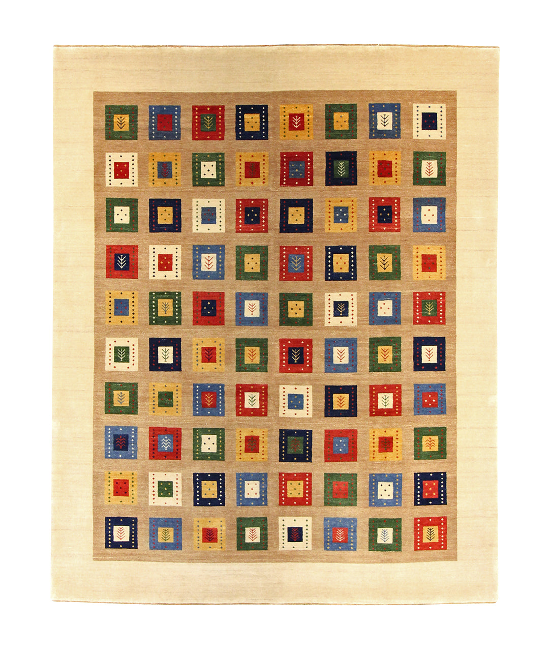Lively and inviting, this rug is filled with rows of colorful square motifs framed within a soft ivory border. Each square features playful accents—tiny symbols, dots, and contrasting frames—in vivid hues of red, blue, green, and gold. The overall effect is both cheerful and grounded, making it an ideal centerpiece for cozy, contemporary homes.