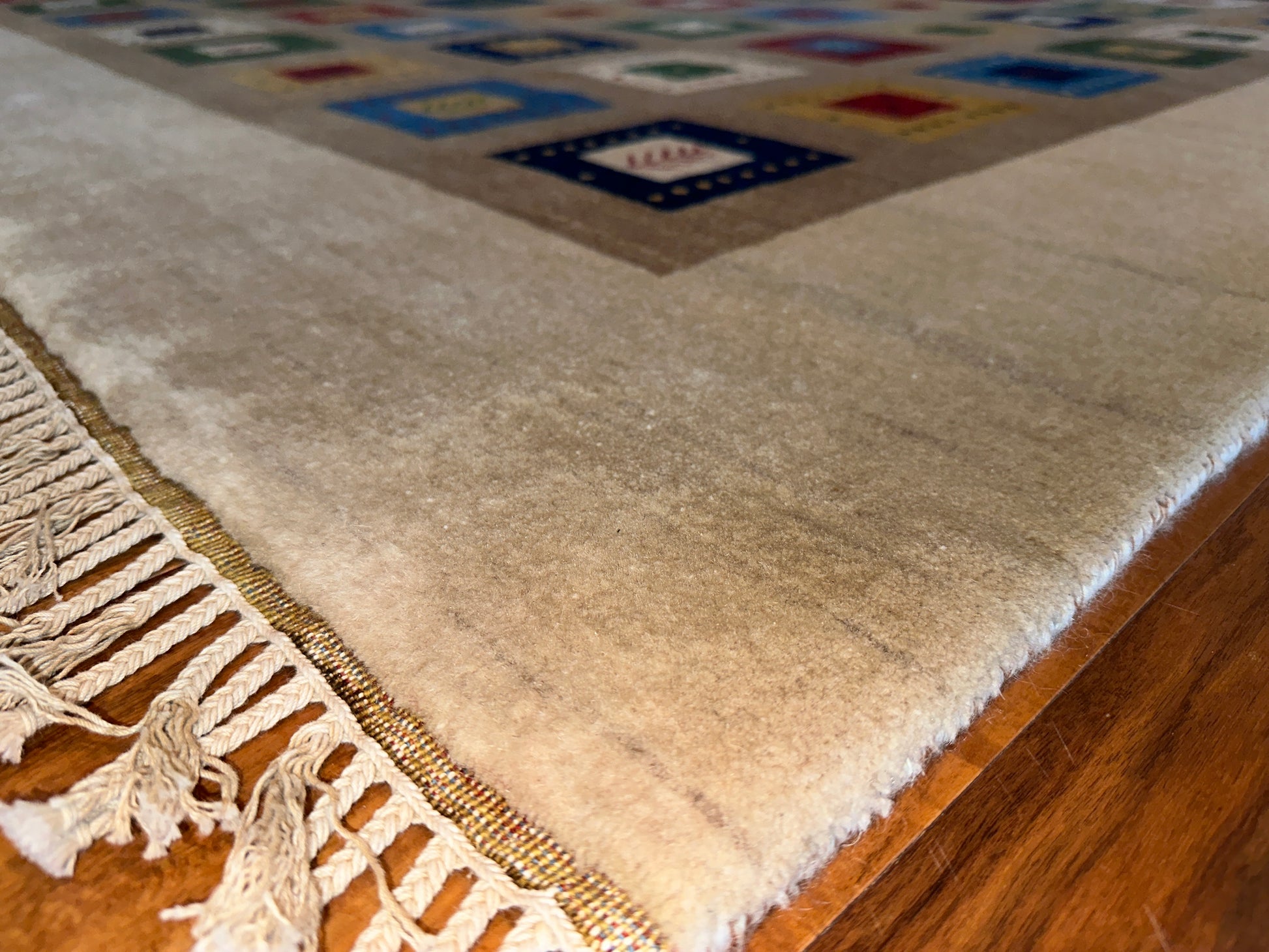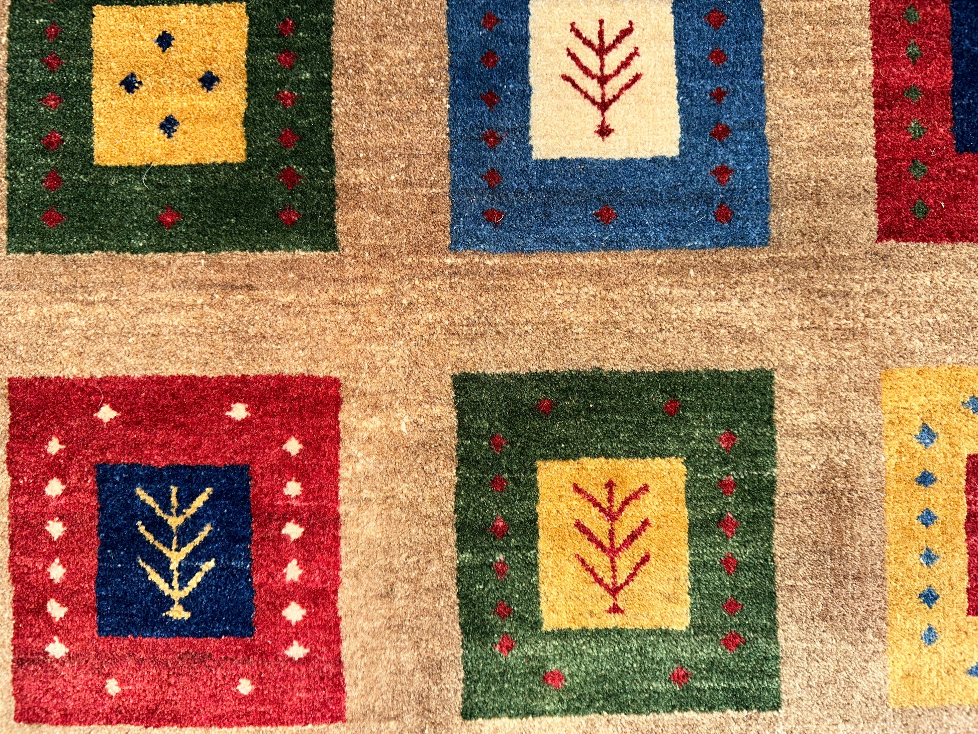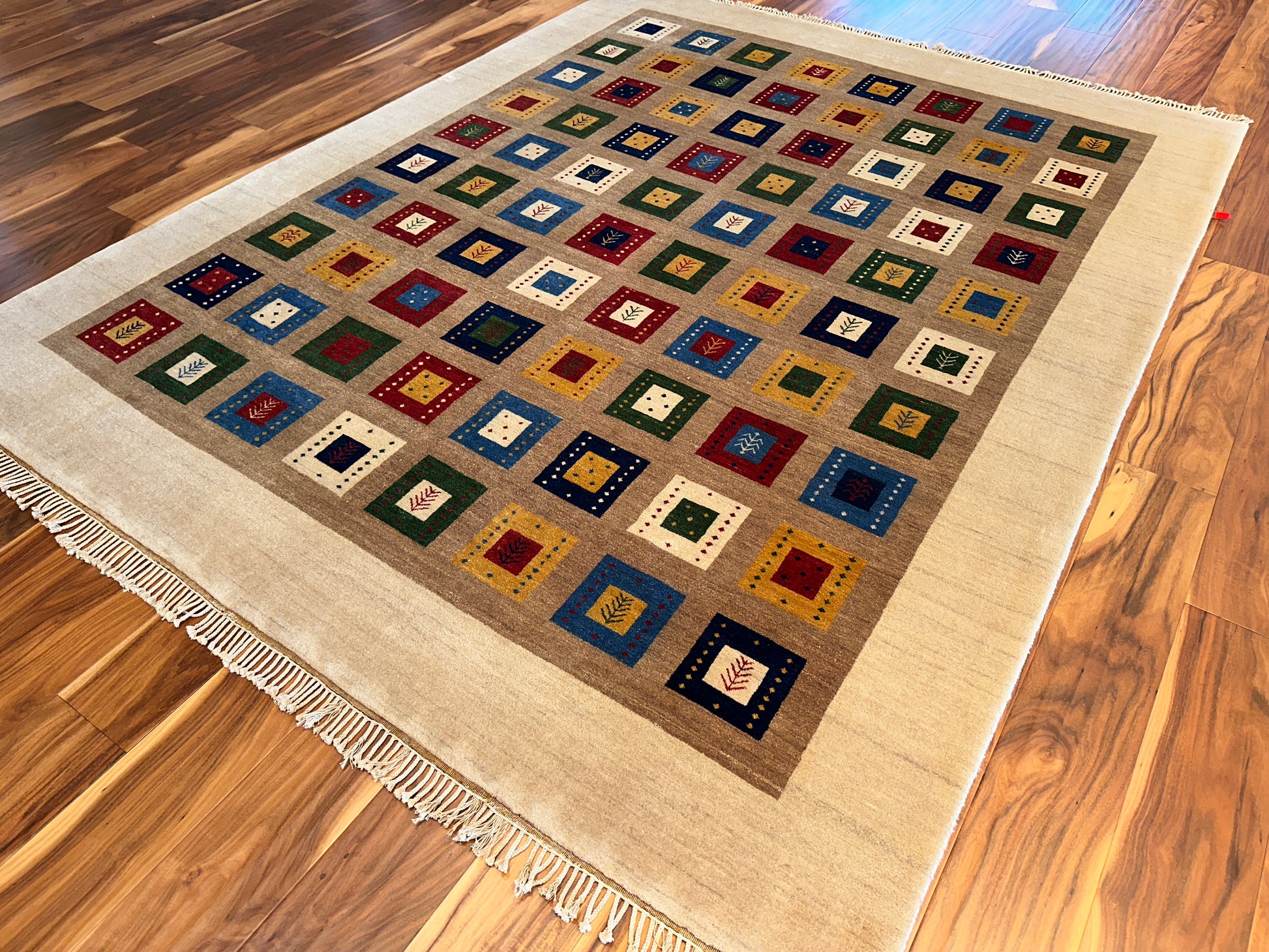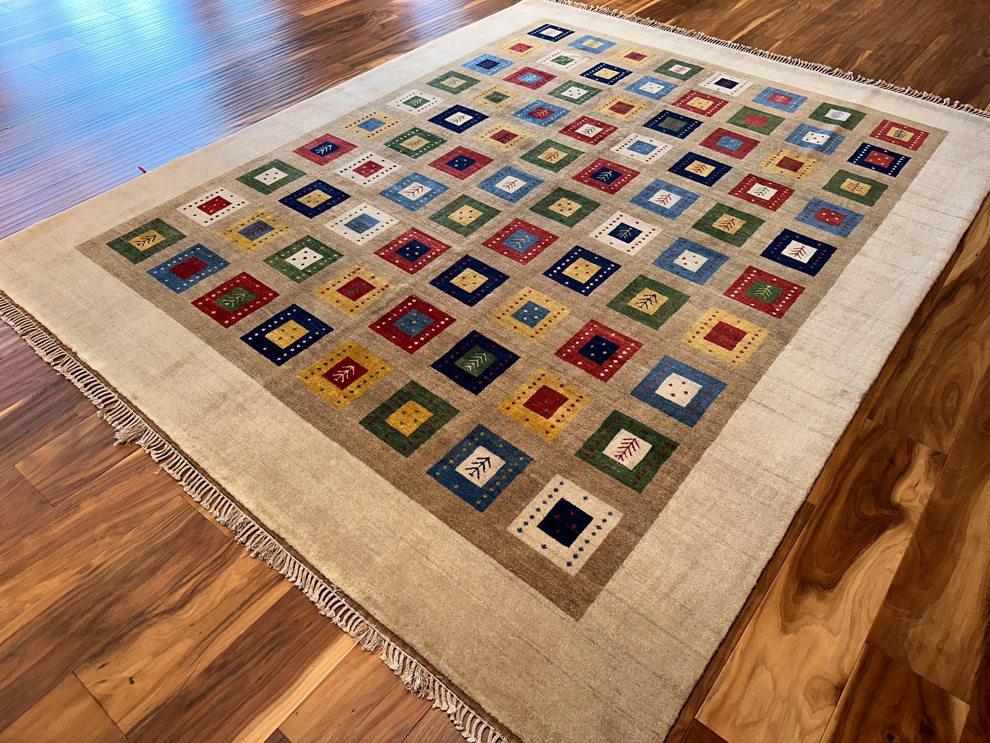 Lively and inviting, this rug is filled with rows of colorful square motifs framed within a soft ivory border. Each square features playful accents—tiny symbols, dots, and contrasting frames—in vivid hues of red, blue, green, and gold. The overall effect is both cheerful and grounded, making it an ideal centerpiece for cozy, contemporary homes.