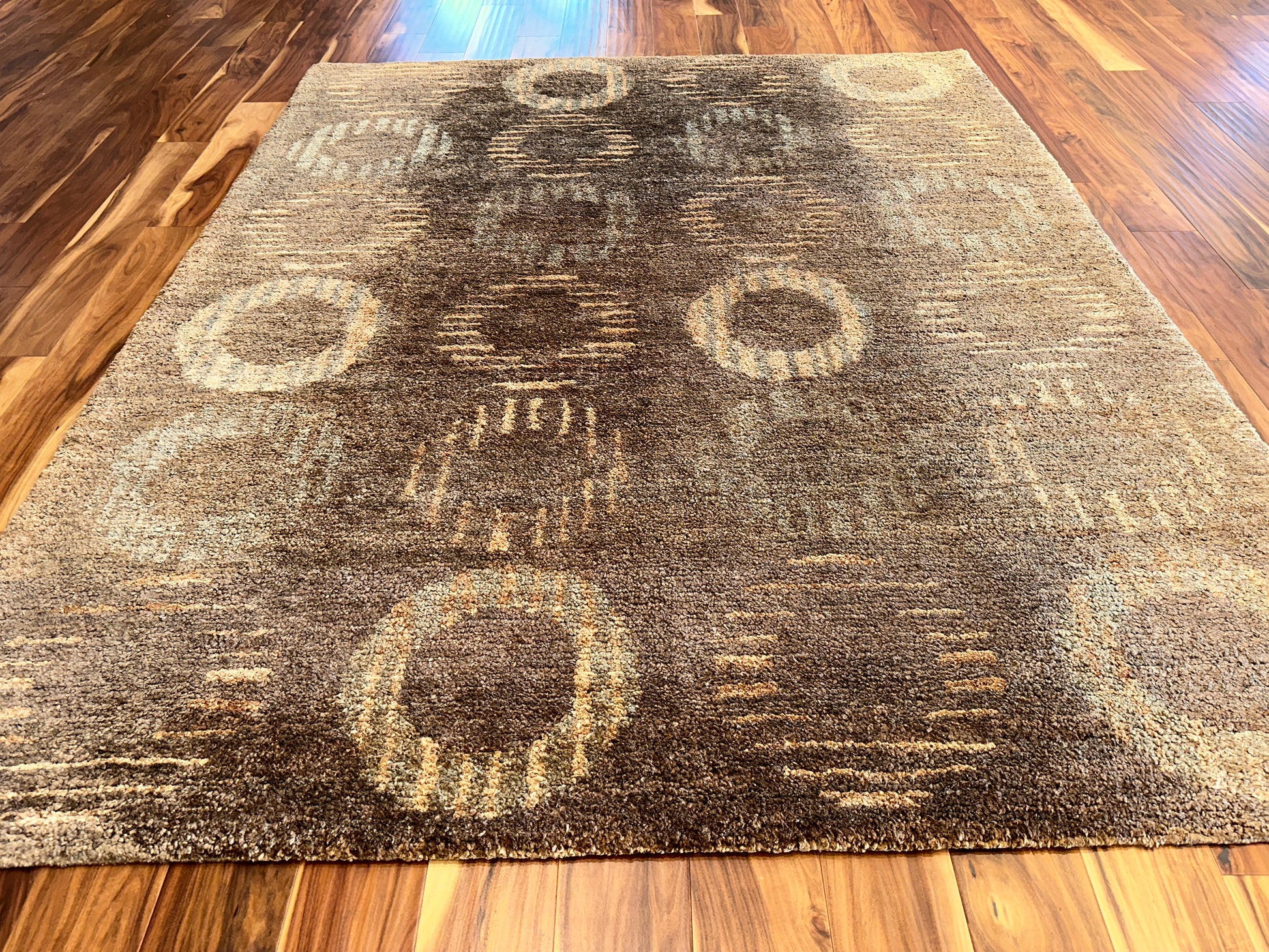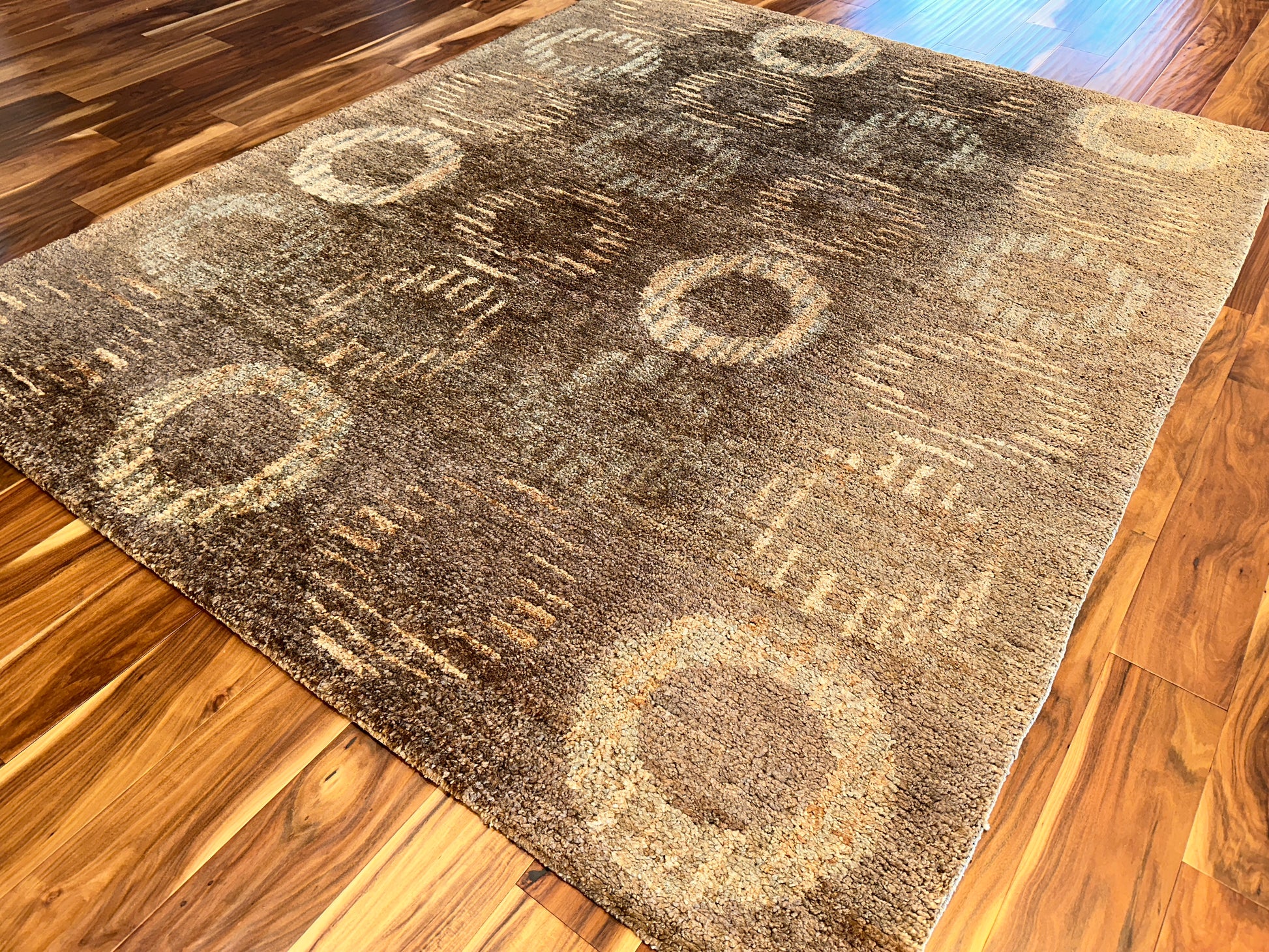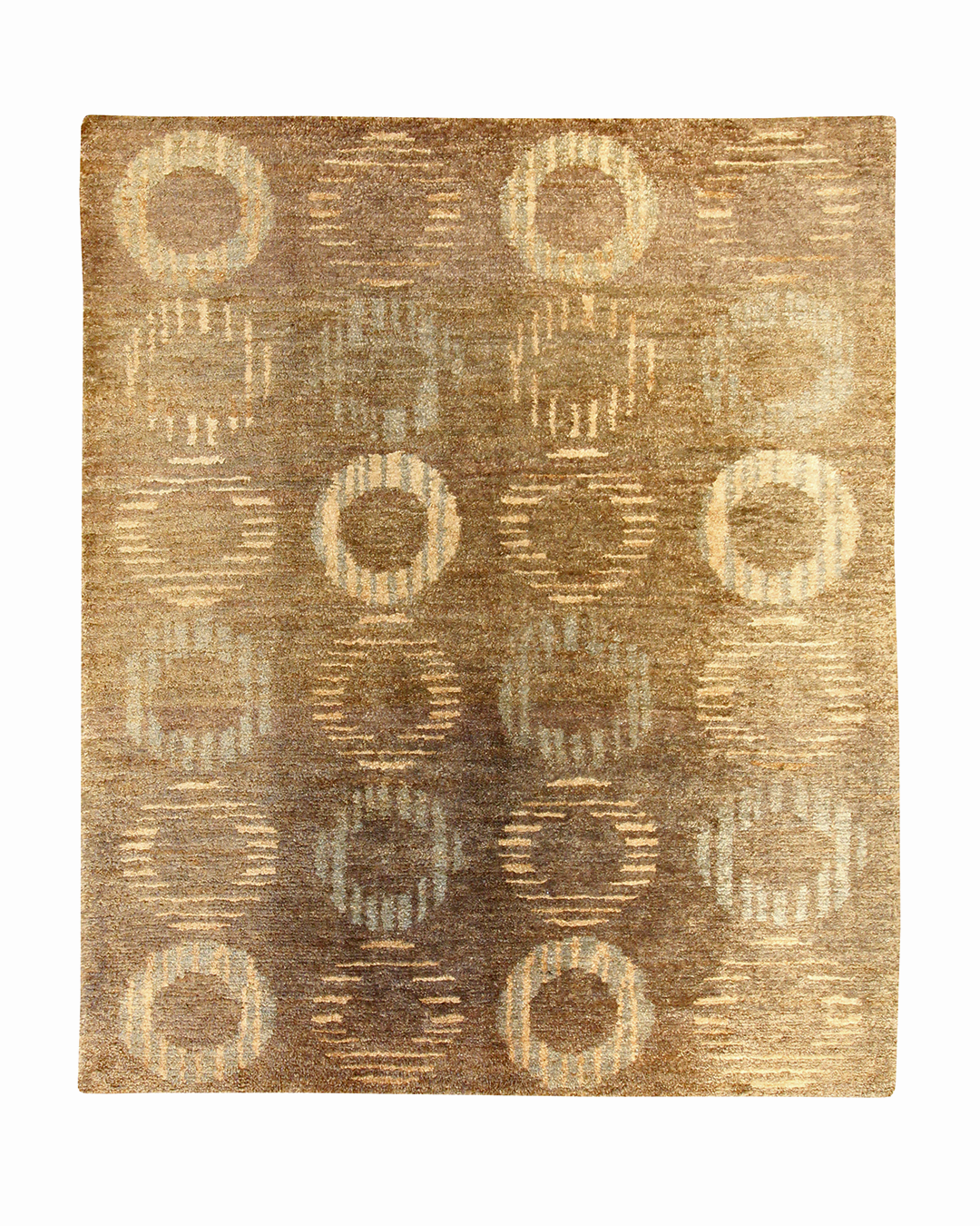 Warm and inviting, this handwoven rug features a softly structured pattern of concentric circles that fade in and out of a rich, amber-brown background. The interplay of golden beige and silvery gray highlights gives the design a gentle shimmer, creating a look that is both grounded and subtly radiant.