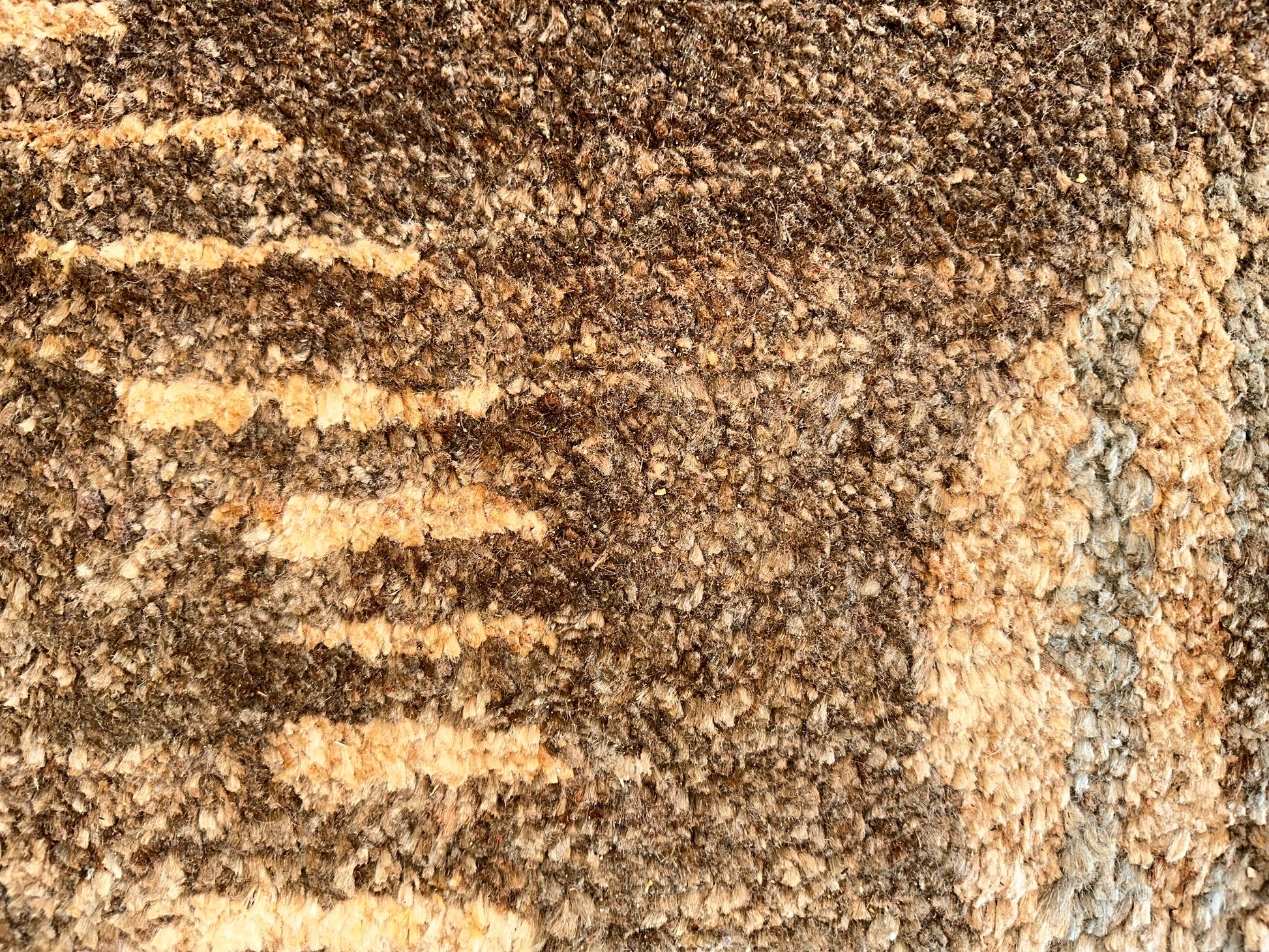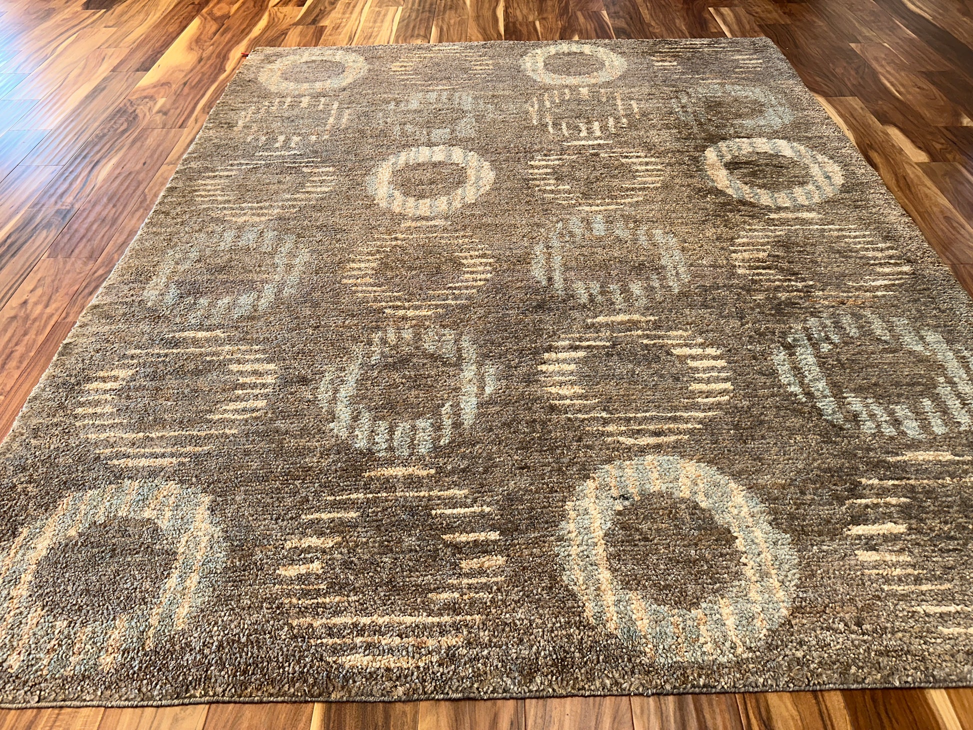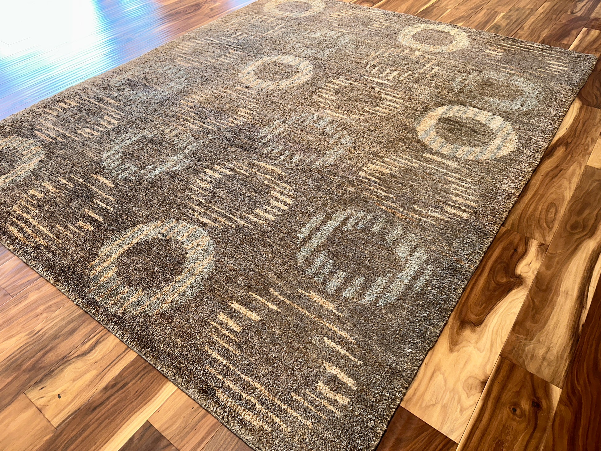 Warm and inviting, this handwoven rug features a softly structured pattern of concentric circles that fade in and out of a rich, amber-brown background. The interplay of golden beige and silvery gray highlights gives the design a gentle shimmer, creating a look that is both grounded and subtly radiant.