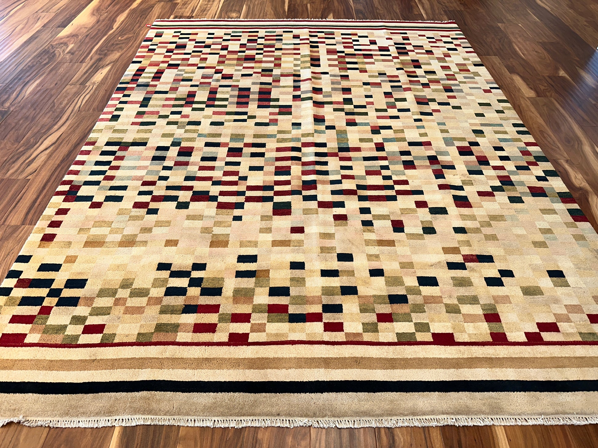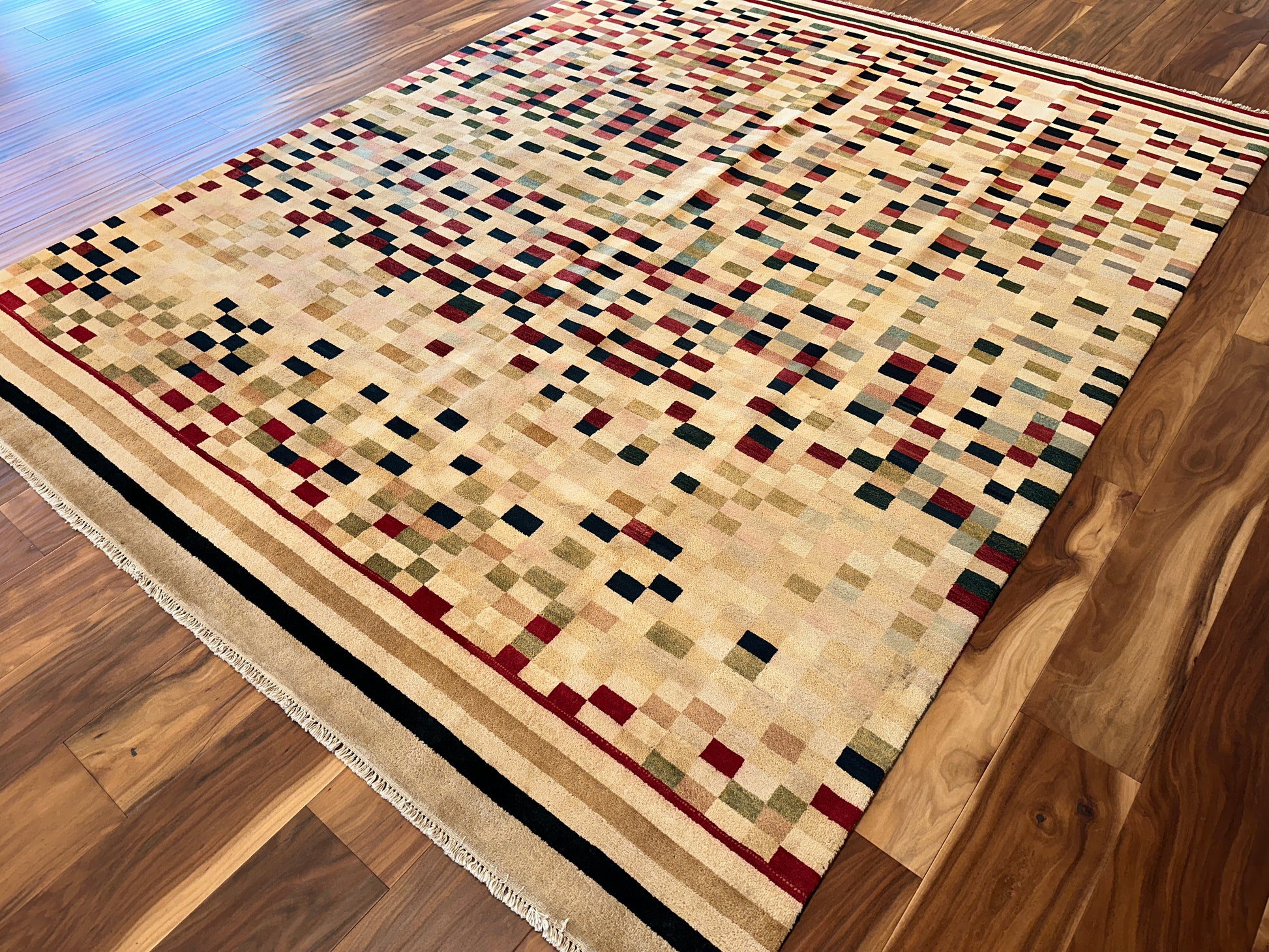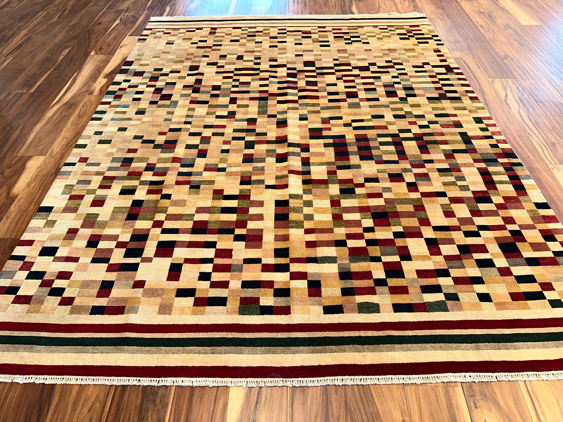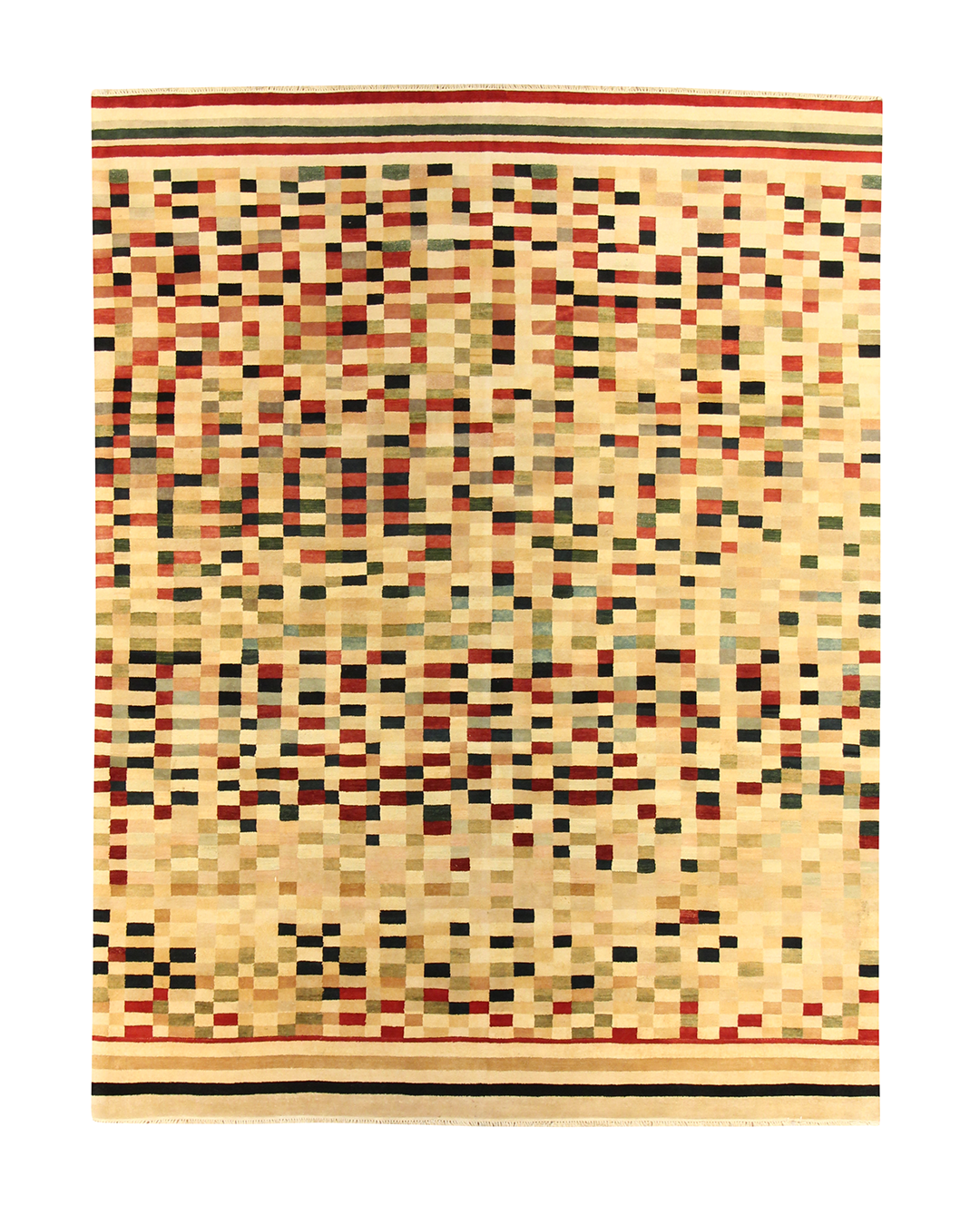 Lively and contemporary, this handwoven rug features a pixelated field of scattered squares in earthy reds, soft greens, golden yellows, and deep navy. The design has a dynamic, rhythmic quality—like digital mosaic art softened by a warm ivory backdrop. Framed with structured stripes at either end, it anchors the composition while keeping the feel vibrant and fluid.
