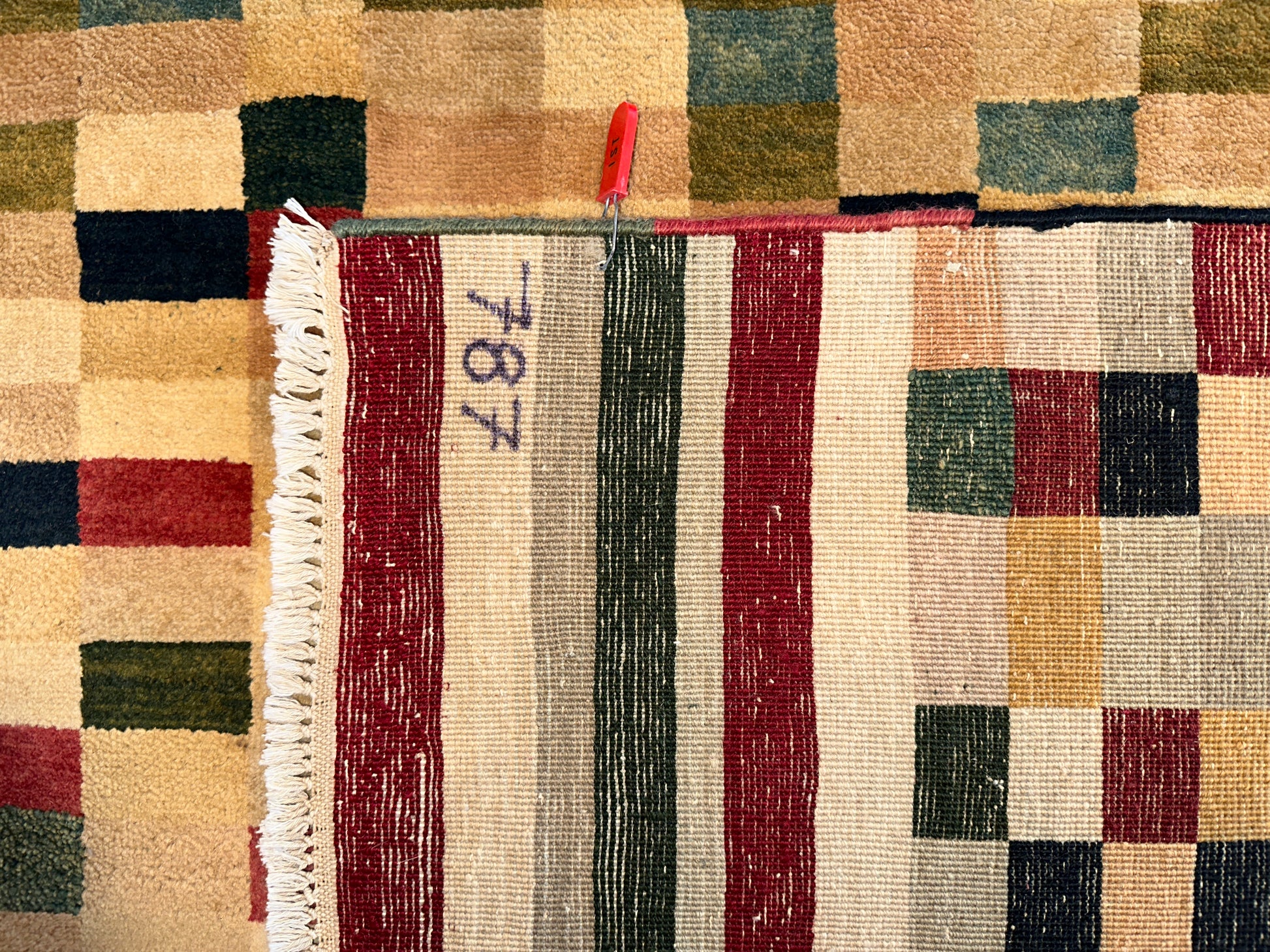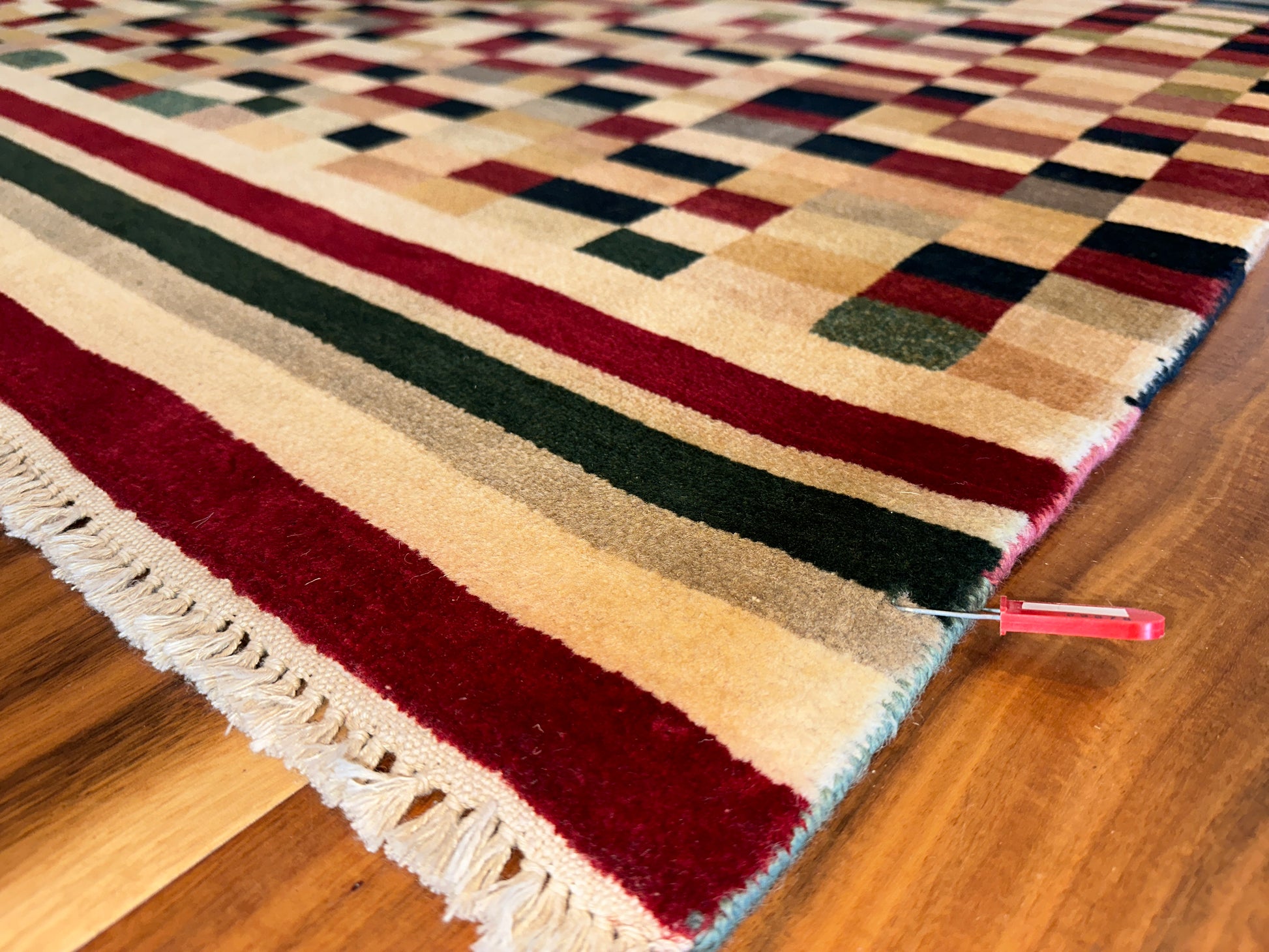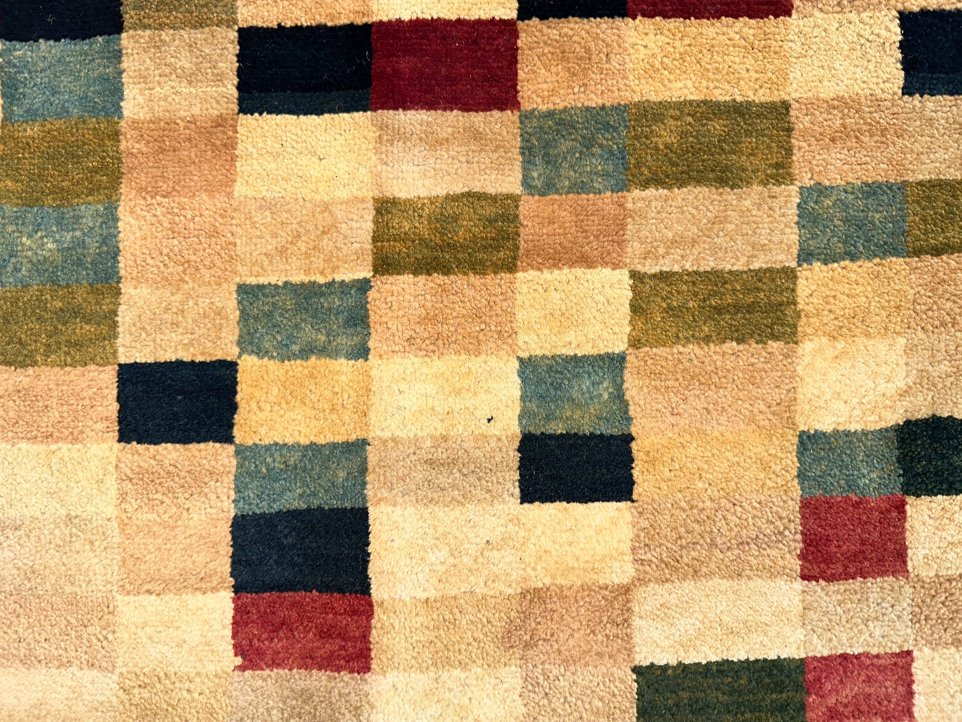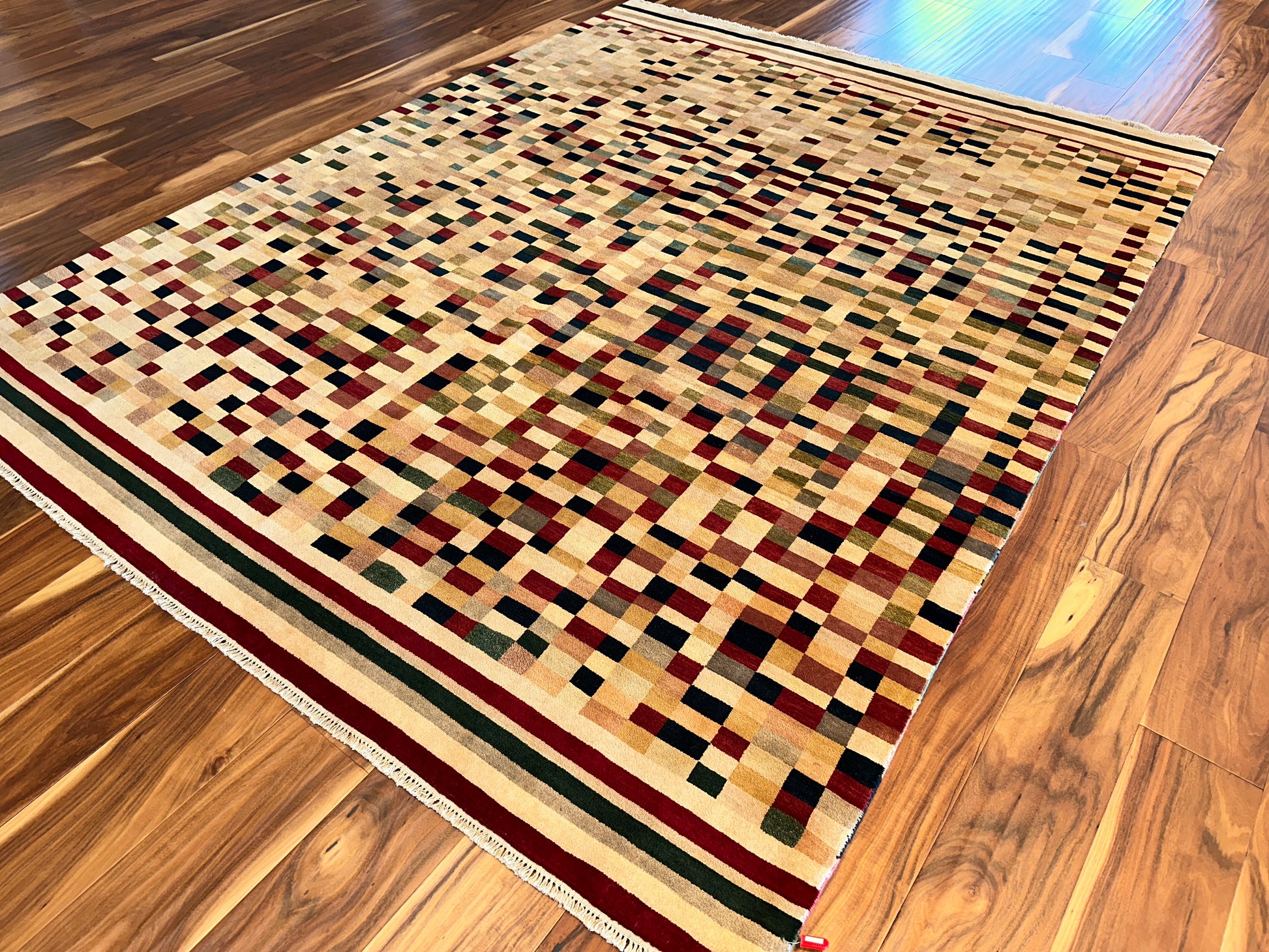 Lively and contemporary, this handwoven rug features a pixelated field of scattered squares in earthy reds, soft greens, golden yellows, and deep navy. The design has a dynamic, rhythmic quality—like digital mosaic art softened by a warm ivory backdrop. Framed with structured stripes at either end, it anchors the composition while keeping the feel vibrant and fluid.