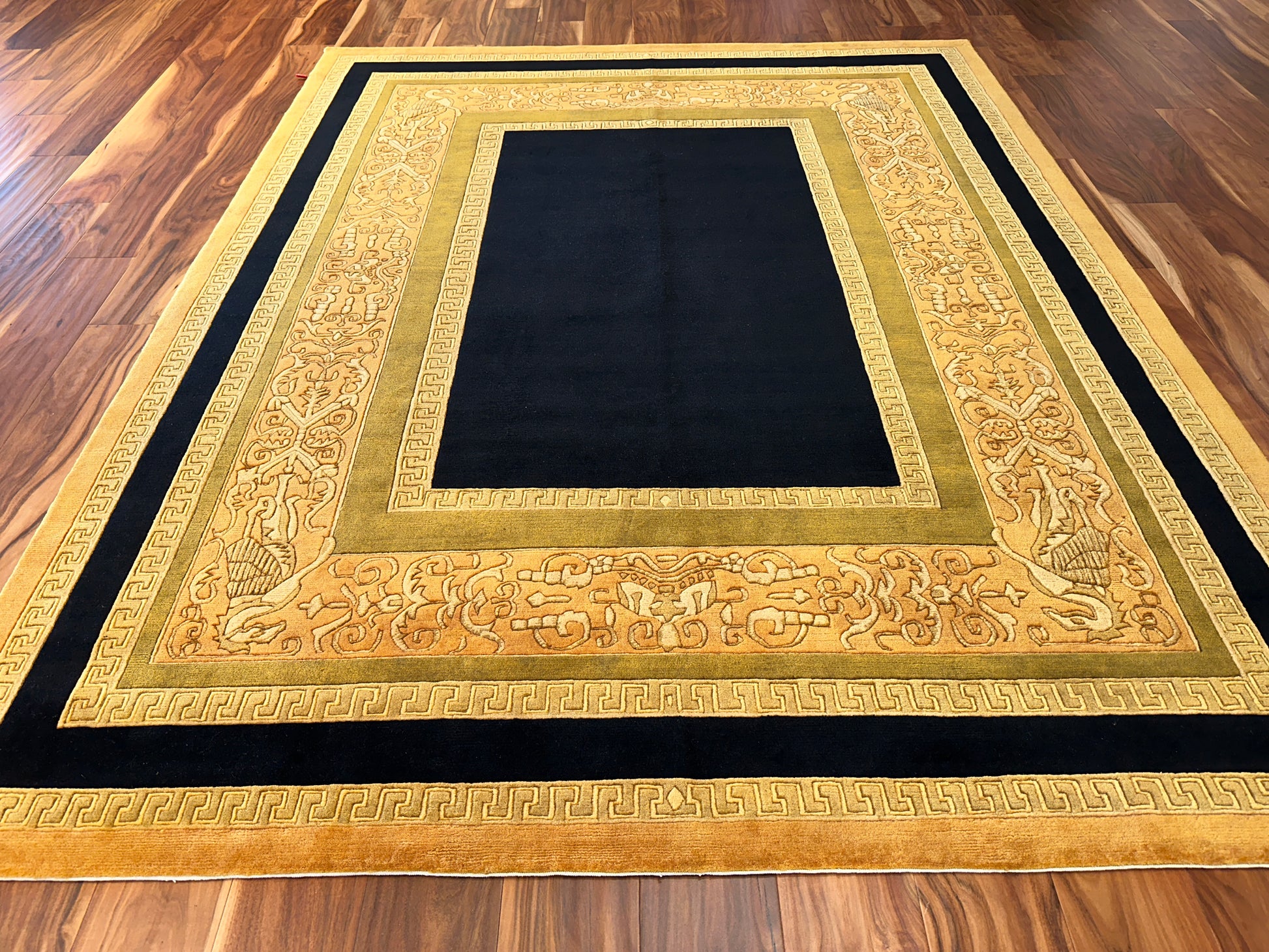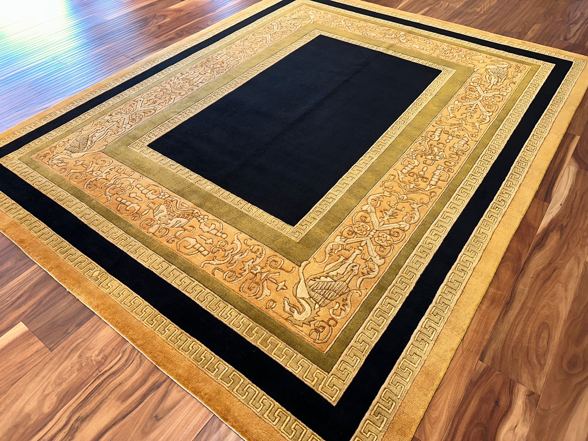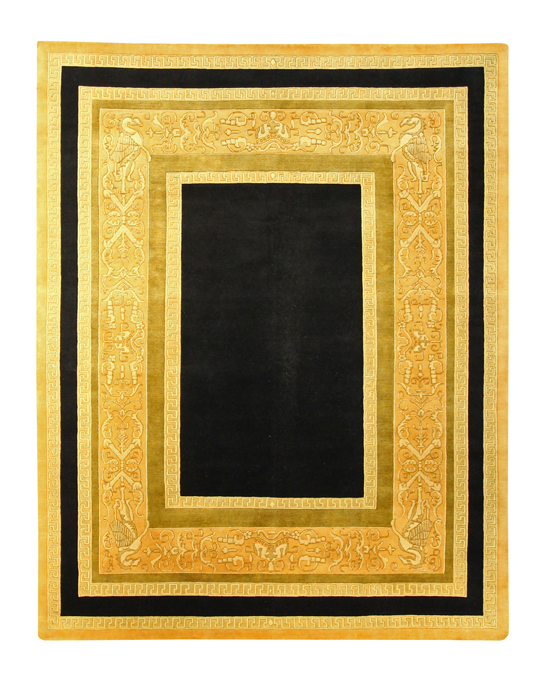 This striking handwoven rug commands attention with its rich contrast and classical form. A deep black field is framed by three golden borders, including an intricate inner band adorned with stylized scrollwork, lyres, and mythical motifs. It evokes a regal presence, balancing opulence with symmetry for a space that exudes formality and grandeur.