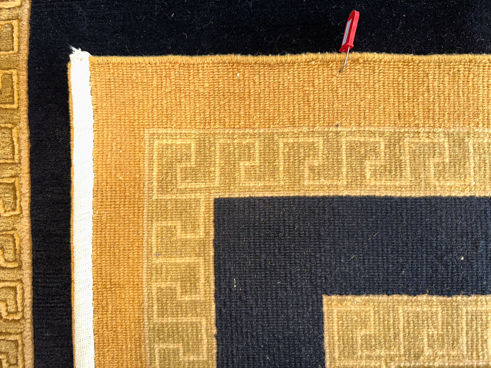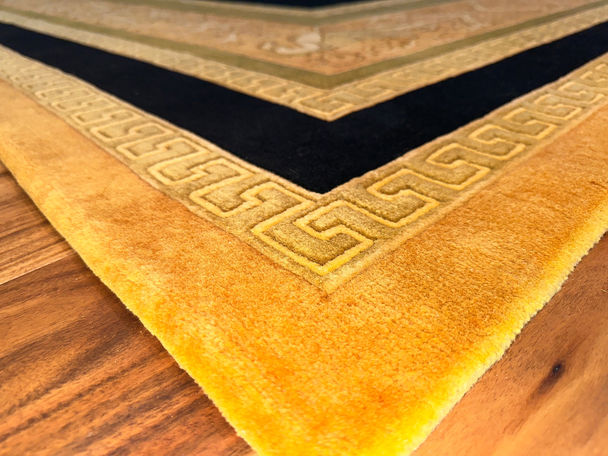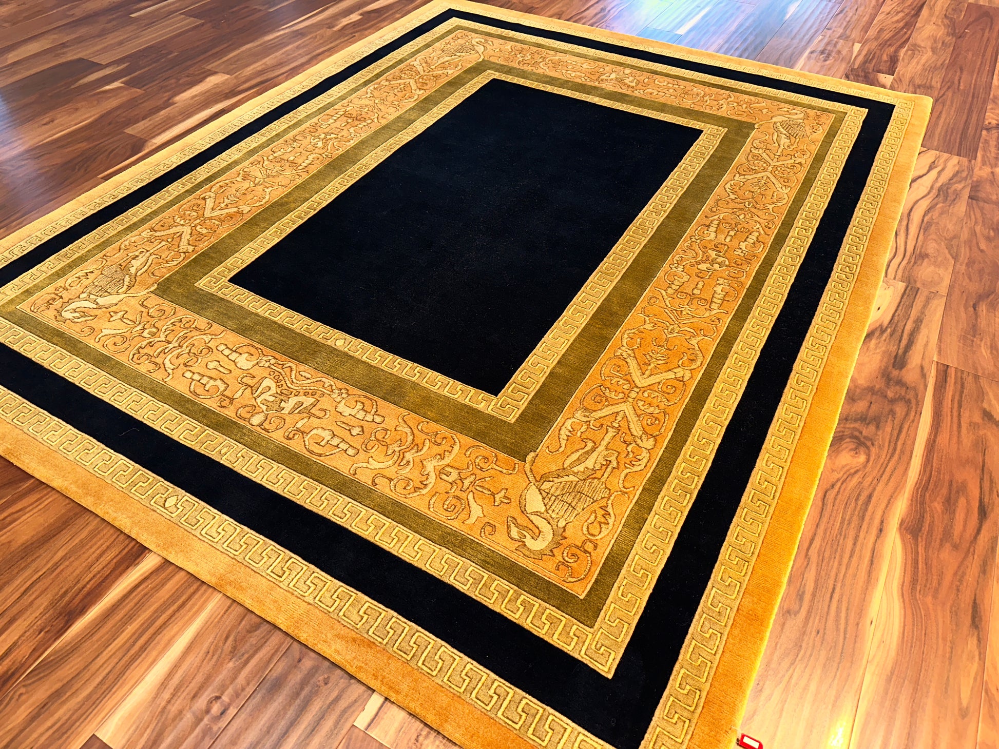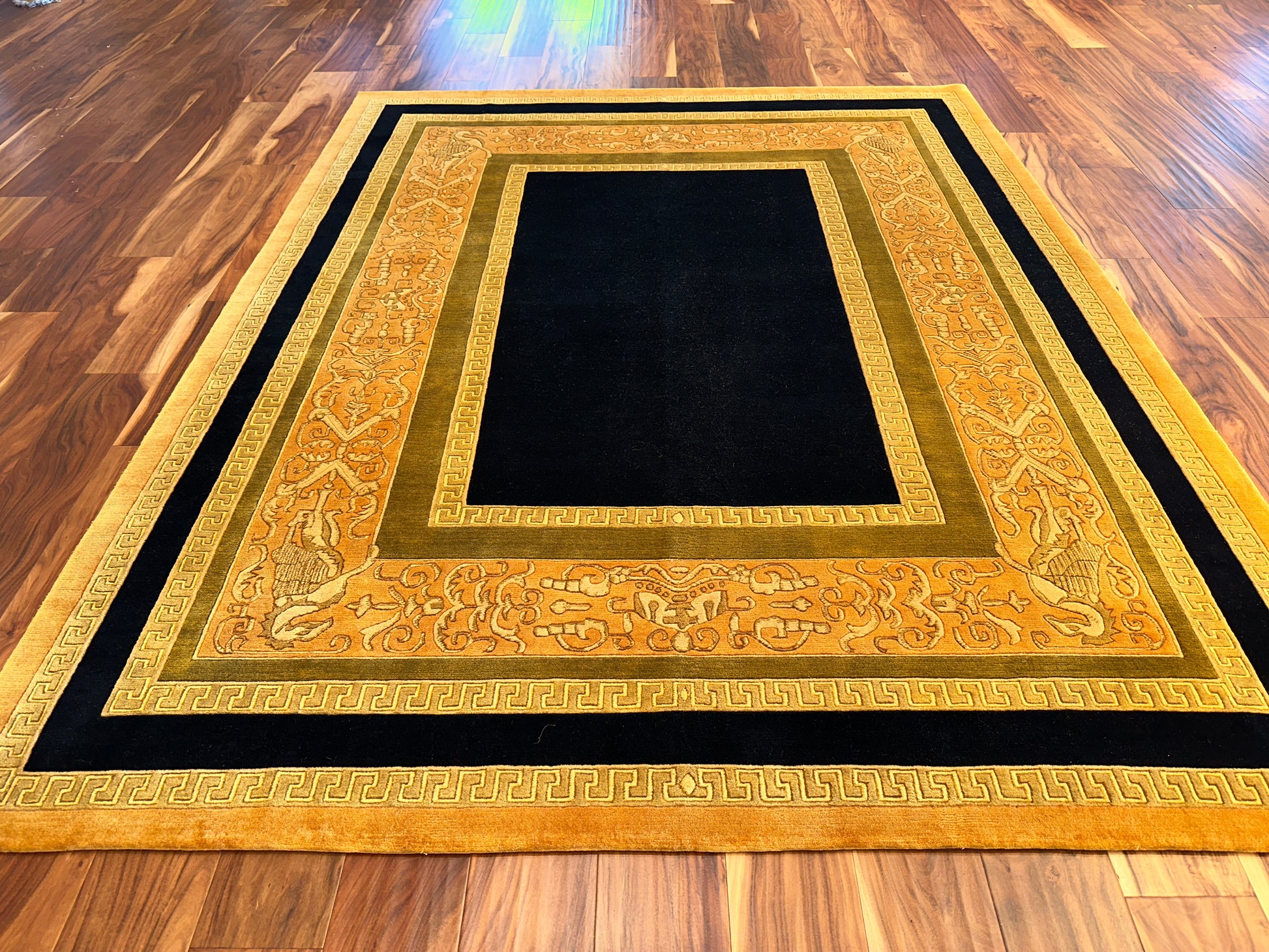 This striking handwoven rug commands attention with its rich contrast and classical form. A deep black field is framed by three golden borders, including an intricate inner band adorned with stylized scrollwork, lyres, and mythical motifs. It evokes a regal presence, balancing opulence with symmetry for a space that exudes formality and grandeur.