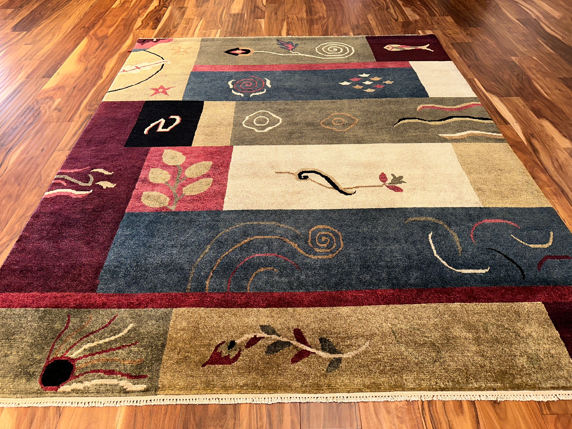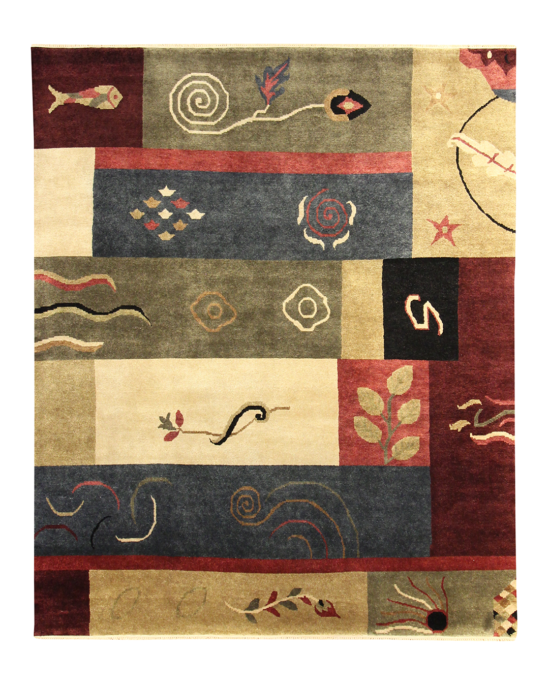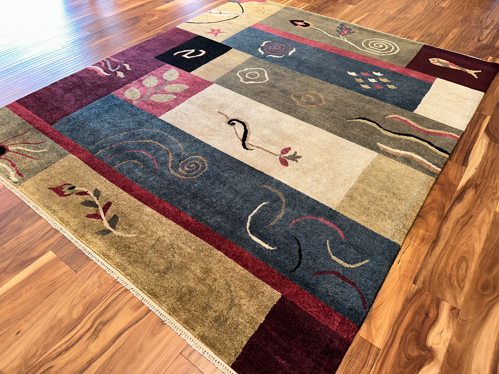 A tapestry of organic movement and earthy tones, this handwoven rug presents a collage of symbolic motifs across softly textured horizontal bands. From spirals to florals, fish to leaf shapes, each element feels drawn from nature or storybook dreams, unfolding across a palette of olive, navy, ivory, and warm rust. The asymmetrical layout brings a free-spirited rhythm, perfect for those who appreciate design with a touch of the whimsical.